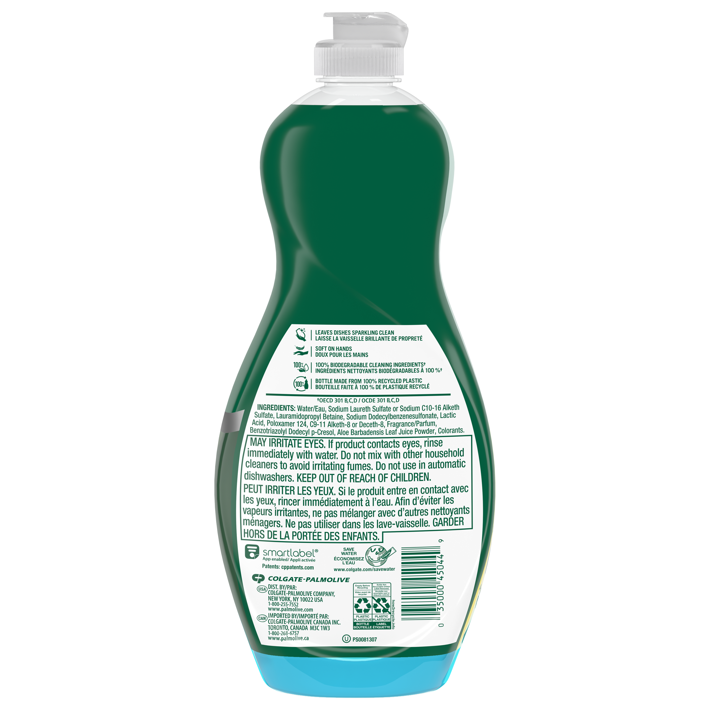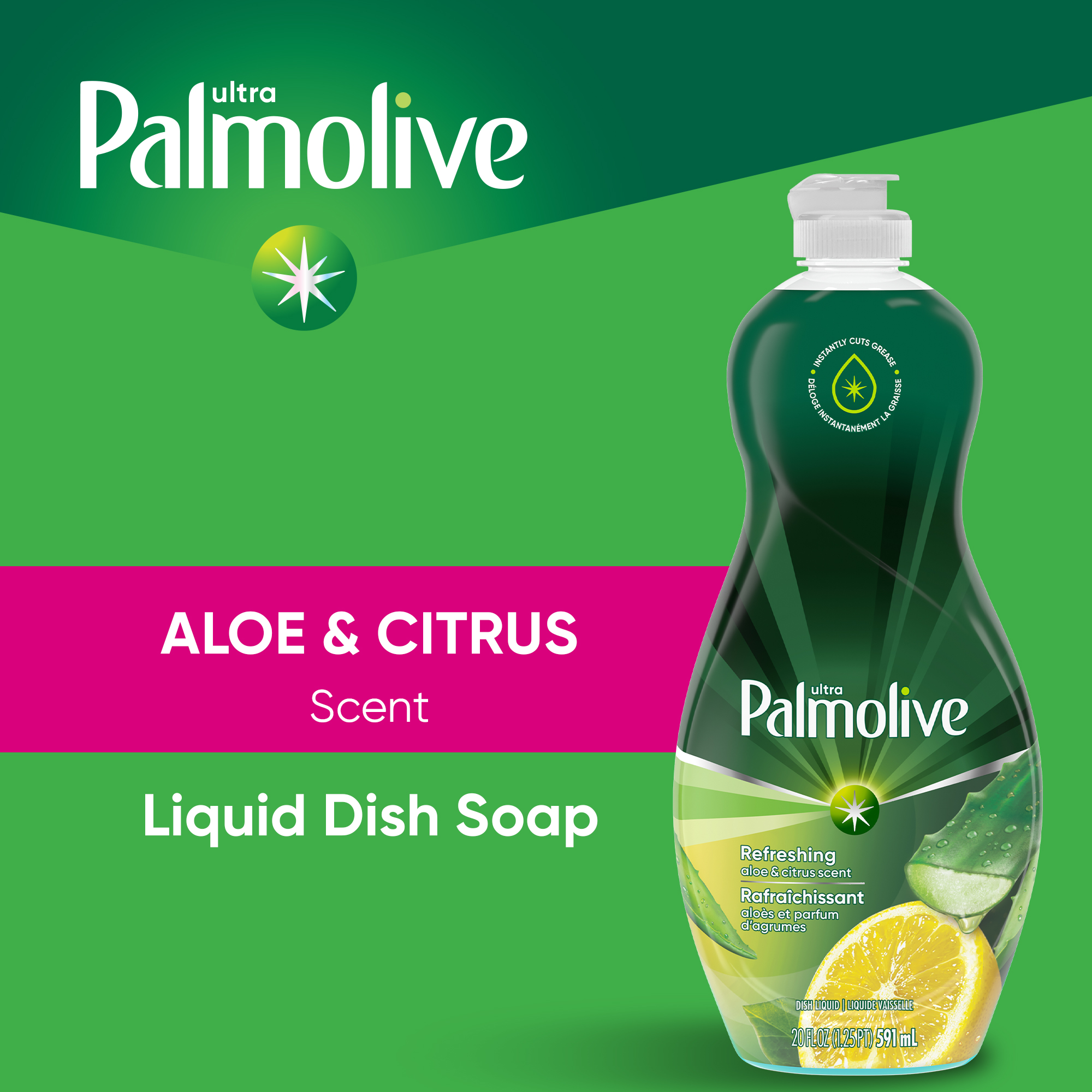 SKU US04230A Consumer Unit - GTIN 00035000450449 Case - GTIN 10035000450446 Product Category Home Care Product Sub Category Dish Hand Product Equity (Brand) Palmolive Product Sub Brand Palmolive Soft Touch Ultra HD Product Title Palmolive Ultra Experientials Liquid Dish Soap, Aloe & Citrus Scent - 20 Fluid Ounce Product Description Palmolive Ultra Soft Touch Aloe & Citrus Scent Liquid Dish Soap is the grease fighting dish soap to help you tackle tough messes, while being soft on your hands and leaving them feeling smooth. From stuck-on food to your greasiest dishes, Palmolive Ultra is there to help you tackle tough messes and delivers powerful grease cutting to make even your dirtiest dishes an easy clean. While Palmolive Ultra is tough on grease, it is made to be gentle on the earth, with biodegradable cleaning ingredients and sustainable packaging made with post-consumer recycled plastic. These eco friendly features make it a great addition to your household dishwashing supplies. Make a difference at home and on the environment with Palmolive Ultra. eCommerce Copy- Long Description Delightful scents. Powerful clean. The only thing nicer than Palmolive-clean dishes are the scents you experience while you’re washing them. Palmolive Ultra Experientials Liquid Dish Soaps are the grease-fighting dish soaps that tackle your toughest messes with enticing scents that make doing the dishes a little more rewarding. From stuck-on food to your greasiest dishes, Palmolive Ultra Experientials Liquid Dish Soaps deliver powerful grease-cutting. And as tough on grease as they are, they’re also gentle on the planet, with 100% biodegradable cleaning ingredients✝ and 0% parabens and phosphates. Experience the delightful scents of Palmolive Ultra Experientials Liquid Dish Soaps, and enjoy a powerful clean for all your senses. ✝OECD 301 B, C, D / OCDE 301 B, C, D Today the dishes. Tomorrow the world. For over 50 years, households have relied on Palmolive for powerful grease cutting in the kitchen and beyond. And now, we’re thinking about what we can do for the next 50. Palmolive has always engineered our dishwashing liquid to be tough on grease yet soft on hands. Today, this extends to caring for the planet, too: Made in a TRUE Zero Waste Certified Manufacturing Facility* 100% post-consumer recycled plastic bottles (for 46 oz and under) 100% Biodegradable Cleaning Ingredients✝ 0% Parabens and Phosphates No matter which of our Palmolive Ultra Concentrated Dish Soaps you choose, you can rest assured you’re taking a small step towards making a big difference. Palmolive: Tough on Grease, Gentle on Planet *TRUE is a zero waste certification program for businesses to assess performance in reducing waste. Learn more at true.gbci.org. ✝OECD 301 B, C, D / OCDE 301 B, C, D Bullet 1 Refreshing Aloe & Citrus scent liquid dish soap Bullet 2 Our liquid dish soap instantly cuts through grease Bullet 3 This liquid dish soap tackles your toughest messes, from stuck-on food to greasy dishes Bullet 4 Our liquid dish soap delivers a powerful clean for all your senses Bullet 5 This liquid dish soap is tough on grease, gentle on planet Bullet 6 Our liquid dish soap is packaged in 100% post-consumer recycled plastic bottles (for 46 oz and under) Bullet 7 Our liquid dish soap uses 100% Biodegradable Cleaning Ingredients Bullet 8 Our liquid dish soap containes 0% Parabens and Phosphates Bullet 9 Do not use this dishwashing liquid soap in automatic dishwashers Amazon RPC B01NAPQGMF AMZ URL https://www.amazon.com/dp/B01NAPQGMF Walmart RPC 103208614 Walmart URL (Computed) https://www.walmart.com/ip/a/103208614 CVS RPC 746091