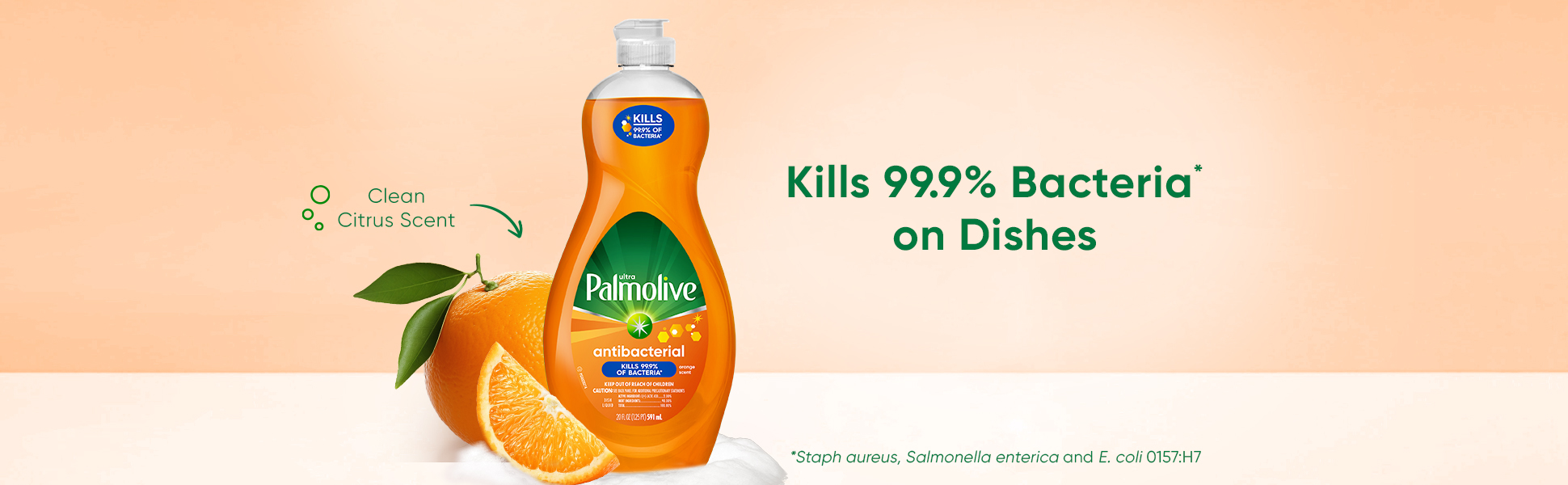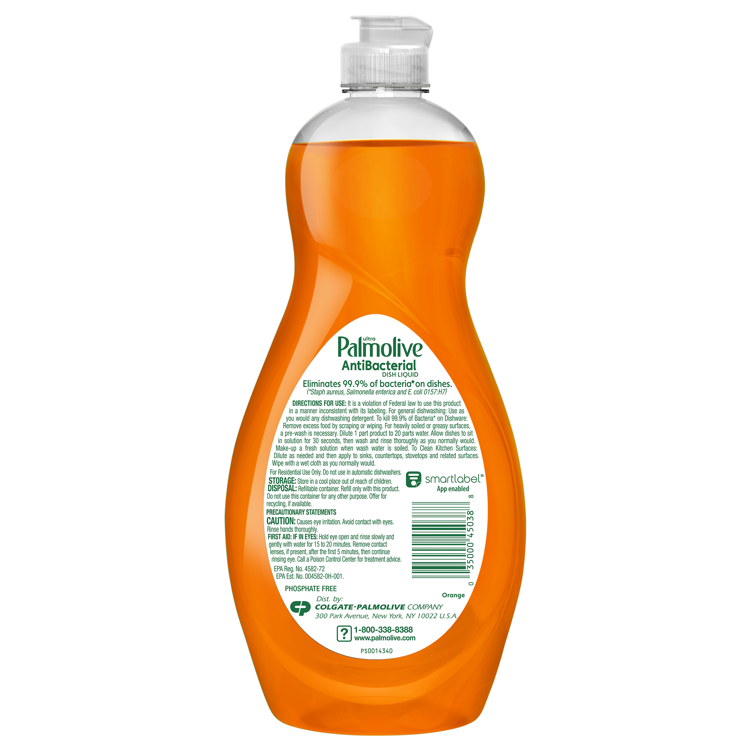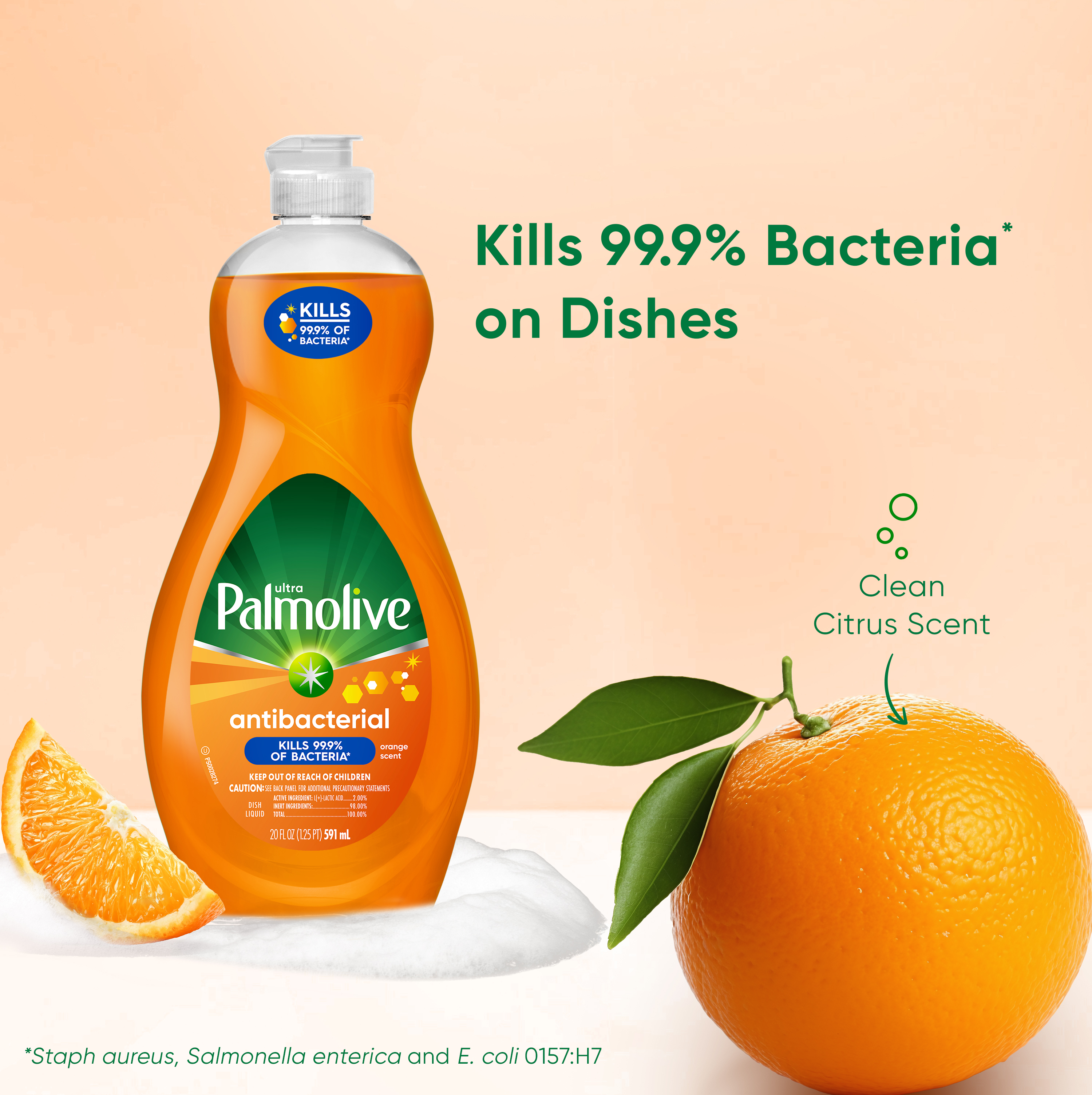 SKU US04232A Consumer Unit - GTIN 00035000450388 Case - GTIN 10035000450385 Product Category Home Care Product Sub Category Dish Hand Product Equity (Brand) Palmolive Product Sub Brand Palmolive Antibacterial Ultra HD Product Title Palmolive Ultra Concentrated Antibacterial Liquid Dish Soap, Orange Scent - 20 Fluid Ounce Product Description Ultra Palmolive Antibacterial dish liquid kills 99.9% of bacteria* on your dishes and kitchen surfaces. Our US EPA registered dish liquid contains a plant-based active ingredient** and cuts grease to leave your dirtiest dishes clean and residue free. Ultra Palmolive Antibacterial dish liquid is phosphate free and contains no harsh abrasives, making it a great addition to your household dishwashing supplies. *Staph aureus, Salmonella enterica and E. coli 157:H7 **Active ingredient synthesized from plants eCommerce Copy- Long Description Kills bacteria* in 30 seconds on dishes For an effective antibacterial cleaner, Ultra Palmolive Antibacterial Concentrated Dish Liquid has you covered: it eliminates 99.9% of bacteria* in 30 seconds on dishes. Our antibacterial dish liquid (EPA Registration No. 4582-72) uses a plant-based active ingredient** and no harsh abrasives or phosphates to leave your dirtiest dishes, pots and pans sparkling clean. With a mild citrus scent, Palmolive Antibacterial dish liquid combines the best of both worlds: residue-free cleaning with antibacterial action on dishes. *Staph aureus, Salmonella enterica, and E. coli O157:H7 **Active ingredient synthesized from plants Today the dishes. Tomorrow the world. For over 50 years, households have relied on Palmolive for powerful grease cutting in the kitchen and beyond. And now, we’re thinking about what we can do for the next 50. Palmolive has always engineered our dishwashing liquid to be tough on grease yet soft on hands. Today, this extends to caring for the planet, too: Made in a TRUE Zero Waste Certified Manufacturing Facility* Bottles made with 100% recycled plastic (for 56 oz and under) 0% Parabens and Phosphates No matter which of our Palmolive Ultra dish soaps you choose, you can rest assured you’re taking a small step towards making a big difference. Palmolive: Tough on Grease, Gentle on Planet *TRUE is a zero waste certification program for businesses to assess performance in reducing waste. Learn more at true.gbci.org. Bullet 1 Palmolive Ultra Concentrated Antibacterial Liquid Dish Soap, Orange Scent Bullet 2 Our liquid dish soap kills 99.9% of bacteria* in 30 seconds on dishes (*Staphylococcus aureus or Staph aureus, Salmonella enterica, and Escherichia coli O157:H7 or E. coli O157:H7) Bullet 3 This liquid dish soap is made with a plant-based active ingredient** (**Active ingredient synthesized from plants) Bullet 4 Our liquid dish soap is ideal for residue-free cleaning and antibacterial action Bullet 5 Do not use this dishwashing liquid soap in automatic dishwashers Active Ingredients Active Ingredient: L-Lactic Acid, 2.00% Amazon RPC B071DPC3CP AMZ URL https://www.amazon.com/dp/B071DPC3CP Walmart RPC 150351780 Walmart URL (Computed) https://www.walmart.com/ip/a/150351780 Target RPC 51872151 Target URL https://www.target.com/p/a/-/A-51872151 Albertsons RPC 960267817 Albertsons URL https://www.albertsons.com/shop/product-details.960267817.html CVS RPC 948473 Family Dollar RPC 1498879