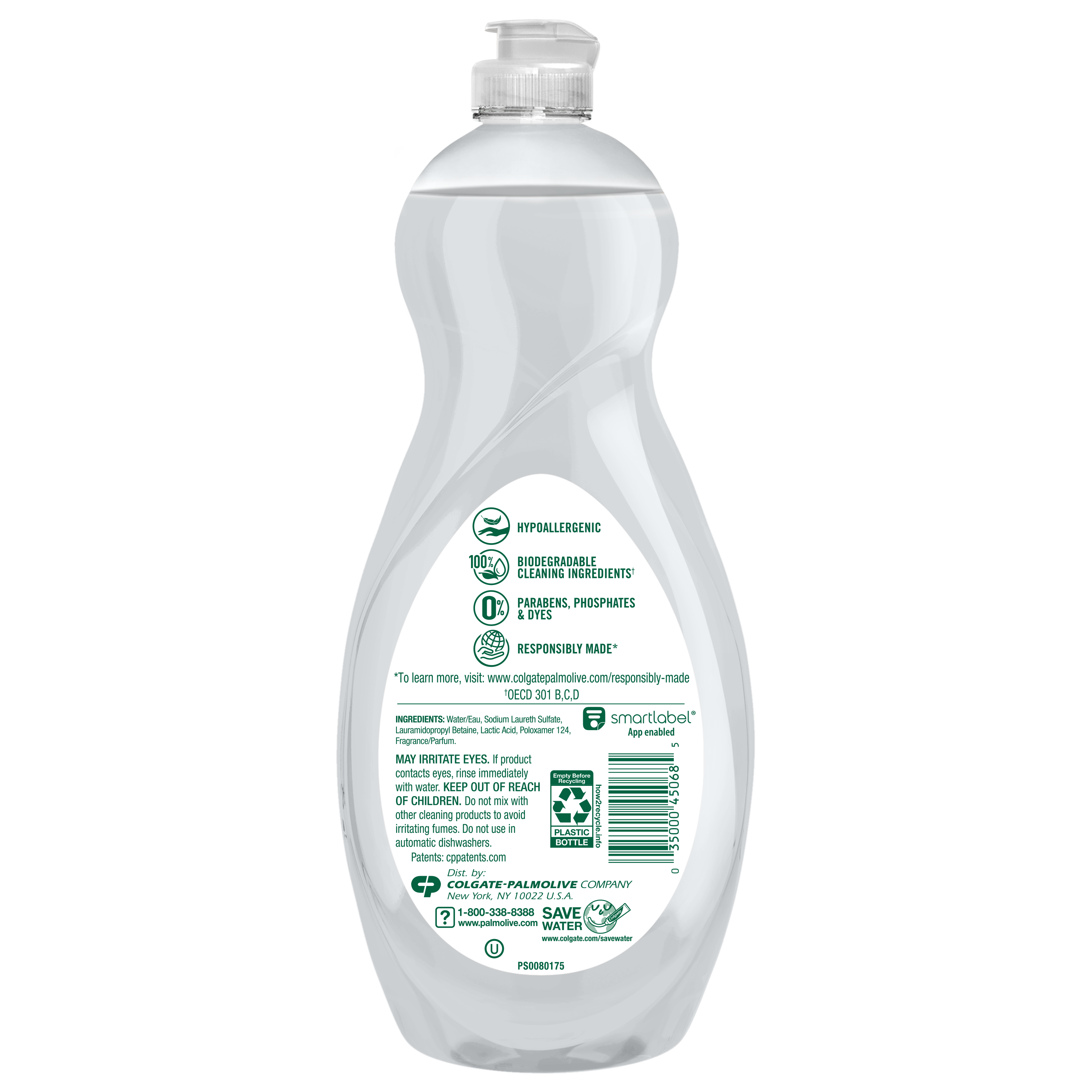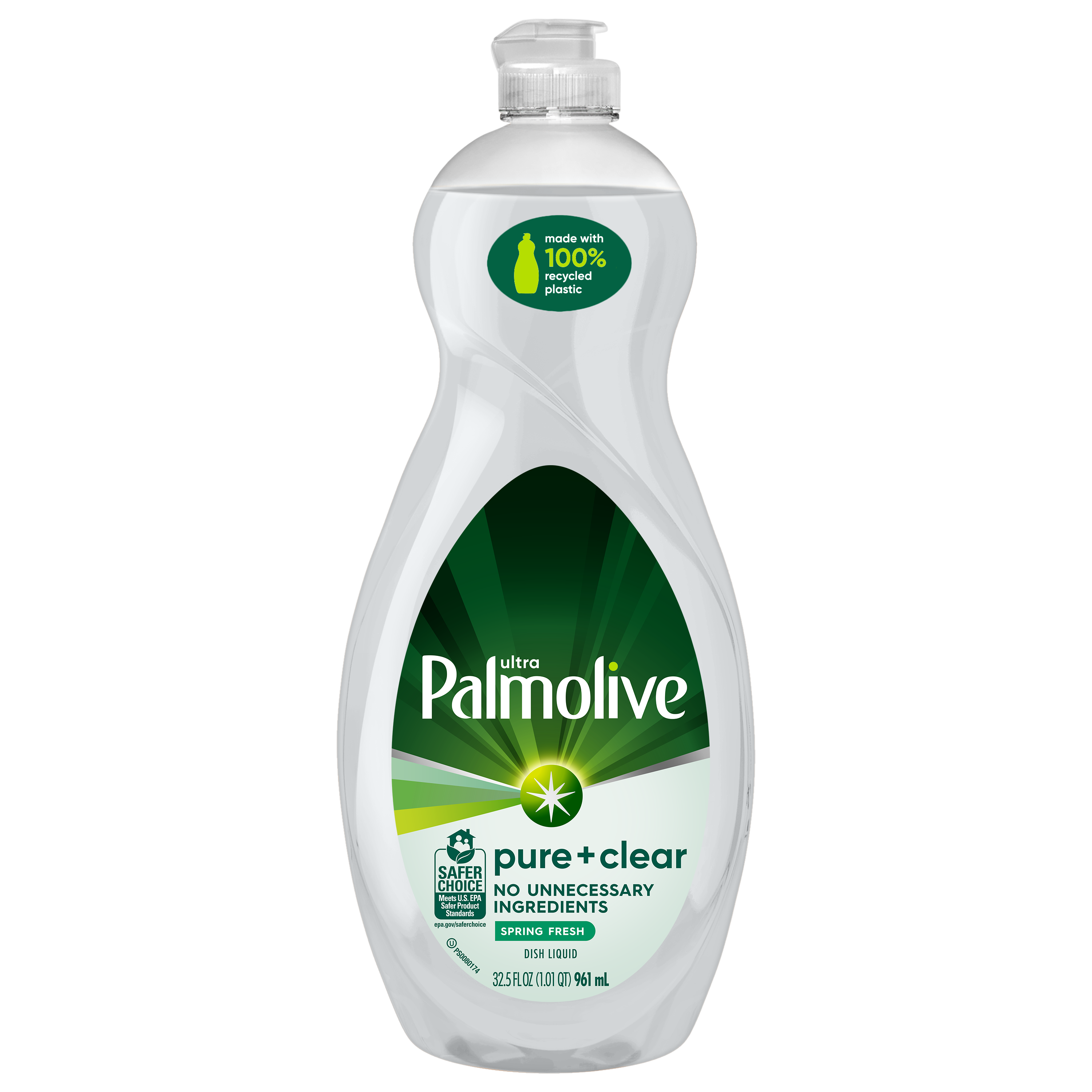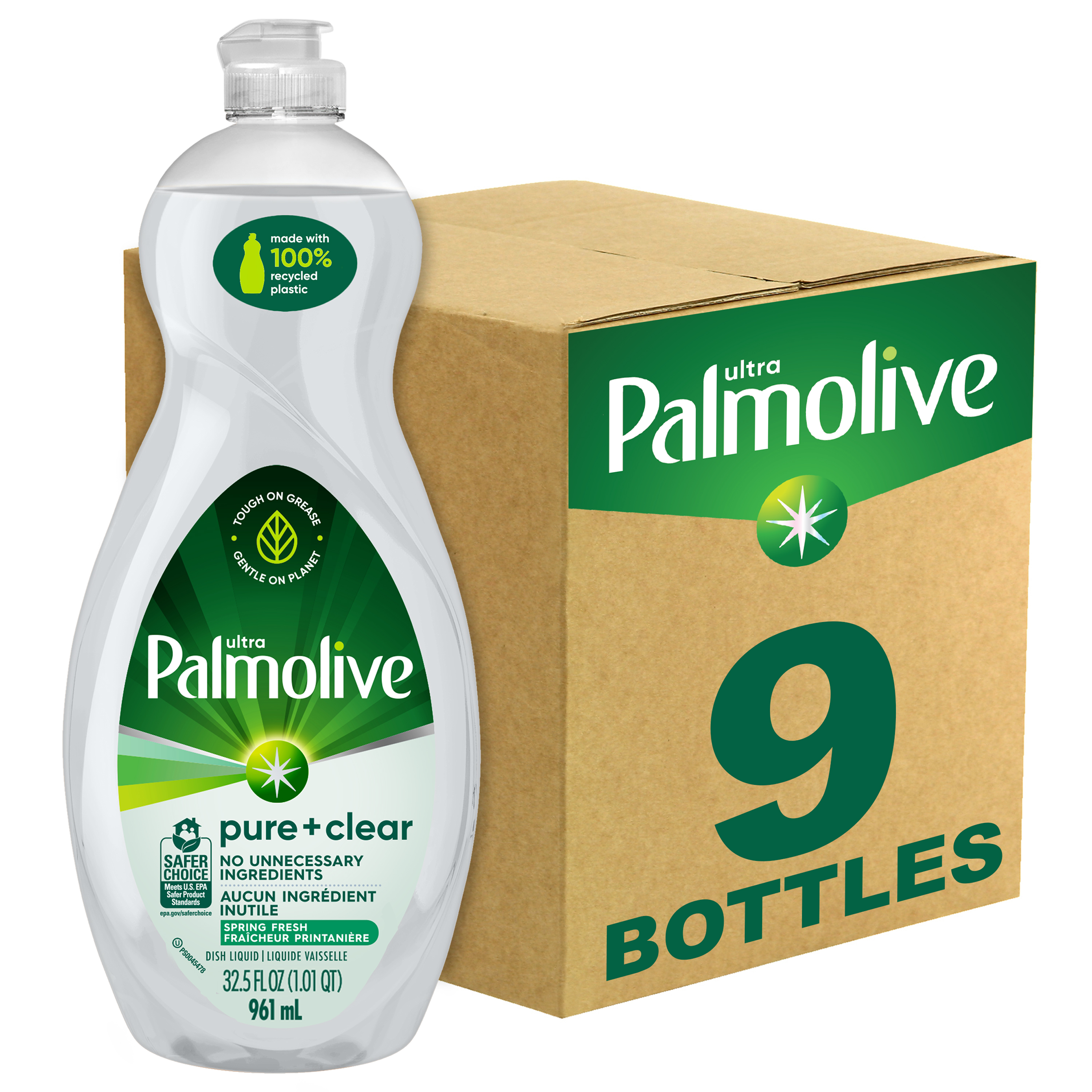 SKU US04272A Consumer Unit - GTIN 00035000450685 Case - GTIN 10035000450682 Product Category Home Care Product Sub Category Dish Hand Product Equity (Brand) Palmolive Product Sub Brand Palmolive Pure + Ultra HD Product Title Palmolive Ultra Pure + Clear Liquid Dish Soap, Spring Fresh Scent - 32.5 Fluid Ounce Product Description Palmolive Ultra Pure + Clear Spring Fresh Liquid Dish Soap is the grease fighting dish soap you know and trust to get the dishes done. With no unnecessary ingredients, Palmolive Ultra Pure + Clear effectively cuts through grease leaving even your dirtiest dishes clean.While Palmolive Ultra Pure + Clear is tough on grease, it is made to be gentle on the earth with a hypoallergenic formula, biodegradable cleaning ingredients, and sustainable packaging. These eco friendly features make it a great addition to your household dishwashing supplies. Make a difference at home and on the environment with Palmolive Ultra. eCommerce Copy- Long Description No unnecessary ingredients. 100% Palmolive clean. When you want ultra-clean dishes without unnecessary ingredients, there’s one clear choice. Palmolive Ultra Pure + Clear Liquid Dish Soap is the clear choice for a grease-fighting dish soap that instantly cuts through grease and eliminates stuck-on food. And while it’s tough on grease, it’s still gentle on the planet with a formula that contains 100% biodegradable cleaning ingredients✝, and a bottle that is made from 100% recycled plastic* and is also recyclable. Try this grease-cutting, Safer Choice-certified dish liquid in Spring Fresh scent, Lavender & Eucalyptus scent, or a Fragrance Free variant. The Fragrance Free and mildly-scented formulas are hypoallergenic and were tested to ensure that they do not cause skin irritation or sensitivity to people, including for those with sensitive skin. ✝OECD 301 B, C, D / OCDE 301 B, C, D *46 oz and smaller size Today the dishes. Tomorrow the world. For over 50 years, households have relied on Palmolive for powerful grease cutting in the kitchen and beyond. And now, we’re thinking about what we can do for the next 50. Palmolive has always engineered our dishwashing liquid to be tough on grease yet soft on hands. Today, this extends to caring for the planet, too: Made in a TRUE Zero Waste Certified Manufacturing Facility* 100% post-consumer recycled plastic bottles (for 46 oz and under) 100% Biodegradable Cleaning Ingredients✝ 0% Parabens and Phosphates No matter which of our Palmolive Ultra Concentrated Dish Soaps you choose, you can rest assured you’re taking a small step towards making a big difference. Palmolive: Tough on Grease, Gentle on Planet *TRUE is a zero waste certification program for businesses to assess performance in reducing waste. Learn more at true.gbci.org. ✝OECD 301 B, C, D / OCDE 301 B, C, D Bullet 1 This liquid dish soap is tough on grease, gentle on planet Bullet 2 This dish soap is made with 100% biodegradable cleaning ingredients and is free of phosphates and parabens for a more eco friendly dish soap Bullet 3 This hypoallergenic dish soap formula will be gentle on your skin Bullet 4 This is a concentrated dishwashing soap formula Bullet 5 Our liquid dish detergent that not only cuts through grease, it also cuts through stuck on food, and leaves your dirtiest dishes clean Bullet 6 This liquid dish soap has a refreshing Spring Fresh scent, in a clear dish soap liquid Bullet 7 Our liquid dish soap is made with 100% recycled plastic for more sustainable packaging Bullet 8 Our liquid dish soap is Kosher Bullet 9 Do not use this dishwashing liquid soap in automatic dishwashers Amazon RPC B01NAPQCXB AMZ URL https://www.amazon.com/dp/B01NAPQCXB Walmart RPC 55375076 Walmart URL (Computed) https://www.walmart.com/ip/a/55375076 Target RPC 51872272 Target URL https://www.target.com/p/a/-/A-51872272 Albertsons RPC 960267819 Albertsons URL https://www.albertsons.com/shop/product-details.960267819.html