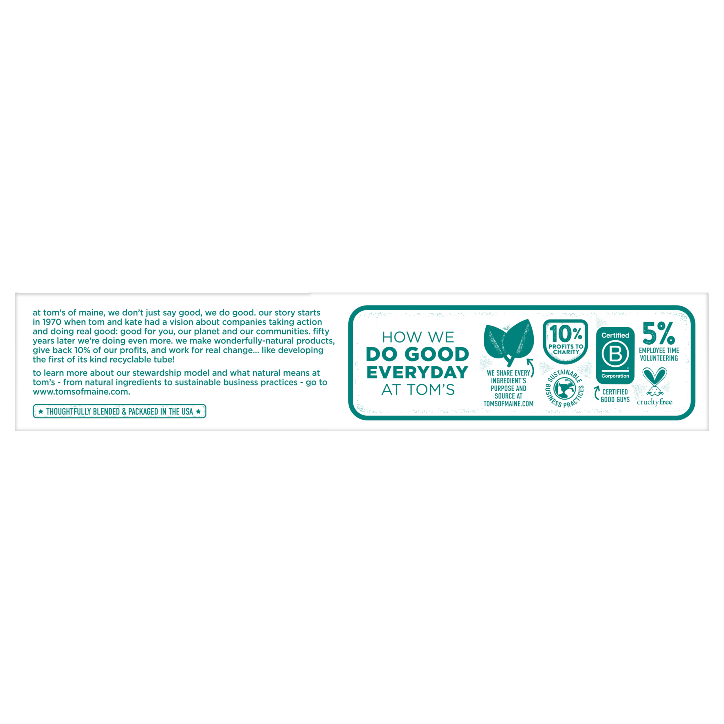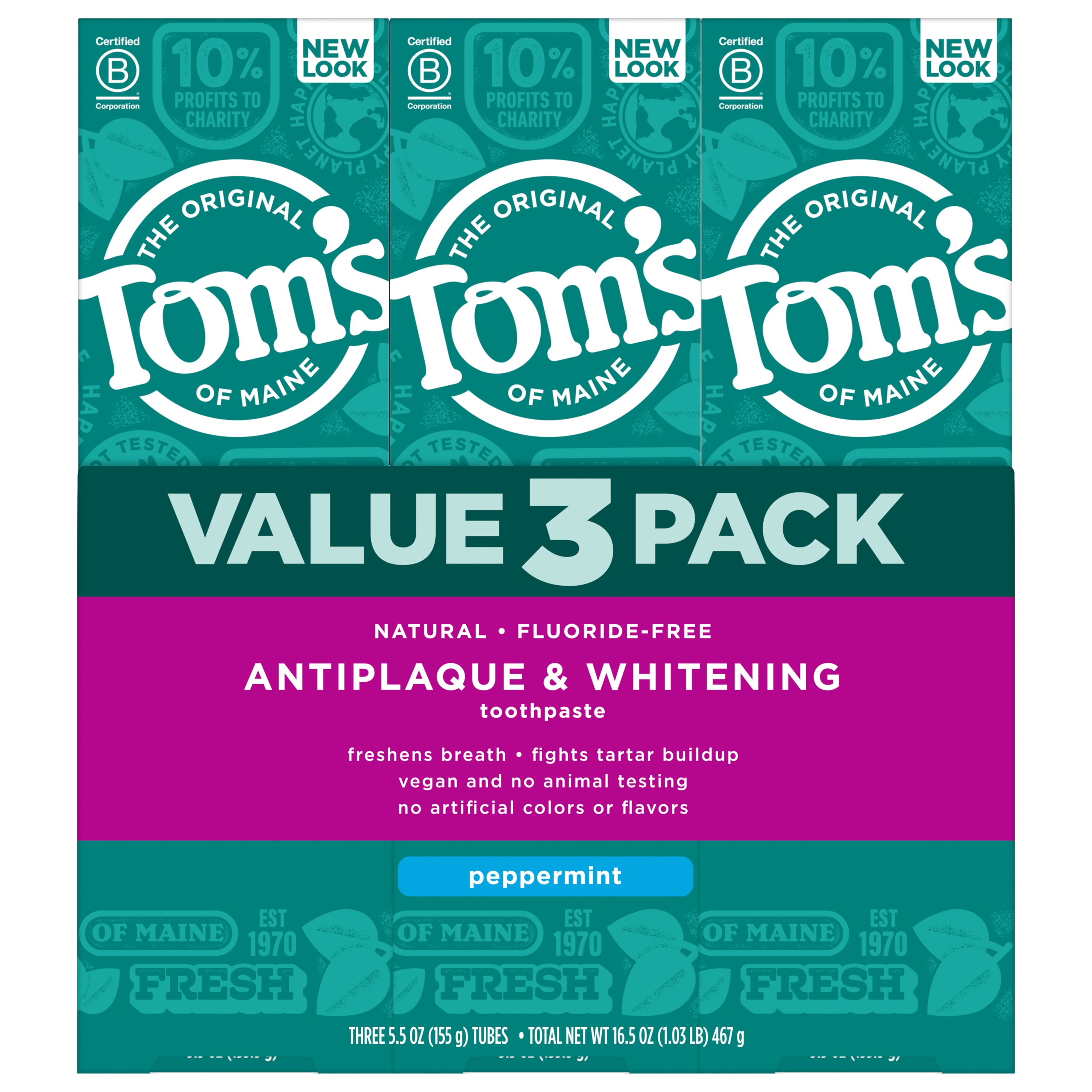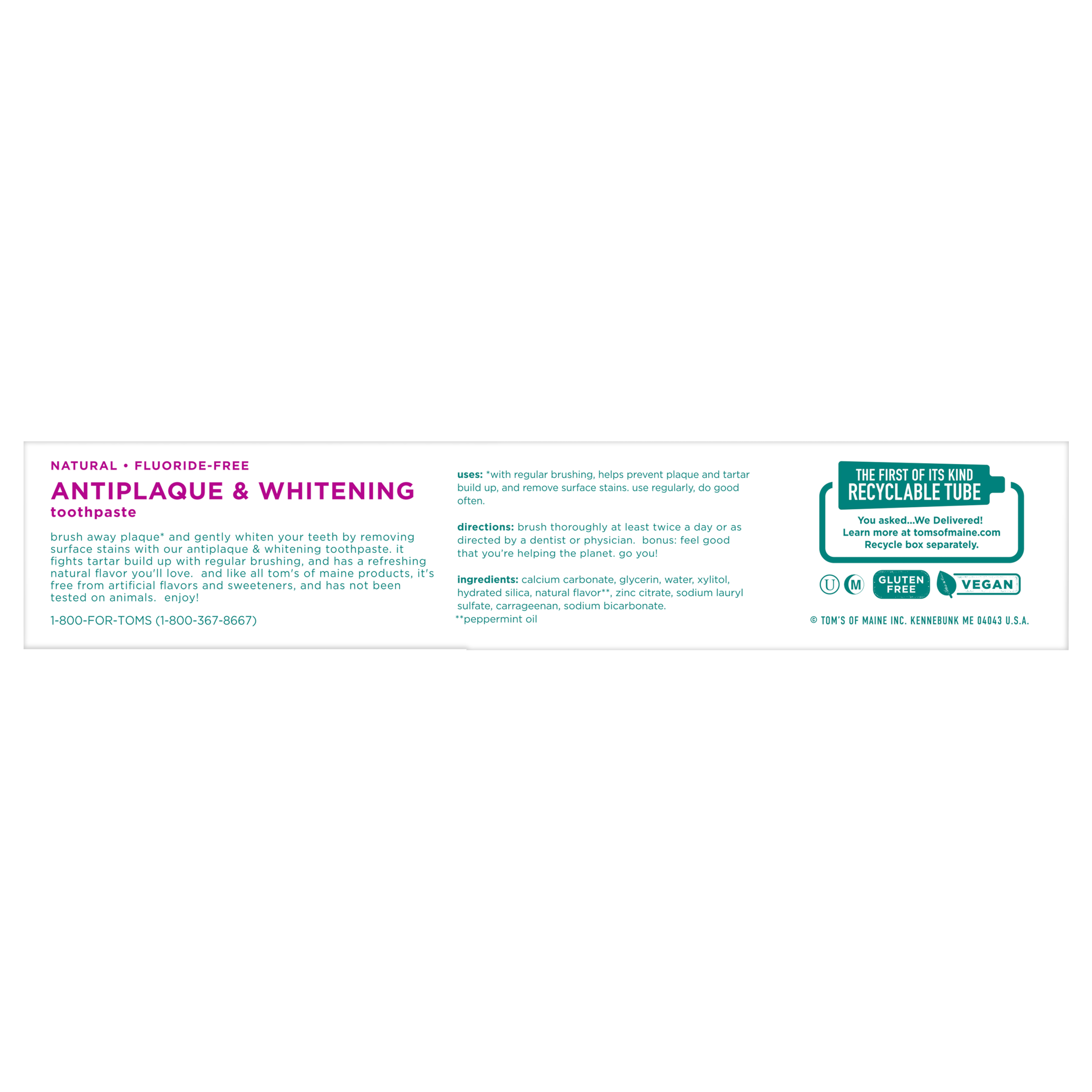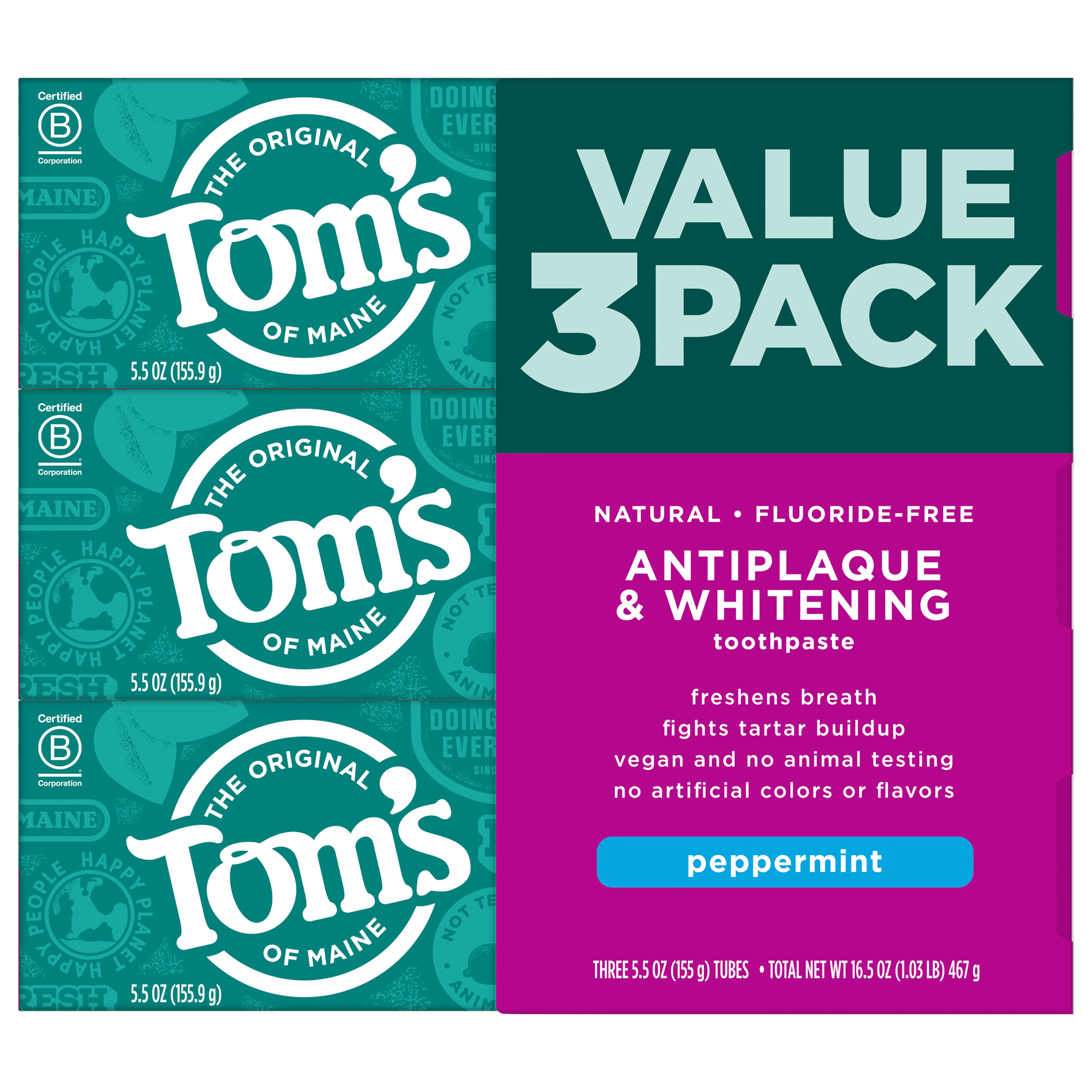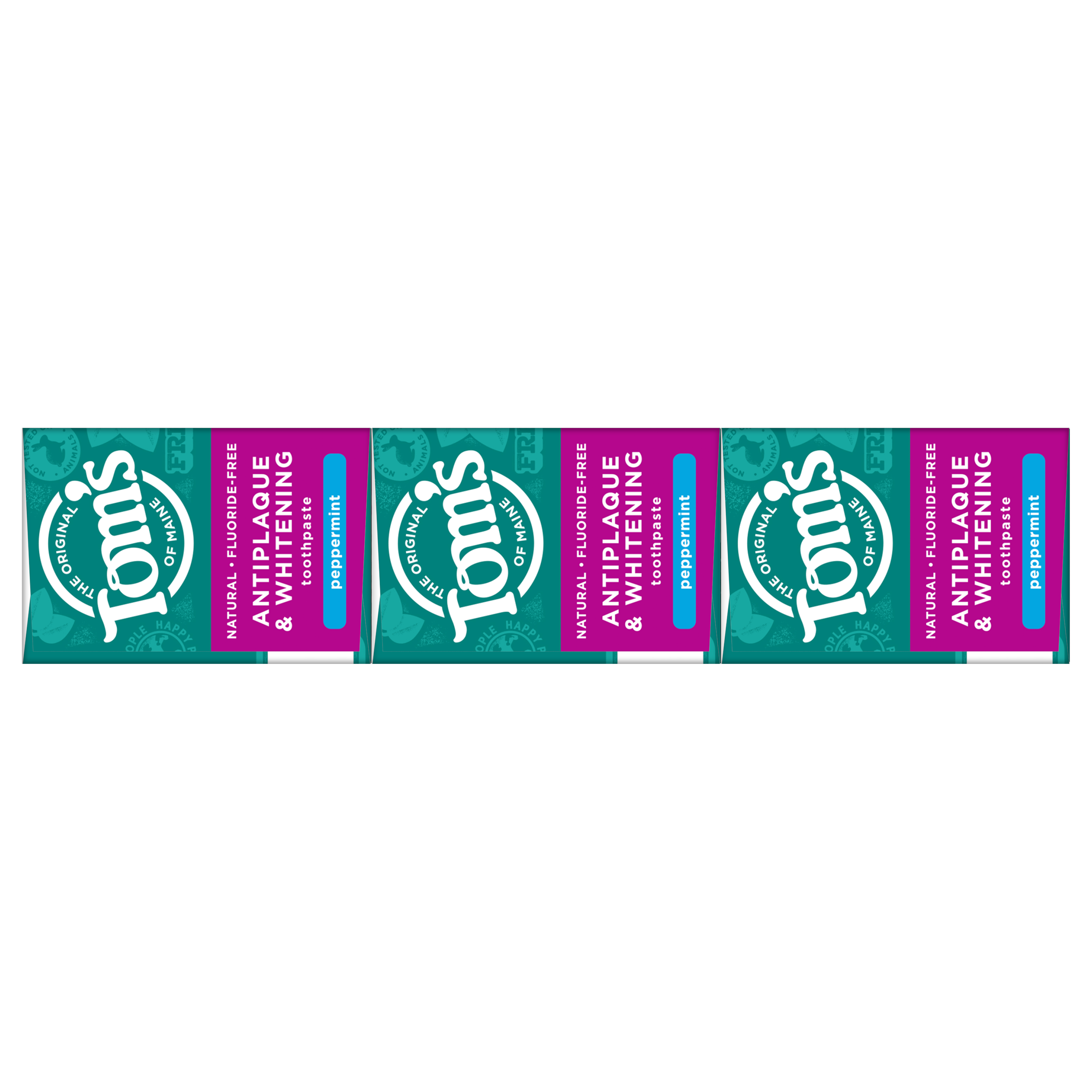 SKU US04607A Consumer Unit - GTIN 00077326453575 Case - GTIN 10077326453572 Product Category Oral Care Product Sub Category Toothpaste Product Equity (Brand) Tom's of Maine Product Sub Brand Tom's AP & Whitening TP Product Title Tom's of Maine Fluoride-Free Antiplaque & Whitening Natural Toothpaste, Peppermint, 5.5 oz. 3-Pack Product Description Get squeaky clean teeth with Tom's of Maine Fluoride-Free Antiplaque & Whitening Toothpaste. This fluoride-free toothpaste uses naturally derived ingredients to help prevent tartar buildup and remove surface stains. The result? A brighter, whiter smile. Plus, the natural flavor of Peppermint will make you look forward to brushing. Now that's fresh. Check to be sure that your tube has the blue recycling flag on it, squeeze out as much of the toothpaste from the tube as you can, replace the cap, and place the tube in your recycling bin. Order Tom's of Maine toothpaste and discover our range of natural personal care products. At Tom's of Maine, we want to empower families to live more naturally. With more than 5 years experience combining scientific know-how, naturally derived ingredients and a bit of ingenuity, we make products that are good for you and the planet. As a Certified B Corp, we hold ourselves to the highest social and environmental standards. Plus, we're committed to supporting local communities for meaningful change, donating 1% of our profits to charities supporting health, education and the environment. We call this "doing good, for real," and it impacts everything we do. eCommerce Copy- Long Description Get squeaky clean teeth with Tom's of Maine Fluoride-Free Antiplaque & Whitening Toothpaste. This fluoride-free toothpaste uses naturally derived ingredients to help prevent tartar buildup and remove surface stains. The result? A brighter, whiter smile. Plus, the natural flavor of Peppermint will make you look forward to brushing. Now that's fresh. Check to be sure that your tube has the blue recycling flag on it, squeeze out as much of the toothpaste from the tube as you can, replace the cap, and place the tube in your recycling bin. Order Tom's of Maine toothpaste and discover our range of natural personal care products. At Tom's of Maine, we want to empower families to live more naturally. With more than 50 years experience combining scientific know-how, naturally derived ingredients and a bit of ingenuity, we make products that are good for you and the planet. As a Certified B Corp, we hold ourselves to the highest social and environmental standards. Plus, we're committed to supporting local communities for meaningful change, donating 10% of our profits to charities supporting health, education and the environment. We call this "doing good, for real," and it impacts everything we do. Bullet 1 WHAT YOU'LL GET: Three 5.5-ounce tubes of Tom's of Maine Natural Fluoride-Free Antiplaque & Whitening Toothpaste in Peppermint Flavor Bullet 2 FLUORIDE-FREE TOOTHPASTE: Helps fight tartar buildup with antiplaque formula Bullet 3 WHITENS TEETH: Natural toothpaste helps remove surface stains for a brighter, whiter smile Bullet 4 DO MORE GOOD: Look for the blue recycling flag on your tube, squeeze out as much of the toothpaste from the tube as you can, replace the cap, and recycle Bullet 5 TAKE CARE OF YOURSELF NATURALLY: Contains no artificial preservatives, colors or flavors and is not tested on animals Target RPC 79692754 Target URL https://www.target.com/p/a/-/A-79692754