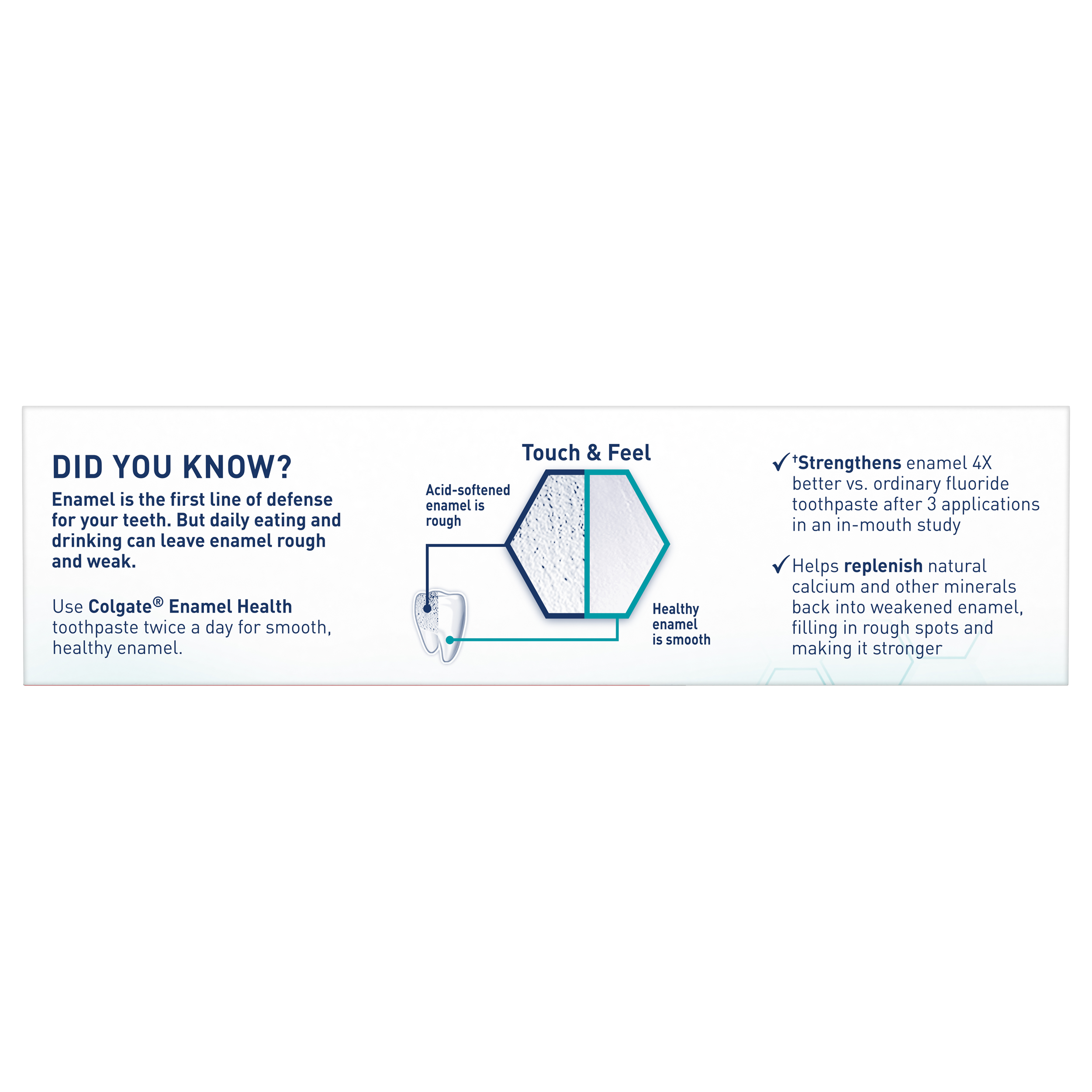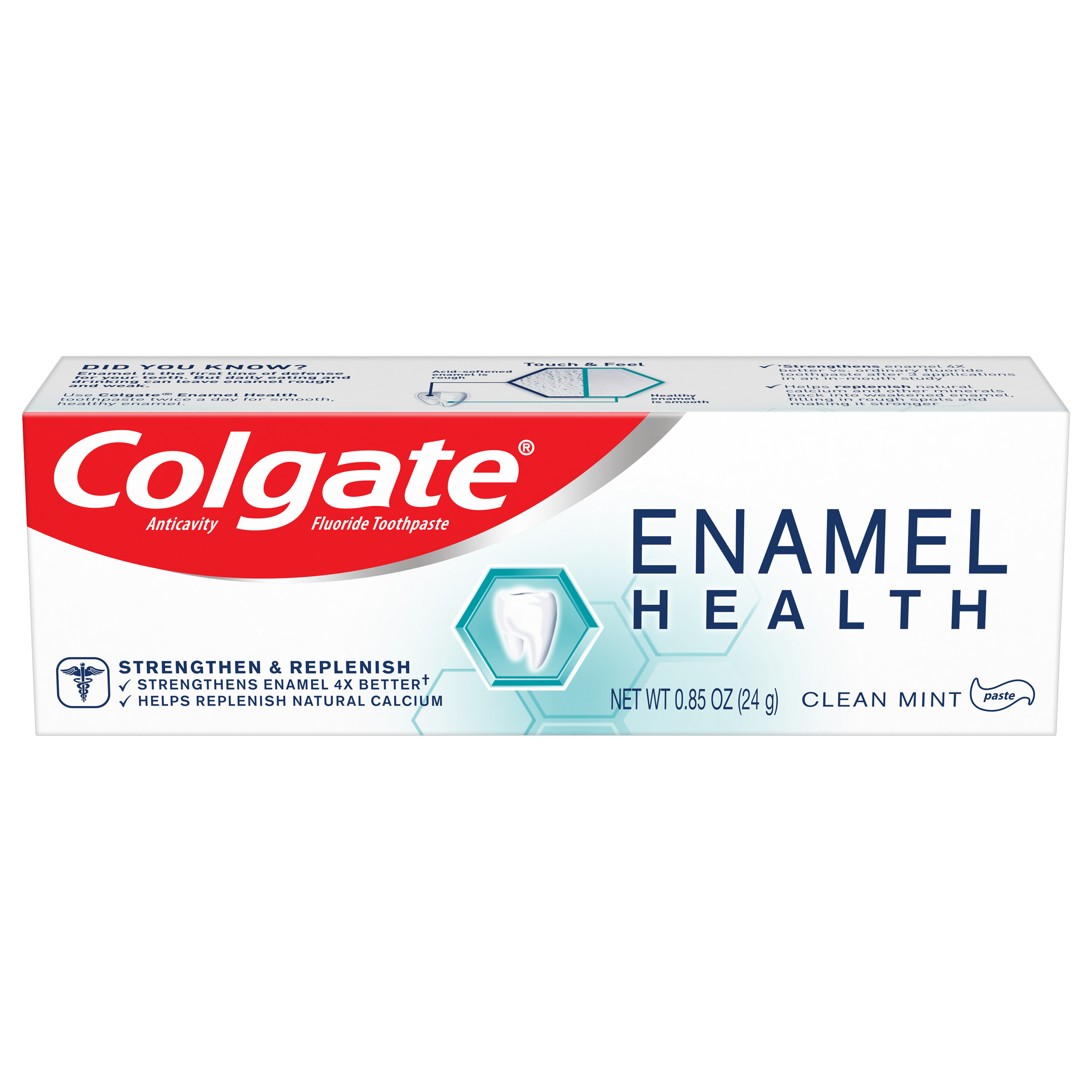 SKU US04663A Consumer Unit - GTIN 00038341454152 Case - GTIN 10038341454159 Product Category Oral Care Product Sub Category Toothpaste Product Equity (Brand) Colgate Product Sub Brand Colgate Enamel Health TP Product Title Colgate® Enamel Health™ Toothpaste, Clean Mint, .85oz Product Description Colgate® Enamel Health™ toothpaste helps improve your enamel by replenishing natural calcium and other minerals back into your enamel to defend against acid erosion and gently polishes your enamel so bacteria are less likely to stick. Colgate Enamel Health Whitening toothpaste helps protect against enamel erosion, whitens teeth and fights cavities. Plus it has the freshness you trust from Colgate. Bullet 1 Whitening toothpaste that gently whitens teeth Bullet 2 Helps to build stronger, healthy enamel Bullet 3 Replenishes natural calcium and polishes enamel Bullet 4 Helps protect against enamel erosion Bullet 5 Fluoride formula fights cavities Bullet 6 Freshens breath with clean mint paste Active Ingredients Active Ingredient: Sodium Fluoride (0.24% (0.15% w/v Fluoride Ion)). Purpose: Anticavity.
