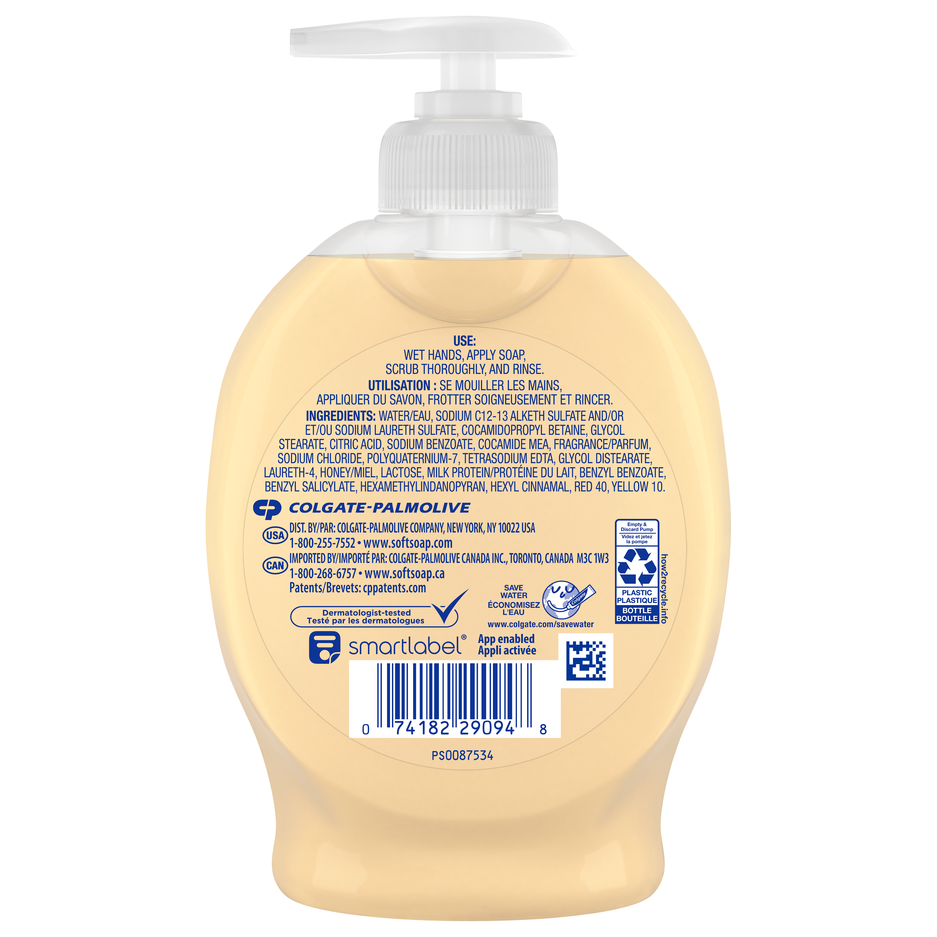 SKU US04965A Consumer Unit - GTIN 00074182290948 Case - GTIN 10074182456426 Product Category Personal Care Product Sub Category Liquid Hand Wash Product Equity (Brand) Softsoap Product Sub Brand Softsoap LHW Product Title Softsoap Milk and Honey Liquid Hand Soap, Kitchen and Bathroom Hand Soap, 7.5 fl oz Product Description Experience the joy of clean with Softsoap's Milk and Honey liquid hand soap, a fun addition to your sink this season. As the #1 liquid hand soap brand (1), Softsoap delivers an uplifting experience with each use. Whether this soap is used in the kitchen or as a bathroom hand soap, you’ll love the original milk and honey scent you know and love while keeping your hands clean and fresh. This hand soap is designed to keep on your sink to uplift every small moment. Our hand soap washes away bacteria so you can confidently clean your hands, aligning with health care recommendations of washing hands with soap and clean running water for 20 seconds. Proudly formulated without parabens or phthalates, this dermatologist-tested hand soap is dedicated to safety and care, ensuring that each wash retains skin's natural moisture, so you can feel good about washing your hands. Let Softsoap's liquid hand soap infuse a little bit of fun into your daily routine and transform every handwashing moment into a delightful one. (1) Based in part on data reported by Nielsen through its Market Track Service for the Liquid Hand Soap Category for the 52 week period ending 07/01/23, for the All Outlet market. Copyright © 2023 Nielsen. eCommerce Copy- Long Description From the #1 liquid hand soap brand† comes Softsoap Milk & Honey scented liquid hand soap with a label you’ll want to show off on your sink. With a rich and creamy honey scent, Softsoap Milk & Honey scent liquid hand soap is a hand soap you’ll want to keep on your sink to infuse every small moment with joy. This liquid hand soap effectively washes away bacteria for clean and fresh hands. Feel the joy of clean with Softsoap hand soap! †Based in part on data reported by Nielsen through its Market Track Service for the Liquid Hand Soap Category for the 52 week period ending 1/1/22, for the All Outlet market. Copyright © 2022 Nielsen. Great Clean. For Everyone. Confidently wash your hands with Softsoap while enjoying fragrant scents and fun labels that will bring you joy. For everyone, every mood, and every sink, Softsoap hand soap is designed to make you feel joyfully clean. Use Milk & Honey scent liquid hand soap in the bathroom or the kitchen to uplift every small moment while keeping your hands clean. Feel Good About Washing Your Hands This liquid hand soap washes away bacteria and is an effective way to keep hands clean. Plus, this liquid soap is paraben free and formulated without phthalates, and retains skin’s natural moisture, so you can feel good about washing your hands. Feel the Joy of Clean We believe that the little moments throughout your day should be fun! With delightful bubbles and fragrant scents, every trip to the sink and every shower leaves you feeling uplifted. Enjoy those small moments of joy, get brilliantly clean with our liquid hand soaps and body washes—now, you’re ready to take on the world! Bullet 1 One 7.5 fl oz Pump Bottle of Softsoap Milk and Honey Liquid Hand Soap Bullet 2 Softsoap is the #1 liquid hand soap brand (1) Bullet 3 This hand soap pump is designed to keep on your sink to uplift every small moment Bullet 4 Proudly formulated without parabens or phthalates, this dermatologist-tested hand soap is dedicated to safety and care Bullet 5 Versatile to use in the bathroom or as a kitchen hand soap Bullet 6 Our hand soap washes away bacteria so you can confidently clean your hands, aligning with health care recommendations of washing hands with soap and clean running water for 20 seconds Bullet 7 Retains skin's natural moisture so you can feel good about washing your hands Amazon RPC B079FYJC97 AMZ URL https://www.amazon.com/dp/B079FYJC97 Walmart RPC 10323314 Walmart URL (Computed) https://www.walmart.com/ip/a/10323314 Target RPC 47030973 Target URL https://www.target.com/p/a/-/A-47030973 Albertsons RPC 153050174 Albertsons URL https://www.albertsons.com/shop/product-details.153050174.html CVS RPC 211651 Dollar Tree RPC 878632 Family Dollar RPC 2031217