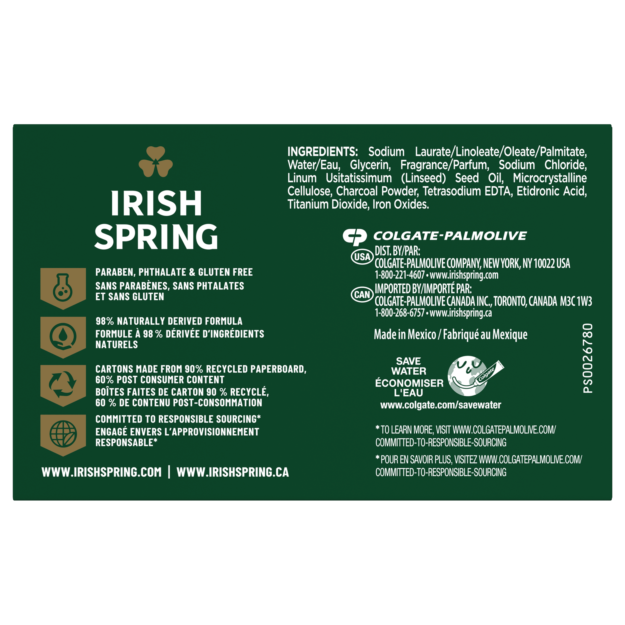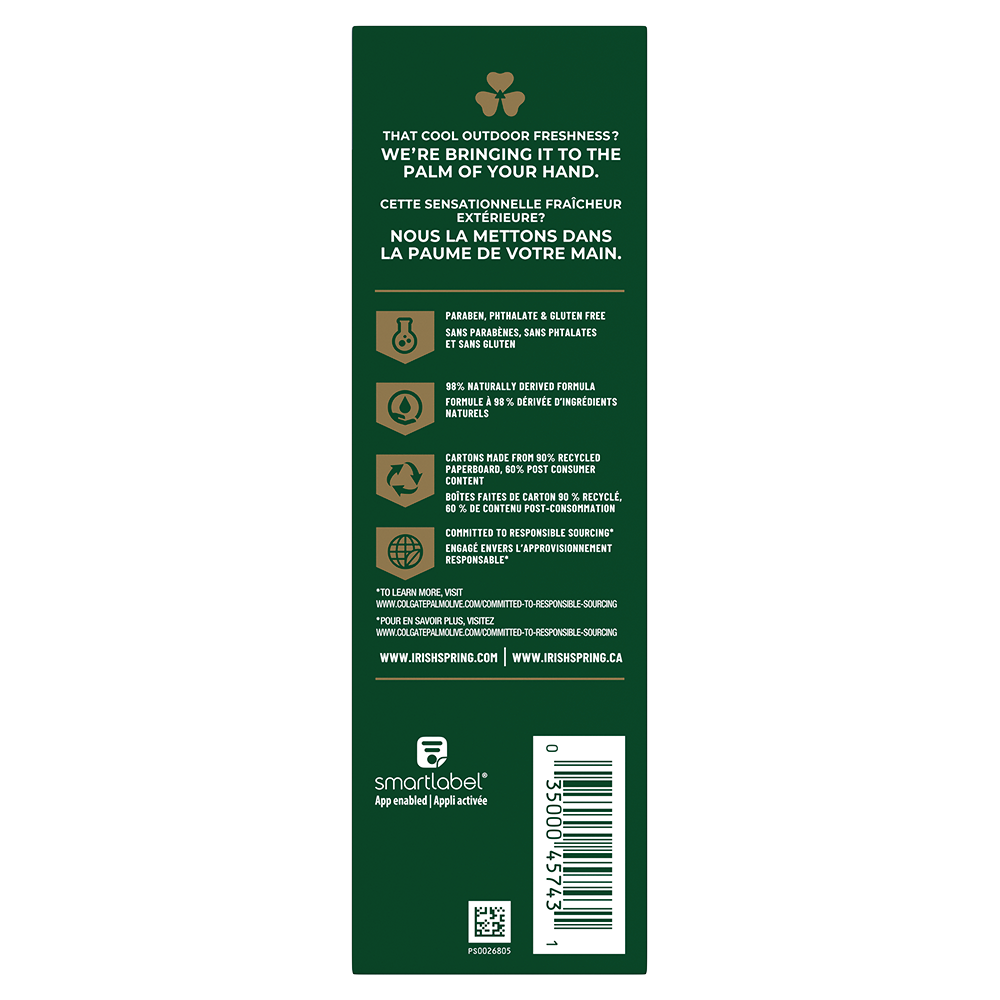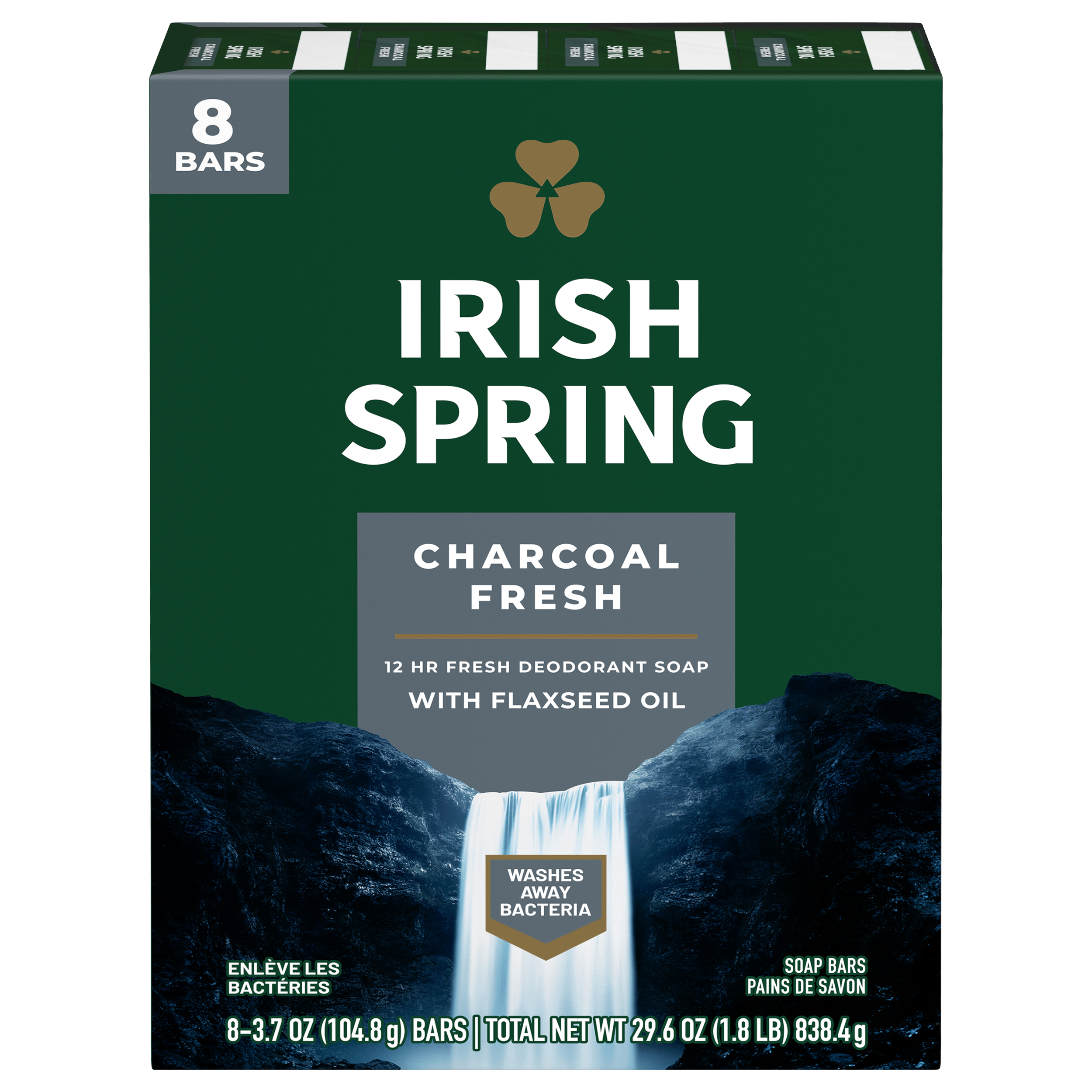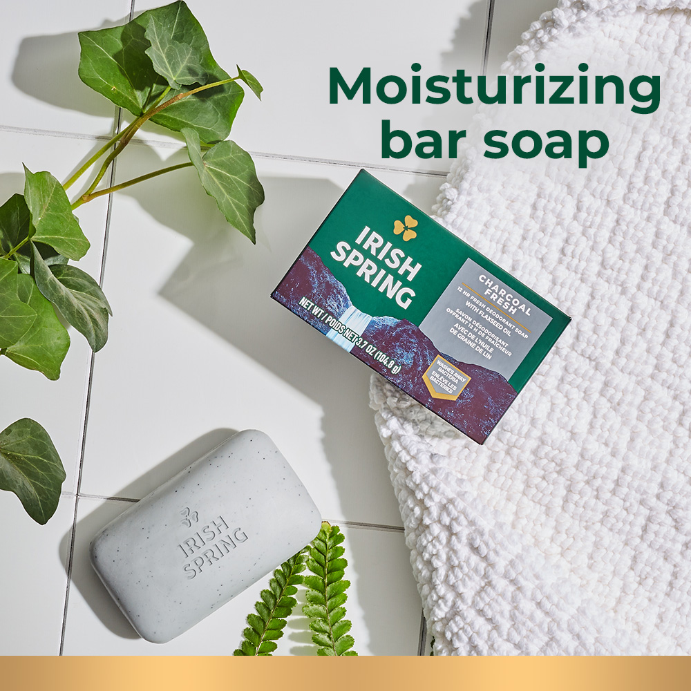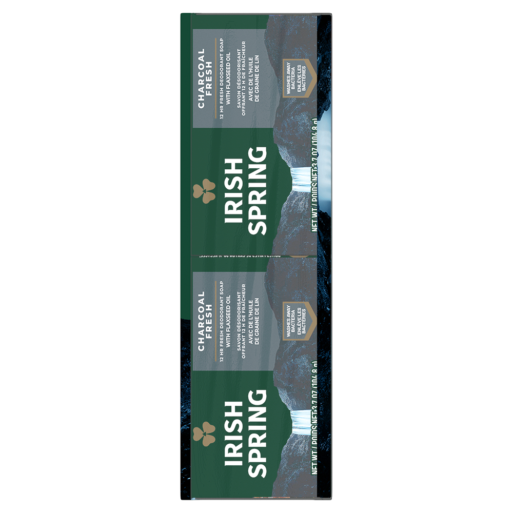 SKU US05031A Case - GTIN 10035000457438 Product Category Personal Care Product Sub Category Bar Soap Product Equity (Brand) Irish Spring Product Sub Brand Irish Spring BS Product Title Irish Spring Charcoal Fresh Deodorant Bar Soap for Men, 3.7 oz, 8 Pack Product Description Smell like you came from a nice-smelling place with Irish Spring Bar Soap. The Irish Spring bar soap carton might have a new design and name, but it’s still the same great bar soap you love to smell. Count on Irish Spring Charcoal Fresh Deodorant Bar Soap, formerly our Charcoal bar soap, to leave your skin feeling clean — our bar soap for men is made with a 98% naturally derived formula that keeps you fresh for 12 hours. Plus, this men’s bar soap is mild for skin and paraben, phthalate and gluten free. This bar soap also has flaxseed oil. Feel good while washing your body with Irish Spring and use Irish Spring Charcoal Fresh Bar Soap as a hand soap, too — this charcoal bar soap has a sudsy lather that washes away bacteria. Get as fresh as the great outdoors and add some adventure to your everyday with Irish Spring’s whole line of body washes and bar soaps for men. Never go without smelling your best and stock up on the conveniently packaged Irish Spring bar soap packs. Keep some in your bathroom, in the pantry, give some to your friends and keep the good smells going. Feel clean, smell serene with the new Irish Spring. Bullet 1 Irish Spring Charcoal Fresh Bar Soap, 8 Pack Bullet 2 Irish Spring Charcoal Fresh bar soap pack has a fresh look and the same great smell Bullet 3 Has flaxseed oil Bullet 4 This bar soap for men is mild for skin, so you can feel as great as you smell Bullet 5 98% naturally derived formula that’s paraben, phthalate and gluten free Bullet 6 This men’s bar soap has a sudsy lather that washes away bacteria and can be used as a hand soap Bullet 7 Recyclable carton Walmart RPC 787115404 Walmart URL (Computed) https://www.walmart.com/ip/a/787115404