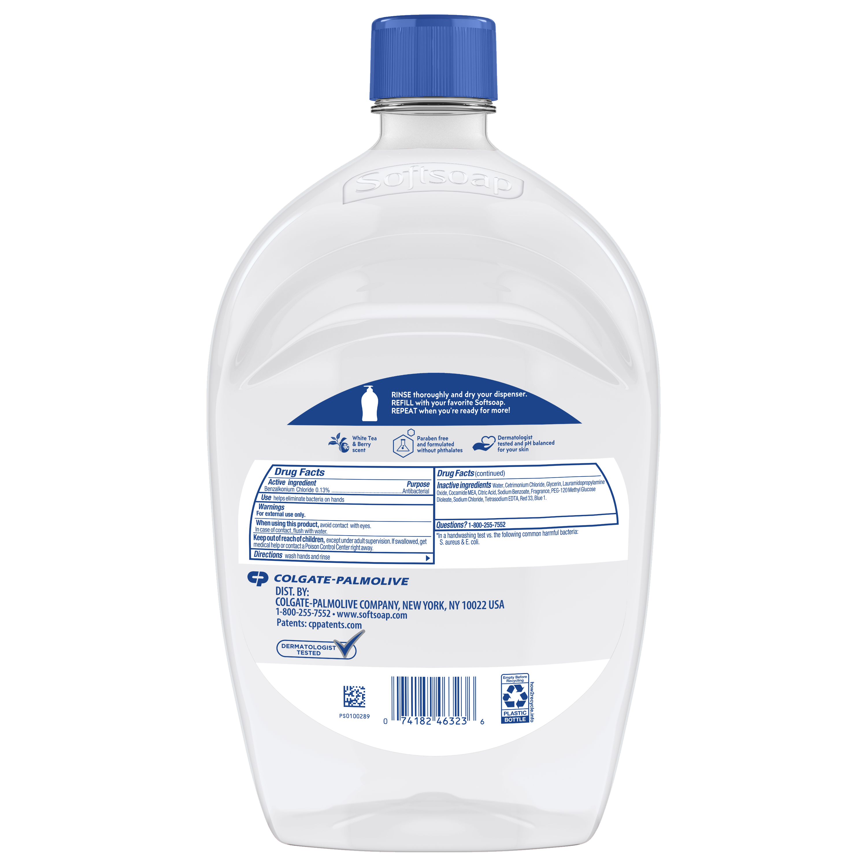 SKU US05259A Consumer Unit - GTIN 00074182463236 Case - GTIN 10074182463233 Product Category Personal Care Product Sub Category Liquid Hand Wash Product Equity (Brand) Softsoap Product Sub Brand Softsoap Antibacterial LHW Product Title Softsoap Antibacterial Liquid Hand Soap, Kitchen and Bathroom Hand Soap, White Tea and Berry Scent, 50 fl oz Refill Product Description Keep your favorite Softsoap Antibacterial Liquid Hand Soap stocked and ready for use. From the #1 liquid hand soap brand (1), comes Softsoap Antibacterial Liquid Hand Soap which eliminates 99.9% of bacteria (2). With a refreshing White Tea and Berry scent, this antibacterial hand soap effectively cleans hands while infusing small moments with joy. This liquid hand soap is enriched with moisturizers and helps protect skin’s natural barrier by retaining skin’s natural moisture. (1) Based in part on data reported by Nielsen through its Market Track Service for the Liquid Hand Soap Category for the 52 week period ending 02/14/25, for the All Outlet market. Copyright © 2025 Nielsen. (2) In handwashing tests vs. the following common harmful bacteria: S. aureus & E. coli eCommerce Copy- Long Description From the #1 liquid hand soap brand†, comes Softsoap Antibacterial White Tea & Berry Scented Liquid Hand Soap which eliminates 99.9% of bacteria*. With a White Tea & Berry scent, this antibacterial hand soap effectively cleans hands while infusing small moments with joy. Softsoap White Tea & Berry Scented Antibacterial liquid hand soap is enriched with moisturizers and helps protect skin’s natural barrier by retaining skin’s natural moisture. Due to its unique formula, the liquid hand soap pump should only be refilled with Softsoap Antibacterial Liquid Hand Soap. This liquid hand soap is paraben free, formulated without phthalates, and dermatologist tested. Feel the joy of clean with Softsoap hand soap! *in a handwashing test vs. the following common harmful bacteria: S. aureus & E. coli *Based in part on data reported by Nielsen through its Market Track Service for the Liquid Hand Soap Category for the 52 week period ending 12/23/23, for the All Outlet market. Copyright © 2023 Nielsen. Great Clean. For Everyone. Confidently wash your hands with Softsoap while enjoying fragrant scents and fun labels that will bring you joy. For everyone, every mood, and every sink, Softsoap hand soap is designed to make you feel joyfully clean. Use White Tea & Berry scented Antibacterial liquid hand soap in the bathroom or the kitchen to uplift every small moment while keeping your hands clean. Feel Good About Washing Your Hands This liquid hand soap washes away bacteria and is an effective way to keep hands clean. Plus, this liquid soap is paraben free and formulated without phthalates, uses 48% less plastic*, and retains skin’s natural moisture, so you can feel good about washing your hands. **per ounce vs 7.5oz pumps Feel the Joy of Clean We believe that the little moments throughout your day should be fun! With delightful bubbles and fragrant scents, every trip to the sink and every shower leaves you feeling uplifted. Enjoy those small moments of joy, get brilliantly clean with our liquid hand soaps and body washes—now, you’re ready to take on the world! Bullet 1 One 50 fl oz refill bottle of Softsoap Antibacterial Liquid Hand Soap; White Tea and Berry Scent Bullet 3 Softsoap Antibacterial Liquid Hand Soap eliminates 99.9% of bacteria (2) Bullet 4 With a refreshing White Tea and Berry scent, this antibacterial hand soap effectively cleans hands while infusing small moments with joy Bullet 5 This liquid hand soap is enriched with moisturizers and helps protect skin’s natural barrier by retaining skin’s natural moisture Bullet 6 This antibacterial liquid hand soap is paraben free, formulated without phthalates, and dermatologist tested Bullet 7 Refill only with Softsoap brand Antibacterial soap Active Ingredients Benzalkonium Chloride 0.13% Amazon RPC B081FFRGZB AMZ URL https://www.amazon.com/dp/B081FFRGZB Walmart RPC 747424482 Walmart URL (Computed) https://www.walmart.com/ip/a/747424482 Target RPC 75566357 Target URL https://www.target.com/p/a/-/A-75566357 Albertsons RPC 960565594 Albertsons URL https://www.albertsons.com/shop/product-details.960565594.html CVS RPC 326675