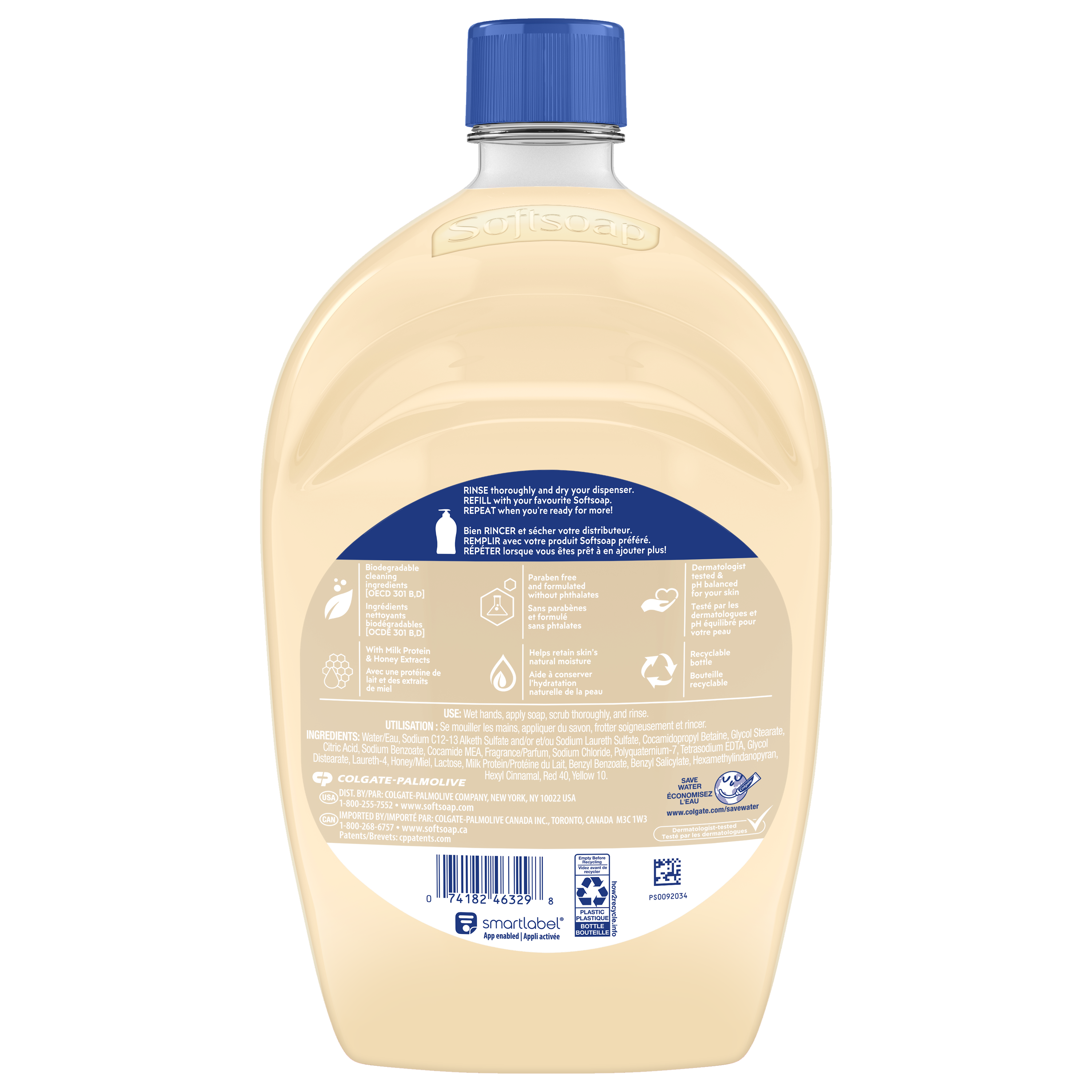 SKU US05263A Consumer Unit - GTIN 00074182463298 Case - GTIN 10074182463295 Product Category Personal Care Product Sub Category Liquid Hand Wash Product Equity (Brand) Softsoap Product Sub Brand Softsoap LHW Product Title Softsoap Moisturizing Liquid Hand Soap, Kitchen and Bathroom Hand Soap, Milk & Honey Scent, 50 fl oz Refill Product Description Keep your favorite Softsoap Moisturizing Liquid Hand Soap stocked and ready for use. As the #1 liquid hand soap brand (1), Softsoap delivers an uplifting experience with each use. Whether this soap is used in the kitchen or as a bathroom hand soap, you’ll love that this moisturizing soap leaves your hands feeling soft and smooth. This liquid hand soap is formulated with extracts of milk protein and sweet honey. It washes away bacteria so you can confidently clean your hands, aligning with health care recommendations to wash hands with soap and clean running water for 20 seconds. Proudly formulated without parabens or phthalates so you can feel good about washing your hands. Let Softsoap's Milk & Honey scented liquid hand soap infuse a little bit of fun into your daily routine and transform every handwashing moment into a delightful one. (1) Based in part on data reported by Nielsen through its Market Track Service for the Liquid Hand Soap Category for the 52 week period ending 02/14/25, for the All Outlet market. Copyright © 2025 Nielsen. eCommerce Copy- Long Description From the #1 liquid hand soap* brand comes a moisturizing hand soap refill in a Milk & Honey scent, that will leave your skin feeling soft and smooth. This 50oz bottle refills over six 7.5oz bottles. This liquid hand soap effectively washes away bacteria for clean and fresh hands. Feel the joy of clean with Softsoap hand soap! *Based in part on data reported by Nielsen through its Market Track Service for the Liquid Hand Soap Category for the 52 week period ending 12/23/23, for the All Outlet market. Copyright © 2023 Nielsen. Great Clean. For Everyone. Confidently wash your hands with Softsoap while enjoying fragrant scents and fun labels that will bring you joy. For everyone, every mood, and every sink, Softsoap hand soap is designed to make you feel joyfully clean. Use Milk & Honey scented liquid hand soap in the bathroom or the kitchen to uplift every small moment while keeping your hands clean. Feel Good About Washing Your Hands This liquid hand soap washes away bacteria and is an effective way to keep hands clean. Plus, this liquid soap is paraben free and formulated without phthalates, and uses 48% less plastic* and retains skin’s natural moisture, so you can feel good about washing your hands. *per ounce vs. 7.5oz pumps Feel the Joy of Clean We believe that the little moments throughout your day should be fun! With delightful bubbles and fragrant scents, every trip to the sink and every shower leaves you feeling uplifted. Enjoy those small moments of joy, get brilliantly clean with our liquid hand soaps and body washes—now, you’re ready to take on the world! Bullet 1 One 50 fl oz refill bottle of Softsoap Moisturizing Liquid Hand Soap, Milk & Honey Scent Bullet 2 Softsoap is the #1 liquid hand soap brand (1) Bullet 3 This liquid hand soap is formulated with extracts of milk protein and sweet honey Bullet 4 Our hand soap refill is mess free making it versatile to use in the bathroom or as a kitchen hand soap Bullet 5 Proudly formulated without parabens or phthalates, this dermatologist-tested hand soap will keep your hands clean and fresh Bullet 6 This hand soap washes away bacteria so you can confidently clean your hands, aligning with health care recommendations to wash hands with soap and clean running water for 20 seconds Bullet 7 Dermatologist Tested Hand Wash Formula Bullet 8 Makes a Great Bathroom or Kitchen Hand Soap Bullet 9 Recyclable Bottle Amazon RPC B07L98GZH9 AMZ URL https://www.amazon.com/dp/B07L98GZH9 Walmart RPC 887391539 Walmart URL (Computed) https://www.walmart.com/ip/a/887391539 Target RPC 75566361 Target URL https://www.target.com/p/a/-/A-75566361 Albertsons RPC 960496806 Albertsons URL https://www.albertsons.com/shop/product-details.960496806.html CVS RPC 743694