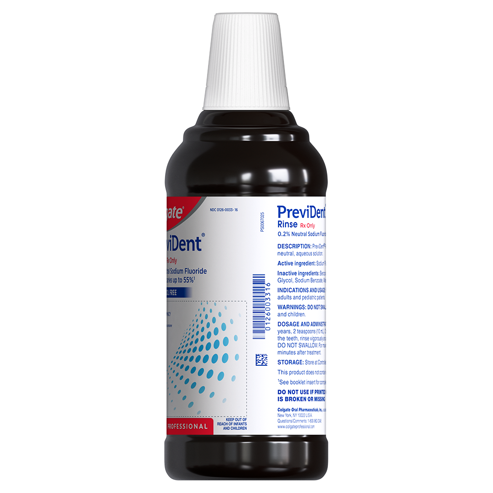 SKU US05313A Consumer Unit - GTIN 00301260033167 Case - GTIN 10301260033164 Product Category Oral Care Product Sub Category PP Other Professional Product Equity (Brand) Colgate Product Sub Brand Colgate PreviDent PP Product Title Colgate® PreviDent® Fluoride Rinse, Mint, 16 oz (Rx Only) Bullet 1 Alcohol-free* rinse for gentle and effective cavity protection Bullet 2 Ideal for your at–risk caries patients including those who have difficulty brushing Bullet 3 Proven to provide 55% reduction in caries with weekly use1 Active Ingredients Sodium Fluoride 0.2% (0.09% w/v fluoride ion)