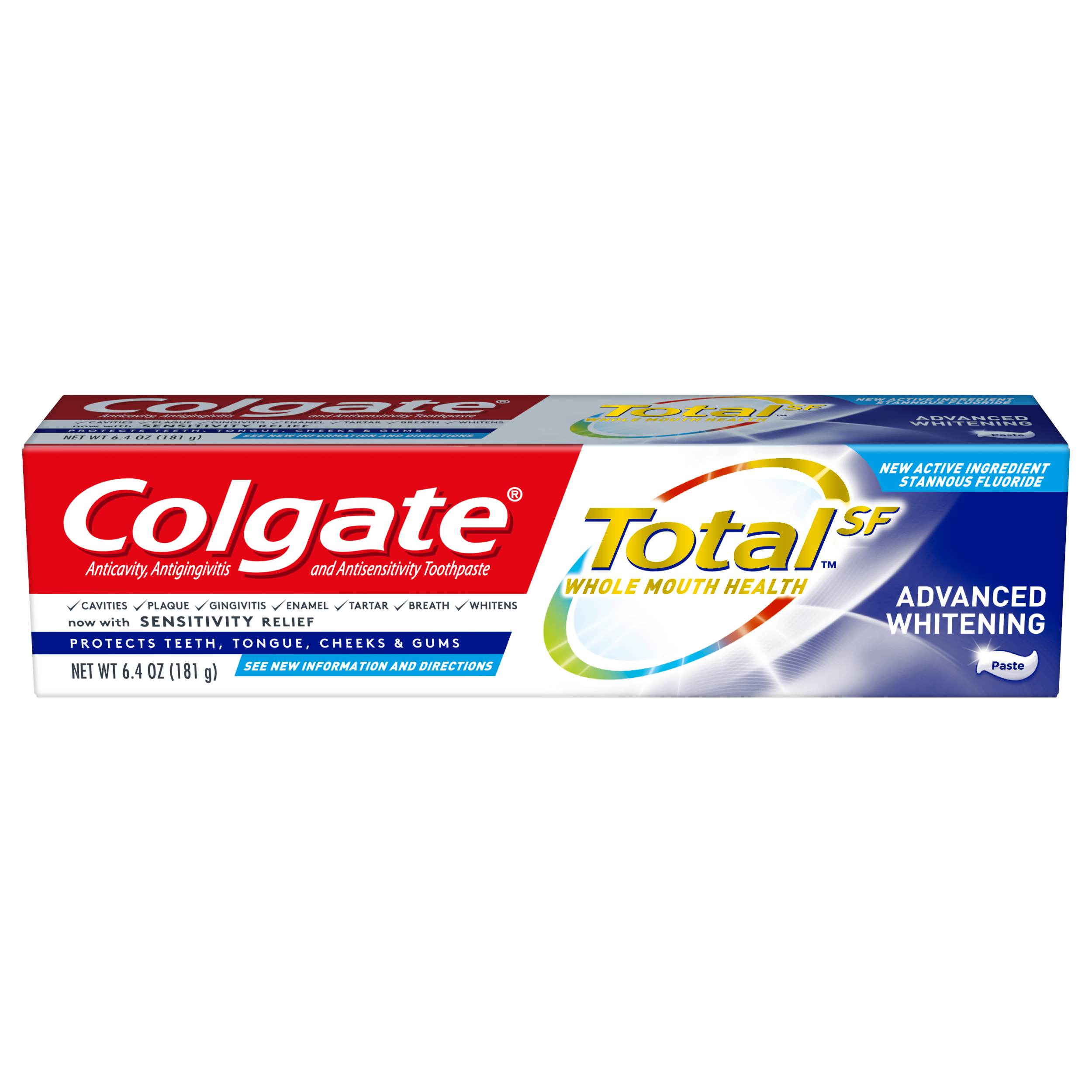 SKU US05346A Consumer Unit - GTIN 35000463760 Case - GTIN 10035000463767 Product Category Oral Care Product Sub Category Toothpaste Product Equity (Brand) Colgate Product Sub Brand Colgate Total TP Product Title Colgate Total Advanced Whitening Paste 6.4oz (WIP) Product Description Colgate Total SF Advanced Whitening Toothpaste has a breakthrough formula that fights bacteria on teeth, tongue, cheeks and gums for Whole Mouth Health. Colgate Total with stannous fluoride also offers more benefits than ever including sensitivity relief, improved enamel strength* and odor neutralization* (*based on in vitro studies) eCommerce Copy- Long Description Colgate Total SF Advanced Whitening Toothpaste has a breakthrough formula that fights bacteria on teeth, tongue, cheeks and gums for Whole Mouth Health. Colgate Total with stannous fluoride also offers more benefits than ever including sensitivity relief, improved enamel strength* and odor neutralization* (*based on in vitro studies) Bullet 1 Breakthrough Formula Bullet 2 Stain Removal and Prevention for a Beautiful Smile Bullet 3 Fights Bacteria on Teeth, Tongue, Cheeks and Gums for Whole Mouth Health Bullet 4 Whitening Toothpaste, Helps Remove Surface Stains Bullet 5 Helps Prevent Plaque, Tartar, Cavities & Gingivitis Bullet 6 Now with Relief for Sensitive Teeth Bullet 7 Paste Toothpaste Formula Active Ingredients Stannous Fluoride 0.454%