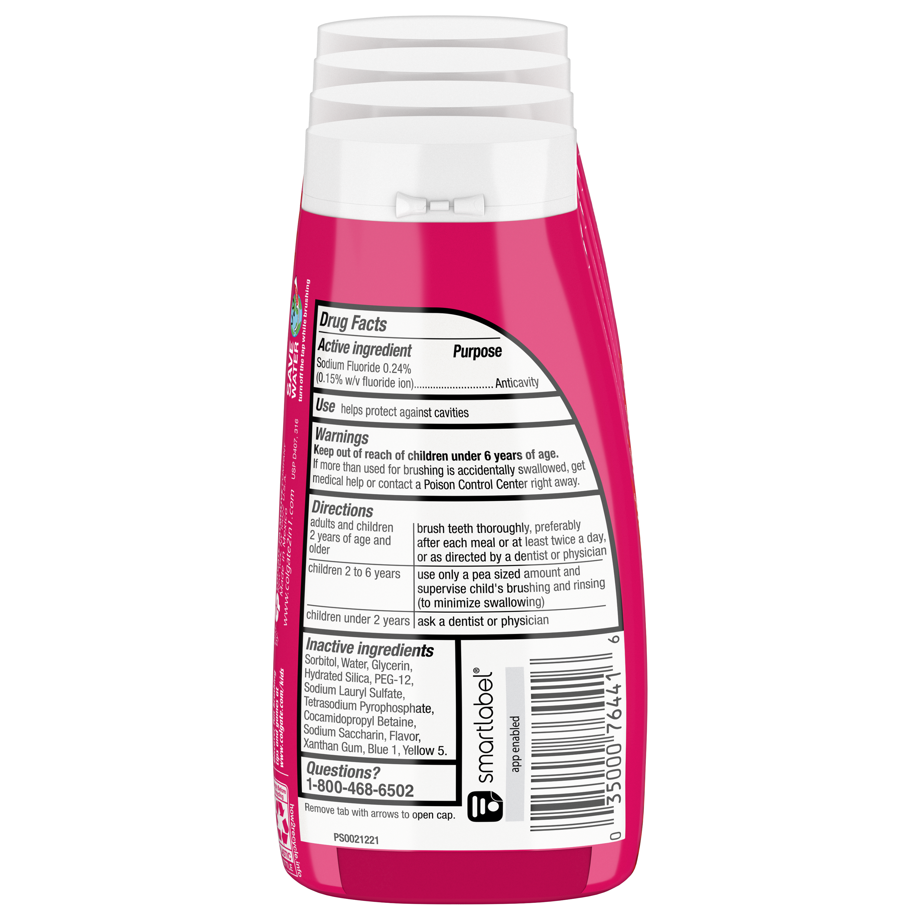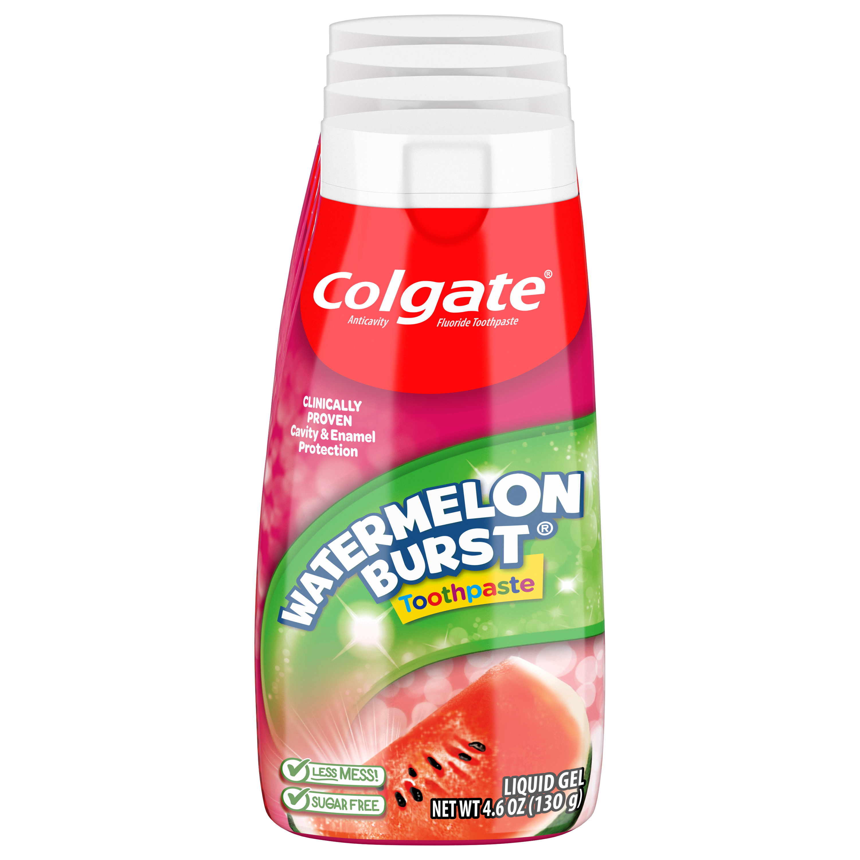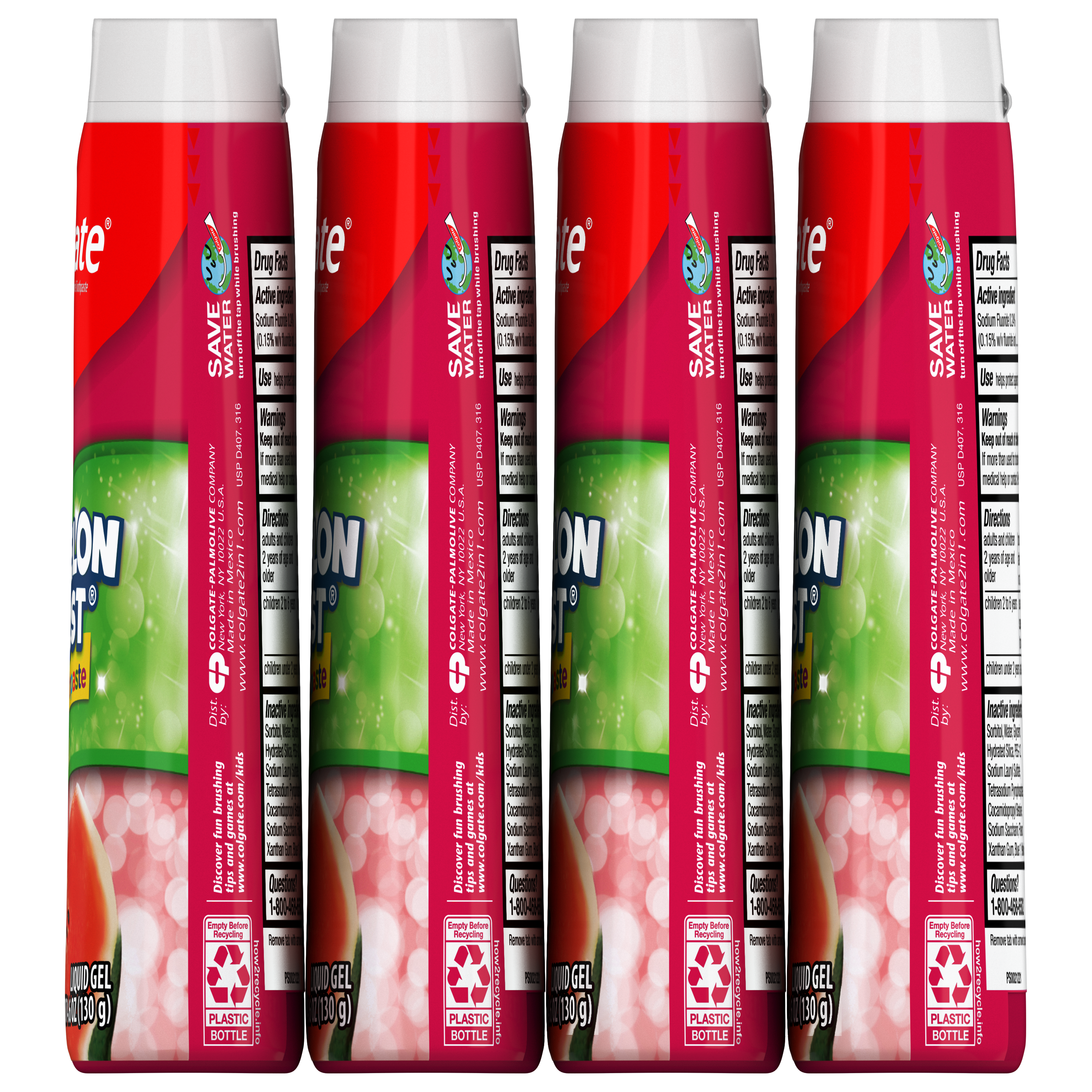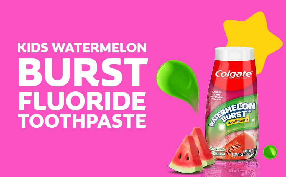 SKU US05582A Consumer Unit - GTIN 00035000466839 Case - GTIN 10035000466836 Product Category Oral Care Product Sub Category Toothpaste Product Equity (Brand) Colgate Product Sub Brand Colgate Kids TP Product Title Colgate 2-in-1 Kids Toothpaste & Anticavity Mouthwash, Watermelon Burst, 4.6 ounces (4 Pack) Product Description Colgate 2-in-1 Kids Toothpaste & Anticavity Mouthwash combines toothpaste and mouthwash into one gel formula. This 2-in-1 toothpaste and mouthwash formula provides clinically proven cavity and enamel protection like a toothpaste, but also freshens with a Watermelon Burst flavor just like a mouthwash. This bright and colorful package combined with a fun watermelon flavor will encourage your kids to brush for a lifetime of bright smiles.