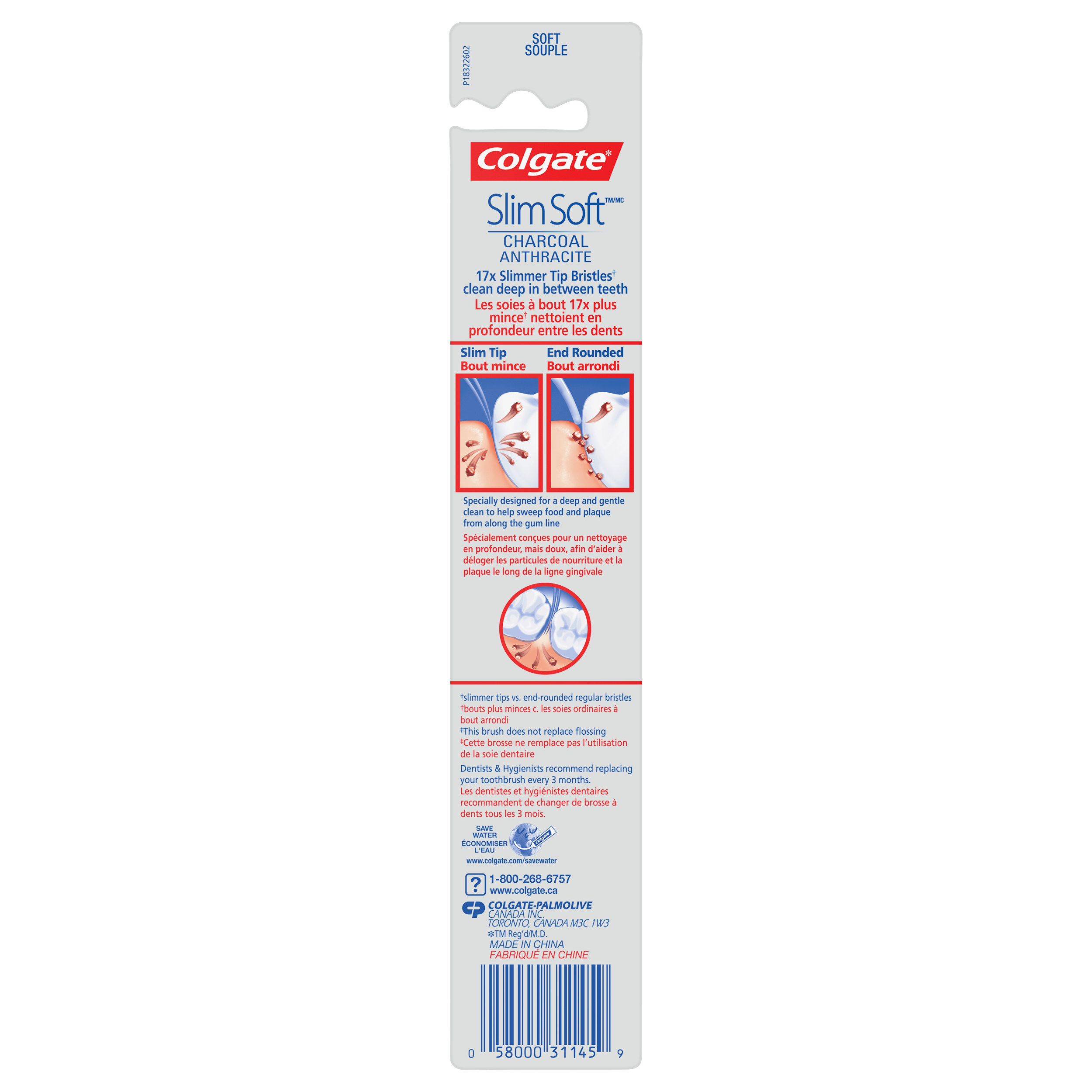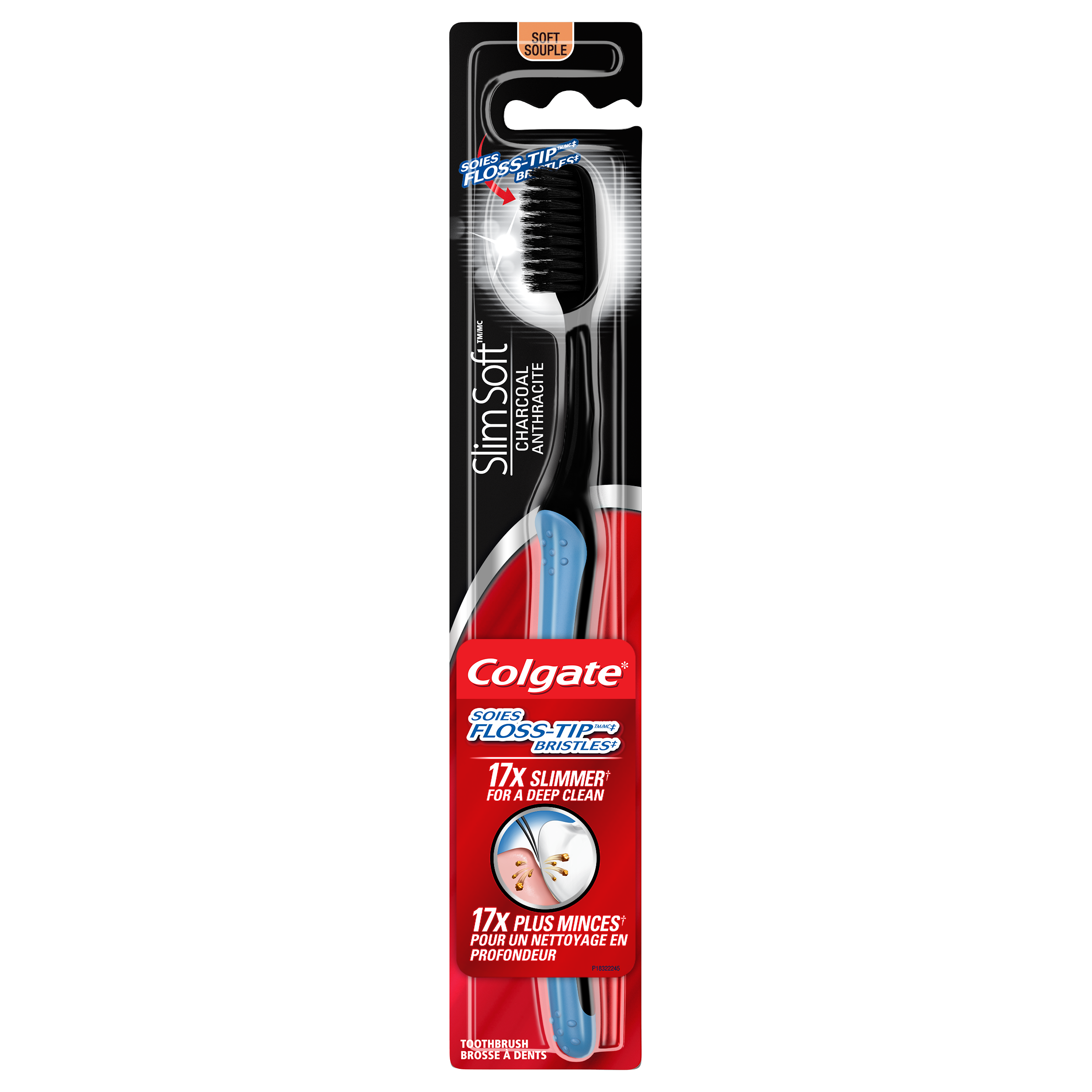 SKU US05595A Consumer Unit - GTIN 00035000466853 Case - GTIN 10035000466850 Product Category Oral Care Product Sub Category Manual TB Product Equity (Brand) Colgate Product Sub Brand Colgate Slim Soft Man TB Product Title Colgate Slim Soft Charcoal Toothbrush 17x Slimmer Tip Soft Bristles - Pack of 4 Product Description Colgate Slimsoft Charcoal Manual Toothbrush with Charcoal Bristles, Soft, 2 pack The Colgate SlimSoft Charcoal Toothbrush creates a unique brushing experience. Although this toothbrush does not replace flossing, its floss tip, dual core antibacterial bristles clean deep in between teeth, while helping sweep food and plaque from around the gum line. Try the Slimsoft toothbrush with stylish black charcoal infused bristles. The SlimSoft Toothbrush Support a healthy mouth with the Colgate SlimSoft toothbrush. Distinctly designed, the 17x slimmer tip bristles* are designed for a deep and gentle clean and go beyond an ordinary flat trim toothbrush. The antibacterial, floss tip bristles help prevent bacteria growth on bristles*. A study has shown a 300% better gum health improvement† from this soft toothbrush, versus using an ordinary flat trim toothbrush. This adult manual toothbrush is specially designed for a deep clean while being tough on plaque and gentle on gums. A Healthy Smile With Colgate At Colgate, we make products that promote healthy smiles. Not only because having a healthy smile is important to your overall health, but because when you have a healthy smile, you actually smile more – and that’s a powerful thing. Smiles are the simplest form of optimism, something we need now more than ever. That’s why we’re championing optimism – we are committed to creating a healthier planet and working every day to create healthy smiles for all. Everyone has the right to a bright, problem-free smile. That’s why we’re committed to raising oral healthcare standards everywhere. Whether it’s building healthy new habits as kids or learning something new from the experts, we’re here to give your oral health a boost. Bullet 1 The Colgate Slim Soft Charcoal manual toothbrush for adults offers a great, effective clean Bullet 2 Features unique charcoal-infused, slimmer tip* bristles. *Slimmer tips vs. end rounded bristles Bullet 3 The 17x slimmer tip bristles* are specially designed for a deep and gentle clean and go beyond an ordinary flat trim toothbrush. Bullet 4 Helps remove plaque while gently cleaning around the gum line. Bullet 5 Antibacterial bristles are designed to inhibit bacterial growth** **The bristles do not kill bacteria in the mouth or protect you against disease. Bullet 6 A study has shown a 300% better gum health improvement† (vs. using an ordinary flat trim toothbrush). †vs. ordinary flat trim toothbrush (shown on back of pack)