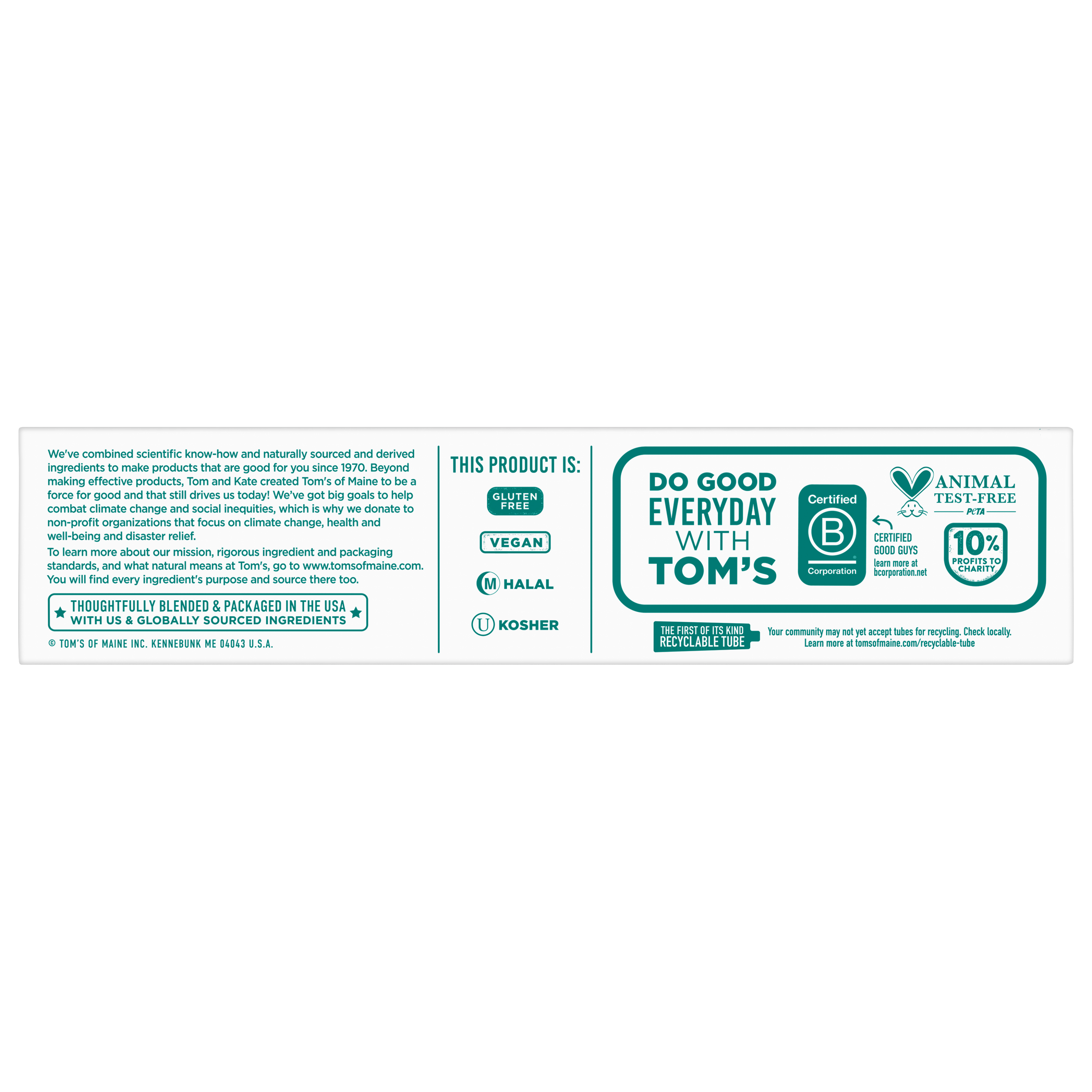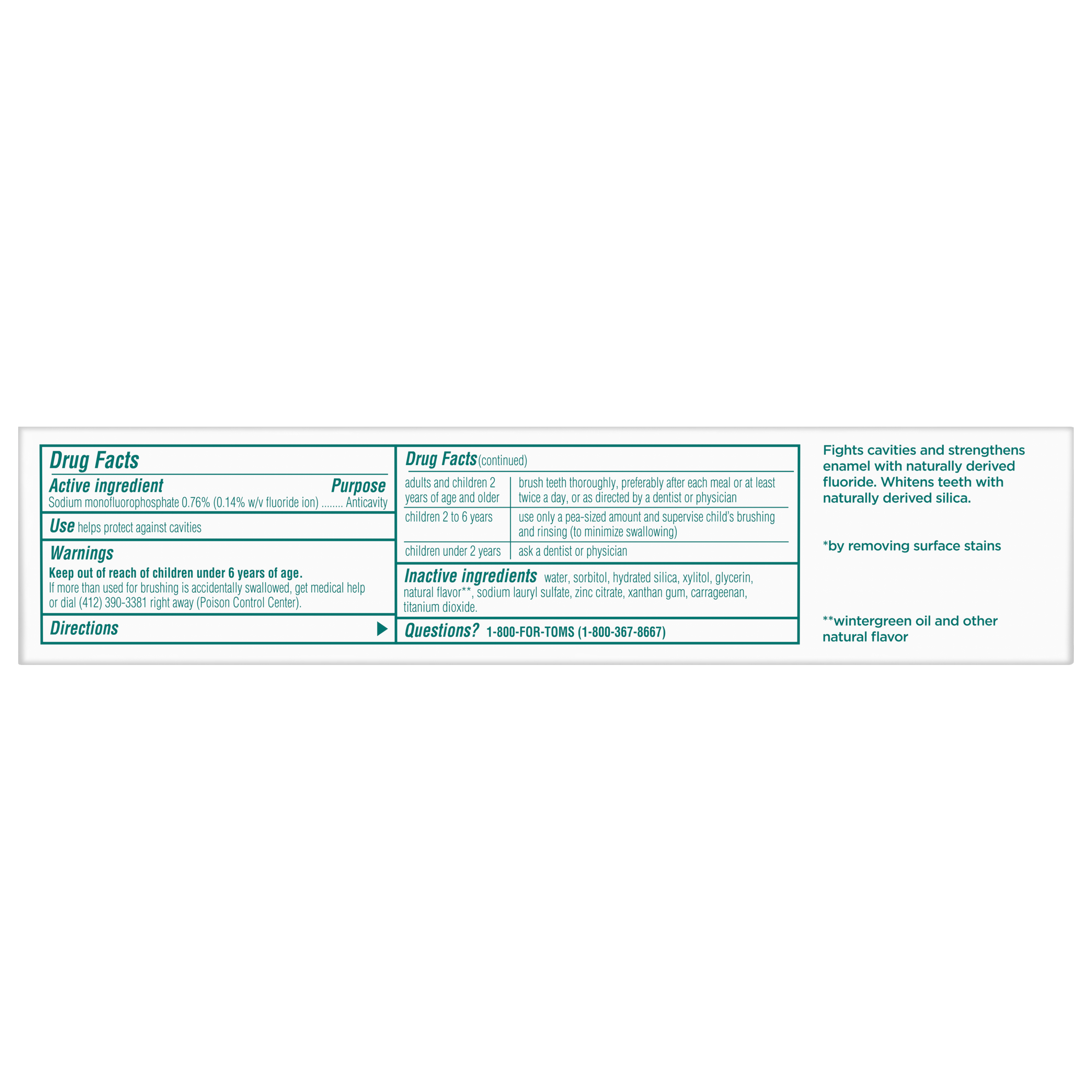 SKU US05803A Consumer Unit - GTIN 00077326470206 Case - GTIN 10077326470203 Product Category Oral Care Product Sub Category Toothpaste Product Equity (Brand) Tom's of Maine Product Sub Brand Tom's Whole Care TP Product Title Tom’s of Maine Whole Care Natural Toothpaste with Fluoride, Wintermint Product Description Promote a clean, bright, healthy smile with the Tom’s of Maine Whole Care Natural Toothpaste with Fluoride. The fluoride toothpaste prevents cavities, strengthens enamel, and whitens teeth by removing surface stains. Plus, this mint toothpaste leaves your mouth feeling clean and fresh with its Wintermint flavor. Tom’s of Maine Whole Care Anticavity Toothpaste doubles as a whitening toothpaste by helping to remove surface stains. This cavity protection toothpaste also contains naturally derived fluoride which helps prevent cavities and strengthen teeth enamel. Tom's of Maine uses naturally sourced and derived ingredients to create oral care products that work. This mint toothpaste contains naturally derived fluoride and is a vegan toothpaste with no artificial flavors or sweeteners and has not been tested on animals. Now that’s something you can feel good about. Get ready to prevent cavities, strengthen enamel, and whiten teeth with Tom’s of Maine Whole Care Natural Toothpaste. eCommerce Copy- Long Description Promote a clean, bright, healthy smile with the Tom’s of Maine Whole Care Natural Toothpaste with Fluoride. The fluoride toothpaste prevents cavities, strengthens enamel, and whitens teeth by removing surface stains. Plus, this mint toothpaste leaves your mouth feeling clean and fresh with its Wintermint flavor. Tom’s of Maine Whole Care Anticavity Toothpaste doubles as a whitening toothpaste by helping to remove surface stains. This cavity protection toothpaste also contains naturally derived fluoride which helps prevent cavities and strengthen teeth enamel. Tom's of Maine uses naturally sourced and derived ingredients to create oral care products that work. This mint toothpaste contains naturally derived fluoride and is a vegan toothpaste with no artificial flavors or sweeteners and has not been tested on animals. Now that’s something you can feel good about. Get ready to prevent cavities, strengthen enamel, and whiten teeth with Tom’s of Maine Whole Care Natural Toothpaste. Bullet 1 Includes one (1) 4.0 oz tube of Tom’s of Maine Whole Care Natural Toothpaste with Fluoride, Anticavity Toothpaste Bullet 2 Tom’s of Maine Whole Care Enamel Toothpaste helps prevent cavities, strengthens enamel, and whitens teeth by removing surface stains Bullet 3 This cavity protection toothpaste is formulated with naturally derived fluoride which helps prevent cavities and strengthens teeth enamel Bullet 4 Wintermint toothpaste flavor leaves your mouth feeling clean and fresh every time you brush Bullet 5 The enamel strengthening toothpaste is made with fluoride to help fight cavities to promote a healthy mouth Bullet 6 This vegan toothpaste is free from artificial flavors and sweeteners and has not been tested on animals Bullet 7 Choose a natural toothpaste with fluoride that’s right for your oral care needs with this anticavity toothpaste from Tom’s of Maine Bullet 8 Get ready to smile bright with a fresh mouth with the Tom’s of Maine Whole Care Natural Toothpaste Active Ingredients Sodium monofluorophosphate 0.76% (0.14% w / v fluoride ion)