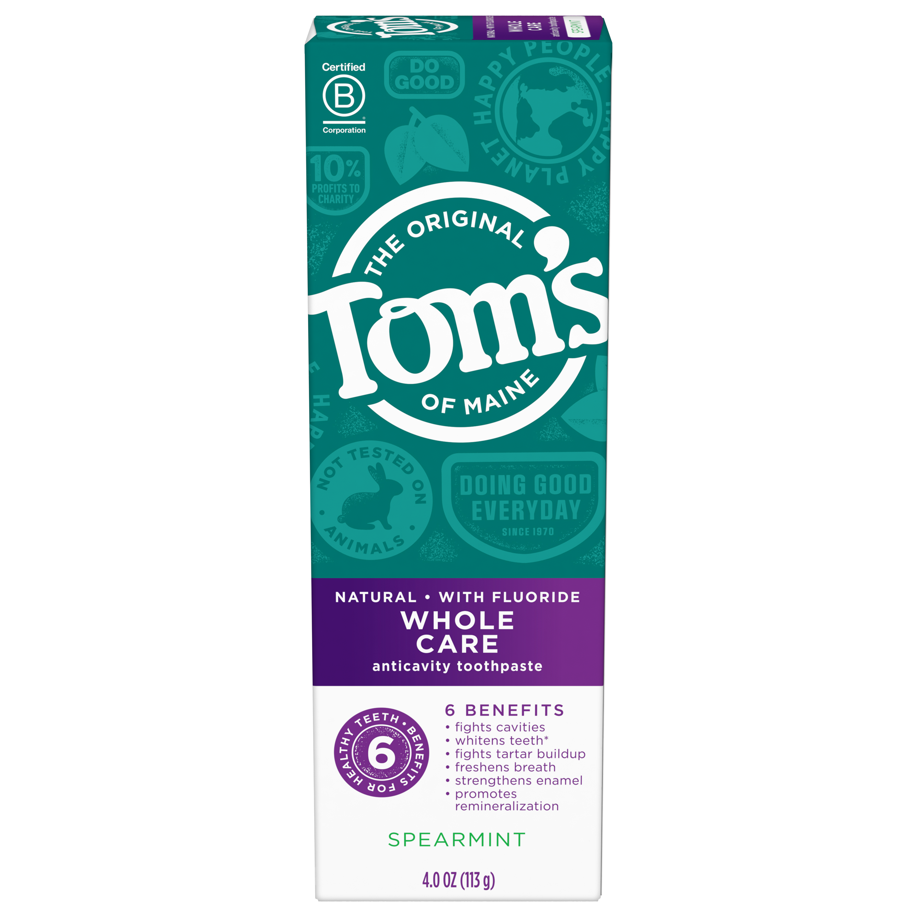 SKU US05804A Consumer Unit - GTIN 00077326470213 Case - GTIN 10077326470210 Product Category Oral Care Product Sub Category Toothpaste Product Equity (Brand) Tom's of Maine Product Sub Brand Tom's Whole Care TP Product Title Tom's of Maine Whole Care Gel, Spearmint, 4.oz Product Description We've been developing natural oral care solutions for over 4 years, and Whole Care® toothpaste gel offers many solutions in one. It fights cavities, whitens with naturally derived silicas by removing surface stains, freshens breath, and helps prevent plaque and tartar buildup with regular brushing. We produce this toothpaste with fluoride because we respect our customers' diverse needs and interests. Bullet 1 NATURAL PROTECTION: Tom's of Maine Whole Care toothpaste gently whitens teeth and fights cavities, while freshening breath and preventing tartar buildup. Bullet 2 FREE FROM ARTIFICIAL SWEETENERS: This whitening toothpaste is made from naturally derived ingredients. There are no artificial flavors, colors, or preservatives. Bullet 3 SMILE WITH TOMS: Toms toothpaste is a natural toothpaste that offers six benefits in one. Bullet 4 CERTIFIED B CORP: Tom's of Maine meets the highest standards of verified social and environmental performance, public transparency, and legal accountability to balance profit and purpose. Bullet 5 GIVING FOR GOODNESS: We believe in giving back. Tom's of Maine donates 10% of our profits to charities committed to children's health, education and the environment. Employees donate 5% of paid time to causes they are passionate about in their communities. Thank you for supporting Tom's of Maine. Active Ingredients Sodium monofluorophosphate 0.76% (0.14% w / v fluoride ion)