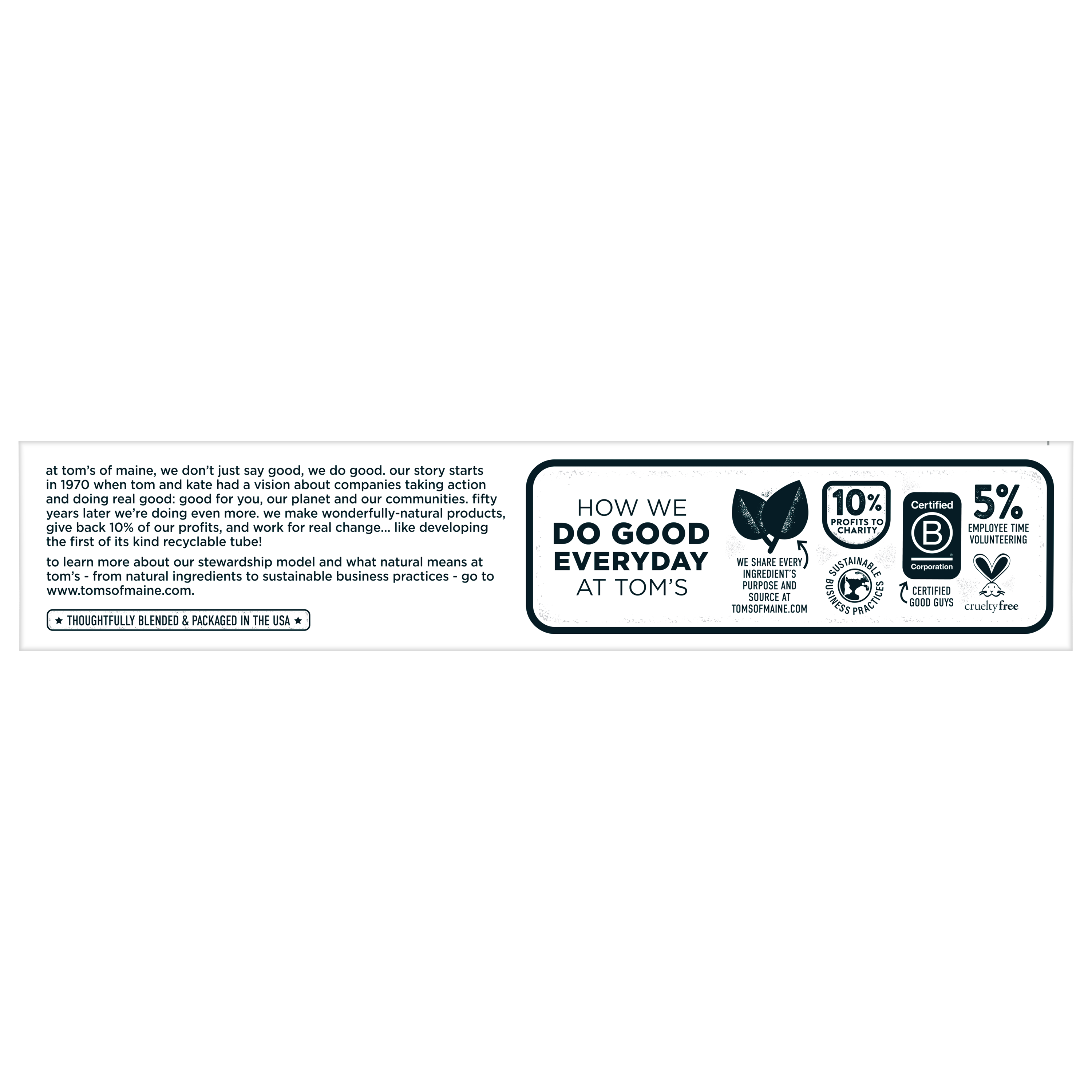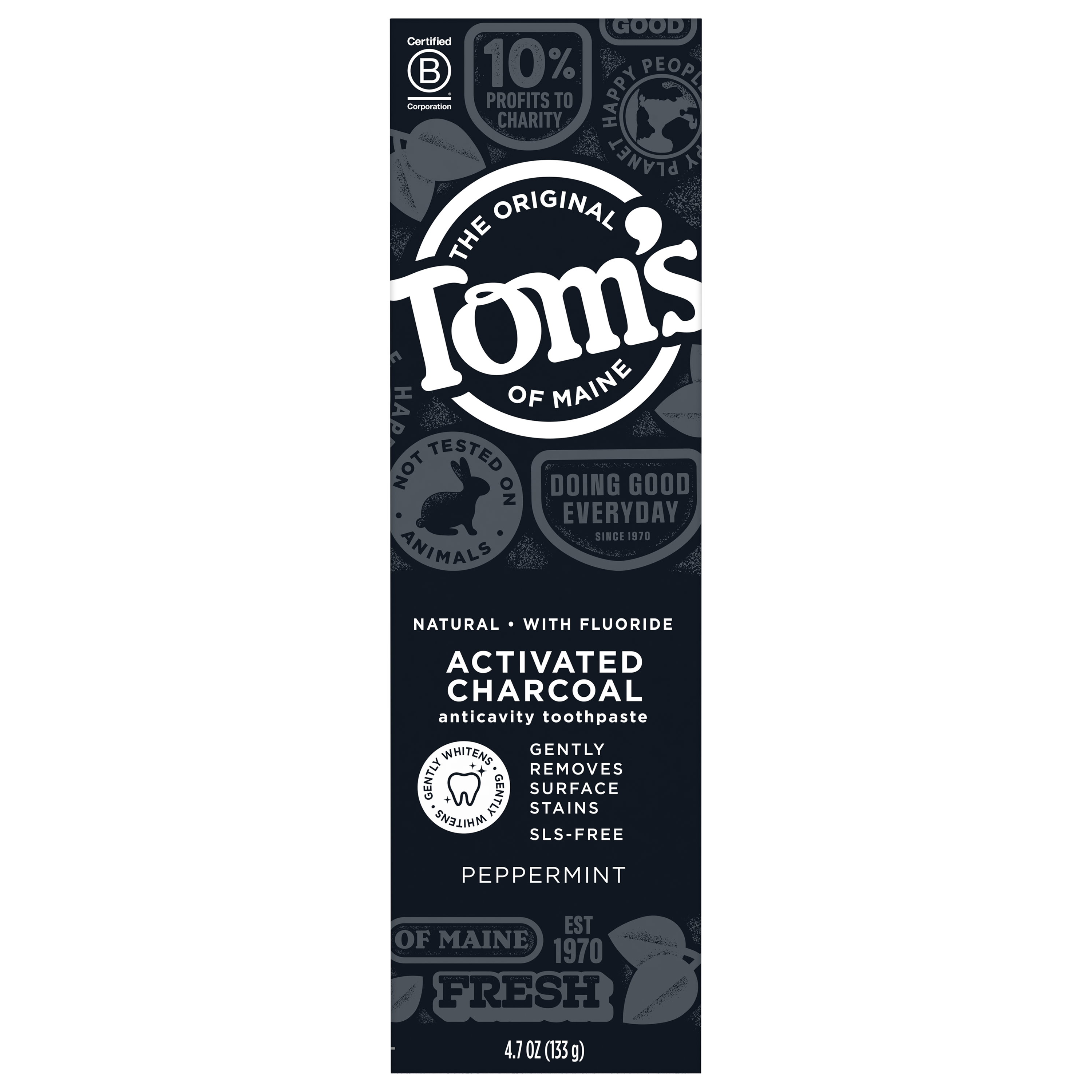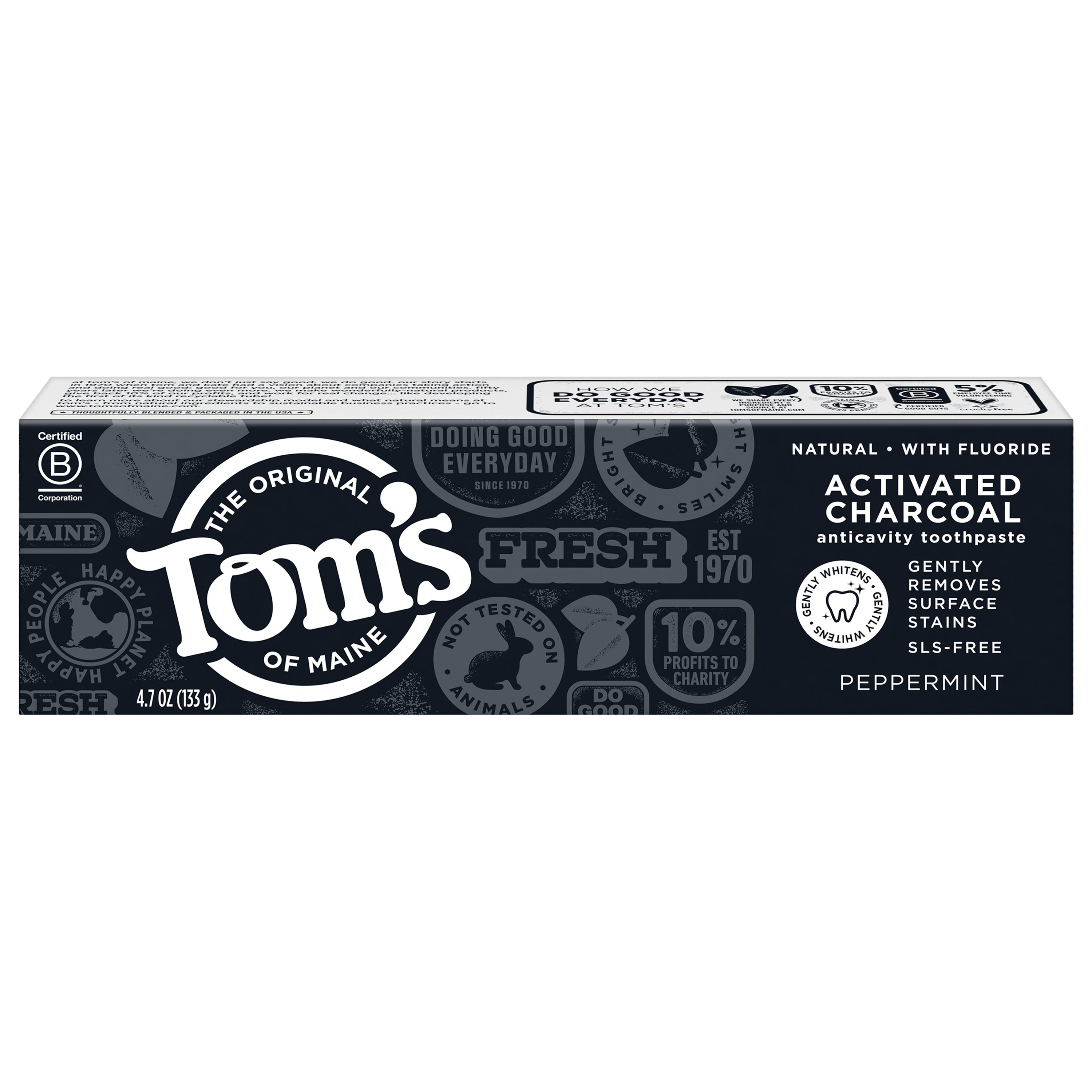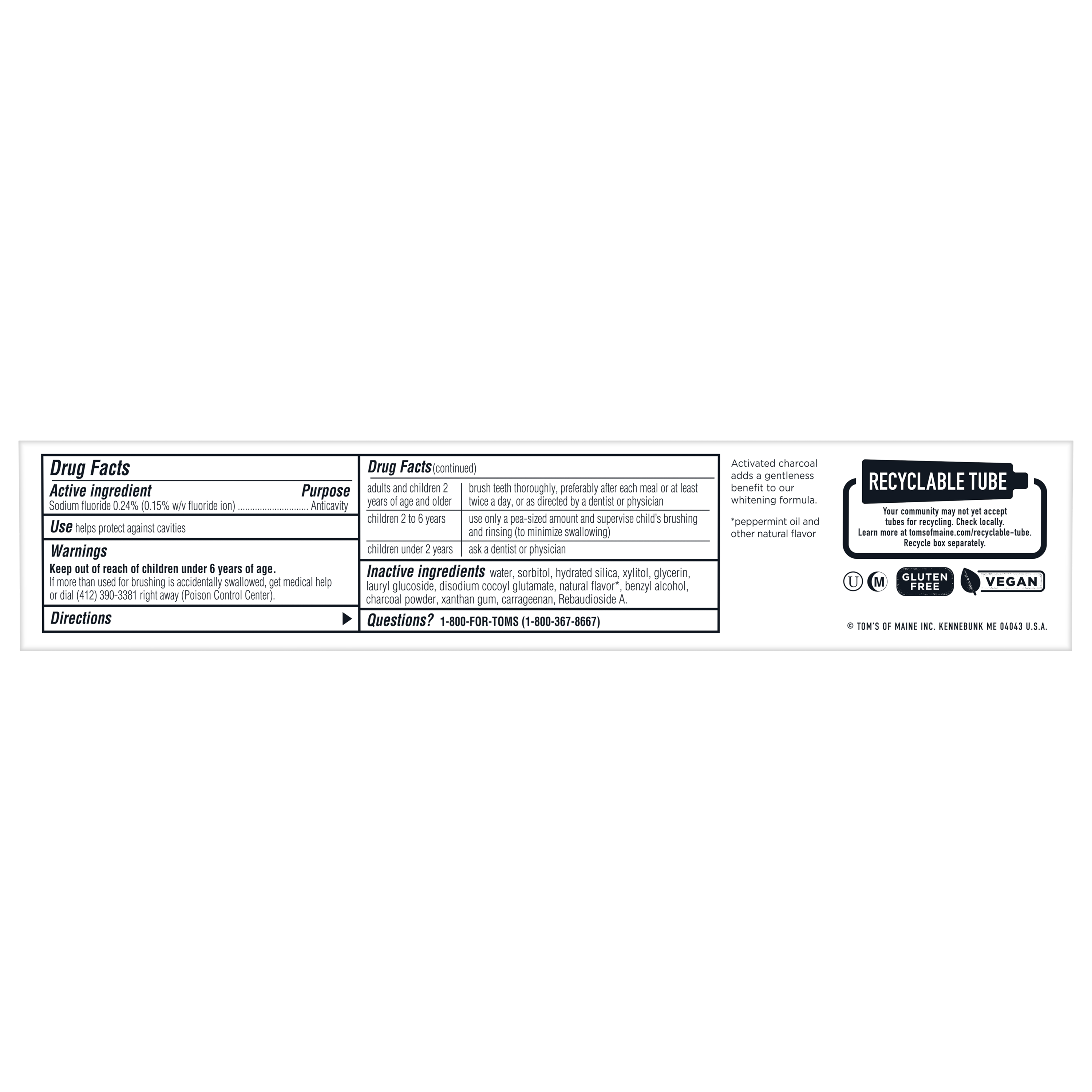 SKU US05992A Consumer Unit - GTIN 00077326472477 Case - GTIN 10077326472474 Product Category Oral Care Product Sub Category Toothpaste Product Equity (Brand) Tom's of Maine Product Sub Brand Tom's Activated Charcoal TP Product Title Tom's of Maine Activated Charcoal Whitening Natural Toothpaste With Fluoride, Peppermint, 4.7 oz. Product Description Tom's of Maine Activated Charcoal Natural Toothpaste gently whitens teeth. Yes, you heard right. This fluoride toothpaste contains activated charcoal and is specially crafted to be gentle on your enamel and safe for everyday use, so you can help remove surface stains with every brush. Enjoy the cavity-fighting protection of this SLS-free toothpaste with the cool sweetness of Peppermint. Now, that's fresh. And when you're done using your toothpaste, you can recycle the tube! Check to be sure that your tube has the blue recycling flag on it, squeeze out as much of the toothpaste from the tube as you can, replace the cap, and place the tube in your recycling bin. At Tom's of Maine, we want to empower families to live more naturally. With more than 5 years experience combining scientific know-how, naturally derived ingredients and a bit of ingenuity, we make products that are good for you and the planet. As a Certified B Corp, we hold ourselves to the highest social and environmental standards. Plus, we're committed to supporting local communities for meaningful change, donating 1% of our profits to charities supporting health, education and the environment. We call this "doing good, for real," and it impacts everything we do. eCommerce Copy- Long Description Tom's of Maine Activated Charcoal Natural Toothpaste gently whitens teeth. Yes, you heard right. This fluoride toothpaste contains activated charcoal and is specially crafted to be gentle on your enamel and safe for everyday use, so you can help remove surface stains with every brush. Enjoy the cavity-fighting protection of this SLS-free toothpaste with the cool sweetness of Peppermint. Now, that's fresh. And when you're done using your toothpaste, you can recycle the tube! Check to be sure that your tube has the blue recycling flag on it, squeeze out as much of the toothpaste from the tube as you can, replace the cap, and place the tube in your recycling bin. At Tom's of Maine, we want to empower families to live more naturally. With more than 50 years experience combining scientific know-how, naturally derived ingredients and a bit of ingenuity, we make products that are good for you and the planet. As a Certified B Corp, we hold ourselves to the highest social and environmental standards. Plus, we're committed to supporting local communities for meaningful change, donating 10% of our profits to charities supporting health, education and the environment. We call this "doing good, for real," and it impacts everything we do. Bullet 1 WHAT YOU'LL GET: One 4.7-ounce tube of Tom's of Maine Activated Charcoal Toothpaste in Peppermint Flavor Bullet 2 GENTLY BRIGHTEN SMILE: Whitening toothpaste with charcoal designed to gently remove surface stains Bullet 3 FIGHT CAVITIES: Fluoride toothpaste protects against cavities while cool peppermint freshens breath Bullet 4 RECYCLABLE TUBE: Look for the blue recycling flag, squeeze out as much toothpaste as you can, replace the cap, and recycle Bullet 5 TAKE CARE OF YOURSELF NATURALLY: Contains no artificial preservatives, colors or flavors and is not tested on animals Active Ingredients Sodium fluoride 0.24% (0.15% w / v fluoride ion) CVS RPC 379432