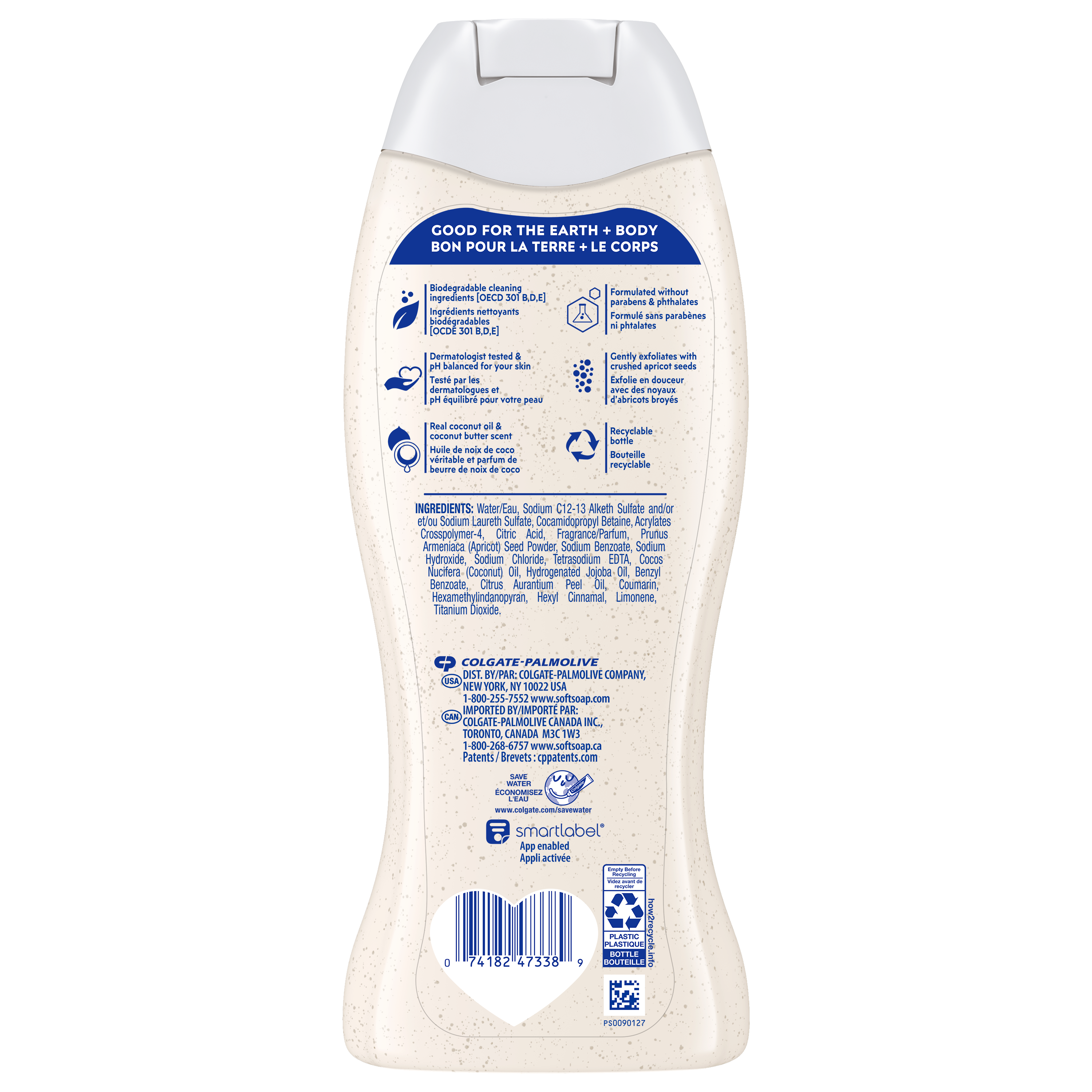 SKU US06085A Consumer Unit - GTIN 00074182473389 Case - GTIN 10074182473386 Product Category Personal Care Product Sub Category Body Wash Product Equity (Brand) Softsoap Product Sub Brand Softsoap Body Scrub BW Product Title Softsoap Body Wash Exfoliating Scrub, Coconut Butter Scent, 20 oz Bottle Product Description Indulge in the tropical aroma of coconut butter as you pamper your skin with Softsoap’s Exfoliating Scrub. Exfoliating body wash scrub with crushed apricot seeds to help remove dry skin, leaving you with smooth and soft-feeling skin that you'll love. Our exfoliating body wash is enriched with the goodness of real coconut oil and coconut butter scent. It is dermatologist tested and pH balanced for your skin. This coconut body wash formula is made with biodegradable cleaning ingredients and formulated without parabens and phthalates, so you can feel good about your body wash. Feel the joy of clean as you treat yourself to the magic of coconuts. eCommerce Copy- Long Description Indulge in the tropical aroma of coconut butter as you pamper your skin with Softsoap’s Exfoliating Scrub. Exfoliating body wash scrub with crushed apricot seeds to help remove dry skin, leaving you with smooth and soft-feeling skin that you'll love. Our exfoliating body wash is enriched with the goodness of real coconut oil and coconut butter scent. It is dermatologist tested and pH balanced for your skin. This coconut body wash formula is made with biodegradable cleaning ingredients and formulated without parabens and phthalates, so you can feel good about your body wash. Feel the joy of clean as you treat yourself to the magic of coconuts. Bullet 1 One 20 oz Bottle of Softsoap Exfoliating Scrub Coconut Butter Scent Bullet 2 Our exfoliating body wash is enriched with the goodness of real coconut oil and coconut butter scent Bullet 3 Exfoliating body wash scrub with crushed apricot seeds to help remove dry skin, leaving you with smooth and soft-feeling skin that you'll love Bullet 4 It is dermatologist tested and pH balanced for your skin Bullet 5 This body wash formula is made with biodegradable cleaning ingredients and formulated without parabens and phthalates Bullet 6 Biodegradable cleaning ingredients Bullet 7 Recyclable bottle Amazon RPC B09GMZR73M AMZ URL https://www.amazon.com/dp/B09GMZR73M Walmart RPC 146992907 Walmart URL (Computed) https://www.walmart.com/ip/a/146992907 Albertsons RPC 960546598 Albertsons URL https://www.albertsons.com/shop/product-details.960546598.html CVS RPC 379061 Family Dollar RPC 2007504