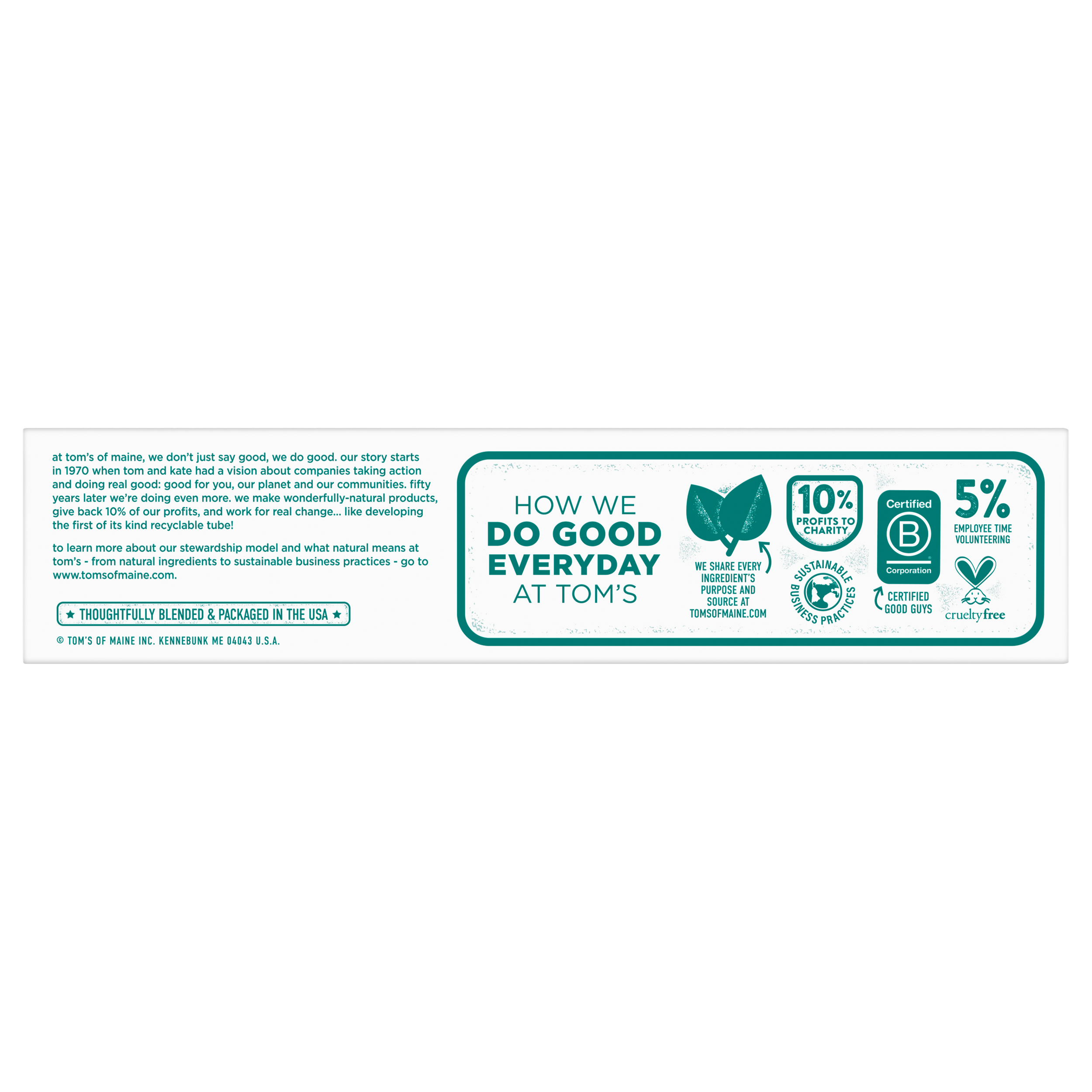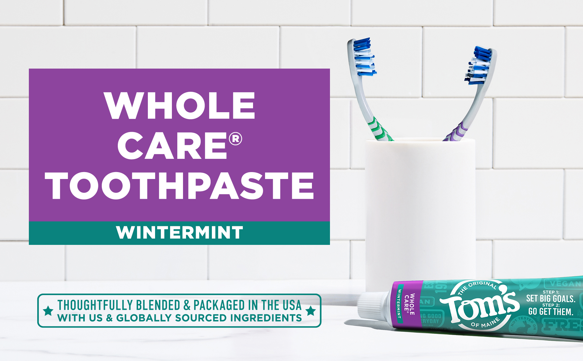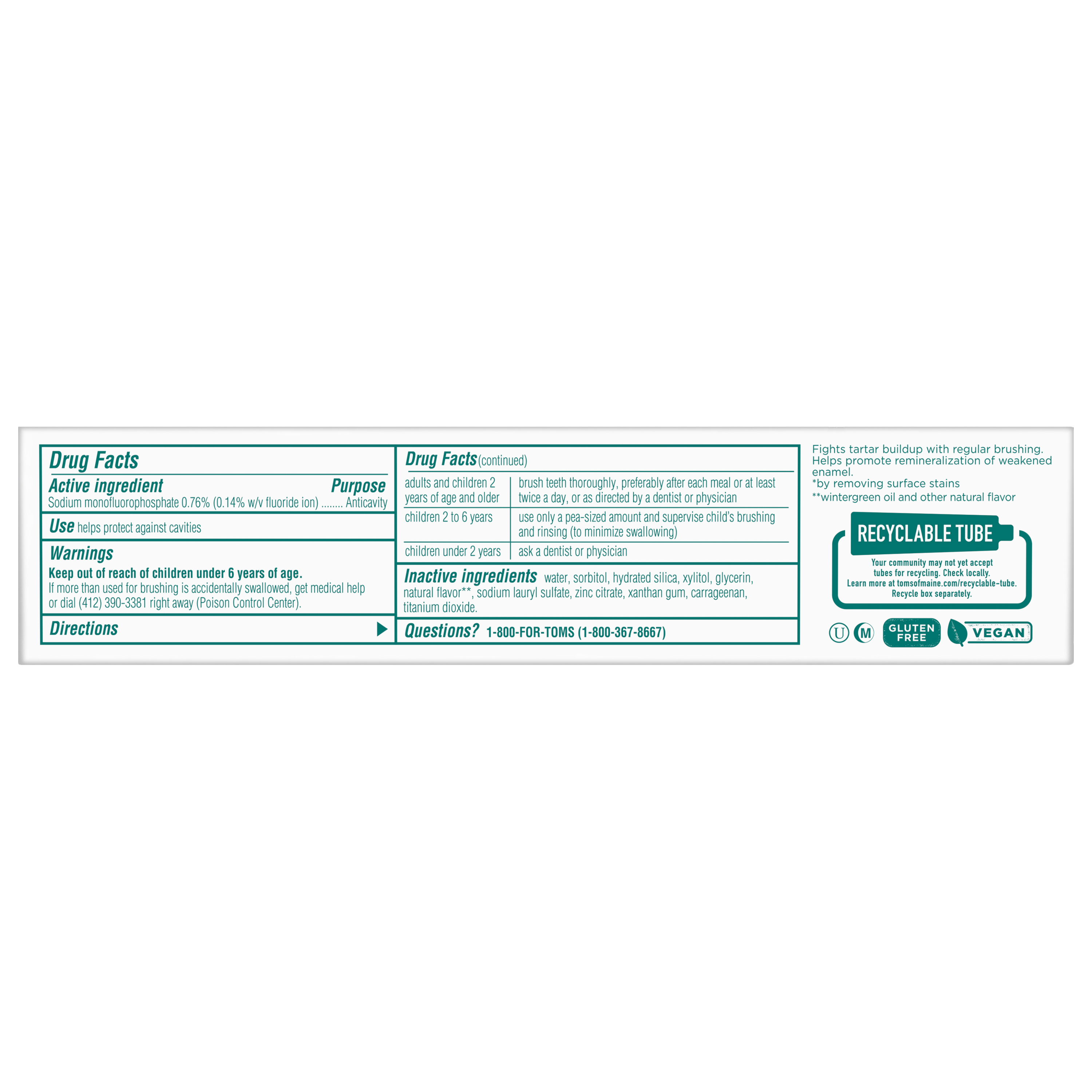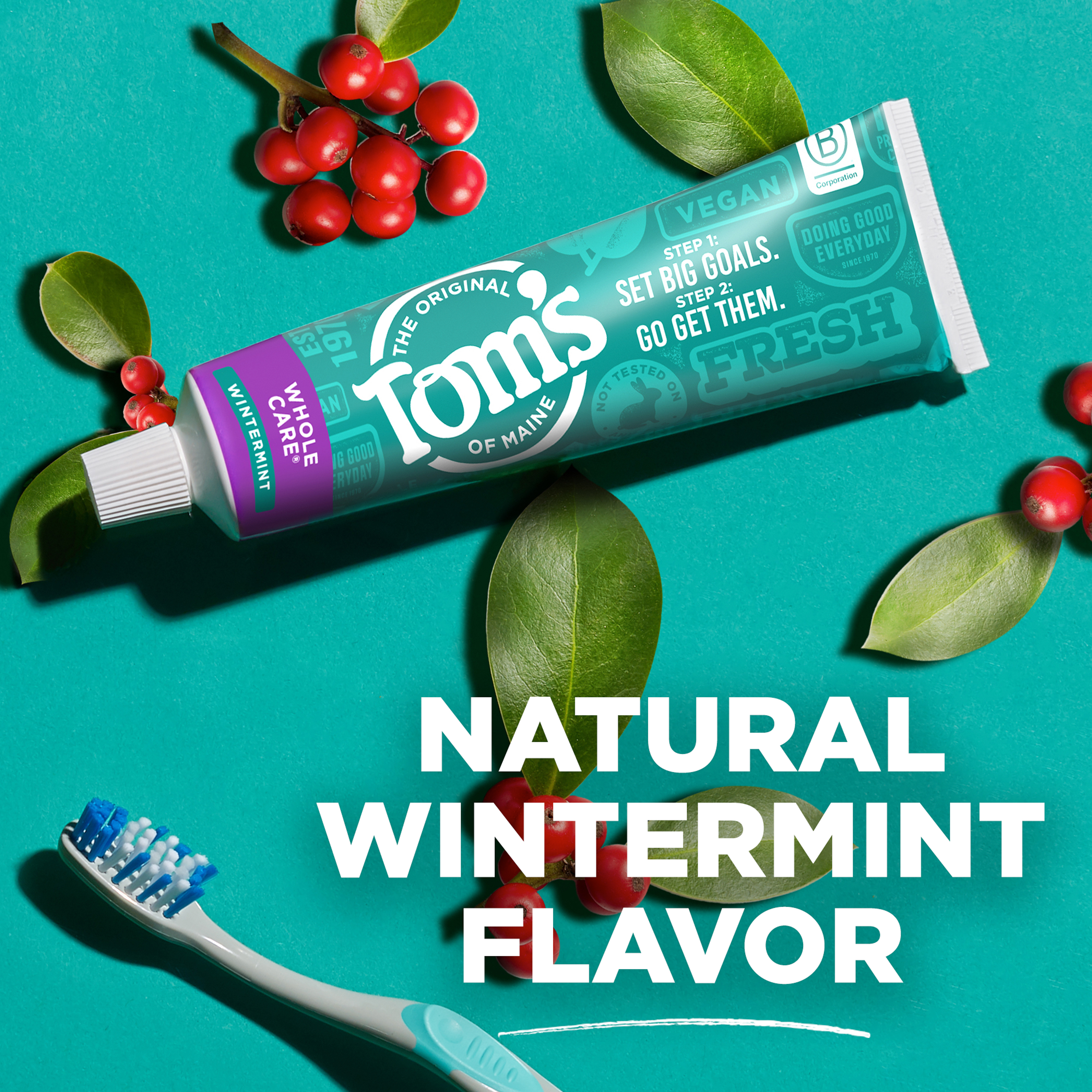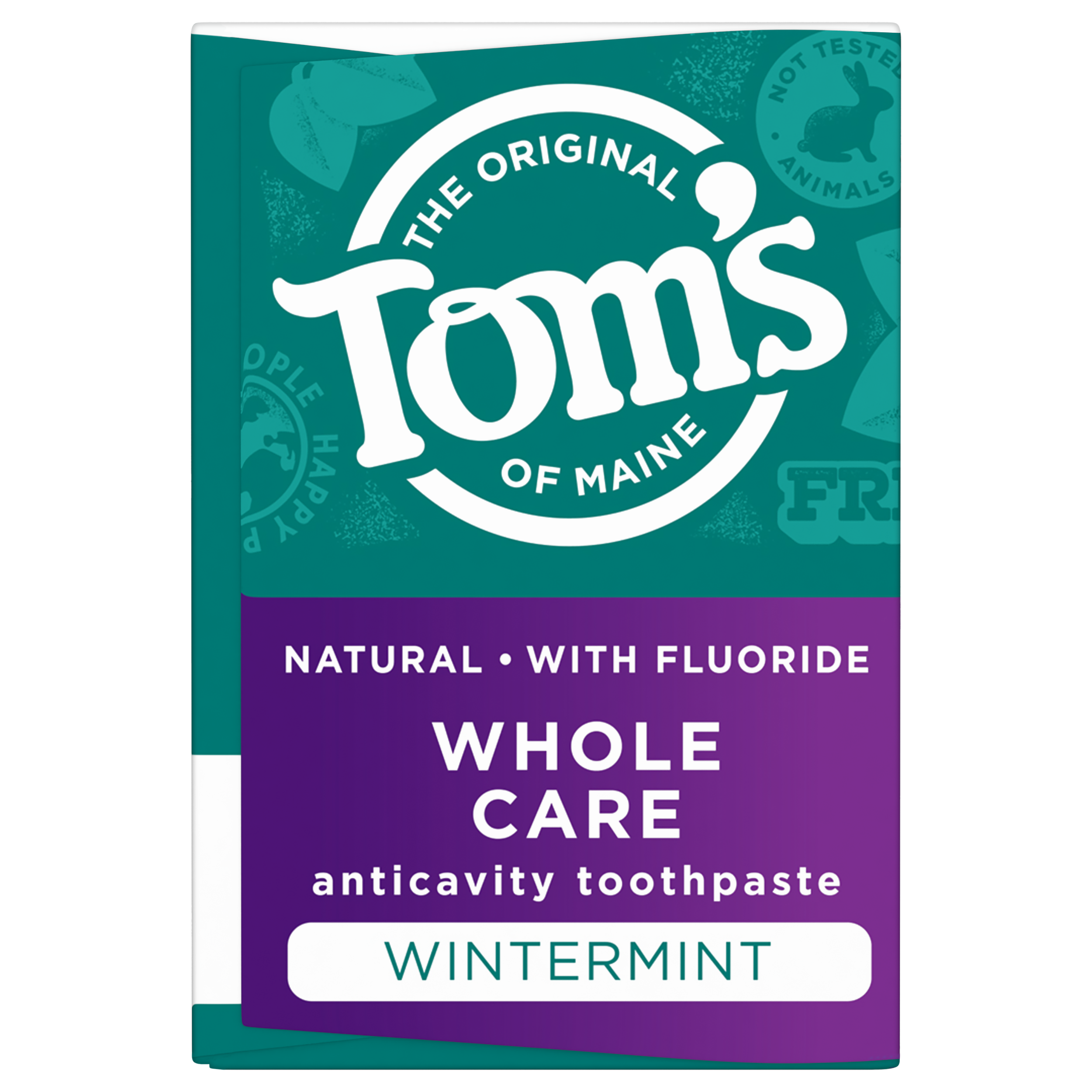 SKU US06166A Consumer Unit - GTIN 00035000967657 Case - GTIN 10035000967654 Product Category Oral Care Product Sub Category Toothpaste Product Equity (Brand) Tom's of Maine Product Sub Brand Tom's Whole Care TP Product Title Tom's of Maine Whole Care Natural Toothpaste with Fluoride, Wintermint, 4 oz. 3-Pack Product Description Care for your whole mouth with Tom's of Maine Whole Care Natural Toothpaste. With six benefits in one natural fluoride toothpaste, every brushing session helps fight cavities, promote remineralization, whiten teeth, prevent tartar buildup, freshen breath and strengthen enamel. Plus, this whitening toothpaste leaves your mouth feeling fresh with Wintermint flavor. Order Tom's of Maine Toothpaste, and try their other natural dental care products. Tom's of Maine products only use ingredients that meet its Stewardship standards for natural, sustainable and responsible, helping empower families to live more naturally. Tom's of Maine is a Certified B Corp and meets the highest standards of social and environmental performance, as well as public transparency. The company donates 1% of profits to charities committed to children's health, education and the environment. Thank you for supporting Tom's of Maine. eCommerce Copy- Long Description Care for your whole mouth with Tom's of Maine Whole Care Natural Toothpaste. With six benefits in one natural fluoride toothpaste, every brushing session helps fight cavities, promote remineralization, whiten teeth, prevent tartar buildup, freshen breath and strengthen enamel. Plus, this whitening toothpaste leaves your mouth feeling fresh with Wintermint flavor. Order Tom's of Maine Toothpaste, and try their other natural dental care products. Tom's of Maine products only use ingredients that meet its Stewardship standards for natural, sustainable and responsible, helping empower families to live more naturally. Tom's of Maine is a Certified B Corp and meets the highest standards of social and environmental performance, as well as public transparency. The company donates 10% of profits to charities committed to children's health, education and the environment. Thank you for supporting Tom's of Maine. Bullet 1 WHAT YOU'LL GET: Three 4-ounce tubes of Tom's of Maine Whole Care Toothpaste in Wintermint Flavor Bullet 2 CAVITY PROTECTION: Fights cavities while freshening breath and preventing tartar buildup Bullet 3 WHITENING TOOTHPASTE: Naturally derived silicas help remove surface stains for a brighter smile Bullet 4 STRENGTHENS TEETH: Tom's of Maine Fluoride Toothpaste promotes remineralization to strengthen enamel Bullet 5 NATURAL & RESPONSIBLE: Contains no artificial sweeteners, preservatives, colors or flavors and is not tested on animals Active Ingredients Sodium monofluorophosphate 0.76% (0.14% w / v fluoride ion) Amazon RPC B07PB1111J AMZ URL https://www.amazon.com/dp/B07PB1111J Target RPC 81838844 Target URL https://www.target.com/p/a/-/A-81838844