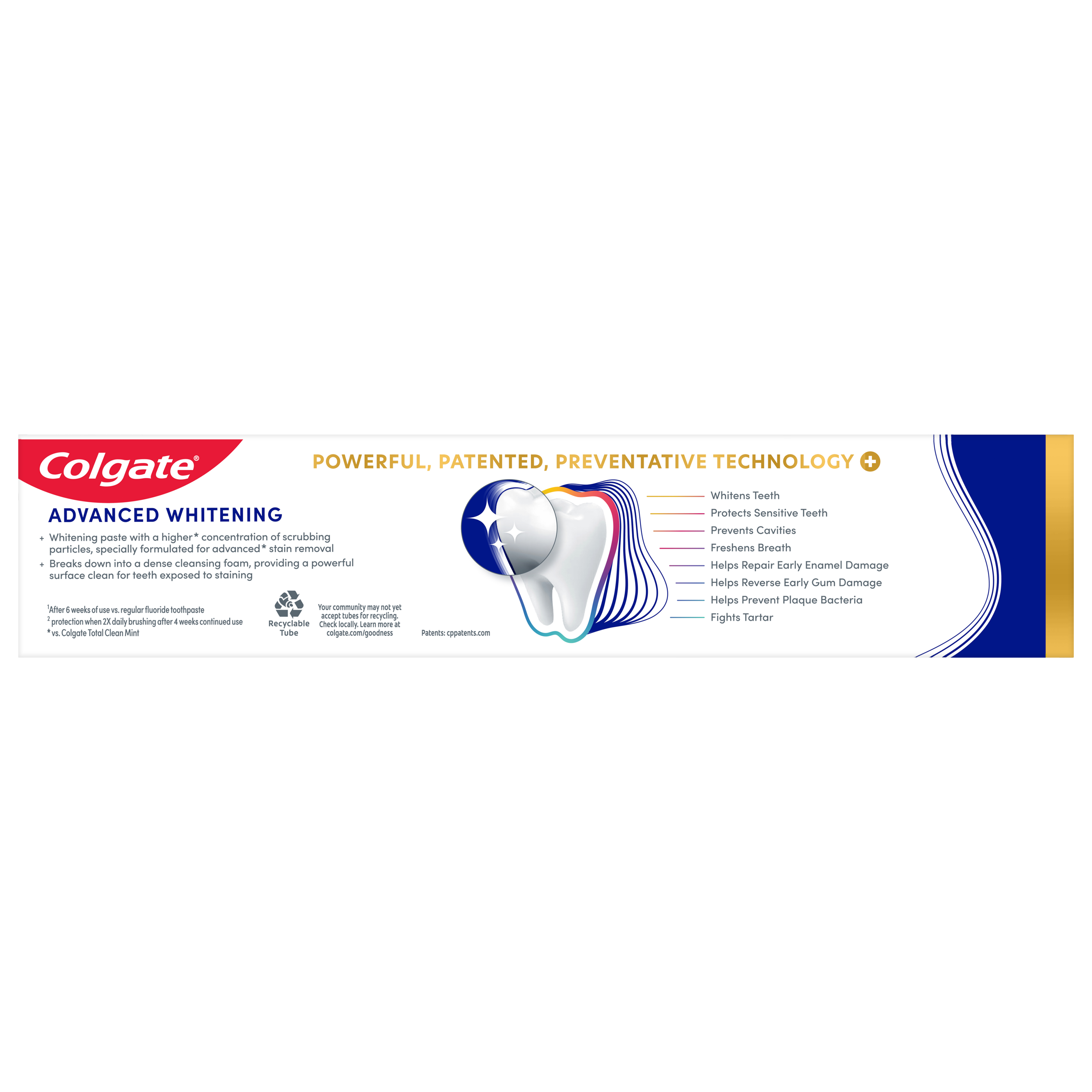 SKU US06325A Consumer Unit - GTIN 00035000463760 Case - GTIN 10035000970173 Product Category Oral Care Product Sub Category Toothpaste Product Equity (Brand) Colgate Product Sub Brand Colgate Total TP Product Title Colgate Total Advanced Whitening Paste 6.4 oz Product Description Enjoy a fresh and clean mouth with Colgate Total Advanced Fresh + Whitening Toothpaste. This innovative formula Helps reduce over 8% more bad breath germs plus whitens teeth (vs. regular, fluoride toothpaste). This gel toothpaste even contains an added flavor booster, helps keep breath ultra-fresh for up to 12 hours and fights germs for 12 hours. eCommerce Copy- Long Description Enjoy a fresh and clean mouth with Colgate Total Advanced Fresh + Whitening Toothpaste. This innovative formula Helps reduce over 80% more bad breath germs plus whitens teeth (vs. regular, fluoride toothpaste). This gel toothpaste even contains an added flavor booster, helps keep breath ultra-fresh for up to 12 hours and fights germs for 12 hours. Bullet 1 Freshens breath for 12 hours and whitens teeth Bullet 2 Helps reduce 80% more bad breath germs plus whitens teeth (Vs. regular, fluroide toothpaste) Bullet 3 Helps keep breath ultra-fresh for up to 12 hours Bullet 4 Contains an added flavor booster Bullet 5 Fights germs for 12 hours Bullet 6 Helps prevent plaque, tartar build-up and gingivitis Bullet 7 Freshens breath Bullet 8 Fights cavities Active Ingredients Active Ingredients: Sodium Fluoride (0.24% (0.15% w/v Fluoride Ion)), Triclosan (0.30%). Purpose: Anticavity, Antigingivitis.