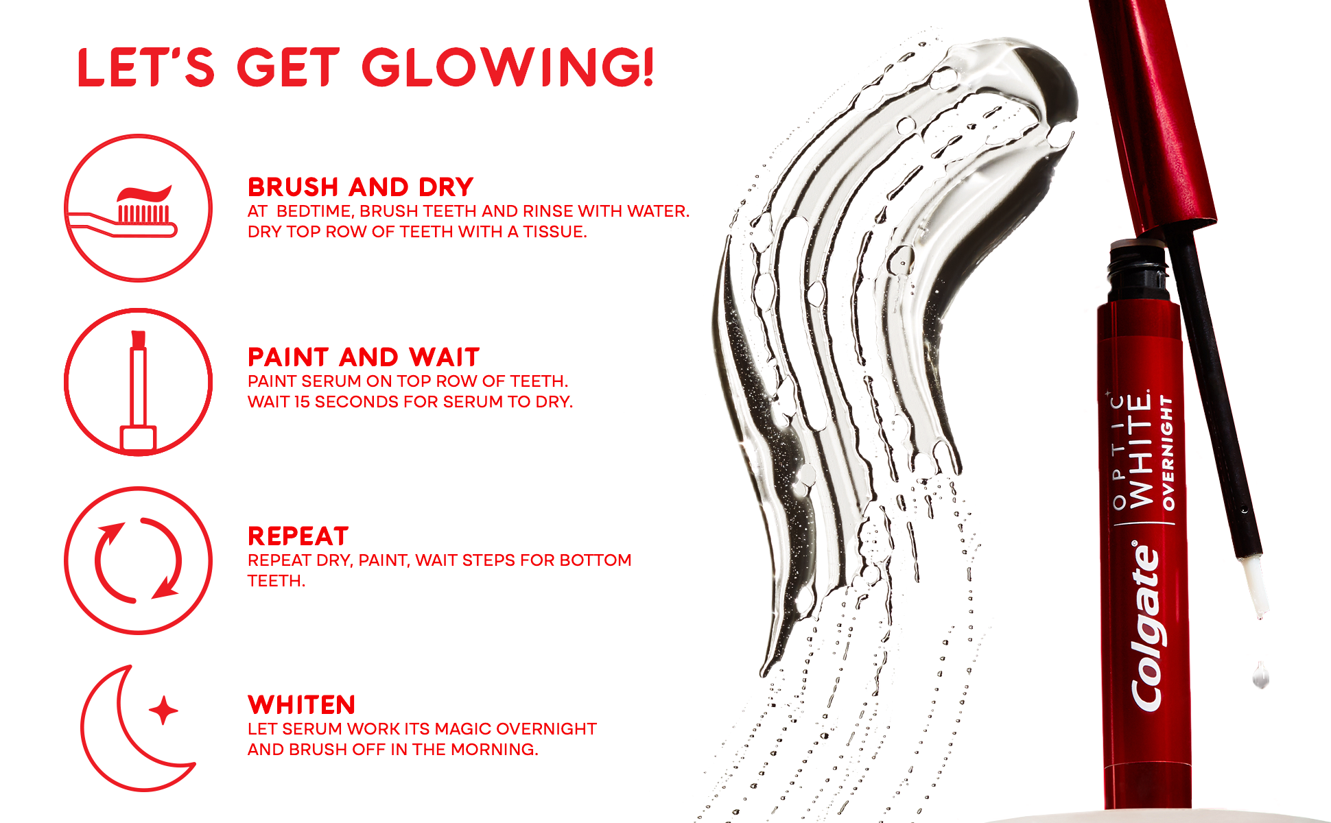 SKU US06355A Consumer Unit - GTIN 00035000970664 Case - GTIN 10035000970661 Product Category Oral Care Product Sub Category At Home Whitening Product Equity (Brand) Colgate Product Sub Brand Colgate OW Overnight Pen AHW Product Title Colgate Optic White Overnight Teeth Whitening Pen Product Description Experience visibly whiter teeth in just 1 week* with the Colgate Optic White Overnight Teeth Whitening Pen. This Colgate whitening pen contains 21 nightly treatments and has a hydrogen peroxide-based formula that is enamel-safe and designed for no tooth sensitivity**. To use the teeth gel whitening pen, follow your regular brushing routine. Next, dry your teeth, then paint the whitening gel onto clean, dry teeth. The serum dries within seconds and will stay on your teeth overnight while you sleep. To remove the dried whitening gel serum, simply brush your teeth like normal when you wake up the next morning and enjoy a whiter smile. Repeat treatment nightly for 1-3 weeks in a row for best whitening results. Get glowing and start living your life to the brightest with the Colgate Optic White Overnight Teeth Whitening Pen. *when used as directed **during and after the whitening process eCommerce Copy- Long Description Experience visibly whiter teeth in just 1 week* with the Colgate Optic White Overnight Teeth Whitening Pen. This Colgate whitening pen contains 21 nightly treatments and has a hydrogen peroxide-based formula that is enamel-safe and designed for no tooth sensitivity**. To use the teeth gel whitening pen, follow your regular brushing routine. Next, dry your teeth, then paint the whitening gel onto clean, dry teeth. The serum dries within seconds and will stay on your teeth overnight while you sleep. To remove the dried whitening gel serum, simply brush your teeth like normal when you wake up the next morning and enjoy a whiter smile. Repeat treatment nightly for 1-3 weeks in a row for best whitening results. Get glowing and start living your life to the brightest with the Colgate Optic White Overnight Teeth Whitening Pen.