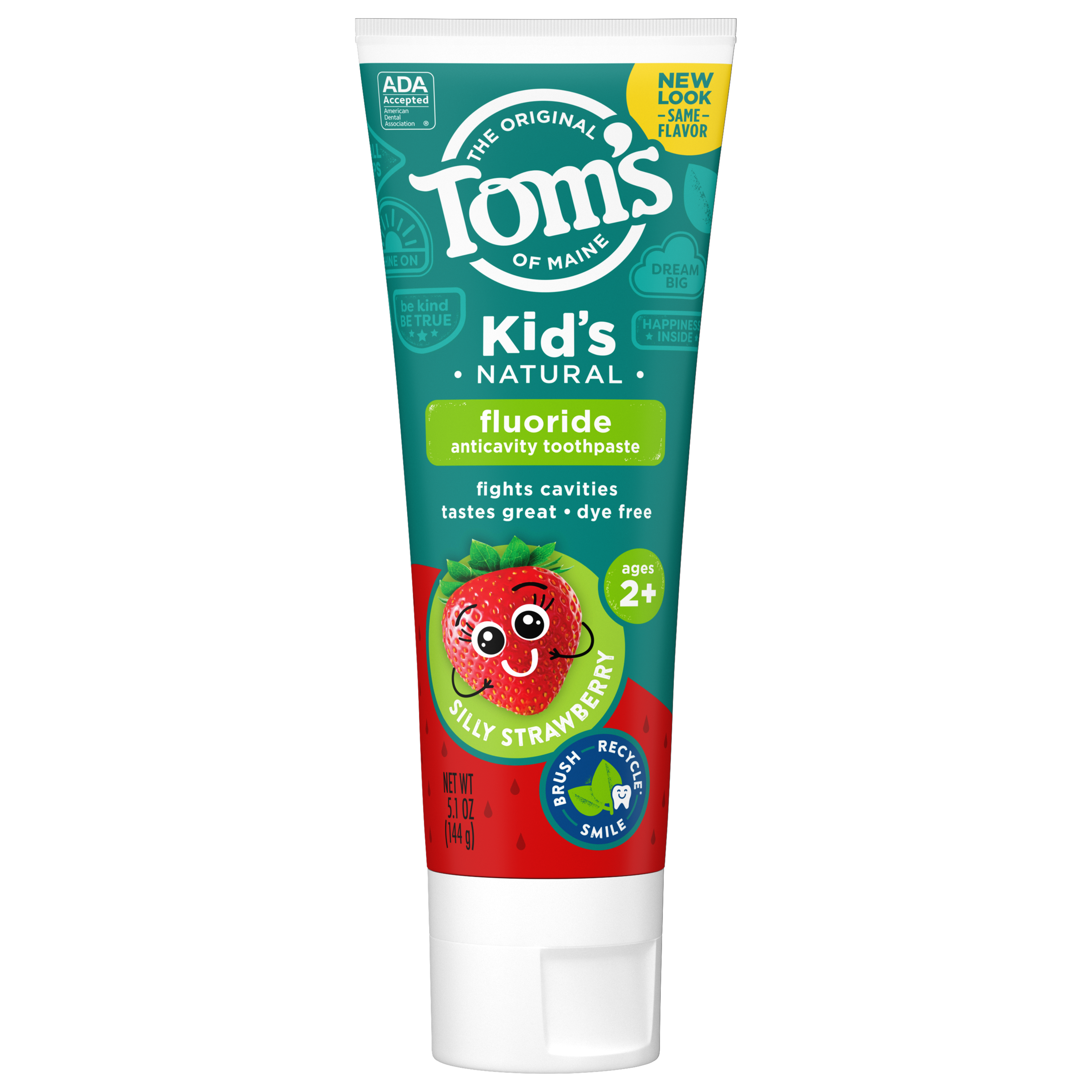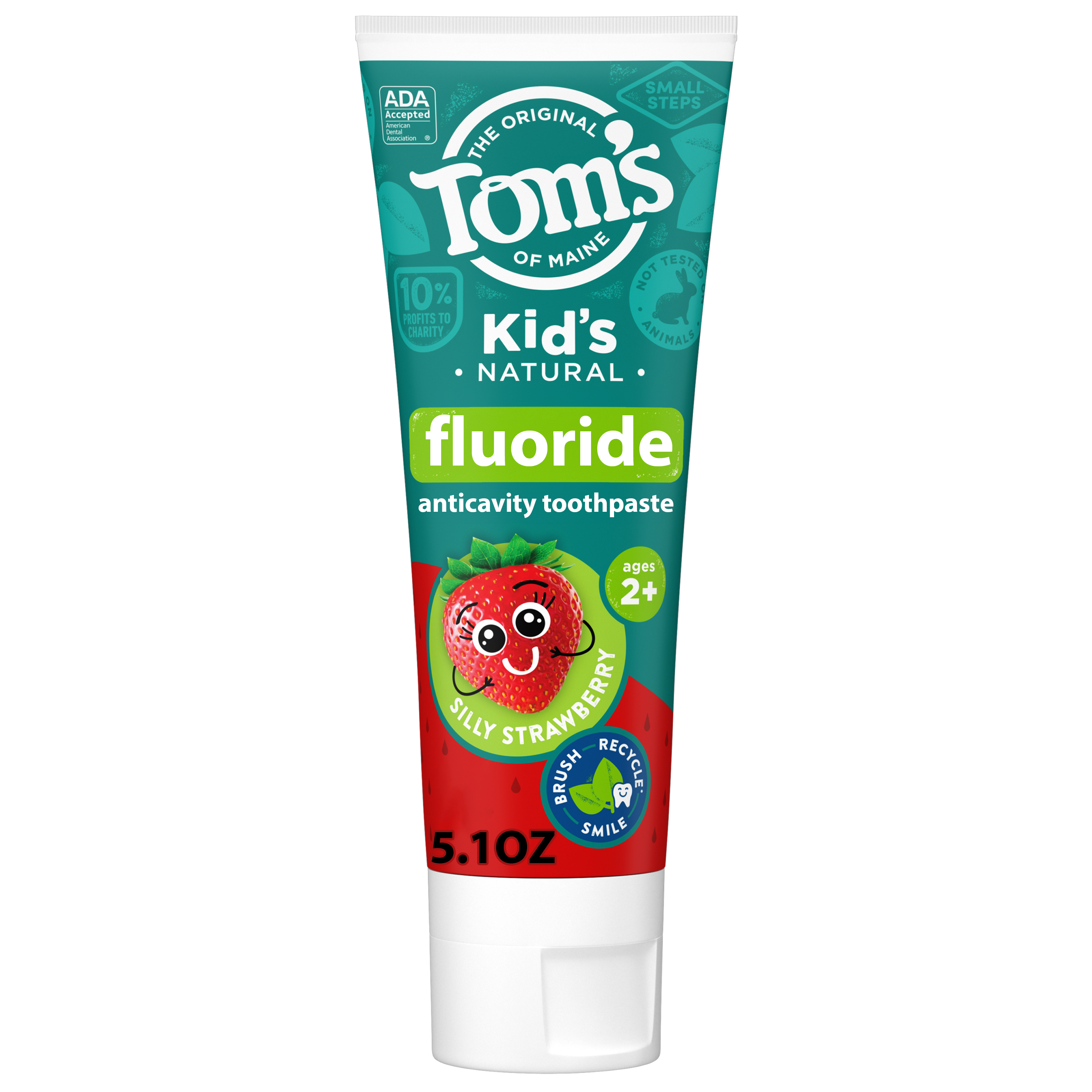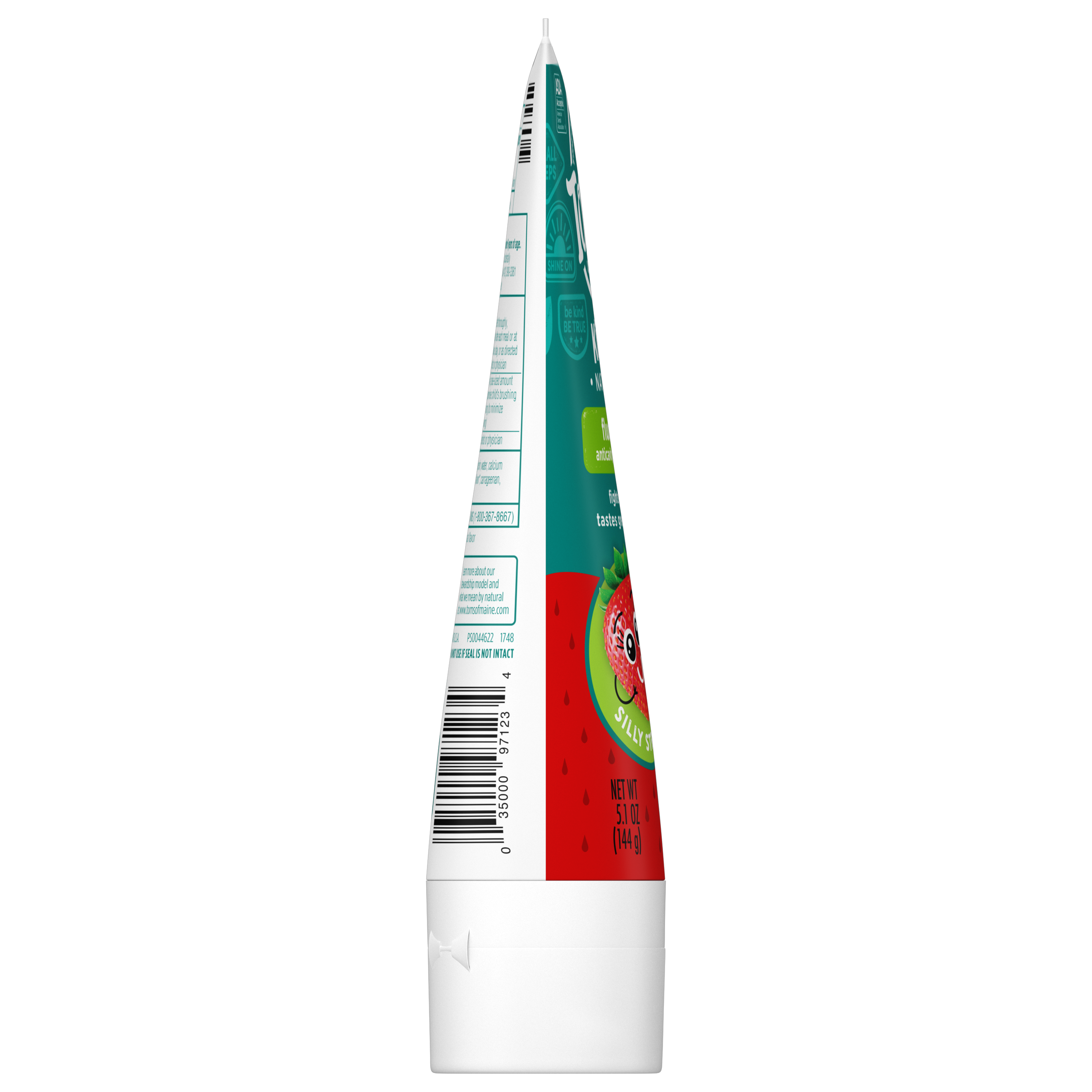 SKU US06379A Consumer Unit - GTIN 00035000971234 Case - GTIN 10035000971231 Product Category Oral Care Product Sub Category Toothpaste Product Equity (Brand) Tom's of Maine Product Sub Brand Tom's Kids TP Product Title Tom's of Maine Kids Fluoride Natural Toothpaste, Silly Strawberry, 5.1 oz. Product Description Goodbye artificial sparkles and bubble gum flavors. Hello natural cavity protection! Tom's of Maine Natural Kids Fluoride Toothpaste uses calcium and silica to gently clean your little one's teeth. Plus, the yummy Silly Strawberry flavor of this natural children's toothpaste makes brushing fun. With no artificial flavors, colors or preservatives, this fluoride toothpaste is silly enough for kids and effective enough for parents. And when you're done using your toothpaste, you can recycle the tube! Check to be sure that your tube has the blue recycling flag on it, squeeze out as much of the toothpaste from the tube as you can, replace the cap, and place the tube in your recycling bin. At Tom's of Maine, we want to empower families to live more naturally. With more than 5 years experience combining scientific know-how, naturally derived ingredients and a bit of ingenuity, we make products that are good for you and the planet. As a Certified B Corp, we hold ourselves to the highest social and environmental standards. Plus, we're committed to supporting local communities for meaningful change, donating 1% of our profits to charities supporting health, education and the environment. We call this "doing good, for real," and it impacts everything we do. eCommerce Copy- Long Description Silly Enough for Kids - Good Enough for Moms and Dads! Our Toothpaste for Children uses calcium and silica to gently clean, and the delicious real fruit flavor appeals to your child's taste - not artificial sparkles and bubble gum flavors. With no artificial flavors, colors or preservatives, this fluoride toothpaste is silly enough for kids and effective enough for parents. And when you're done using your toothpaste, you can recycle the tube! Check to be sure that your tube has the blue recycling flag on it, squeeze out as much of the toothpaste from the tube as you can, replace the cap, and place the tube in your recycling bin. At Tom's of Maine, we want to empower families to live more naturally. With more than 50 years experience combining scientific know-how, naturally derived ingredients and a bit of ingenuity, we make products that are good for you and the planet. As a Certified B Corp, we hold ourselves to the highest social and environmental standards. Plus, we're committed to supporting local communities for meaningful change, donating 10% of our profits to charities supporting health, education and the environment. We call this "doing good, for real," and it impacts everything we do. Bullet 1 WHAT YOU'LL GET: One 5.1-ounce tube of Tom's of Maine Kids Fluoride Toothpaste in Silly Strawberry Flavor Bullet 2 FIGHT CAVITIES: Fluoride toothpaste provides cavity protection while calcium and silica gently clean teeth Bullet 3 TASTE THEY LOVE: The fruity flavor of this children's toothpaste makes brushing a fun habit Bullet 4 RECYCLABLE TUBE: Look for the blue recycling flag, squeeze out as much toothpaste as you can, replace the cap, and recycle Bullet 5 TAKE CARE OF YOURSELF NATURALLY: Contains no artificial preservatives, colors or flavors and is not tested on animals Active Ingredients Sodium monofluorophophate 0.76% (0.14% w/v fluoride ion) Target RPC 76626522 Target URL https://www.target.com/p/a/-/A-76626522 CVS RPC 996842 Family Dollar RPC 999099