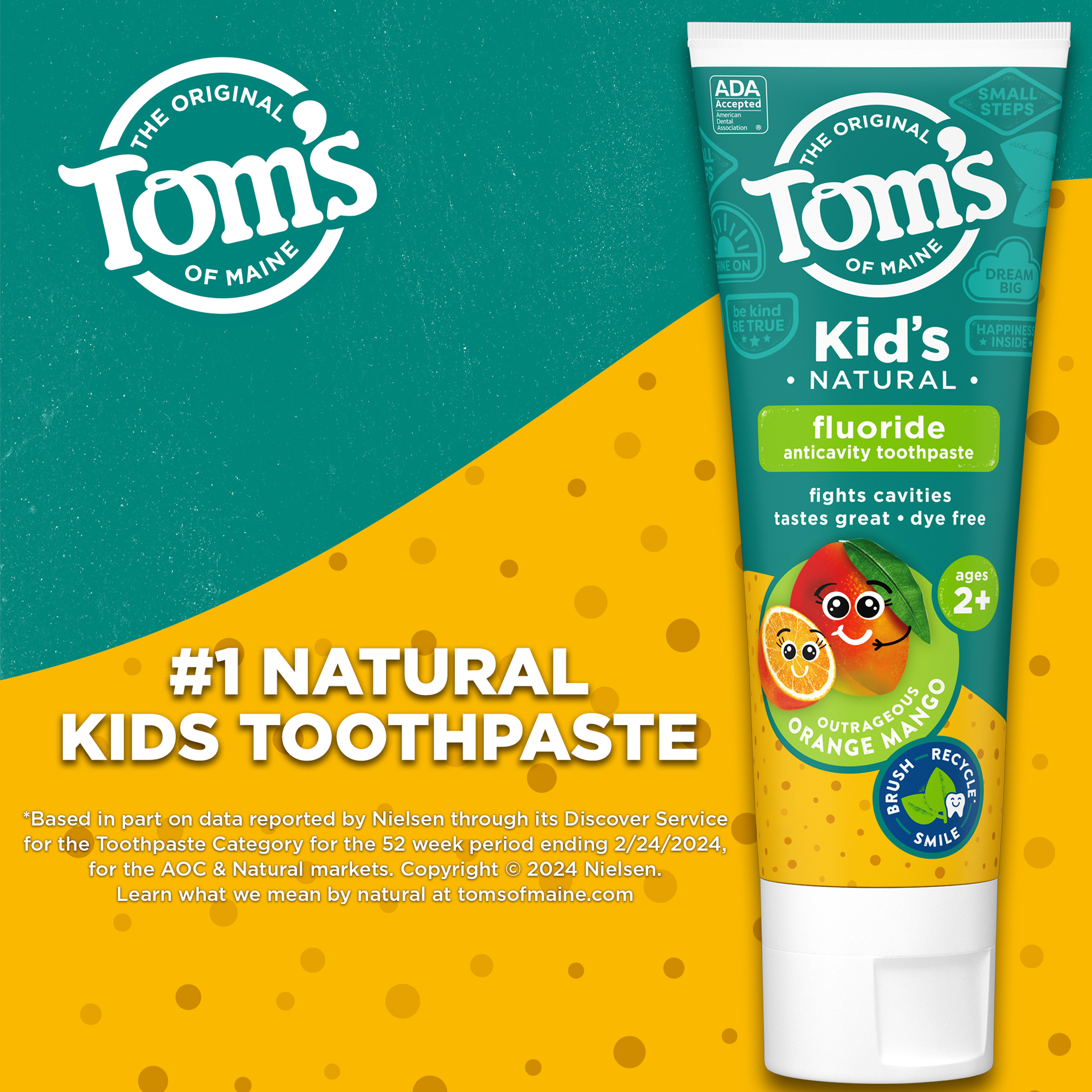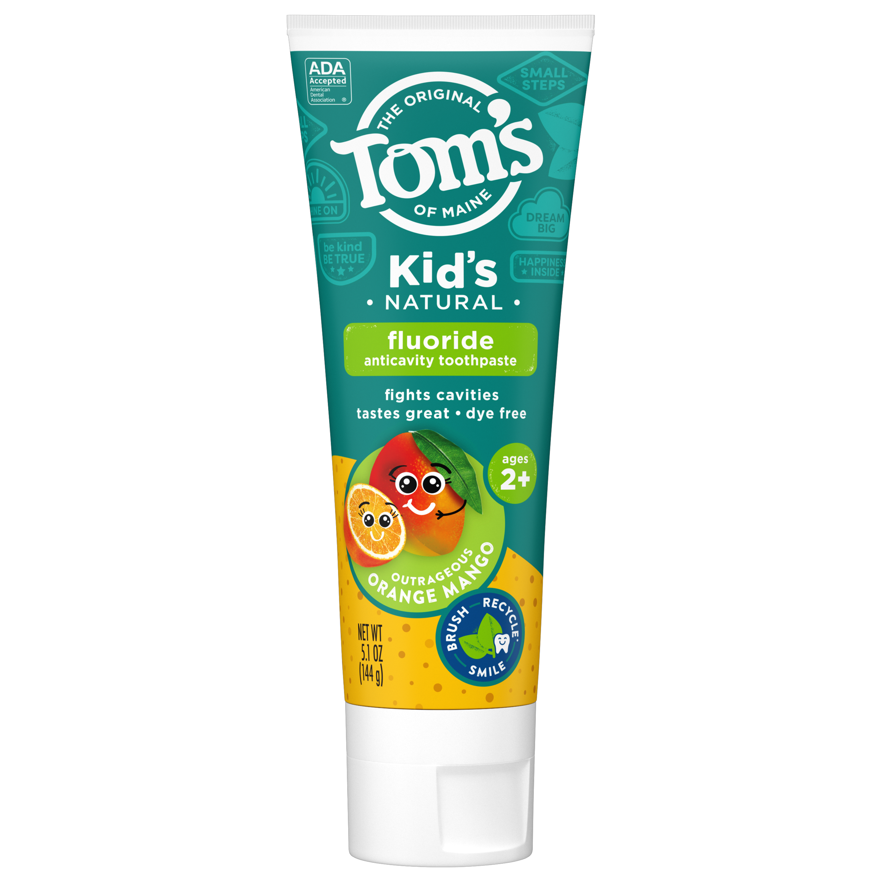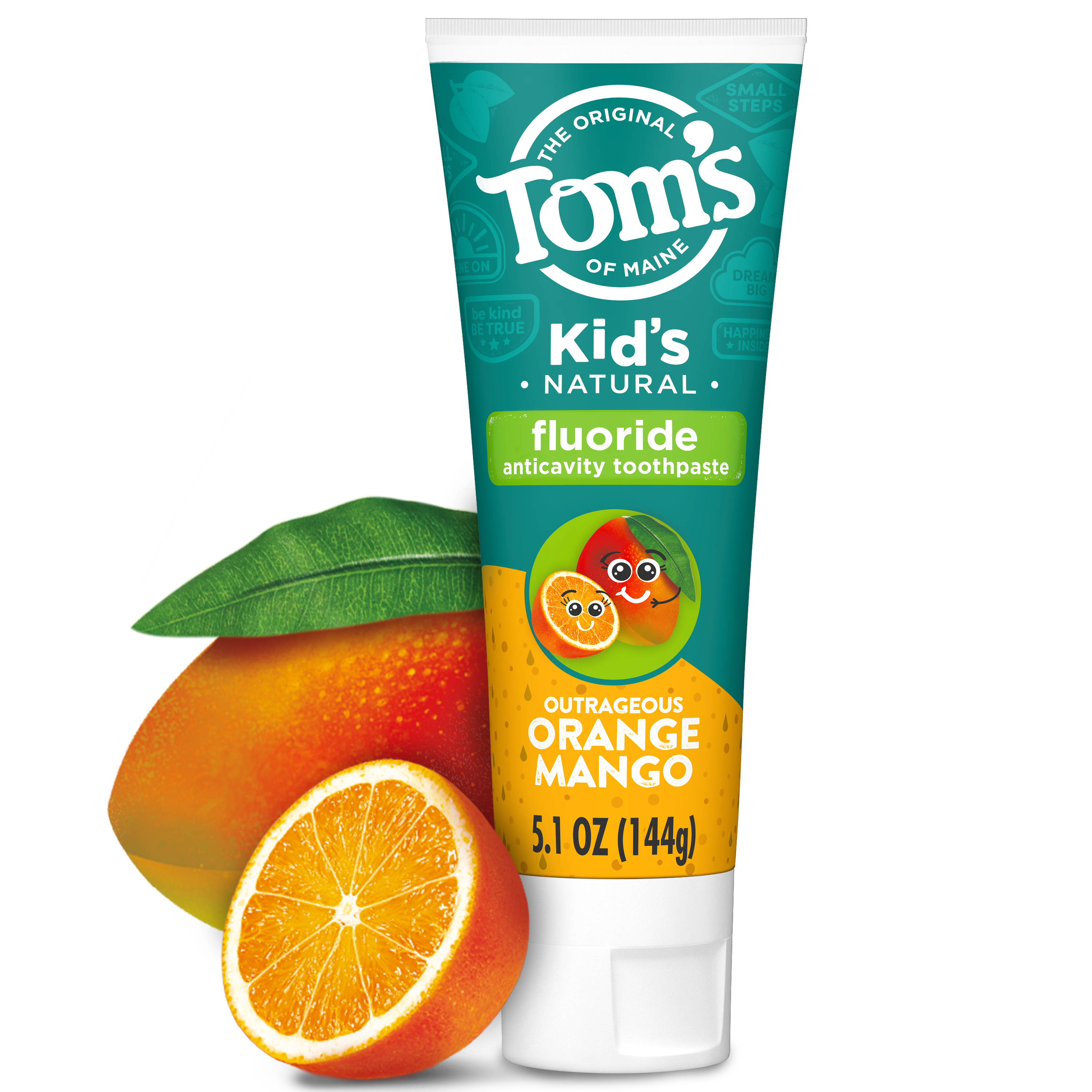 SKU US06381A Consumer Unit - GTIN 00035000971210 Case - GTIN 10035000971217 Product Category Oral Care Product Sub Category Toothpaste Product Equity (Brand) Tom's of Maine Product Sub Brand Tom's Kids TP Product Title Tom's of Maine Kids Fluoride Natural Toothpaste, Outrageous Orange Mango, 5.1 oz. Product Description Goodbye artificial sparkles and bubble gum flavors. Hello natural cavity protection! Tom's of Maine Natural Kids Fluoride Toothpaste uses calcium and silica to gently clean your little one's teeth. Plus, the yummy Outrageous Orange Mango flavor of this natural children's toothpaste makes brushing more fun. With no artificial flavors, colors or preservatives, this fluoride toothpaste is silly enough for kids and effective enough for parents. And when you're done using your toothpaste, you can recycle the tube! Check to be sure that your tube has the blue recycling flag on it, squeeze out as much of the toothpaste from the tube as you can, replace the cap, and place the tube in your recycling bin. At Tom's of Maine, we want to empower families to live more naturally. With more than 5 years experience combining scientific know-how, naturally derived ingredients and a bit of ingenuity, we make products that are good for you and the planet. As a Certified B Corp, we hold ourselves to the highest social and environmental standards. Plus, we're committed to supporting local communities for meaningful change, donating 1% of our profits to charities supporting health, education and the environment. We call this "doing good, for real," and it impacts everything we do. eCommerce Copy- Long Description Goodbye artificial sparkles and bubble gum flavors. Hello natural cavity protection! Tom's of Maine Natural Kids Fluoride Toothpaste uses calcium and silica to gently clean your little one's teeth. Plus, the yummy Outrageous Orange Mango flavor of this natural children's toothpaste makes brushing more fun. With no artificial flavors, colors or preservatives, this fluoride toothpaste is silly enough for kids and effective enough for parents. And when you're done using your toothpaste, you can recycle the tube! Check to be sure that your tube has the blue recycling flag on it, squeeze out as much of the toothpaste from the tube as you can, replace the cap, and place the tube in your recycling bin. At Tom's of Maine, we want to empower families to live more naturally. With more than 50 years experience combining scientific know-how, naturally derived ingredients and a bit of ingenuity, we make products that are good for you and the planet. As a Certified B Corp, we hold ourselves to the highest social and environmental standards. Plus, we're committed to supporting local communities for meaningful change, donating 10% of our profits to charities supporting health, education and the environment. We call this "doing good, for real," and it impacts everything we do. Bullet 1 WHAT YOU'LL GET: One 5.1-ounce tube of Tom's of Maine Kids Fluoride Toothpaste in Orange Mango Flavor Bullet 2 FIGHT CAVITIES: Fluoride toothpaste provides cavity protection while calcium and silica gently clean teeth Bullet 3 TASTE THEY LOVE: The fruity flavor of this children's toothpaste makes brushing a fun habit Bullet 4 RECYCLABLE TUBE: Look for the blue recycling flag, squeeze out as much toothpaste as you can, replace the cap, and recycle Bullet 5 TAKE CARE OF YOURSELF NATURALLY: Contains no artificial preservatives, colors or flavors and is not tested on animals Active Ingredients Sodium monofluorophosphate 0.76% (0.14% w/v fluoride ion)