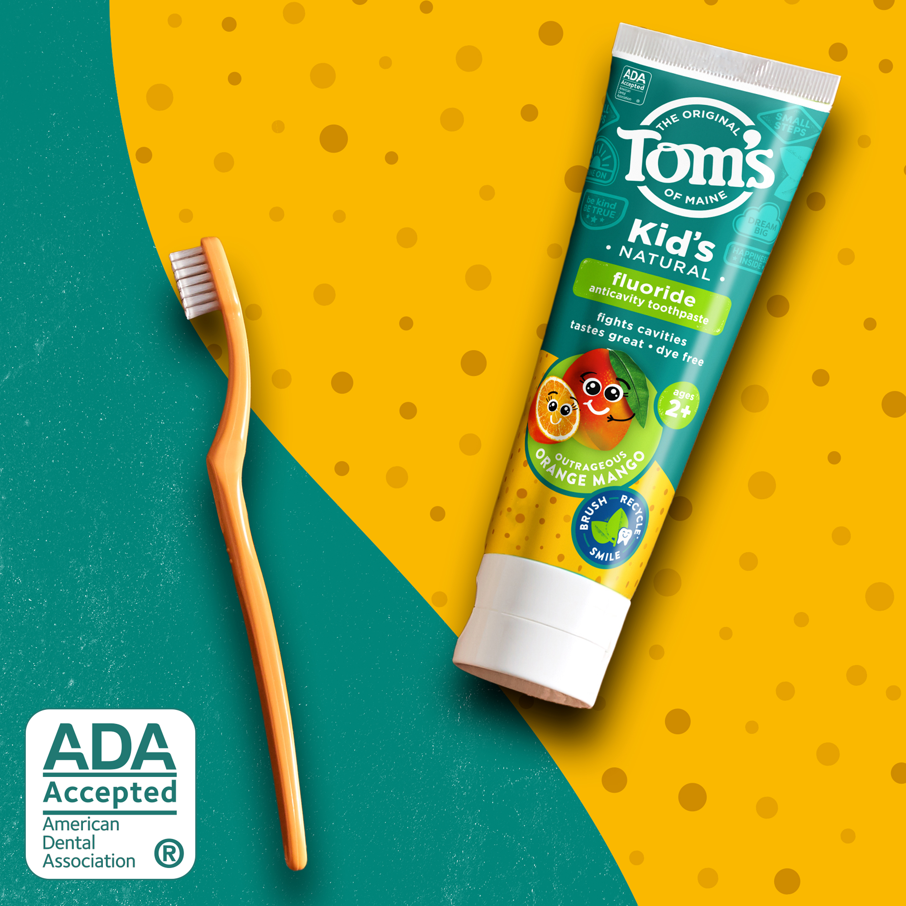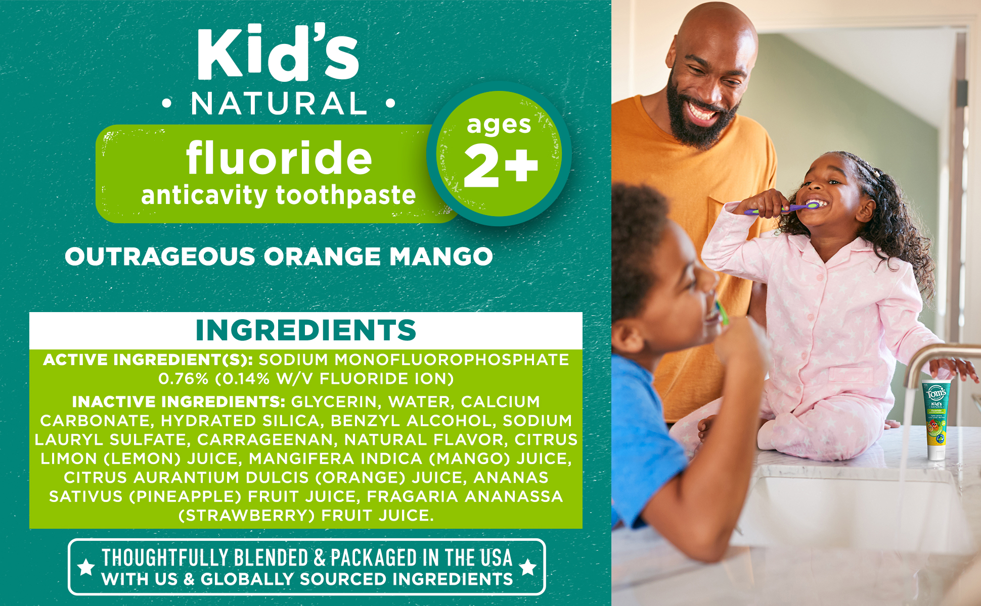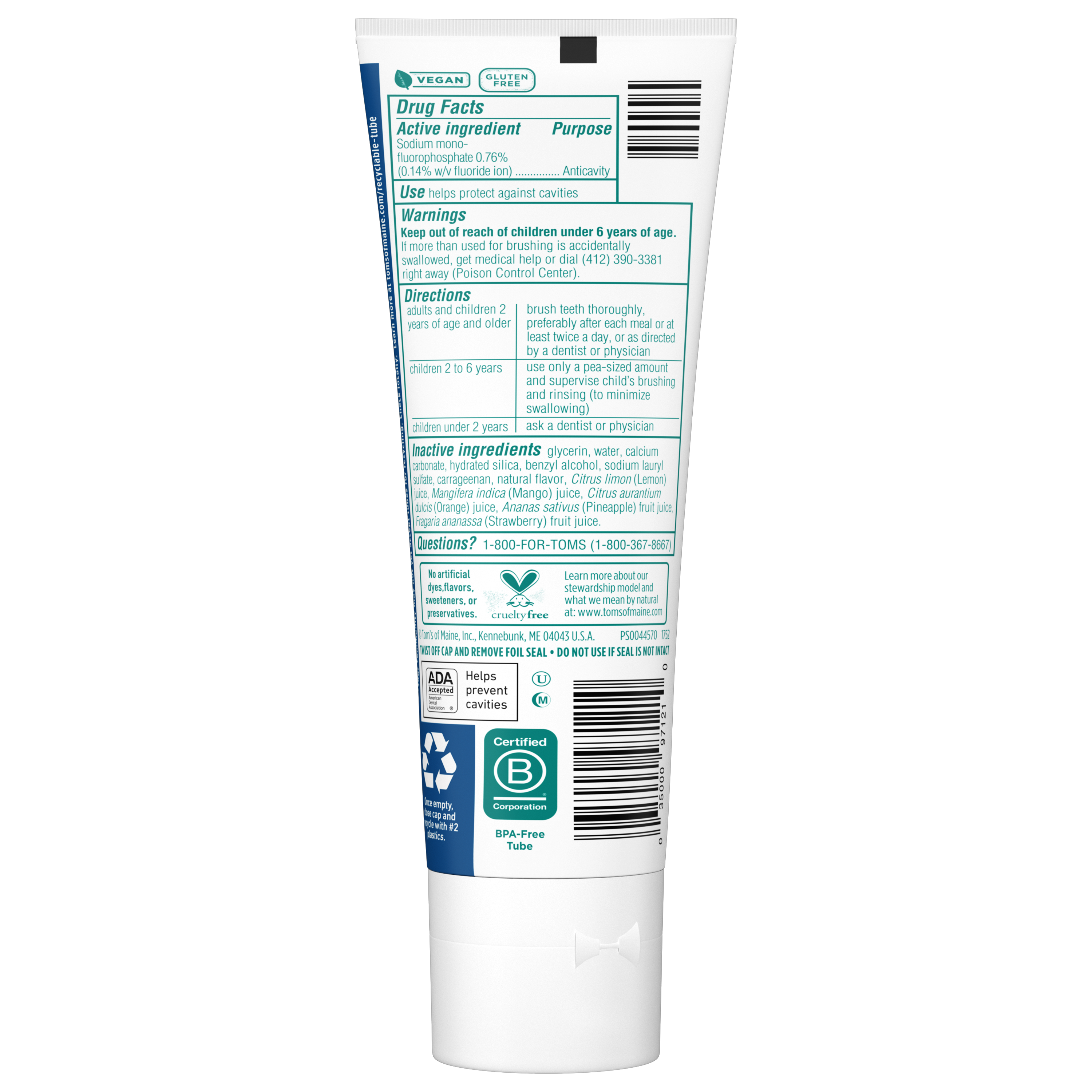 SKU US06381A Consumer Unit - GTIN 00035000971210 Case - GTIN 10035000971217 Product Category Oral Care Product Sub Category Toothpaste Product Equity (Brand) Tom's of Maine Product Sub Brand Tom's Kids TP Product Title Tom's of Maine Kids Fluoride Natural Toothpaste, Outrageous Orange Mango, 5.1 oz. Product Description Goodbye artificial sparkles and bubble gum flavors. Hello natural cavity protection! Tom's of Maine Natural Kids Fluoride Toothpaste uses calcium and silica to gently clean your little one's teeth. Plus, the yummy Outrageous Orange Mango flavor of this natural children's toothpaste makes brushing more fun. With no artificial flavors, colors or preservatives, this fluoride toothpaste is silly enough for kids and effective enough for parents. And when you're done using your toothpaste, you can recycle the tube! Check to be sure that your tube has the blue recycling flag on it, squeeze out as much of the toothpaste from the tube as you can, replace the cap, and place the tube in your recycling bin. At Tom's of Maine, we want to empower families to live more naturally. With more than 5 years experience combining scientific know-how, naturally derived ingredients and a bit of ingenuity, we make products that are good for you and the planet. As a Certified B Corp, we hold ourselves to the highest social and environmental standards. Plus, we're committed to supporting local communities for meaningful change, donating 1% of our profits to charities supporting health, education and the environment. We call this "doing good, for real," and it impacts everything we do. eCommerce Copy- Long Description Goodbye artificial sparkles and bubble gum flavors. Hello natural cavity protection! Tom's of Maine Natural Kids Fluoride Toothpaste uses calcium and silica to gently clean your little one's teeth. Plus, the yummy Outrageous Orange Mango flavor of this natural children's toothpaste makes brushing more fun. With no artificial flavors, colors or preservatives, this fluoride toothpaste is silly enough for kids and effective enough for parents. And when you're done using your toothpaste, you can recycle the tube! Check to be sure that your tube has the blue recycling flag on it, squeeze out as much of the toothpaste from the tube as you can, replace the cap, and place the tube in your recycling bin. At Tom's of Maine, we want to empower families to live more naturally. With more than 50 years experience combining scientific know-how, naturally derived ingredients and a bit of ingenuity, we make products that are good for you and the planet. As a Certified B Corp, we hold ourselves to the highest social and environmental standards. Plus, we're committed to supporting local communities for meaningful change, donating 10% of our profits to charities supporting health, education and the environment. We call this "doing good, for real," and it impacts everything we do. Bullet 1 WHAT YOU'LL GET: One 5.1-ounce tube of Tom's of Maine Kids Fluoride Toothpaste in Orange Mango Flavor Bullet 2 FIGHT CAVITIES: Fluoride toothpaste provides cavity protection while calcium and silica gently clean teeth Bullet 3 TASTE THEY LOVE: The fruity flavor of this children's toothpaste makes brushing a fun habit Bullet 4 RECYCLABLE TUBE: Look for the blue recycling flag, squeeze out as much toothpaste as you can, replace the cap, and recycle Bullet 5 TAKE CARE OF YOURSELF NATURALLY: Contains no artificial preservatives, colors or flavors and is not tested on animals Active Ingredients Sodium monofluorophosphate 0.76% (0.14% w/v fluoride ion)