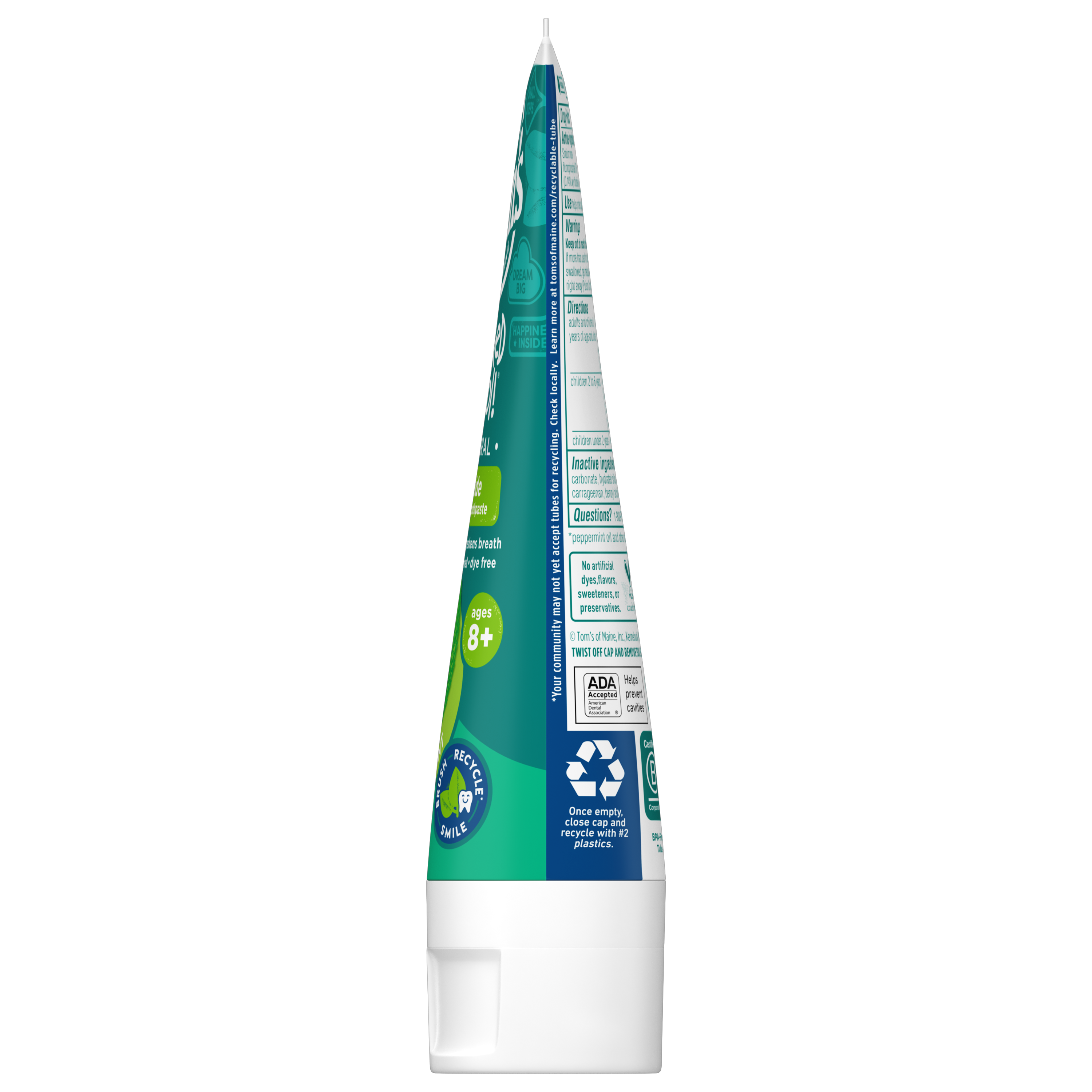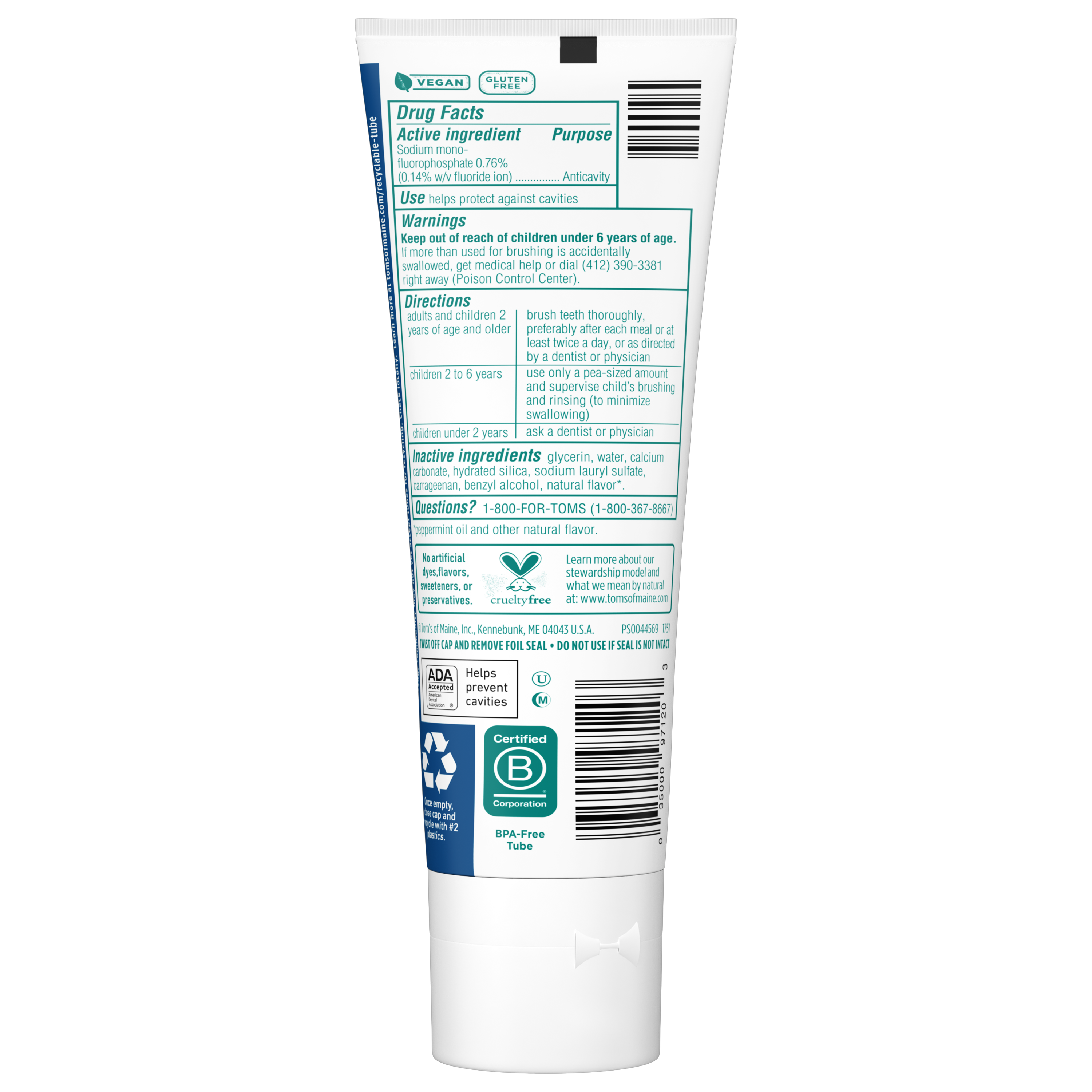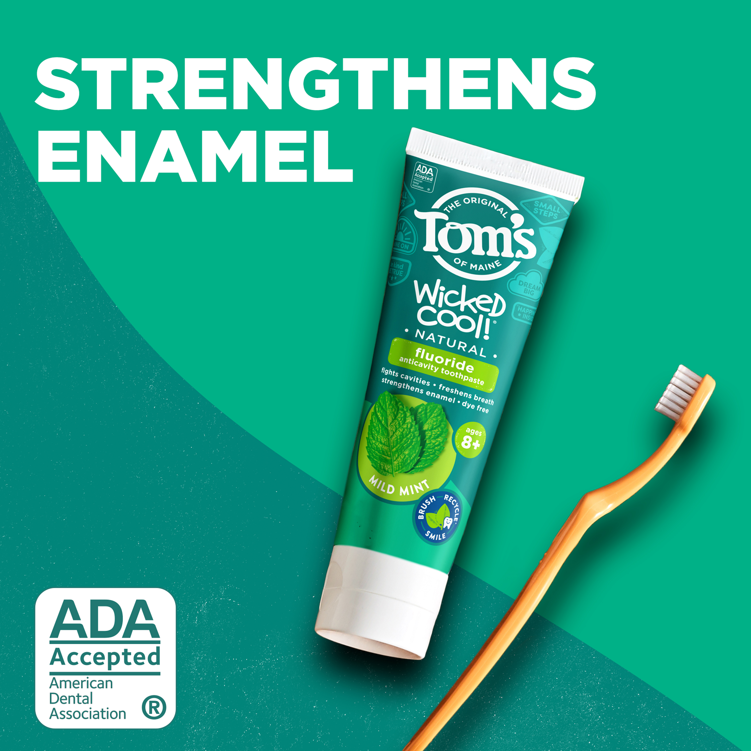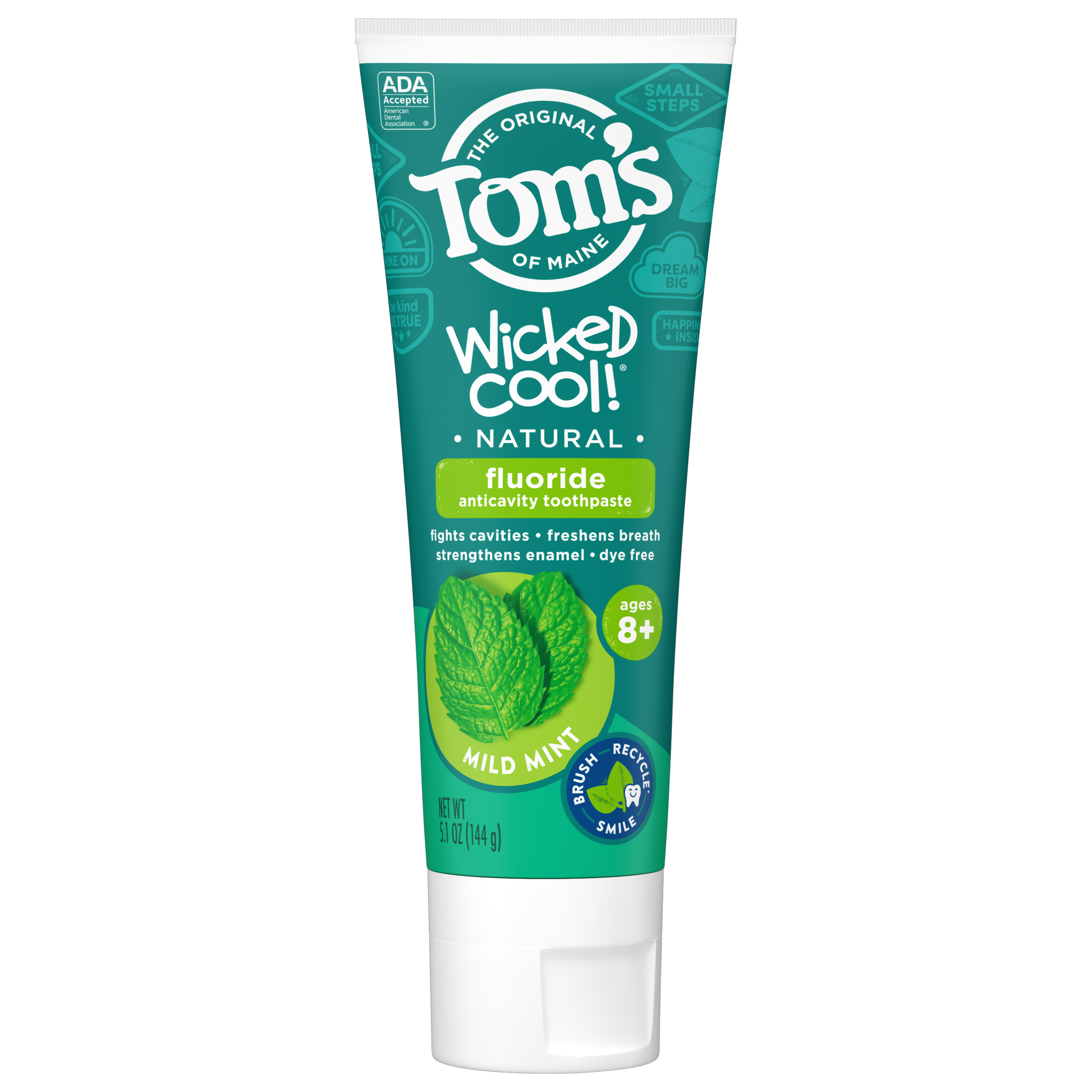 SKU US06382A Consumer Unit - GTIN 00035000971203 Case - GTIN 10035000971200 Product Category Oral Care Product Sub Category Toothpaste Product Equity (Brand) Tom's Product Sub Brand Tom's Kids TP Product Title Tom's of Maine Wicked Cool! Fluoride Natural Toothpaste for Kids, Mild Mint, 5.1 oz. Product Description Too old for fruity flavors. Not ready for the strong taste of mint. Make one part of the transition to adulthood a little easier with Tom's of Maine Wicked Cool! Natural Toothpaste for Kids. This fluoride toothpaste helps strengthen enamel, freshen breath and prevent cavities — all with the natural taste of Mild Mint. Now, that's fresh! And when you're done using your toothpaste, you can recycle the tube! Check to be sure that your tube has the blue recycling flag on it, squeeze out as much of the toothpaste from the tube as you can, replace the cap, and place the tube in your recycling bin. At Tom's of Maine, we want to empower families to live more naturally. With more than 5 years experience combining scientific know-how, naturally derived ingredients and a bit of ingenuity, we make products that are good for you and the planet. As a Certified B Corp, we hold ourselves to the highest social and environmental standards. Plus, we're committed to supporting local communities for meaningful change, donating 1% of our profits to charities supporting health, education and the environment. We call this "doing good, for real," and it impacts everything we do. eCommerce Copy- Long Description Too old for fruity flavors. Not ready for the strong taste of mint. Make one part of the transition to adulthood a little easier with Tom's of Maine Wicked Cool! Natural Toothpaste for Kids. This fluoride toothpaste helps strengthen enamel, freshen breath and prevent cavities — all with the natural taste of Mild Mint. Now, that's fresh! And when you're done using your toothpaste, you can recycle the tube! Check to be sure that your tube has the blue recycling flag on it, squeeze out as much of the toothpaste from the tube as you can, replace the cap, and place the tube in your recycling bin. At Tom's of Maine, we want to empower families to live more naturally. With more than 50 years experience combining scientific know-how, naturally derived ingredients and a bit of ingenuity, we make products that are good for you and the planet. As a Certified B Corp, we hold ourselves to the highest social and environmental standards. Plus, we're committed to supporting local communities for meaningful change, donating 10% of our profits to charities supporting health, education and the environment. We call this "doing good, for real," and it impacts everything we do. Bullet 1 WHAT YOU'LL GET: One 5.1-ounce tube of Tom's of Maine Wicked Cool! Kids Fluoride Toothpaste in Mild Mint Flavor Bullet 2 FIGHT CAVITIES: Fluoride toothpaste provides cavity protection and strengthens enamel Bullet 3 TASTE THEY LOVE: This children's toothpaste's minty flavor freshens breath without being too overpowering Bullet 4 RECYCLABLE TUBE: Look for the blue recycling flag, squeeze out as much toothpaste as you can, replace the cap, and recycle Bullet 5 TAKE CARE OF YOURSELF NATURALLY: Contains no artificial preservatives, colors or flavors and is not tested on animals Active Ingredients Sodium monofluorophosphate 0.76% (0.14% w/v fluoride ion) Target RPC 76626524 Target URL https://www.target.com/p/a/-/A-76626524