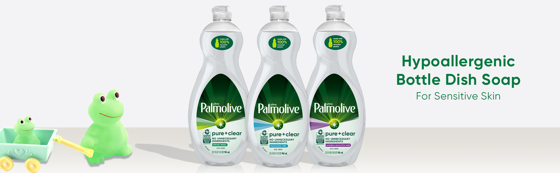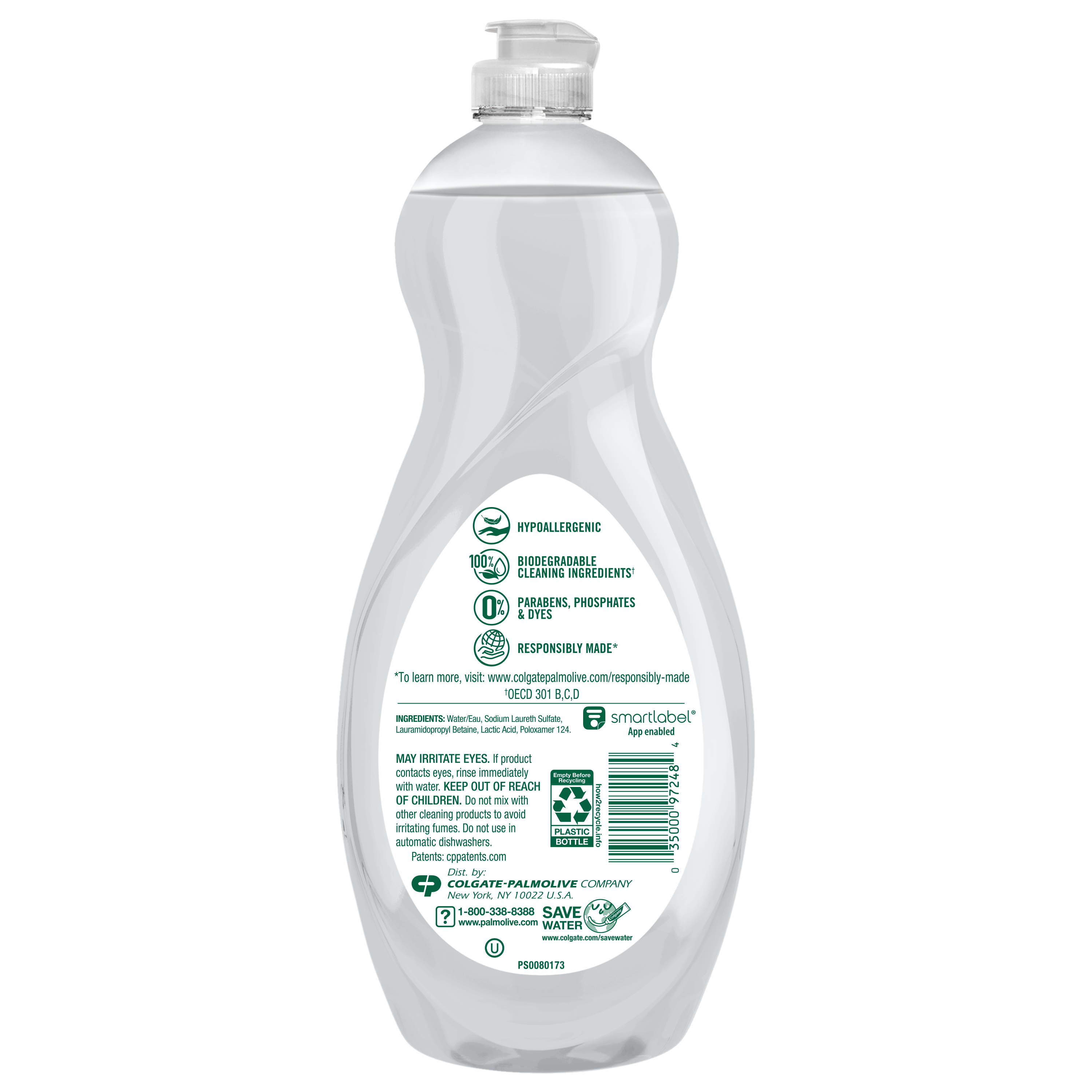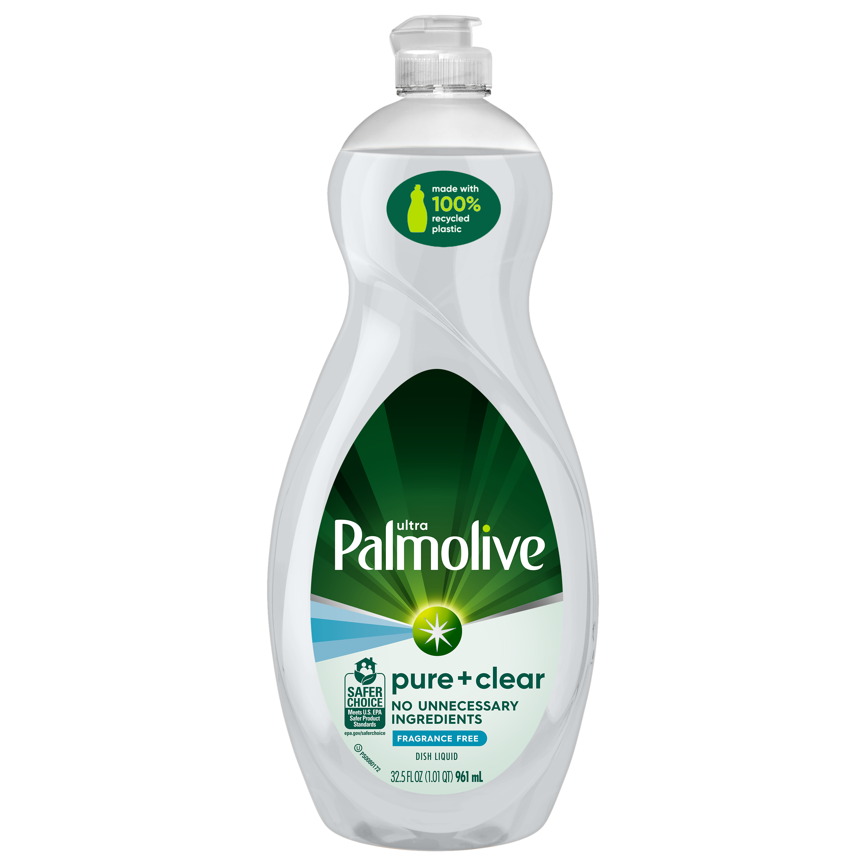 SKU US06448A Consumer Unit - GTIN 00035000972484 Case - GTIN 10035000972481 Product Category Home Care Product Sub Category Dish Hand Product Equity (Brand) Palmolive Product Sub Brand Palmolive Pure + Ultra HD Product Title Palmolive Ultra Pure + Clear Liquid Dish Soap, Fragrance Free - 32.5 Fluid Ounce Product Description Palmolive Ultra Pure + Clear Unscented Liquid Dish Soap is the grease fighting dish soap you know and trust to get the dishes done. With no unnecessary ingredients, Palmolive Ultra Pure + Clear effectively cuts through grease leaving even your dirtiest dishes clean.While Palmolive Ultra Pure + Clear is tough on grease, it is made to be gentle on the earth with a hypoallergenic formula, biodegradable cleaning ingredients, and sustainable packaging. These eco friendly features make it a great addition to your household dishwashing supplies. Make a difference at home and on the environment with Palmolive Ultra. eCommerce Copy- Long Description No unnecessary ingredients. 100% Palmolive clean. When you want ultra-clean dishes without unnecessary ingredients, there’s one clear choice. Palmolive Ultra Pure + Clear Liquid Dish Soap is the clear choice for a grease-fighting dish soap that instantly cuts through grease and eliminates stuck-on food. And while it’s tough on grease, it’s still gentle on the planet with a formula that contains 100% biodegradable cleaning ingredients✝, and a bottle that is made from 100% recycled plastic* and is also recyclable. Try this grease-cutting, Safer Choice-certified dish liquid in Spring Fresh scent, Lavender & Eucalyptus scent, or a Fragrance Free variant. The Fragrance Free and mildly-scented formulas are hypoallergenic and were tested to ensure that they do not cause skin irritation or sensitivity to people, including for those with sensitive skin. ✝OECD 301 B, C, D / OCDE 301 B, C, D *46 oz and smaller size Today the dishes. Tomorrow the world. For over 50 years, households have relied on Palmolive for powerful grease cutting in the kitchen and beyond. And now, we’re thinking about what we can do for the next 50. Palmolive has always engineered our dishwashing liquid to be tough on grease yet soft on hands. Today, this extends to caring for the planet, too: Made in a TRUE Zero Waste Certified Manufacturing Facility* 100% post-consumer recycled plastic bottles (for 46 oz and under) 100% Biodegradable Cleaning Ingredients✝ 0% Parabens and Phosphates No matter which of our Palmolive Ultra Concentrated Dish Soaps you choose, you can rest assured you’re taking a small step towards making a big difference. Palmolive: Tough on Grease, Gentle on Planet *TRUE is a zero waste certification program for businesses to assess performance in reducing waste. Learn more at true.gbci.org. ✝OECD 301 B, C, D / OCDE 301 B, C, D Bullet 1 This liquid dish soap is tough on grease, gentle on planet Bullet 2 Our dish soap is made with 100% biodegradable cleaning ingredients and free of phosphates and parabens for a more eco friendly dish soap Bullet 3 This liquid dish soap is made with a hypoallergenic formula that will be gentle on your skin Bullet 4 This is a concentrated dishwashing soap formula Bullet 5 This liquid dish soap that not only cuts through grease, but cuts through stuck on food, and leaves your dirtiest dishes clean Bullet 6 Our liquid dish soap is unscented, clear dish soap liquid Bullet 7 This liquid dish soap packaging is made with 100% recycled plastic for more sustainable packaging Bullet 8 Our liquid dish soap is Kosher Bullet 9 Do not use this dishwashing liquid soap in automatic dishwashers Amazon RPC B0BJYKVLRN AMZ URL https://www.amazon.com/dp/B0BJYKVLRN Walmart RPC 583717832 Walmart URL (Computed) https://www.walmart.com/ip/a/583717832 Target RPC 78056165 Target URL https://www.target.com/p/a/-/A-78056165