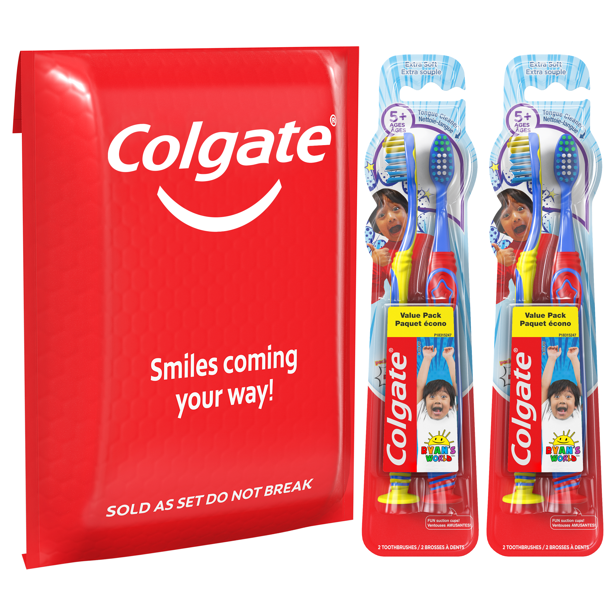 SKU US06508A Consumer Unit - GTIN 00035000973184 Case - GTIN 10035000973181 Product Category Oral Care Product Sub Category Manual TB Product Equity (Brand) Colgate Product Sub Brand Colgate Kids Man TB Product Title Colgate Kids Toothbrush with Extra Soft Bristles, Ryan's World - 4 Count Product Description Colgate's Ryan's World Extra Soft Kids Toothbrush is a fun way to encourage good oral care habits early on! These manual kids toothbrushes are specially designed for children with both baby & adult teeth. It features a suction cup that acts as a kids toothbrush holder for easy and fun upright storage, a thumb grip and rounded handle for a comfortable grip, and the unique soft tongue cleaner on the back of the toothbrush head to clean beyond teeth. Bullet 1 Kids toothbrushes featuring Ryan's World to encourage good oral care habits early on Bullet 2 Extra soft bristles for effective and gentle cleaning Bullet 3 Unique soft tongue cleaner on each kids toothbrush to clean beyond teeth Bullet 4 Thumb grip and rounded handle for a comfortable grip Bullet 5 Suction cup for easy and fun upright storage