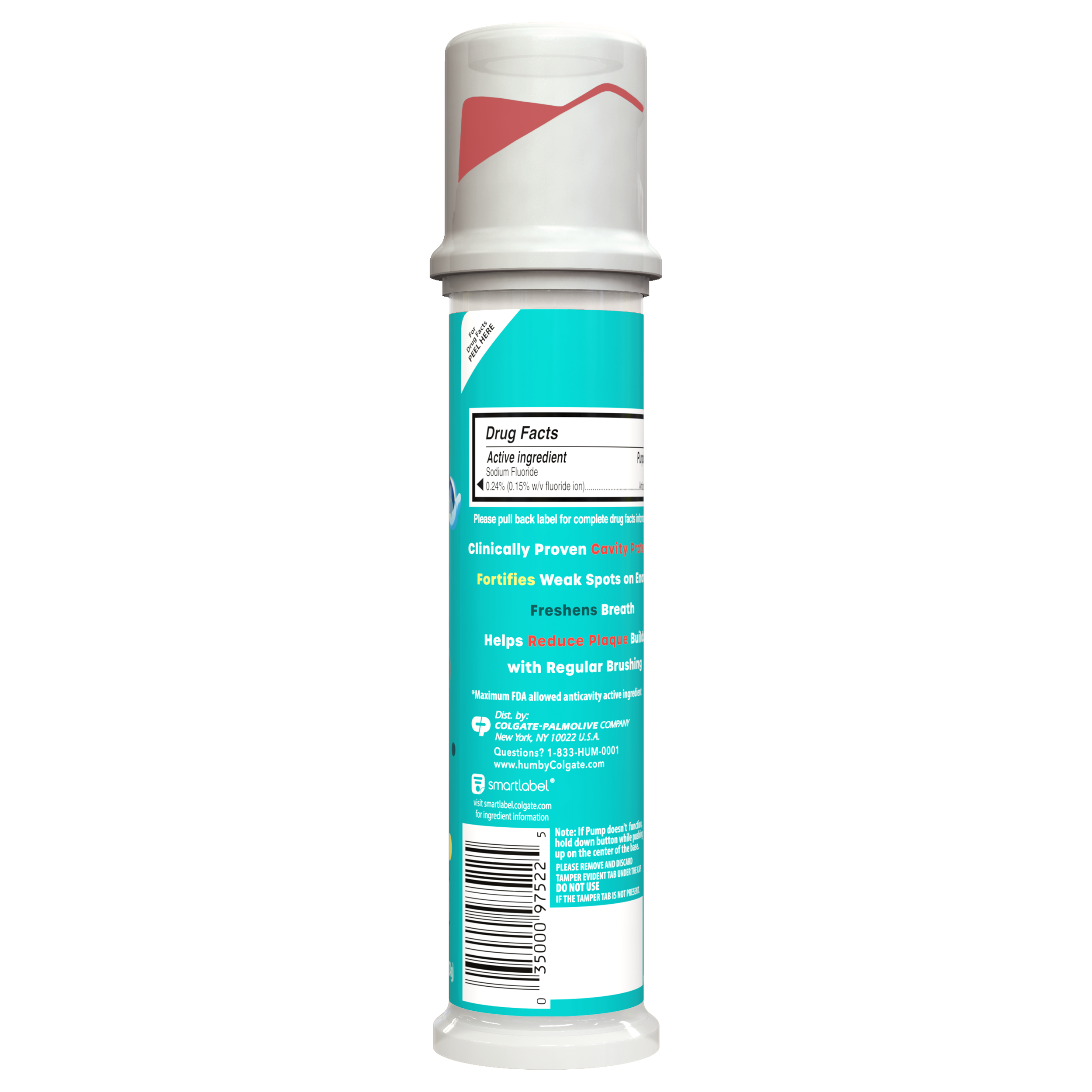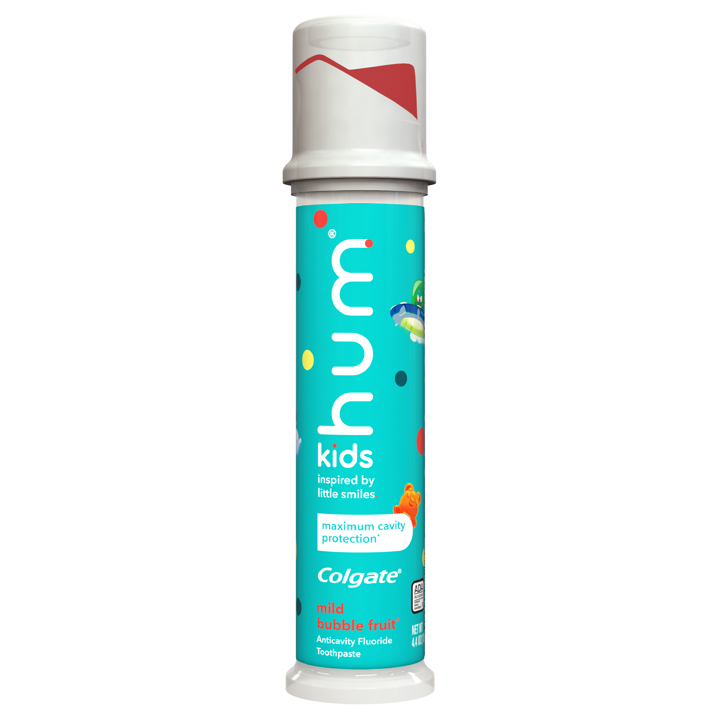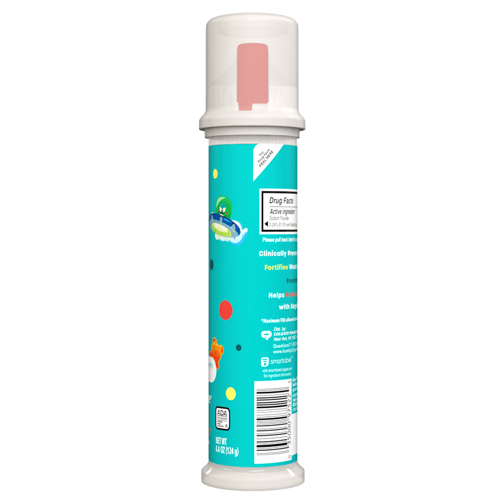 SKU US06643A Consumer Unit - GTIN 00035000975225 Case - GTIN 10035000975222 Product Category Oral Care Product Sub Category Toothpaste Product Equity (Brand) Colgate Product Sub Brand Colgate Kids TP Product Title Hum Kids by Colgate 4.4 oz Toothpaste Pump Product Description Hum Kids by Colgate Toothpaste is enamel safe and clinically proven to fight cavities. Plus, it is designed for growing adult teeth (2+) and available in a pump that parents will love. With a Mild Bubble Fruit flavor that encourages regular brushing, the Hum Kids by Colgate Toothpaste is ADA (American Dental Association) accepted. This kids toothpaste reduces the buildup of plaque, fortifies enamel, and keeps breath fresh. eCommerce Copy- Long Description Hum Kids by Colgate Toothpaste is enamel safe and clinically proven to fight cavities. Plus, it is designed for growing adult teeth (2+) and available in a pump that parents will love. With a Mild Bubble Fruit flavor that encourages regular brushing, the Hum Kids by Colgate Toothpaste is ADA (American Dental Association) accepted. This kids toothpaste reduces the buildup of plaque, fortifies enamel, and keeps breath fresh. Bullet 1 Fluoride Toothpaste for Kids Bullet 2 Clinically Proven to Fight Cavities Bullet 3 Nice and Gentle on Tooth Enamel Bullet 4 Bubble Fruit Flavor to Encourage Regular Brushing Bullet 5 Helps Reduce Plaque Buildup with Regular Brushing Bullet 6 Freshens Breath Bullet 7 Vegan Bullet 8 Gluten Free Bullet 9 Sugar Free Active Ingredients Active Ingredient: Sodium Fluoride (0.24% (0.14% w/v Fluoride Ion)). Purpose: Anticavity.