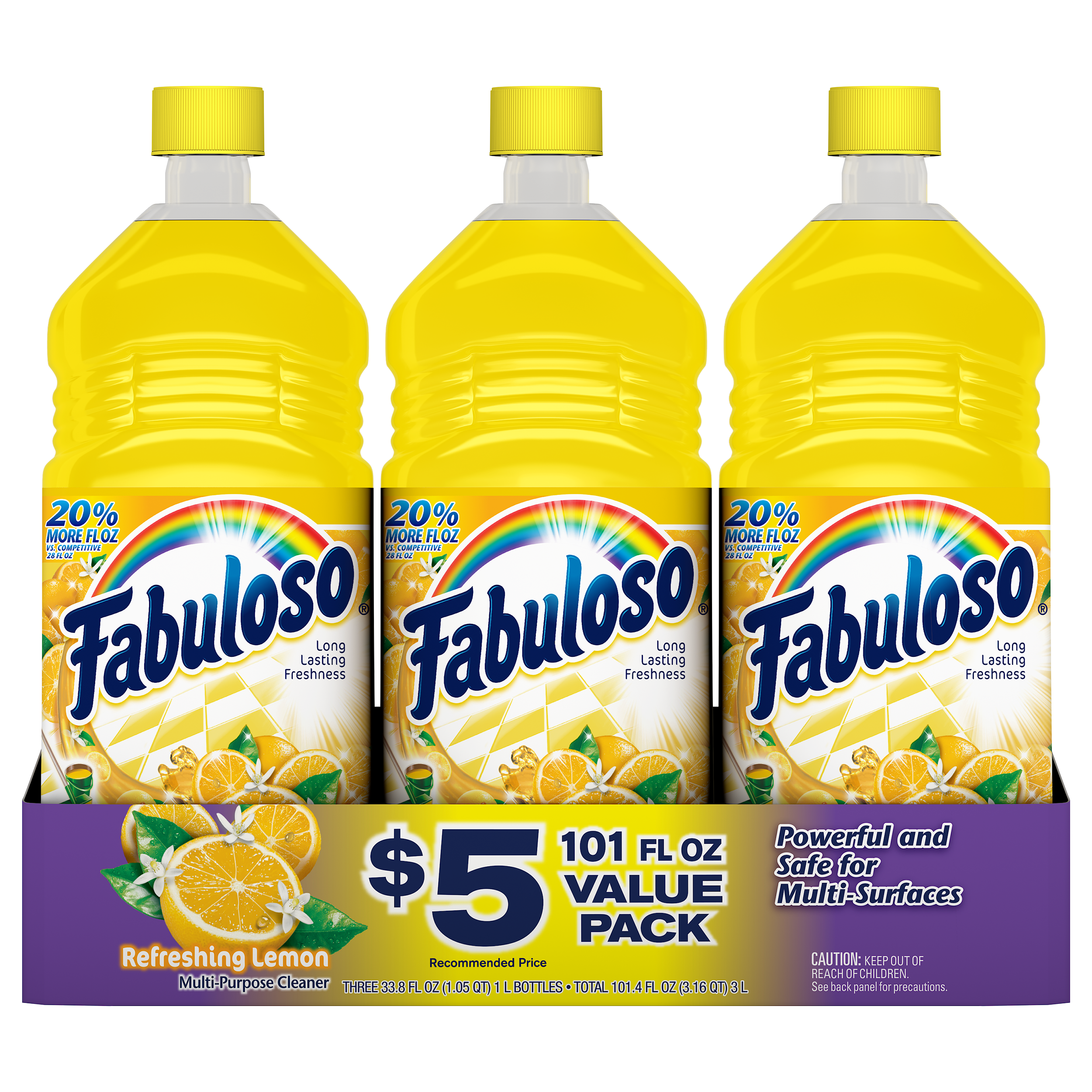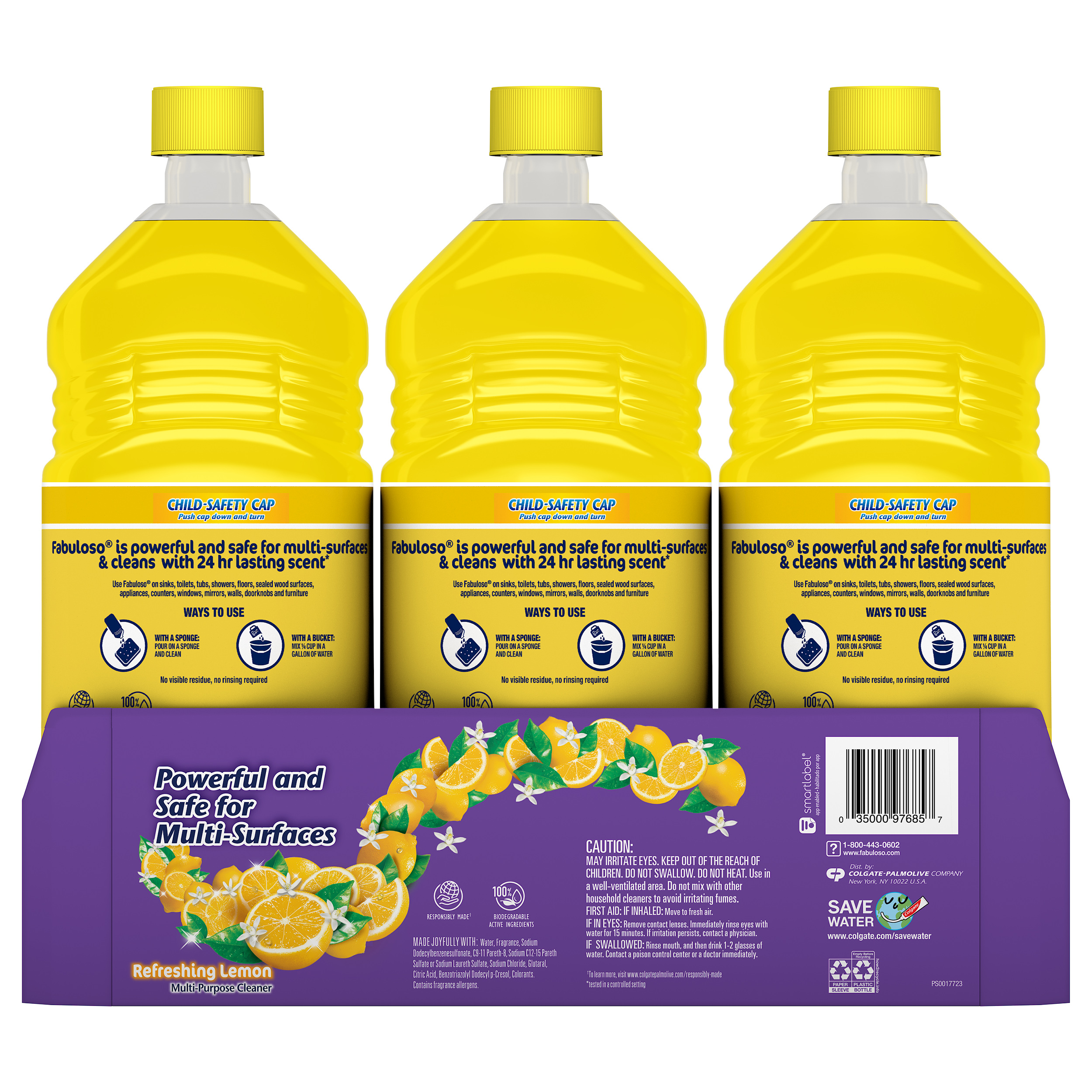 SKU US06739A Consumer Unit - GTIN 00035000976857 Case - GTIN 10035000976854 Product Category Home Care Product Sub Category Cleaners Liquid / Gel Product Equity (Brand) Fabuloso Product Sub Brand Fabuloso Liq Cln Product Title Fabuloso All Purpose Cleaner, Lemon - 33.8 fluid ounce Product Description Fabuloso Multi-Purpose Cleaner leaves a fresh scent that lasts. The Lemon fragrance leaves an irresistible scent your family and guests will notice. It comes in a convenient, easy-pour bottle. This Fabuloso cleaner is easy to use, so there is no need to rinse, and it leaves no visible residue. Discover the long-lasting freshness of Fabuloso Multi-Purpose Cleaner that leaves your home shiny, clean, fresh, and fragrant. Bullet 1 Fabuloso is powerful and safe for multi-surfaces Bullet 2 Use Fabuloso® on sinks, toliets, tubs, showers, floors, sealed wood surfaces, appliances, counters, windows, mirrors, walls, doorknobs, and furniture. Bullet 3 No visible residue, No rinsing required Bullet 4 100% Biodegradable Active Ingredients Bullet 5 Responsibly Made** (**to learn more, visit www.colgatepalmolive.com/responsibly-made)