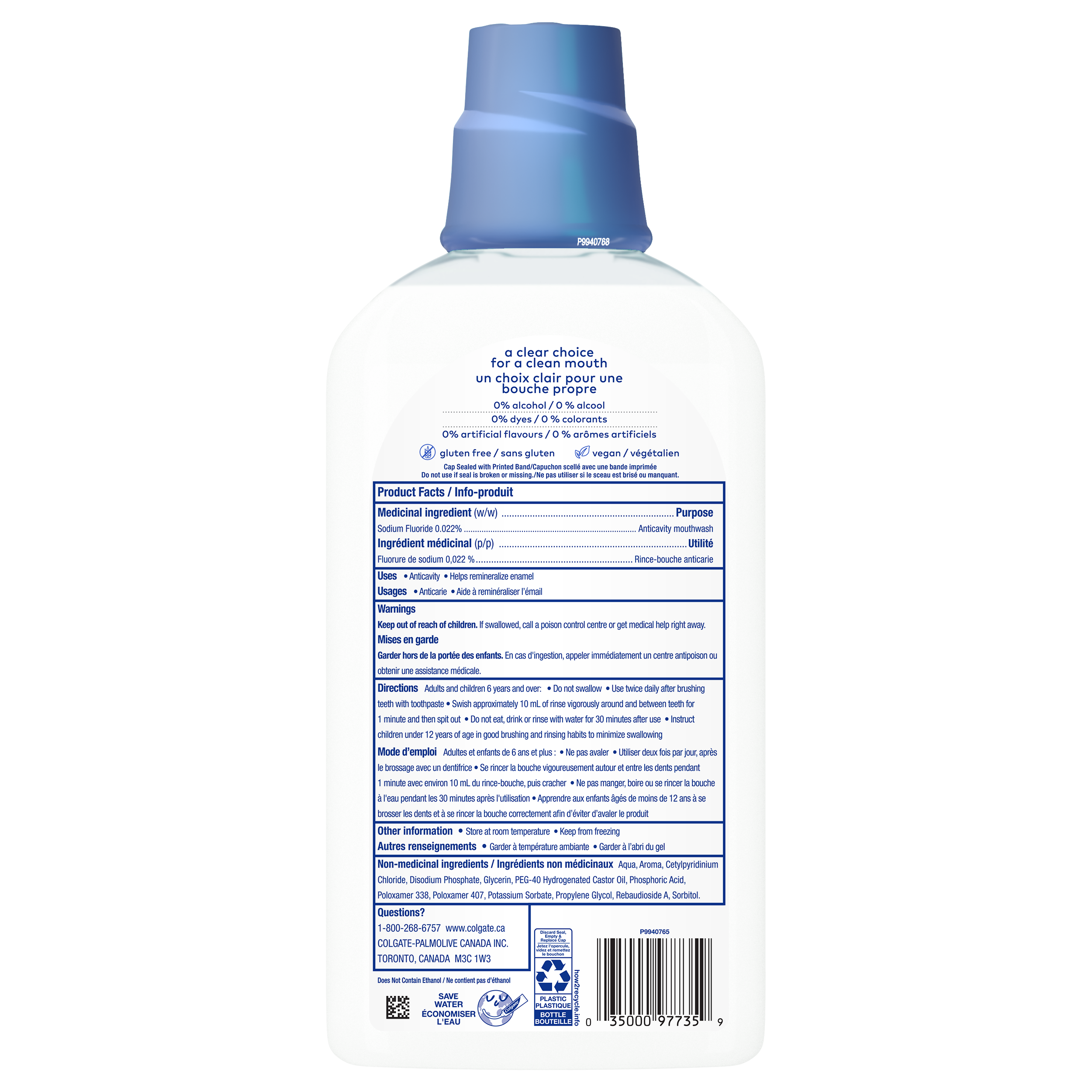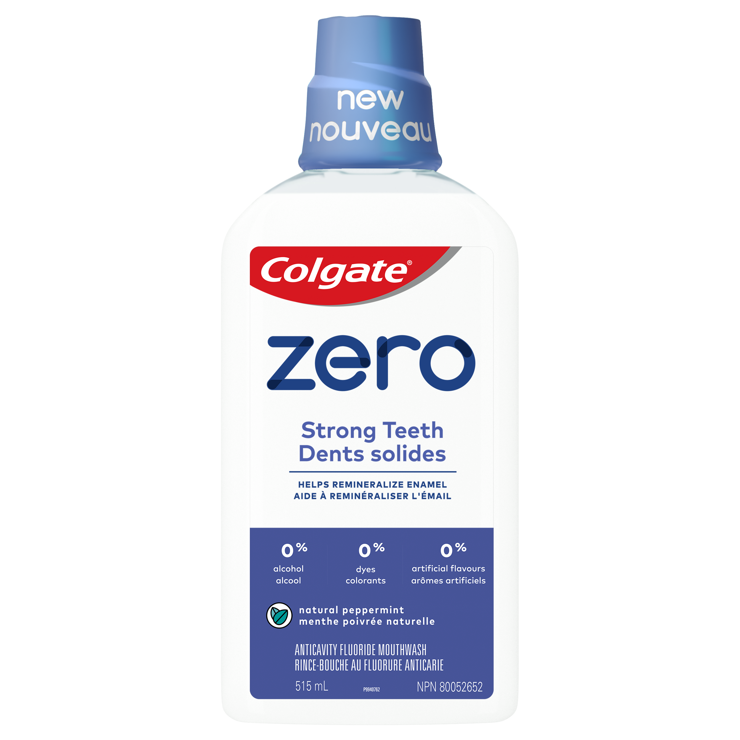 SKU US06778A Consumer Unit - GTIN 00035000977359 Case - GTIN 10035000977356 Product Category Oral Care Product Sub Category Mouthwash Product Equity (Brand) Colgate Product Sub Brand Colgate Zero MW Product Title Colgate Zero Mouthwash Strong Teeth, Natural Peppermint - 515 mL Product Description Colgate Zero Mouthwash Strong Teeth strengthens enamel, helps prevent cavities and has a delicious natural peppermint flavor. Colgate Zero Mouthwash formula is gluten- free, vegan and has % alcohol, dyes, artificial flavors and artificial sweeteners. Every ingredient in Colgate Zero Mouthwash formula serves a clear purpose. Find out more on colgate.com . Colgate Zero Mouthwash - a clear choice for a clean mouth. eCommerce Copy- Long Description Colgate Zero Mouthwash Strong Teeth strengthens enamel, helps prevent cavities and has a delicious natural peppermint flavor. Colgate Zero Mouthwash formula is gluten- free, vegan and has 0% alcohol, dyes, artificial flavors and artificial sweeteners. Every ingredient in Colgate Zero Mouthwash formula serves a clear purpose. Find out more on colgate.com . Colgate Zero Mouthwash - a clear choice for a clean mouth. Bullet 1 Helps remineralize enamel Bullet 2 0% alcohol Bullet 3 0% dyes Bullet 4 0% artificial flavors Bullet 5 0% artificial sweeteners Bullet 6 gluten free Bullet 7 vegan Bullet 8 natural peppermint flavor Active Ingredients Sodium Fluoride 0.022%
