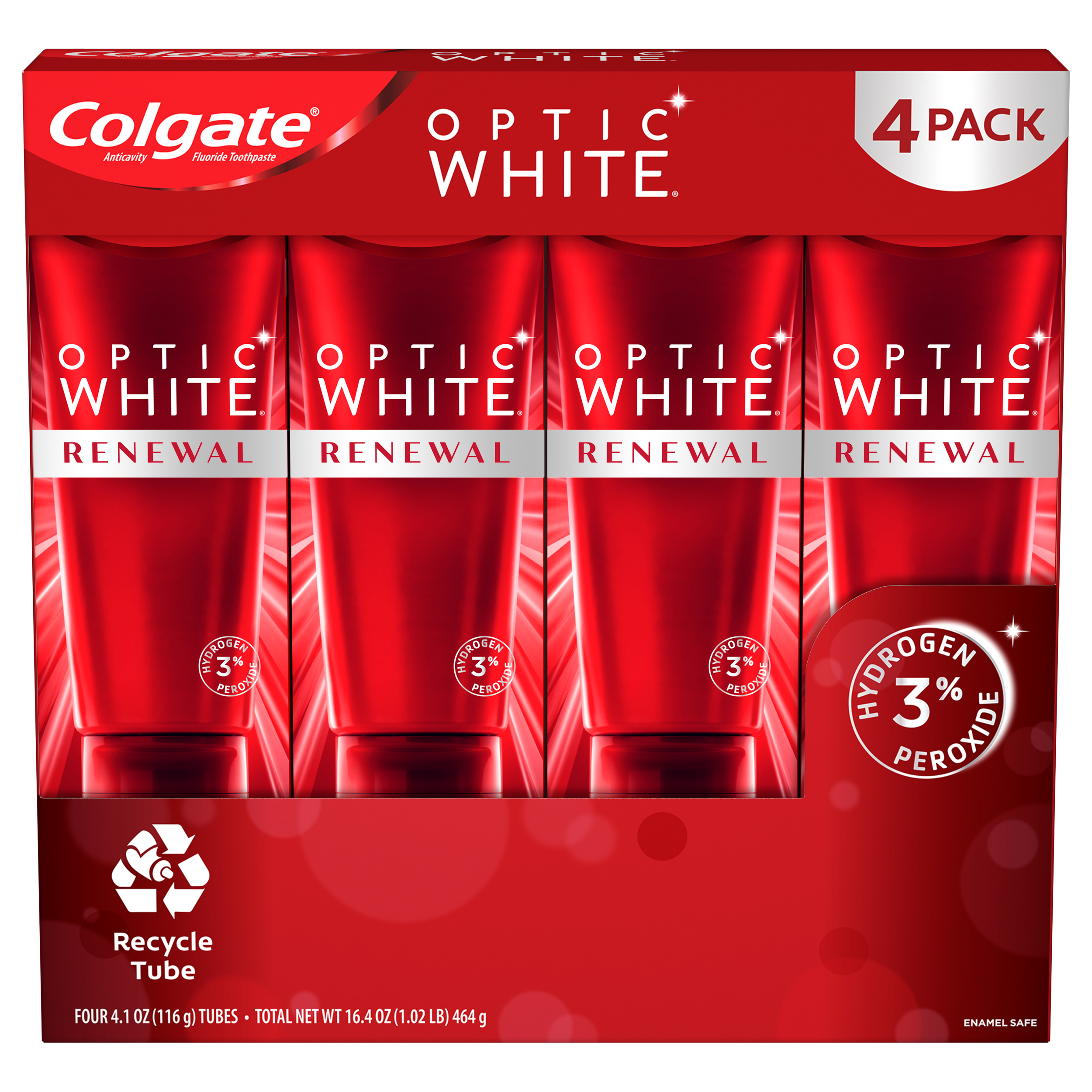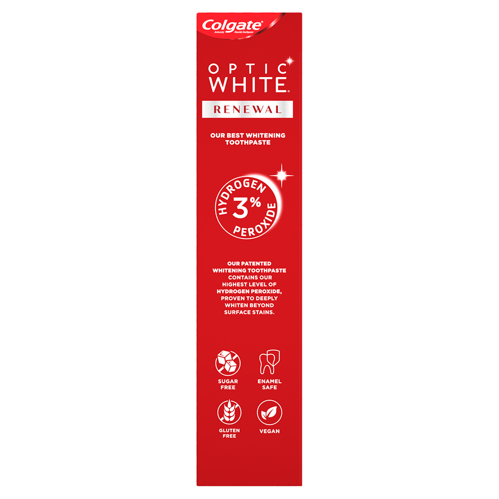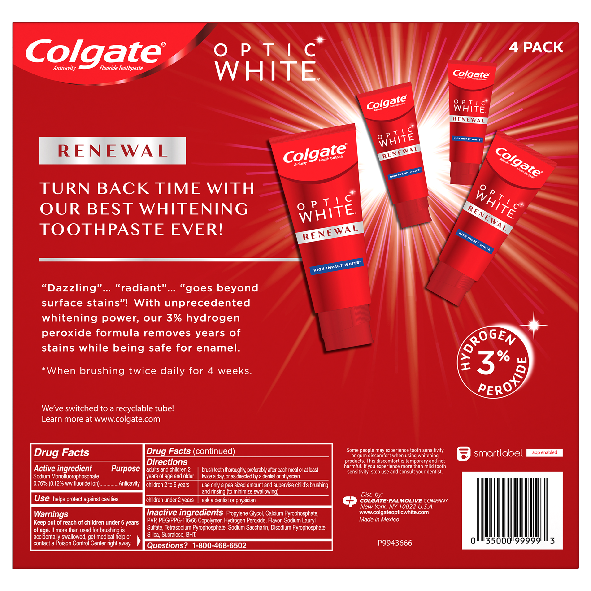 SKU US06832A Consumer Unit - GTIN 00035000999993 Product Category Oral Care Product Sub Category Toothpaste Product Equity (Brand) Colgate Product Sub Brand Colgate Optic White TP Product Title Colgate® Optic White® Renewal High Impact White Teeth Whitening Toothpaste, 4.1oz (4 pack) Product Description Colgate® Optic White® Renewal is our best whitening toothpaste ever. It contains 3% hydrogen peroxide, a professionally recommended whitening ingredient proven to deeply whiten beyond surface stains. With unprecedented whitening power, this teeth whitening toothpaste removes stains while being safe for enamel. eCommerce Copy- Long Description Colgate® Optic White® Renewal is our best whitening toothpaste ever. It contains 3% hydrogen peroxide, a professionally recommended whitening ingredient proven to deeply whiten beyond surface stains. With unprecedented whitening power, this teeth whitening toothpaste removes stains while being safe for enamel. Bullet 1 Turn back time with Colgate’s best whitening toothpaste ever! Bullet 2 With unprecedented whitening power, Colgate’s patented 3% hydrogen peroxide formula is proven to deeply whiten beyond surface stains Bullet 3 Contains dentist recommended Hydrogen Peroxide for teeth whitening Bullet 4 Enamel-safe teeth whitening, that’s good for daily use Bullet 5 Fluoride toothpaste formula to protect against cavities Bullet 6 Vegan toothpaste Bullet 7 Sugar free toothpaste Bullet 8 Gluten free toothpaste Active Ingredients Active ingredient: Sodium Monofluorophosphate (0.76% (0.12% w/v Fluoride Ion)). Purpose: Anticavity.