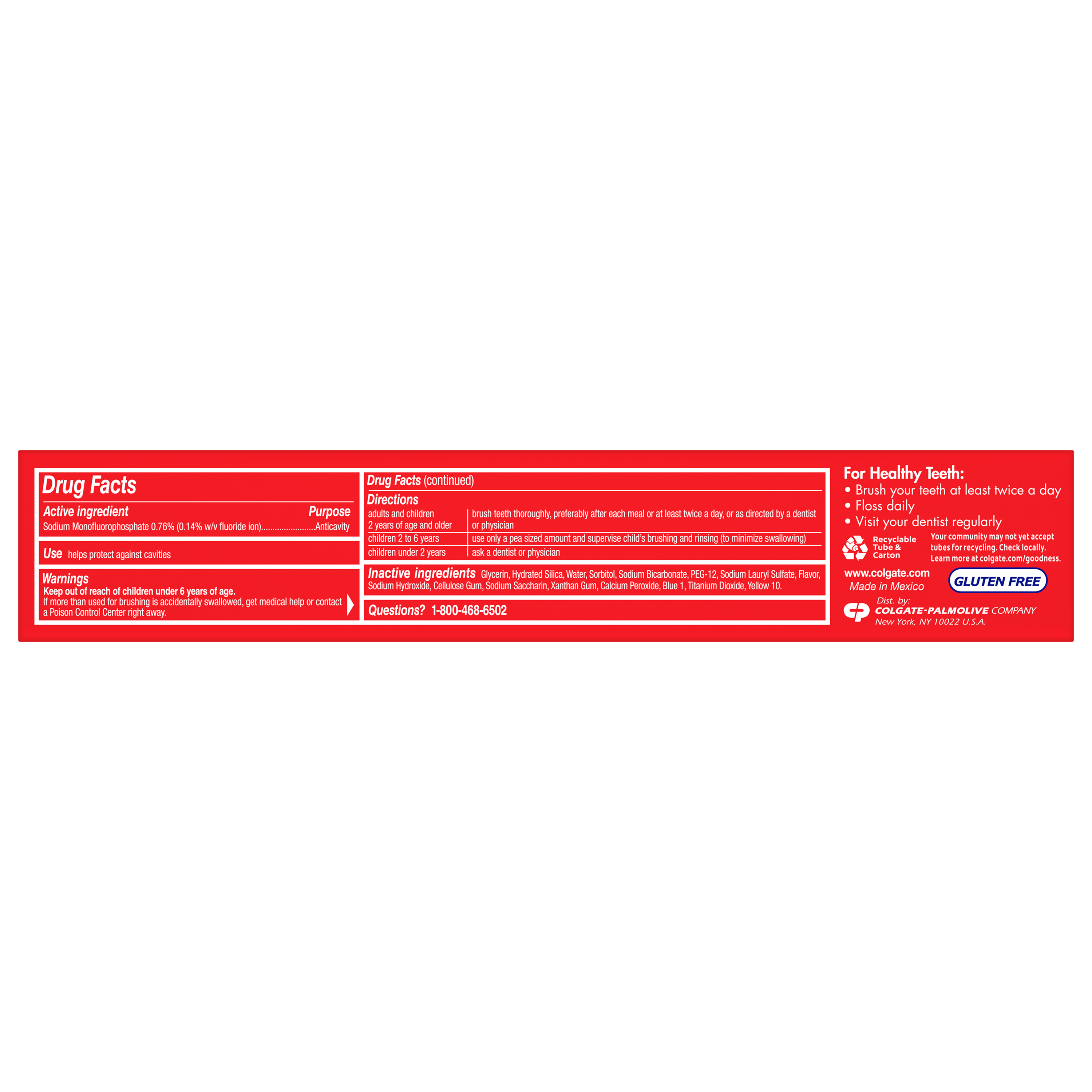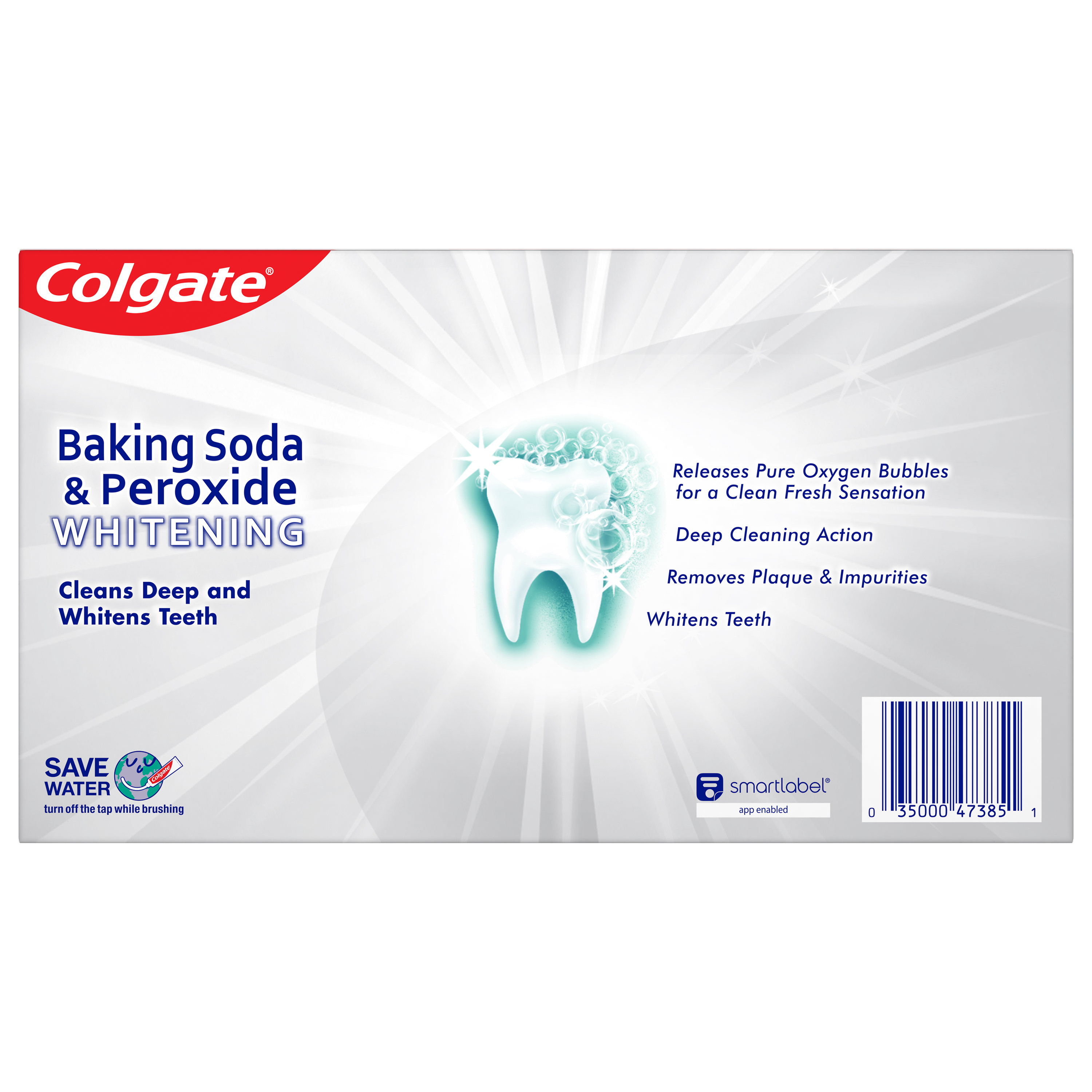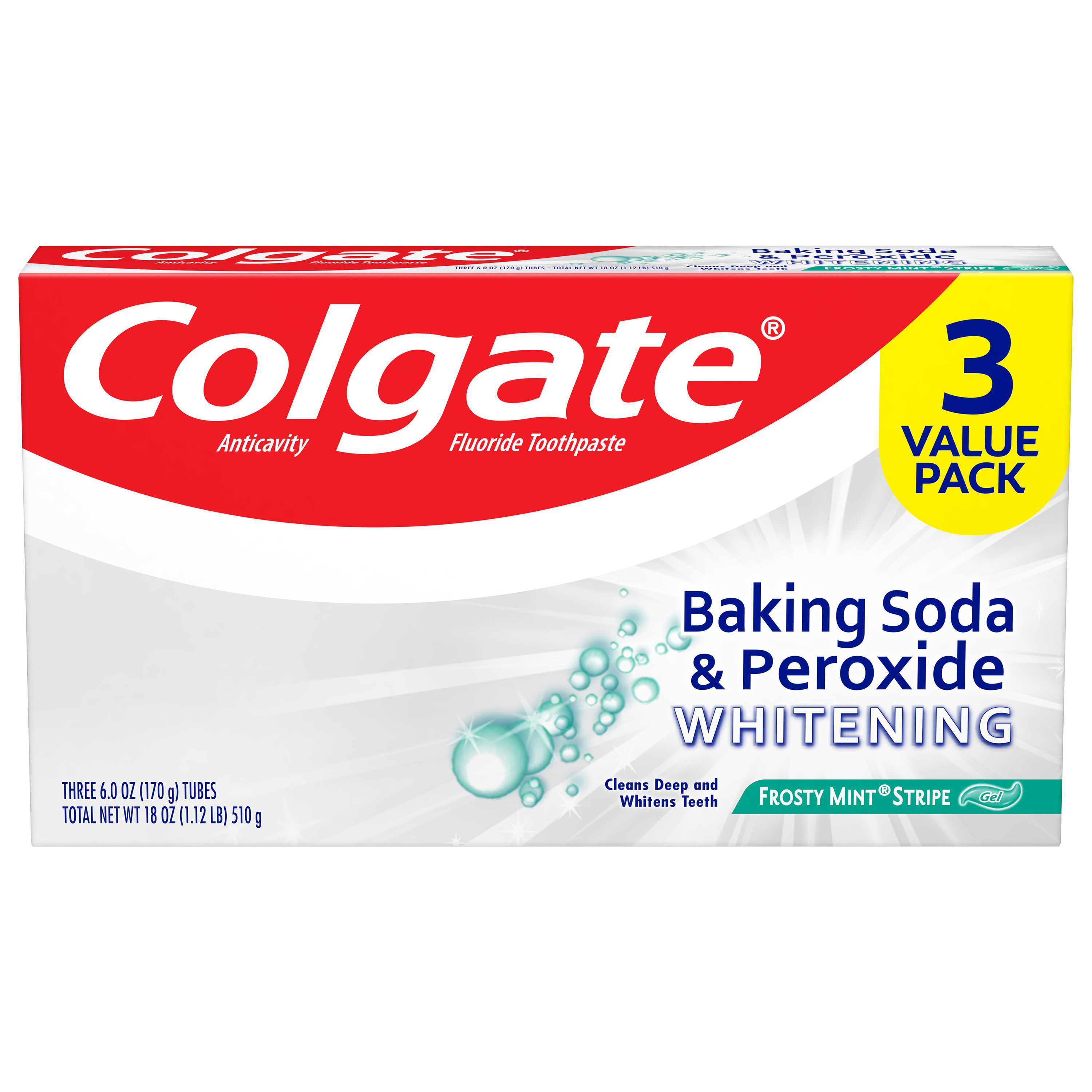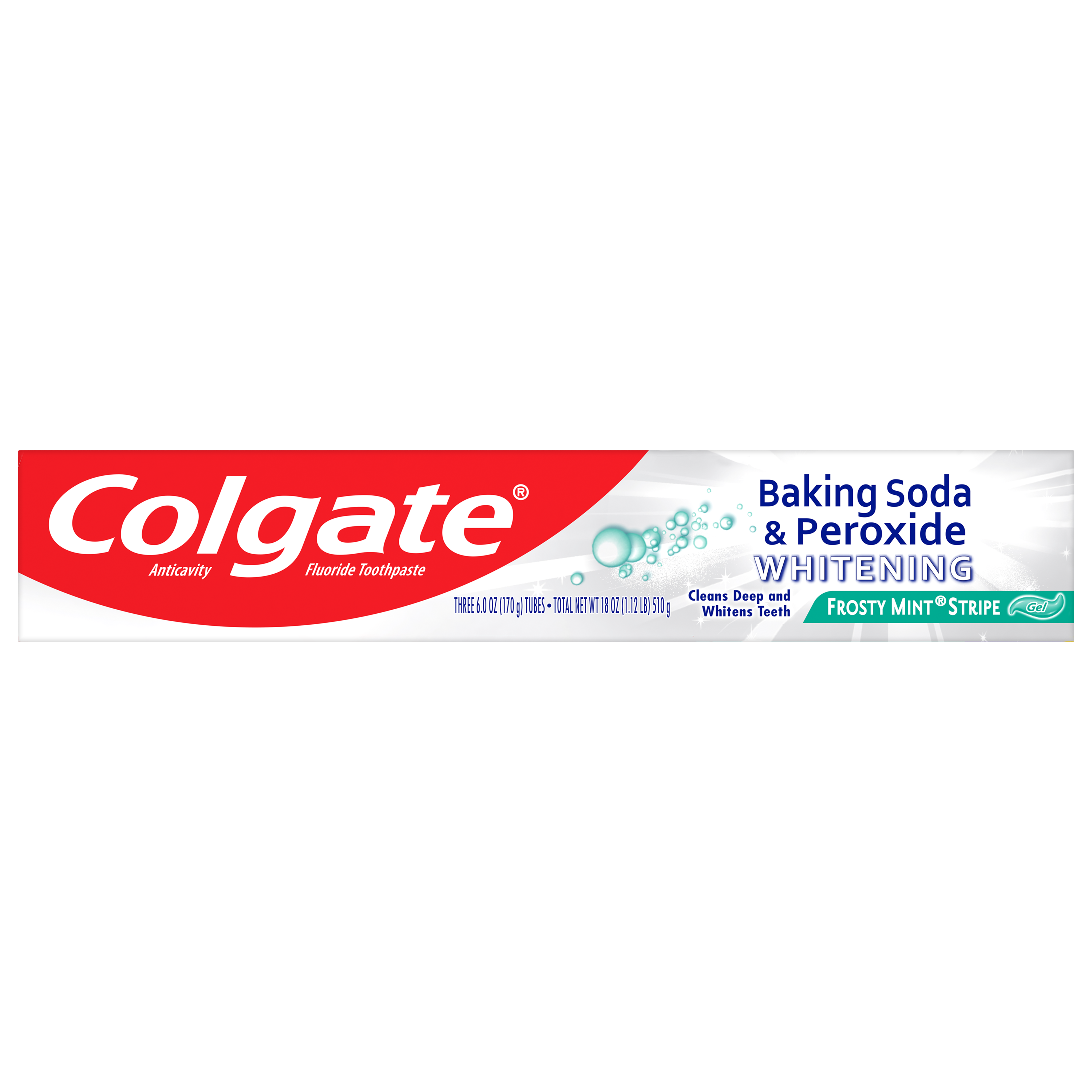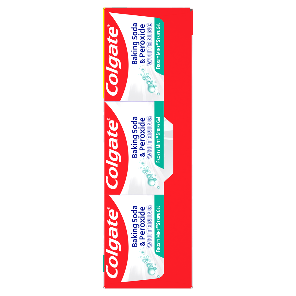 SKU US06842A Consumer Unit - GTIN 00035000473851 Case - GTIN 10035000978209 Product Category Oral Care Product Sub Category Toothpaste Product Equity (Brand) Colgate Product Sub Brand Colgate Baking Soda TP Product Title Colgate Baking Soda and Peroxide Whitening Toothpaste, Frosty Mint Stripe - 6.0 ounce (Pack of 3) Product Description Colgate Baking Soda & Peroxide Whitening Frosty Mint toothpaste refreshes and cleans for whiter teeth. This toothpaste cleans deep, preventing cavities and the build-up of tartar. Its unique formula releases pure oxygen bubbles every time you brush for a clean, fresh sensation. This baking soda and peroxide toothpaste has a frosty mint flavor that freshens breath. eCommerce Copy- Long Description Colgate Baking Soda & Peroxide Whitening Frosty Mint toothpaste refreshes and cleans for whiter teeth. This toothpaste cleans deep, preventing cavities and the build-up of tartar. Its unique formula releases pure oxygen bubbles every time you brush for a clean, fresh sensation. This baking soda and peroxide toothpaste has a frosty mint flavor that freshens breath. Bullet 1 Whitening toothpaste releases pure oxygen bubbles for a clean fresh sensation Bullet 2 Helps remove teeth stains Bullet 3 Cleans deep and whitens teeth Bullet 4 Fights cavities Bullet 5 Removes plaque and impurities Bullet 6 Long lasting cooling effect Active Ingredients Sodium Monofluorophosphate 0.76% (0.14% w/v fluoride ion) Walmart RPC 372100158 Walmart URL (Computed) https://www.walmart.com/ip/a/372100158 Target RPC 79835179 Target URL https://www.target.com/p/a/-/A-79835179 Family Dollar RPC 902966