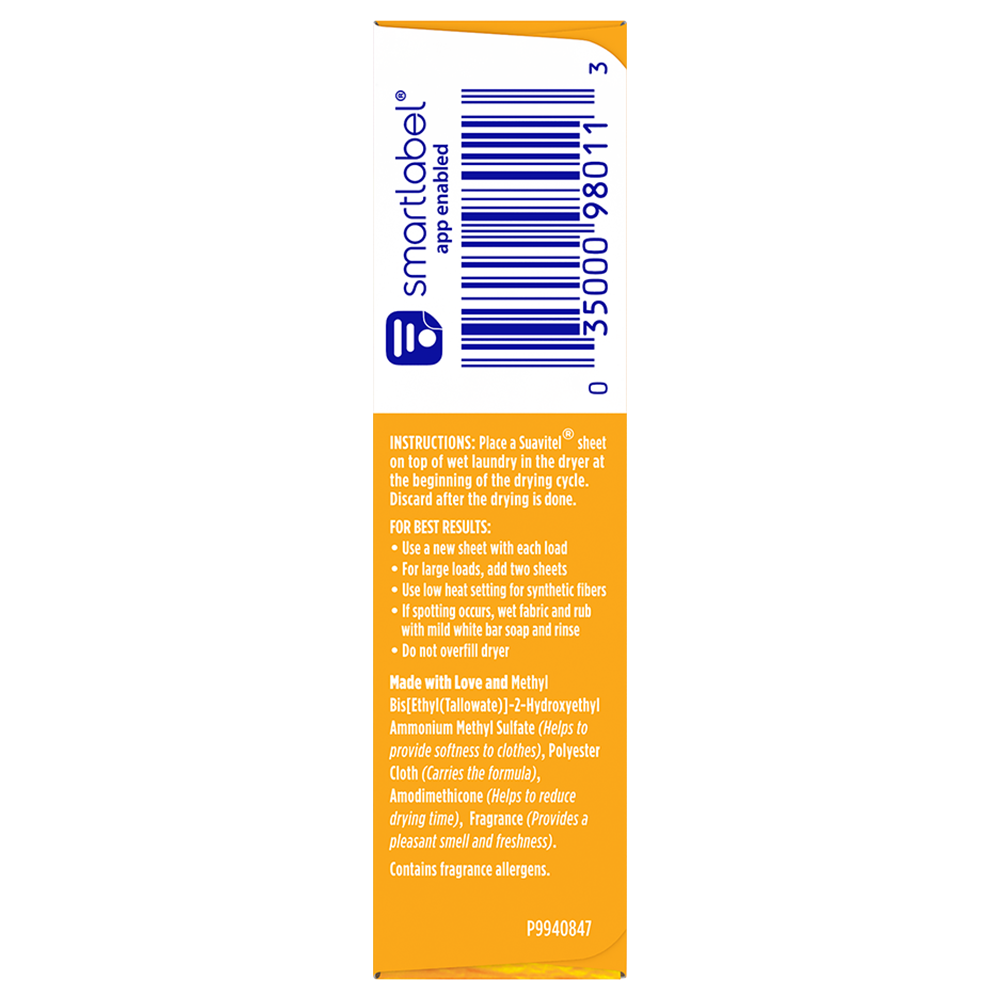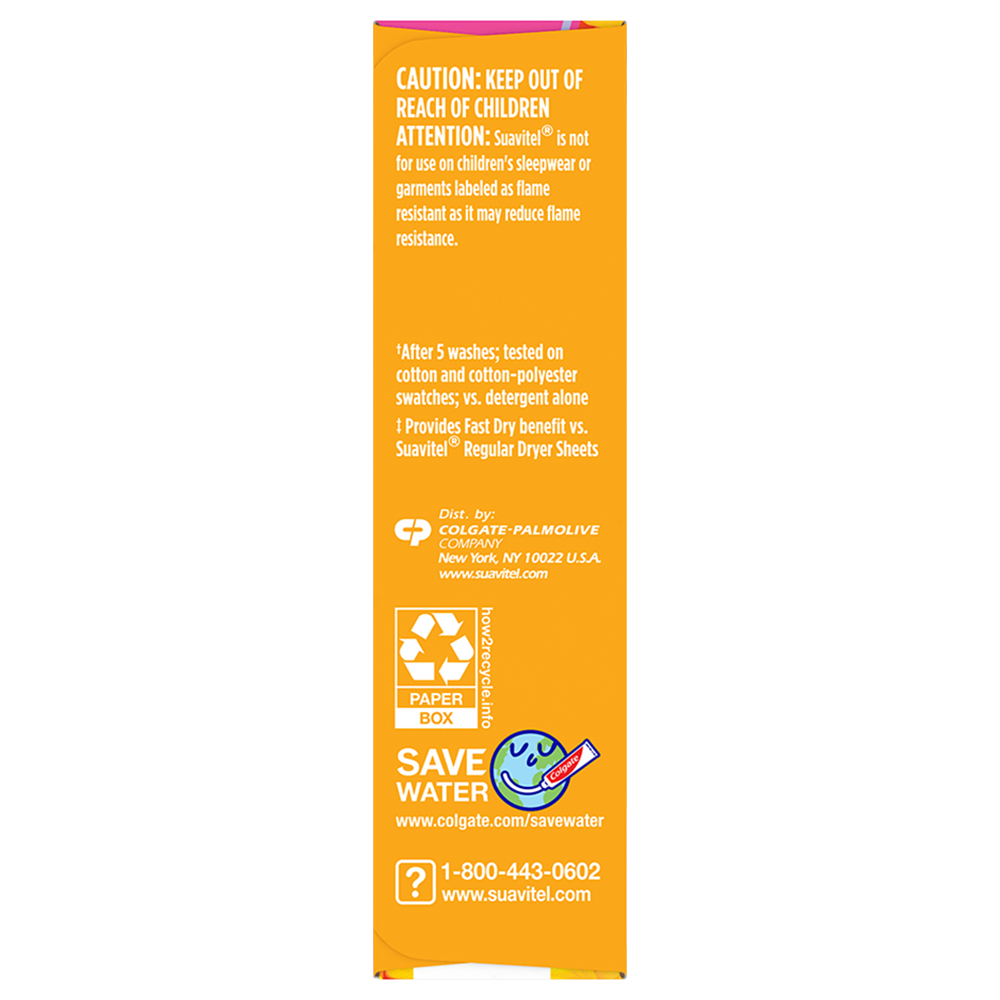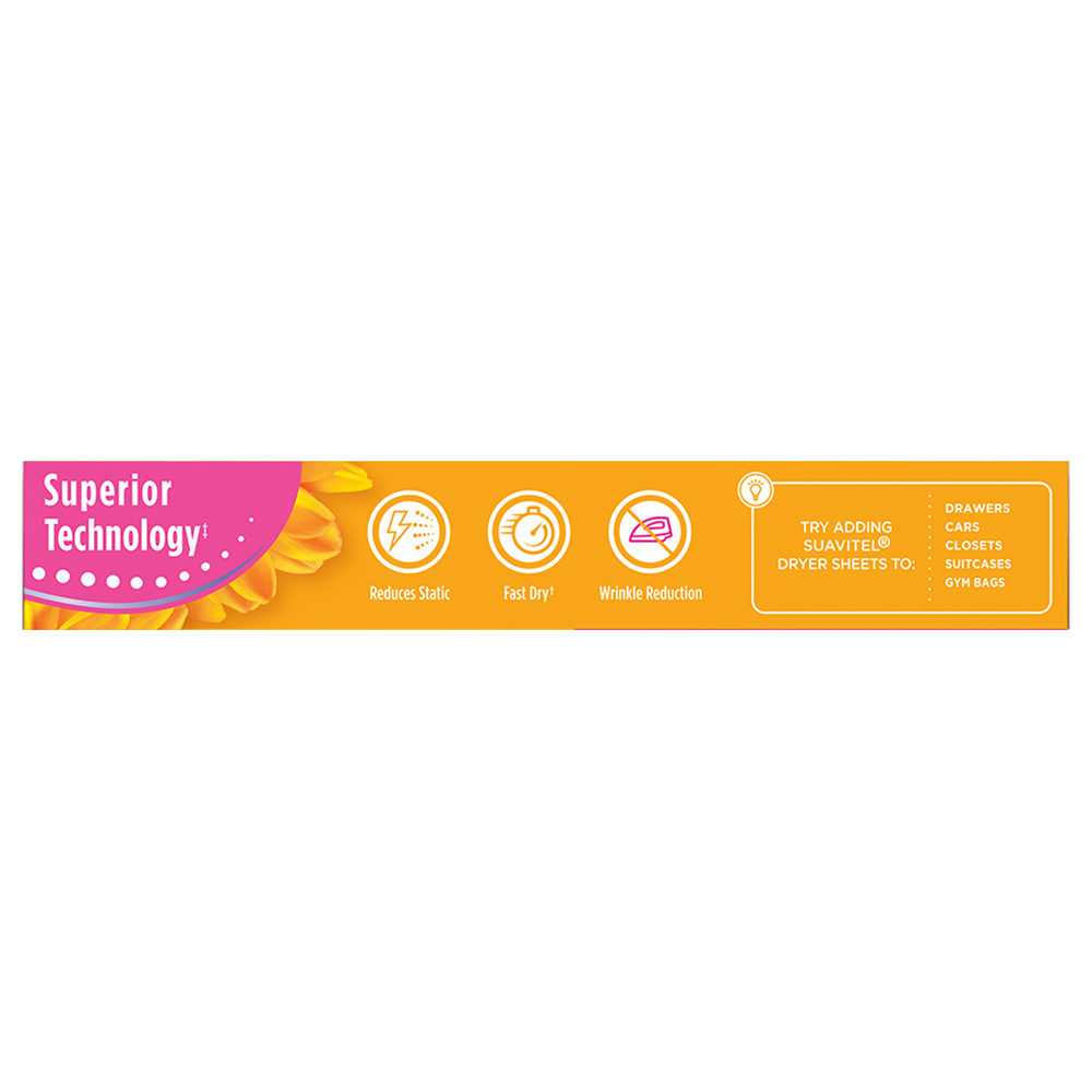 SKU US06946A Consumer Unit - GTIN 00035000980113 Case - GTIN 10035000980110 Product Category Home Care Product Sub Category FC Sheets Product Equity (Brand) Suavitel Product Sub Brand Suavitel Cmplt Sheets FC Product Title Suavitel Complete Dryer Sheets, Fabric Conditioner, Morning Sun Scent, 18 Sheets Product Description Discover the power of superior technology (1) with Suavitel Complete Morning Sun Fabric Softener Dryer Sheets. Engineered to streamline your laundry experience, these fabric softener sheets offer a remarkable Fast Dry (2) technology, allowing your clothes to dry quicker compared to regular dryer sheets. Effectively reduces static and provides wrinkle reduction, ensuring a smooth finish for your clothes. Enjoy the light, fresh scent of a bright summer morning with every wash and revel in the softness that Suavitel fabric softener provides to your clothes and linens. But why stop at laundry? Extend the fresh, Morning Sun scent to other areas of your life by placing Suavitel dryer sheets in dresser drawers, closets, suitcases, and gym bags. Appreciate the irresistibly fresh scent and the exceptional care that Suavitel brings to your clothes, making freshness easier and more delightful than ever for you and your family. (1) Provides Fast Dry benefit vs. Suavitel Regular Dryer Sheets (2) after 5 washes; tested on cotton and cotton-polyester swatches; vs. detergent alone eCommerce Copy- Long Description Suavitel Complete Morning Sun Fabric Softener Dryer Sheets have superior technology* that reduces static and wrinkles, and provides Fast Dry benefits** – all while delivering irresistible softening and freshness that you and your family will love. Try placing them in dresser drawers, closets, suitcases, gym bags – even in your car – to keep the feeling of warm summer sunshine with you wherever you go. And for even better laundry results, pair Suavitel Complete Morning Sun Dryer Sheets with Suavitel Complete Morning Sun Liquid Fabric Conditioner, which helps keep clothes looking newer longer**! *Provides Fast Dry benefit vs. Suavitel Regular Dryer Sheets **After 5 washes; tested on cotton and cotton polyester fabric; vs. detergent alone Bullet 1 One 18 count box of Suavitel Complete Dryer Sheets, Fabric Conditioner, Morning Sun Scent Bullet 2 Enhanced with 25% more softening ingredients than Suavitel Ultra for superior fabric care Bullet 3 Offers 3-in-1 softening care: increases silkiness, fluffiness, and comfort in every wash Bullet 4 This laundry softener effectively reduces static and provides wrinkle reduction, ensuring a smooth finish for your garments Bullet 5 Enjoy the light, fresh scent of a bright summer morning with every wash and revel in the softness that Suavitel fabric softener provides to your clothes and linens Bullet 6 Economical choice with enough liquid for 235 loads Bullet 7 Making freshness easier and more delightful than ever for you and your family Amazon RPC B0C35D8KQH AMZ URL https://www.amazon.com/dp/B0C35D8KQH CVS RPC 259875 Dollar Tree RPC 240571 Family Dollar RPC 1401810
