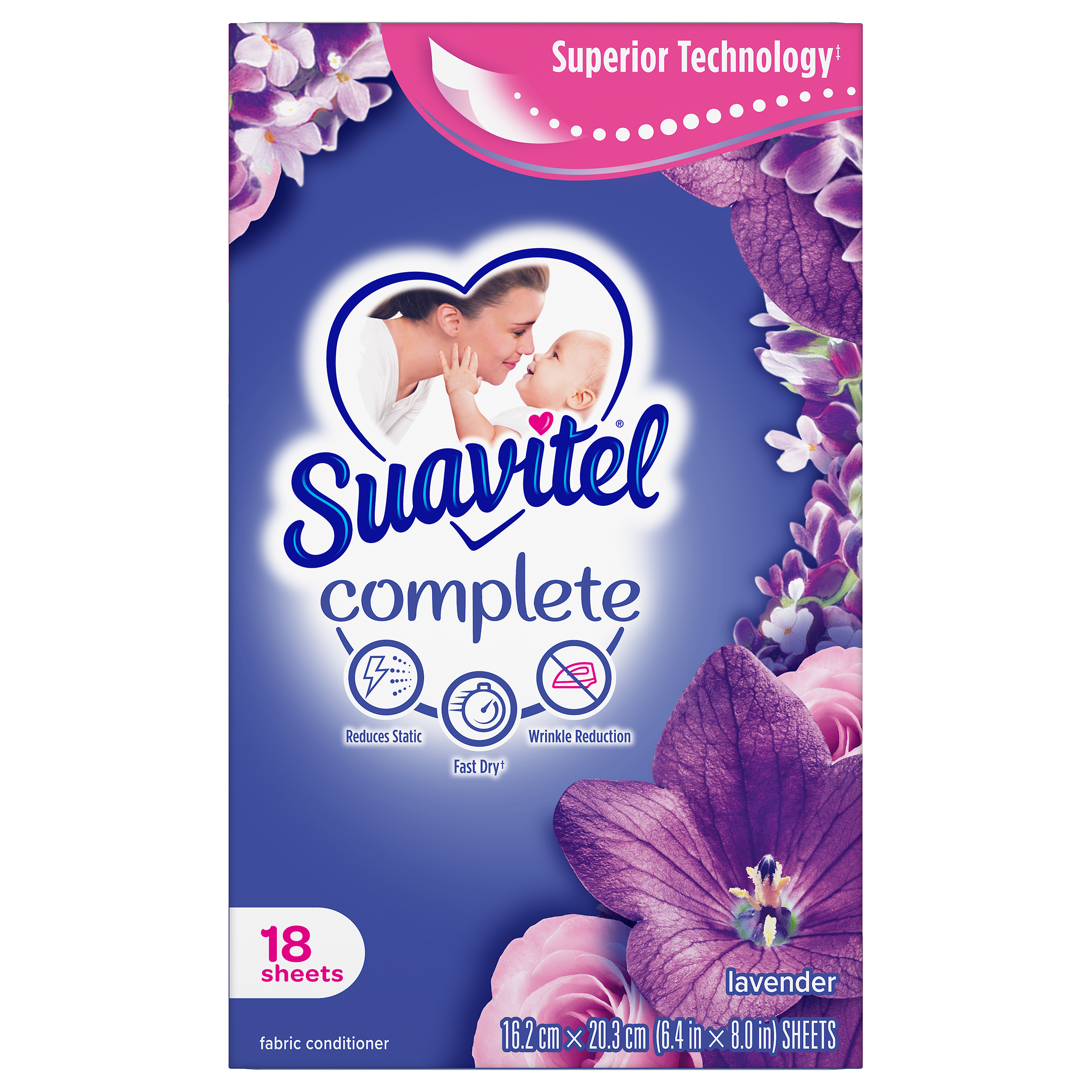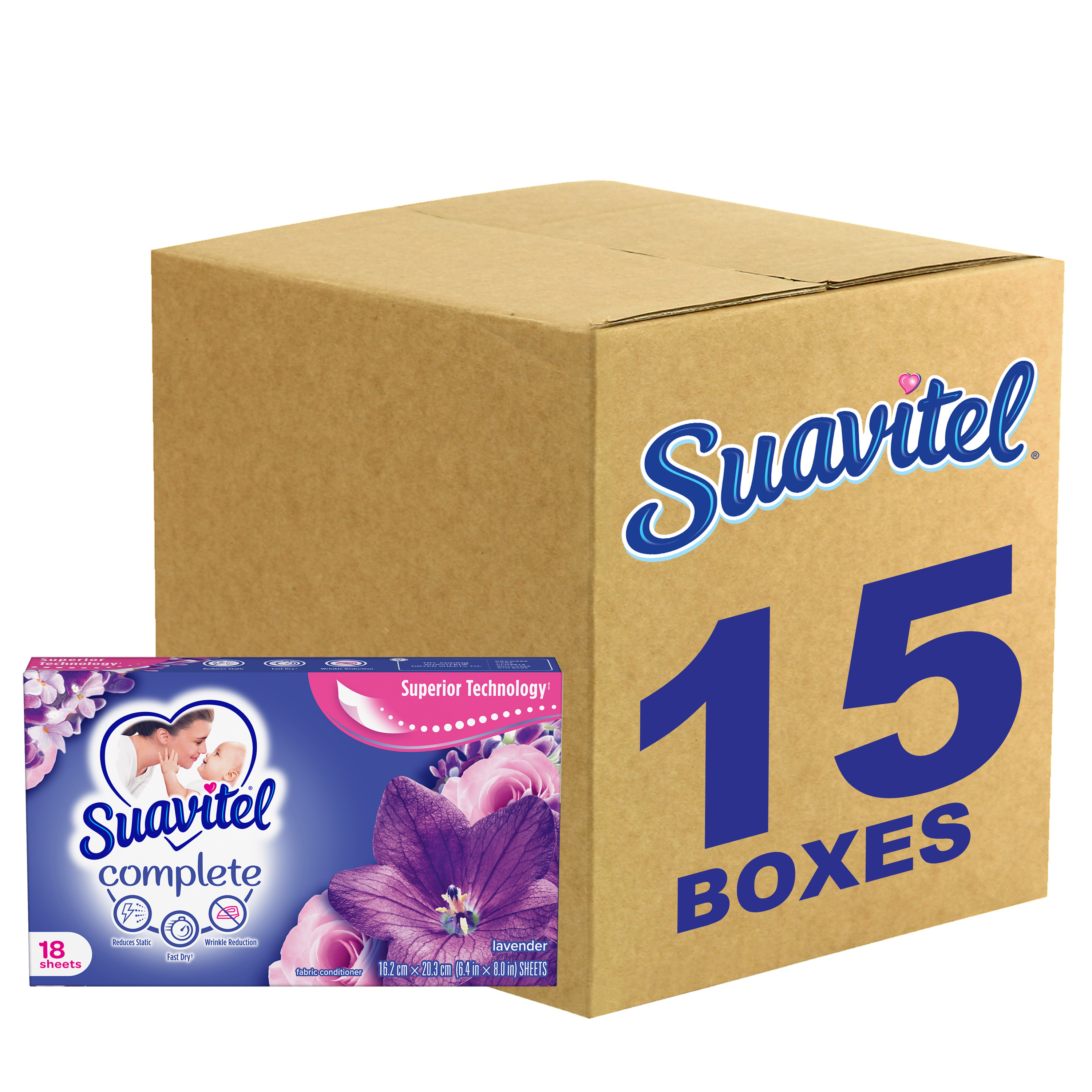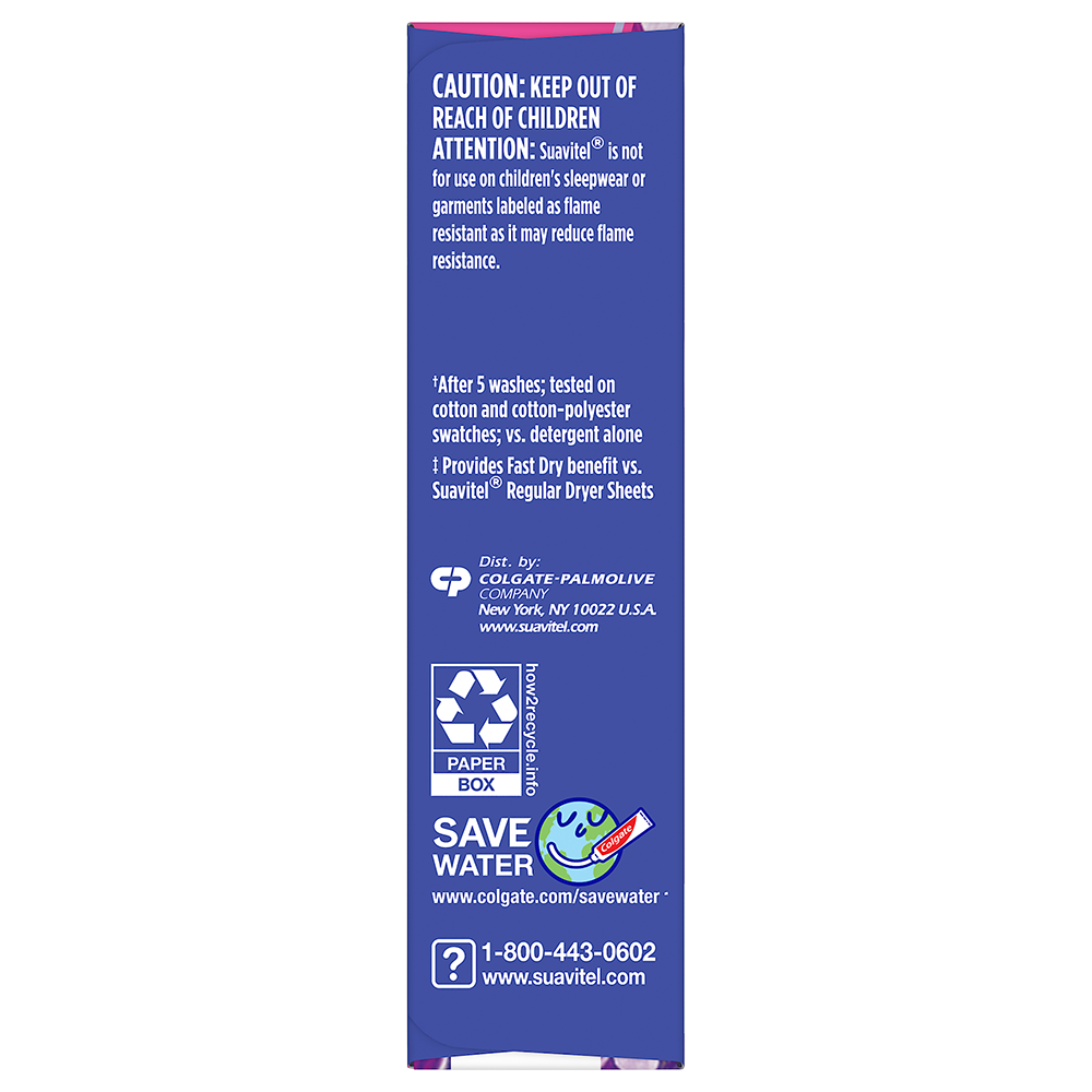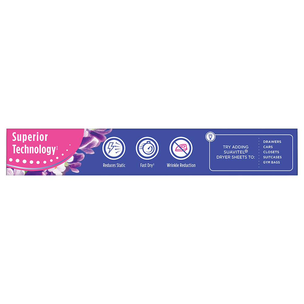SKU US06966A Consumer Unit - GTIN 00035000980311 Case - GTIN 10035000980318 Product Category Home Care Product Sub Category FC Sheets Product Equity (Brand) Suavitel Product Sub Brand Suavitel Cmplt Sheets FC Product Title Suavitel Complete Dryer Sheets, Fabric Conditioner, Lavender Scent, 18 Sheets Product Description Discover the power of superior technology (1) with Suavitel Complete Fabric Softener Dryer Sheets. Engineered to streamline your laundry experience, these clothes softener dryer sheets offer a remarkable Fast Dry (2) technology, allowing your clothes to dry quicker compared to regular dryer sheets. Effectively reduces static and provides wrinkle reduction, ensuring a smooth finish for your clothes. Enjoy the added bonus of enduring crisp floral freshness and exceptional softness, transforming your everyday laundry into a delightful experience. But why stop at laundry? Extend the fresh, Lavender scent to other areas of your life by placing Suavitel dryer sheets in dresser drawers, closets, suitcases, and gym bags. Enjoy the irresistibly fresh scent and the exceptional care that Suavitel brings to your clothes, making freshness easier and more delightful than ever for you and your family. (1) Provides Fast Dry benefit vs. Suavitel Regular Dryer Sheets (2) after 5 washes; tested on cotton and cotton-polyester swatches; vs. detergent alone eCommerce Copy- Long Description Suavitel Complete Lavender Fabric Softener Dryer Sheets have superior technology* that reduces static and wrinkles, and provides Fast Dry benefits** – all while delivering irresistible softening and freshness that you and your family will love. Try placing them in dresser drawers, closets, suitcases, gym bags – even in your car – to keep the lavender scent with you wherever you go. And for even better laundry results, pair Suavitel Complete Lavender Dryer Sheets with Suavitel Complete Soothing Lavender Liquid Fabric Conditioner, which helps keep clothes looking newer longer**! *Provides Fast Dry benefit vs. Suavitel Regular Dryer Sheets **After 5 washes; tested on cotton and cotton polyester fabric; vs. detergent alone 50 Years of Loving Softness, Freshness & Care For decades, people have chosen Suavitel for the way it makes their laundry smell and feel - but also for how it makes them feel at home. Suavitel is more than just the sum of its parts: it’s unconditional love, bottled. Today, our fabric conditioners are accessible and affordable, responsibly made,* and are safe for all washing machines. As a brand, we care about more than your clothes - we are committed to helping you care for what you love most and helping you give your family a loving touch that lasts. *To learn more, visit www.colgatepalmolive.com/responsibly-made Bullet 1 One 18 count box of Suavitel Complete Dryer Sheets, Fabric Conditioner, Lavender Scent Bullet 2 Enhanced with 25% more softening ingredients than Suavitel Ultra for superior fabric care Bullet 3 Offers 3-in-1 softening care: increases silkiness, fluffiness, and comfort in every wash Bullet 4 This laundry softener effectively reduces static and provides wrinkle reduction, ensuring a smooth finish for your linens Bullet 5 Wrap yourself in the long-lasting burst of lavender fragrance and a creamy blend of sweet fruits, and soft floral notes Bullet 6 Economical choice with enough liquid for 235 loads Bullet 7 Making freshness easier and more delightful than ever for you and your family with this addition to your laundry supplies Amazon RPC B0C356Y75G AMZ URL https://www.amazon.com/dp/B0C356Y75G CVS RPC 108454 Dollar Tree RPC 264342 Family Dollar RPC 1401811