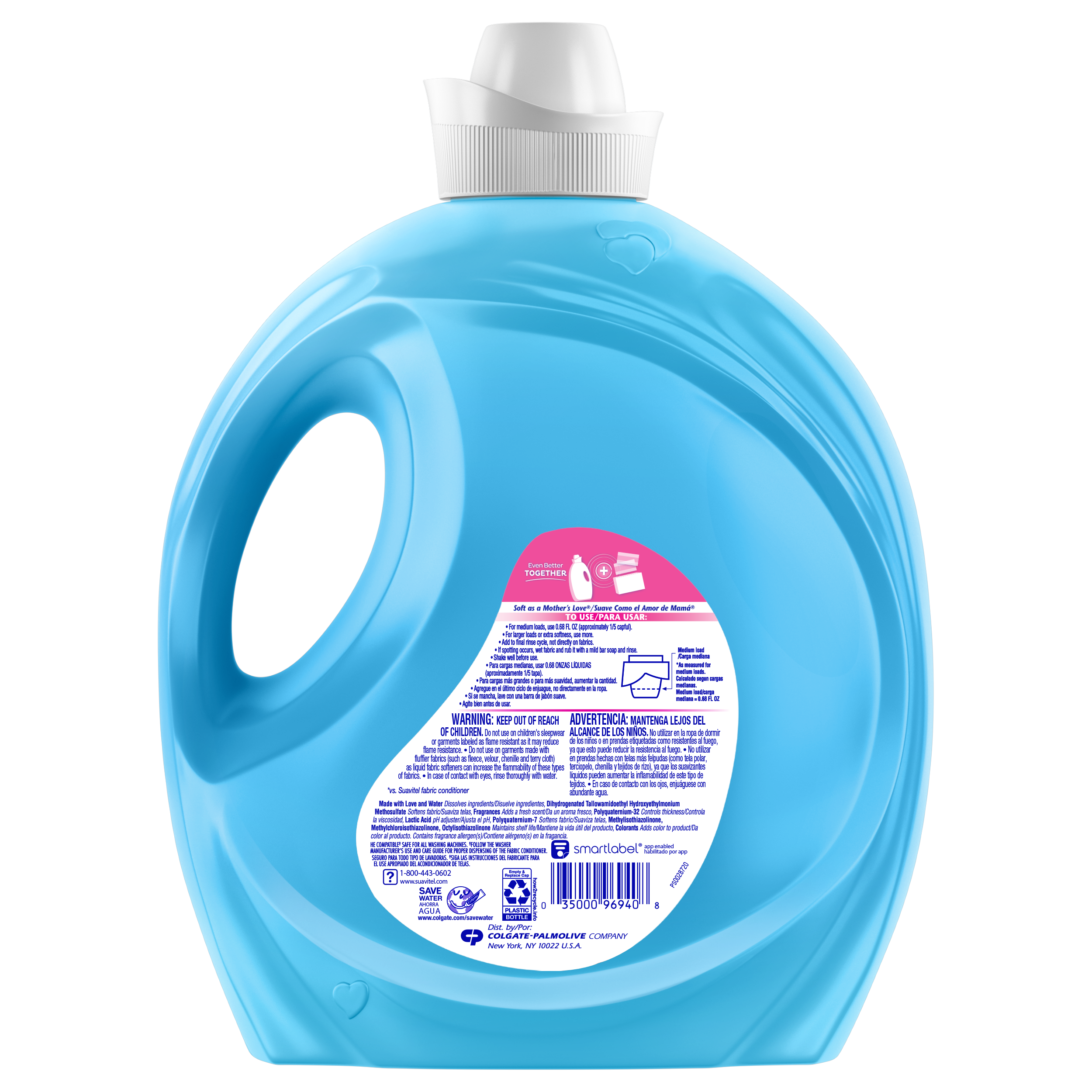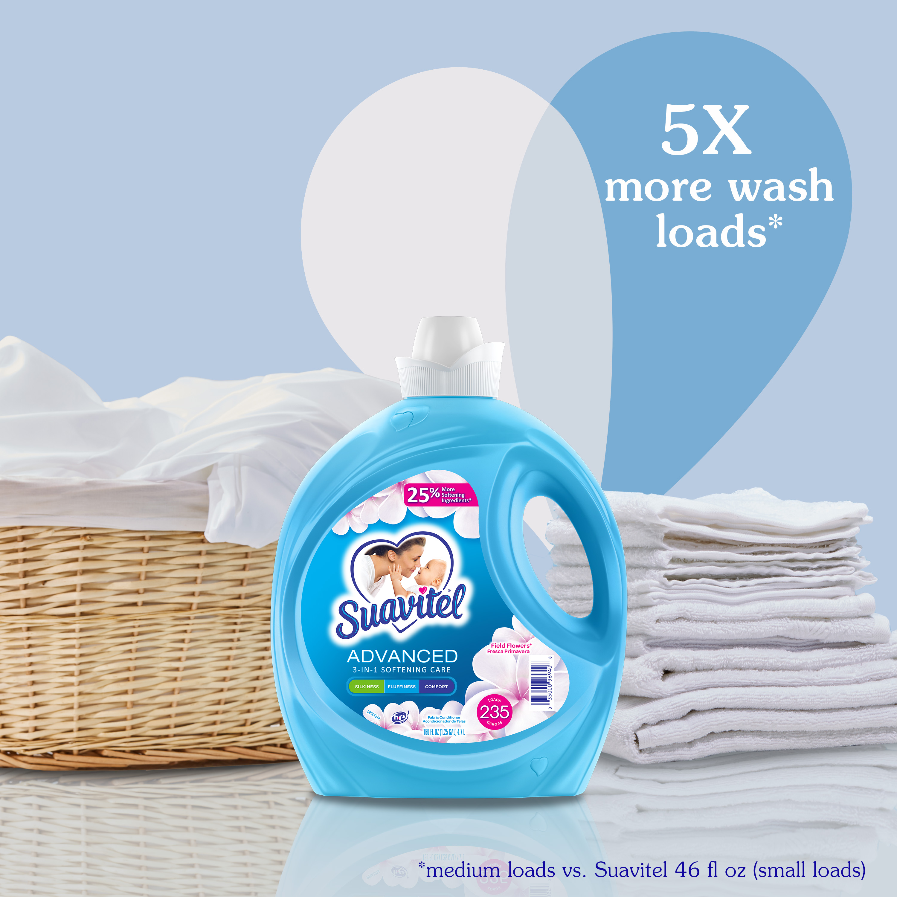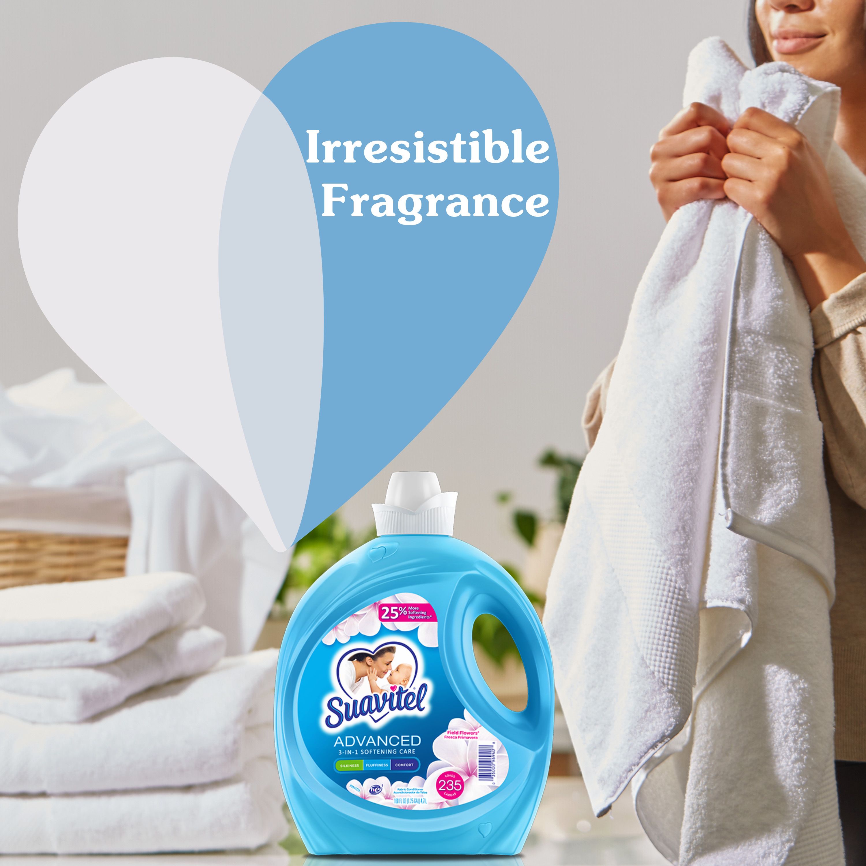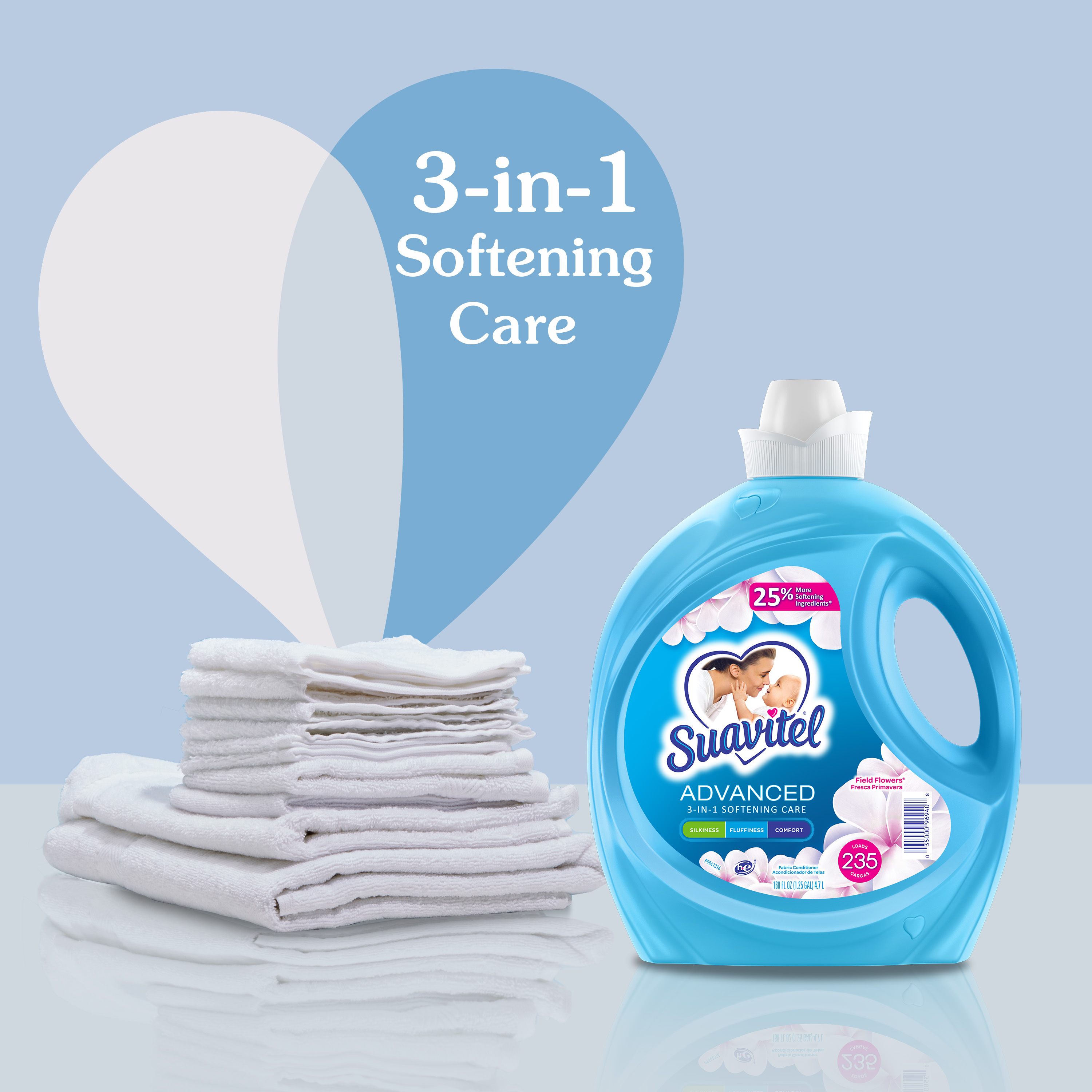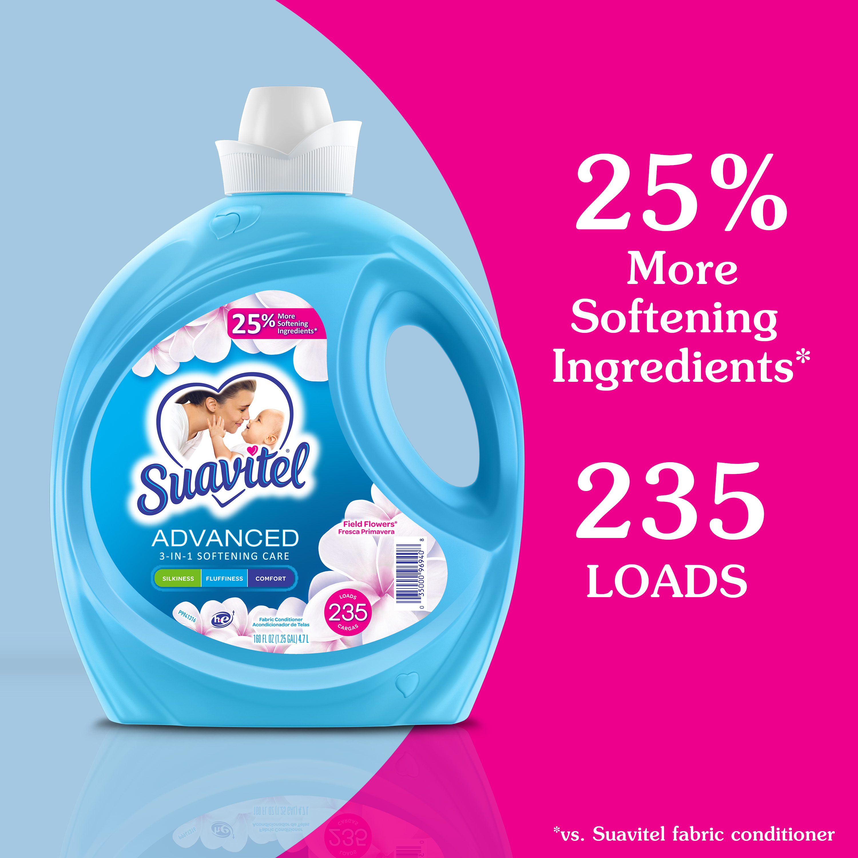 SKU US07032A Consumer Unit - GTIN 00035000999993 Product Category Home Care Product Sub Category FC Liquids Product Equity (Brand) Suavitel Product Sub Brand Suavitel Liq FC Product Title Suavitel Advanced Liquid Fabric Softener, Field Flowers Scent, 160 fl oz Bottle Product Description Experience advanced fabric care with Suavitel Advanced Liquid Fabric Softener. Our enhanced formula with 25% more softening ingredients (1) compared to Suavitel Ultra, ensuring your linens receive the best treatment possible. Each use imparts irresistible silkiness, fluffiness, and comfort to your clothes with our 3-in-1 softening care. Delight in the crisp, clean scent of Field Flowers, an irresistible fragrance of a blossoming garden directly to your wardrobe. Enjoy 45 days of freshness with your clothes feeling and smelling wonderful for weeks. Designed for efficiency, this fabric softener is HE compatible and works with both regular and high-efficiency washing machines, making it a versatile choice for all your laundry needs. With enough liquid for 235 loads, Suavitel Advanced ensures your laundry will always come out irresistibly soft and fresh. (1) vs. Suavitel Ultra eCommerce Copy- Long Description The Suavitel® Advanced Fabric Softener with Field Flowers fragrance brings the crisp, clean scent of a blossoming garden to every wash. The floral essence will give your clothes the special fresh scent of the outdoors that will last for weeks. This liquid fabric softener provides 3-in-1 softening care to increase the silkiness, fluffiness and comfort of your garments. There's enough liquid for 235 loads. This fabric softener is also compatible with regular and HE washing machines. Bullet 1 One 160 fl oz bottle of Suavitel Advanced Liquid Fabric Softener, Field Flowers Scent Bullet 2 Enhanced with 25% more softening ingredients than Suavitel Ultra for superior fabric care Bullet 3 Offers 3-in-1 softening care: increases silkiness, fluffiness, and comfort in every wash Bullet 4 Enjoy 45 days of freshness with your clothes feeling and smelling wonderful for weeks Bullet 5 Designed for efficiency, this fabric conditioner is HE compatible and works with both regular and high-efficiency washing machines Bullet 6 Economical choice with enough liquid for 235 loads Bullet 7 Experience the irresistible fragrance of a blossoming garden in every garment