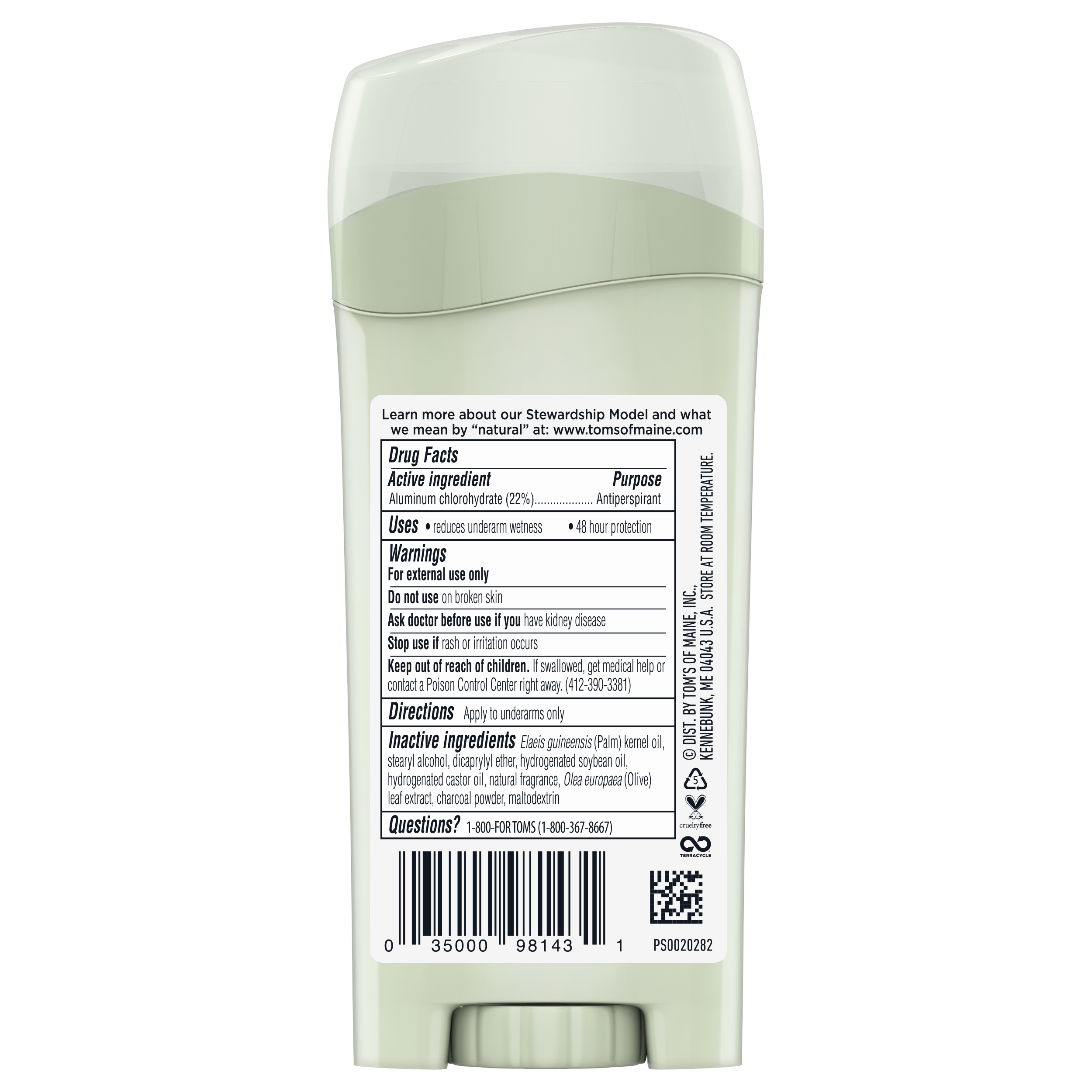 SKU US07038A Consumer Unit - GTIN 00035000981431 Case - GTIN 10035000981438 Product Category Personal Care Product Sub Category AP > Deo Product Equity (Brand) Tom's of Maine Product Sub Brand Tom's Naturally Dry AP/Deo Product Title Tom's of Maine Natural Charcoal Antiperspirant Deodorant for Women, 2.25 oz. Product Description Looking for 48 hours of odor and wetness protection? Choose Tom's of Maine Charcoal Antiperspirant for Women — an antiperspirant deodorant that keeps you feeling dry and smelling fresh. This eco-friendly deodorant stick is made with activated charcoal and a smooth, non-irritating formula that's free of petrochemicals. Plus, feel good about using an antiperspirant made with sustainably sourced aluminum* — so it leaves a smaller carbon footprint. Order Tom's of Maine deodorant and discover our range of natural personal care products. At Tom's of Maine, we want to empower families to live more naturally. With more than 5 years experience combining scientific know-how, naturally derived ingredients and a bit of ingenuity, we make products that are good for you and the planet. As a Certified B Corp, we hold ourselves to the highest social and environmental standards. Plus, we're committed to supporting local communities for meaningful change, donating 1% of our profits to charities supporting health, education and the environment. We call this "doing good, for real," and it impacts everything we do. *Made with recycled aluminum versus virgin aluminum. eCommerce Copy- Long Description Looking for 48 hours of odor and wetness protection? Choose Tom's of Maine Charcoal Antiperspirant for Women — an antiperspirant deodorant that keeps you feeling dry and smelling fresh. This eco-friendly deodorant stick is made with activated charcoal and a smooth, non-irritating formula that's free of petrochemicals. Plus, feel good about using an antiperspirant made with sustainably sourced aluminum* — so it leaves a smaller carbon footprint. Order Tom's of Maine deodorant and discover our range of natural personal care products. At Tom's of Maine, we want to empower families to live more naturally. With more than 50 years experience combining scientific know-how, naturally derived ingredients and a bit of ingenuity, we make products that are good for you and the planet. As a Certified B Corp, we hold ourselves to the highest social and environmental standards. Plus, we're committed to supporting local communities for meaningful change, donating 10% of our profits to charities supporting health, education and the environment. We call this "doing good, for real," and it impacts everything we do. *Made with recycled aluminum versus virgin aluminum. Bullet 1 WHAT YOU'LL GET: One 2.25-ounce stick of Tom's of Maine Charcoal Antiperspirant Deodorant for Women Bullet 2 48-HOUR CONFIDENCE: Swipe Tom's of Maine deodorant for 48 hours of wetness and odor protection Bullet 3 SUSTAINABLY SOURCED ALUMINUM: Made with recycled aluminum versus virgin aluminum and free of petrochemicals Bullet 4 ACTIVATED CHARCOAL: Keeps you dry and fresh all day Bullet 5 TAKE CARE OF YOURSELF NATURALLY: Contains no artificial fragrances or preservatives and is not tested on animals Active Ingredients Aluminum Chlorohydrate (22%) Walmart RPC 756971171 Walmart URL (Computed) https://www.walmart.com/ip/a/756971171