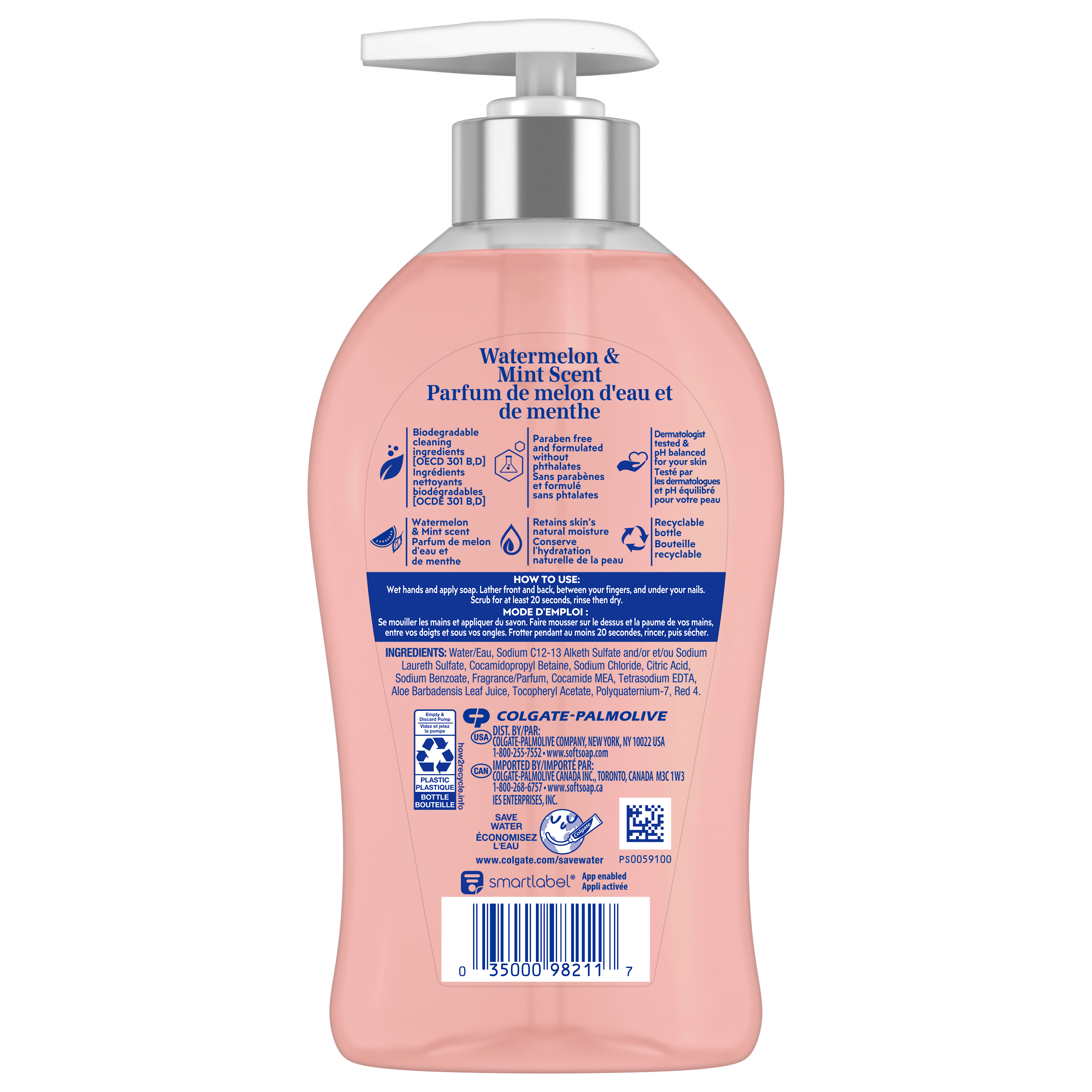 SKU US07064A Consumer Unit - GTIN 00035000982117 Case - GTIN 10035000982114 Product Category Personal Care Product Sub Category Liquid Hand Wash Product Equity (Brand) Softsoap Product Sub Brand Softsoap LHW Product Title Softsoap Moisturizing Liquid Hand Soap, Watermelon and Mint Scent, 11.25 oz Bottle Product Description From the #1 liquid hand soap brand (1) comes a deeply moisturizing hand soap with a watermelon and mint scent. With its beautiful bottle design, Softsoap’s Watermelon and Mint Scent Liquid Hand Soap perfectly complements the elegance of your bathroom or kitchen sink. This delightful hand soap, infused with a watermelon and mint fragrance, will infuse joy into the smallest moments. This scented hand soap deeply moisturizes to hydrate dry skin, all while effectively washing away bacteria for clean and fresh hands. The creamy formula hydrates dry skin, leaving your hands feeling soft and smooth. Our dermatologist tested formula retains skin’s natural moisture and is formulated without parabens and phthalates. This liquid hand soap is one you’ll want to keep on your sink to infuse every small moment with joy. (1) Based in part on data reported by Nielsen through its Market Track Service for the Liquid Hand Soap Category for the 52 week period ending 07/01/23, for the All Outlet market. Copyright © 2023 Nielsen. Bullet 1 One 11.25 oz Bottle of Softsoap Watermelon and Mint Scent Liquid Hand Soap Pump - The #1 Liquid Hand Soap Brand (1) Bullet 2 This fun pink hand soap with it's sweet and floral scent will infuse joy into the smallest moments Bullet 3 With its beautiful bottle design and modern pump head, Softsoap’s Coconut and Hibiscus Liquid Hand Soap perfectly complements the elegance of your bathroom or kitchen sink Bullet 4 The creamy formula hydrates dry skin, leaving your hands feeling soft and smooth Bullet 5 Elevate your senses while effectively washing away bacteria with this moisturizing hand soap Amazon RPC B08KKVMNWR AMZ URL https://www.amazon.com/dp/B08KKVMNWR Albertsons RPC 970067627 Albertsons URL https://www.albertsons.com/shop/product-details.970067627.html