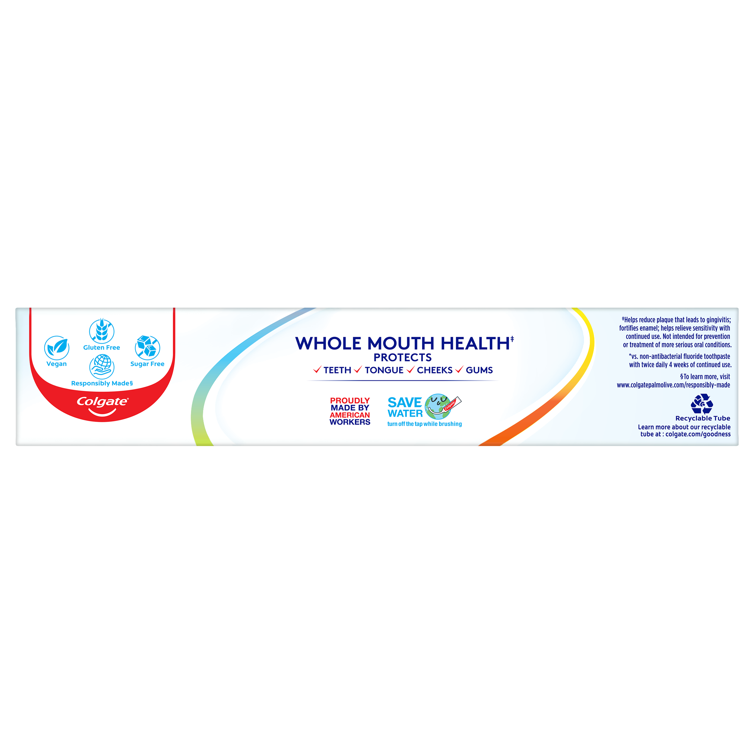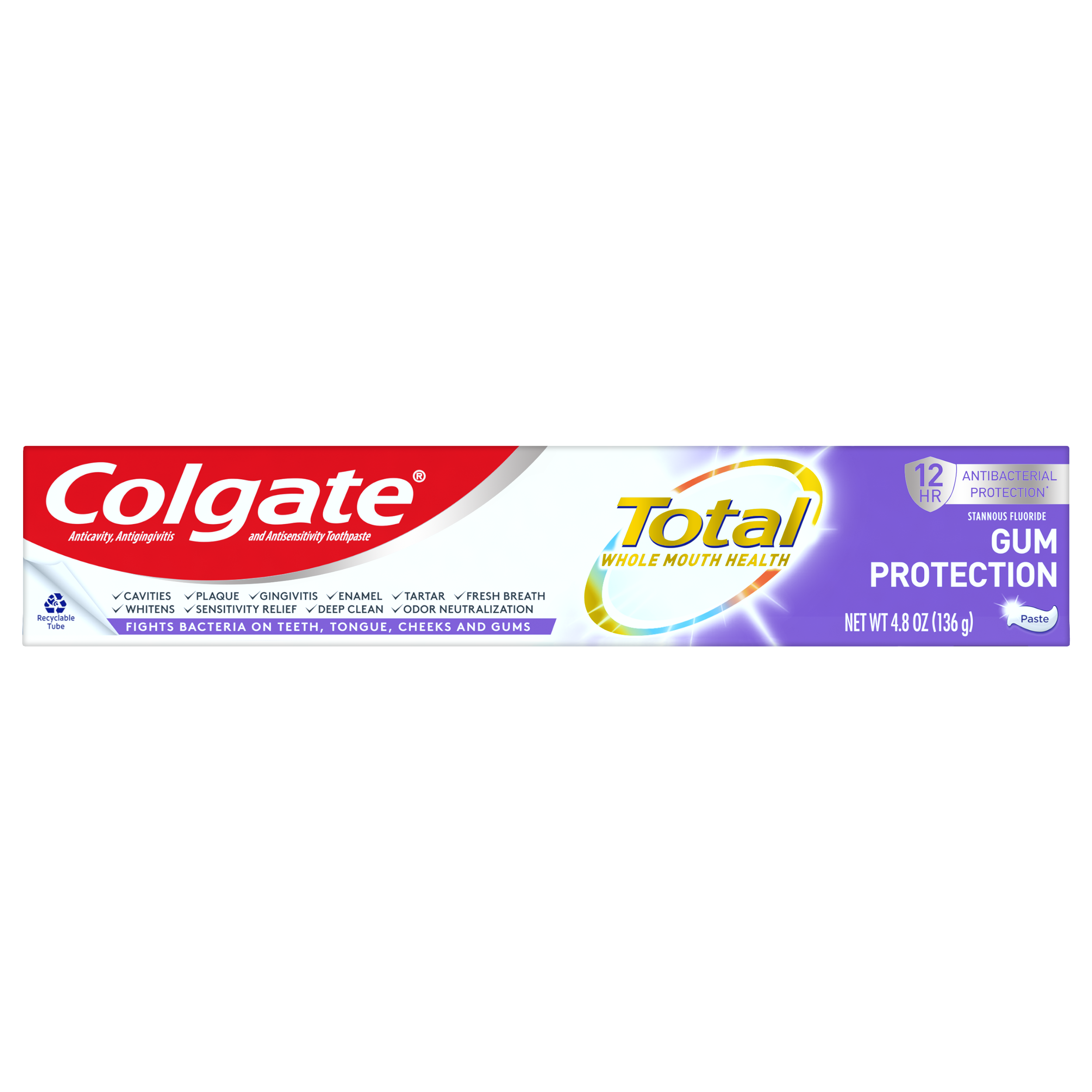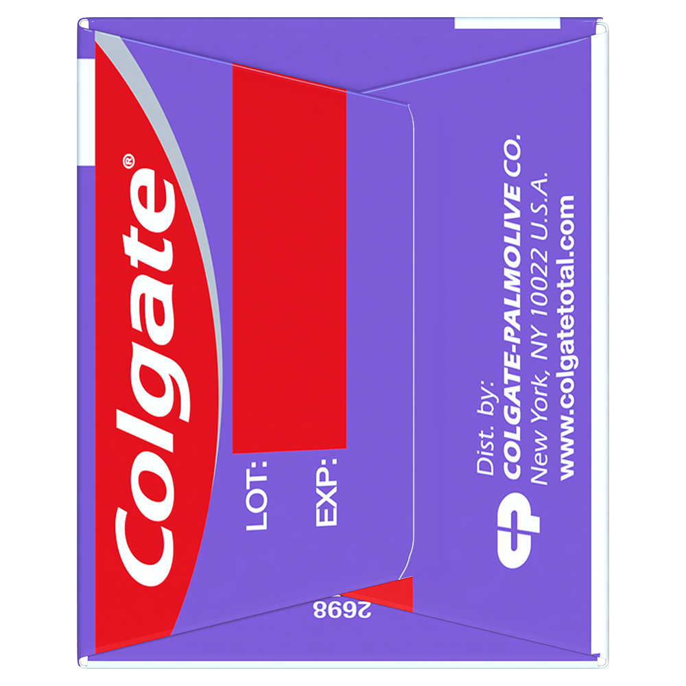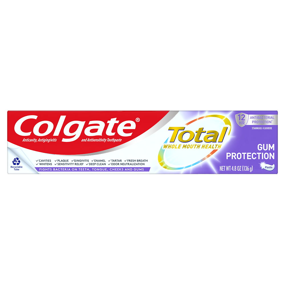 SKU US07194A Consumer Unit - GTIN 00035000984142 Case - GTIN 10035000984149 Product Category Oral Care Product Sub Category Toothpaste Product Equity (Brand) Colgate Product Sub Brand Colgate Total TP Product Title Colgate Total Gum Protection 4.8 Oz 1pk Product Description Unlike Ordinary Toothpaste, Colgate Total Gum Protection Toothpaste Fights Bacteria on Teeth, Tongue, Cheeks & Gums For Whole Mouth Health. Colgate Total Toothpaste has a breakthrough formula that fights bacteria on teeth, tongue, cheeks and gums for Whole Mouth Health. Colgate Total with stannous fluoride also offers more benefits than ever including sensitivity relief, improved enamel strength* and odor neutralization* (*based on in vitro studies). It Helps maintain healthy strong gums through antibacterial action **Adults and children 12 years of age and older: apply at least a 1-inch strip of product onto a soft bristled toothbrush. Brush teeth thoroughly for at least 1 minute twice a day (morning and evening) or as recommended by a dentist. Make sure to brush all sensitive areas of the teeth. Do not swallow. Children under 12 years of age: consult a dentist. Bullet 1 Fight Bacteria for 12 full hours* *vs non antibacterial fluoride toothpaste with twice a day brushing after 4 weeks Bullet 2 Helps to maintain healthy strong gums through antibacterial action Bullet 3 Fights Bacteria on Teeth, Tongue, Cheeks and Gums for Whole Mouth Health Bullet 4 Helps Prevent Plaque Build-Up, Tartar, Cavities & Gingivitis Bullet 5 Helps maintain healthy strong gums through antibacterial action Active Ingredients 0.454% stannous fluoride (0.15% w/v fluoride ion) Walmart RPC 629645713 Walmart URL (Computed) https://www.walmart.com/ip/a/629645713