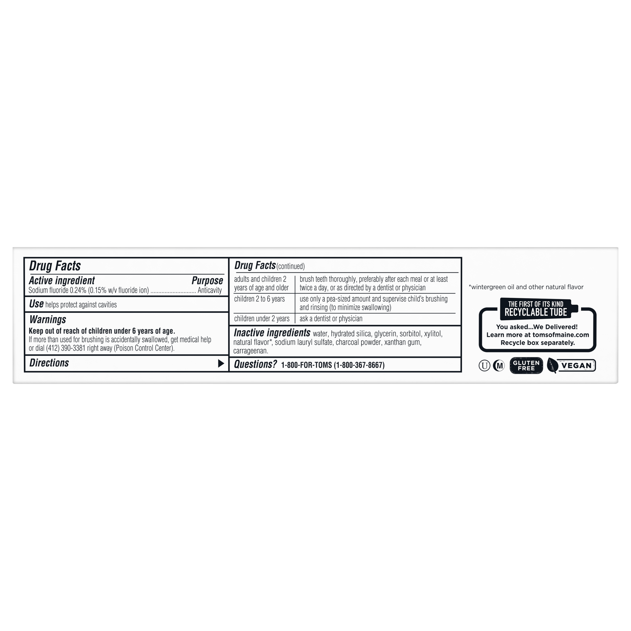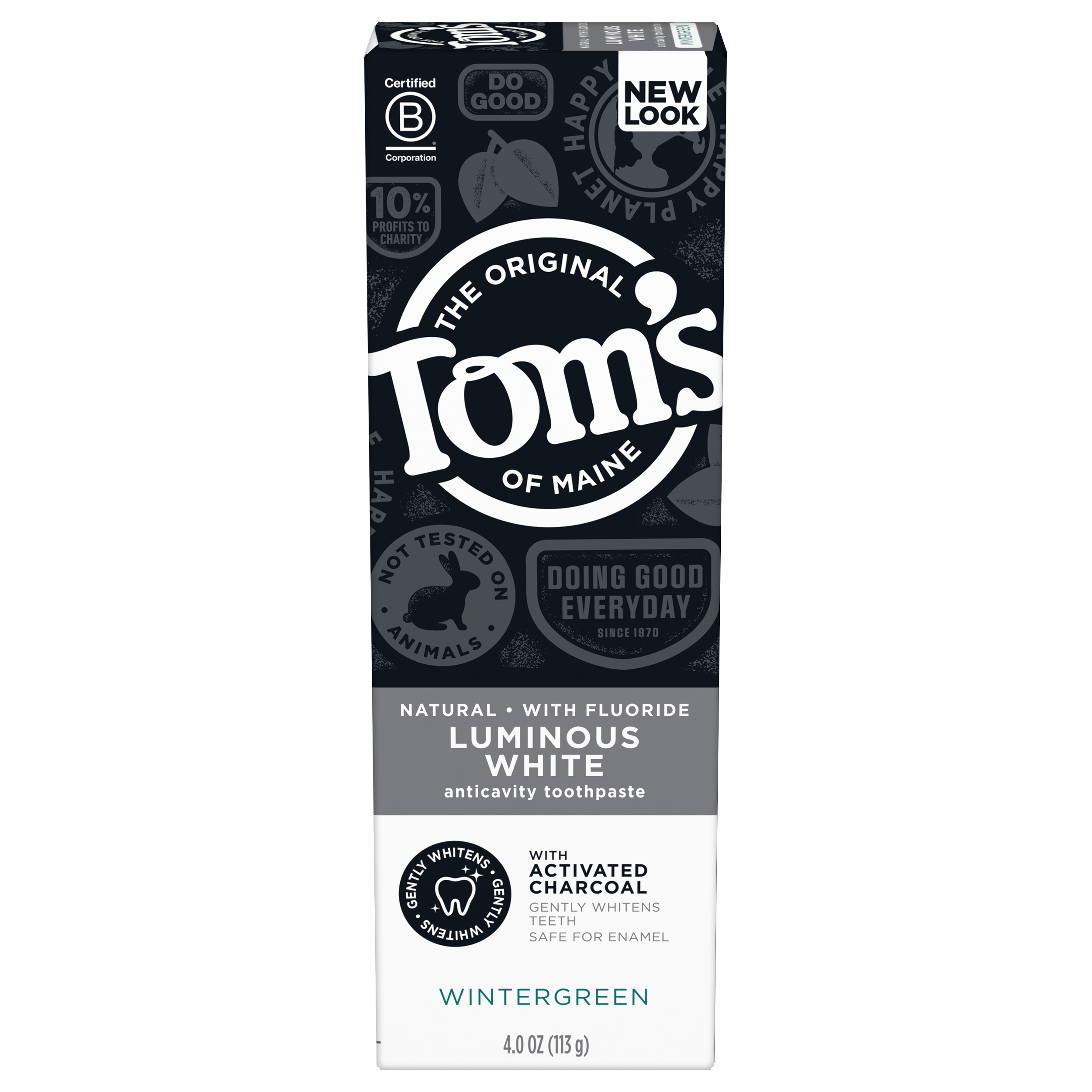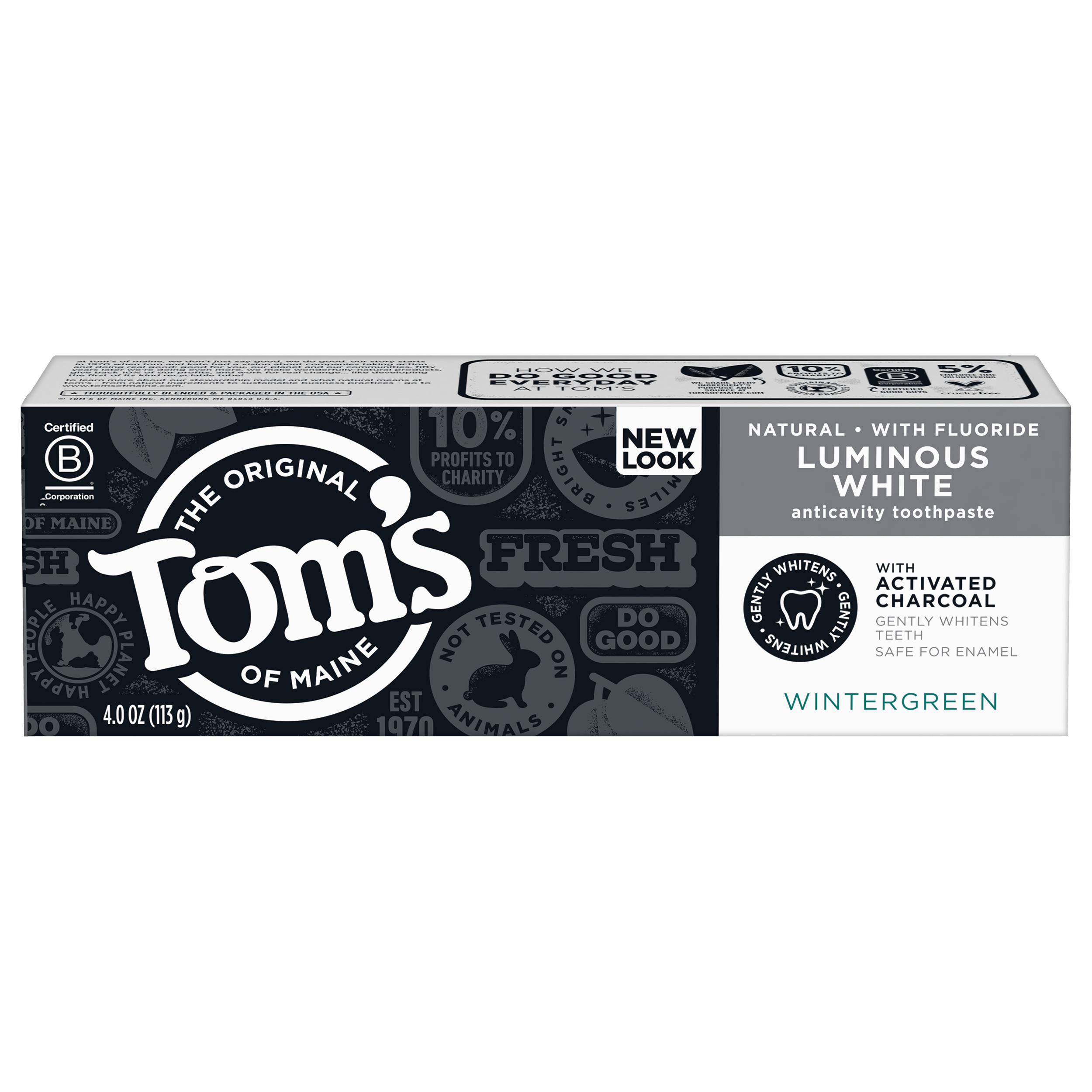 SKU US07236A Consumer Unit - GTIN 00035000984265 Case - GTIN 10035000984262 Product Category Oral Care Product Sub Category Toothpaste Product Equity (Brand) Tom's of Maine Product Sub Brand Tom's Luminous White TP Product Title Tom's of Maine Luminous White Toothpaste With Charcoal, Wintergreen, 4 oz. Product Description Find your naturally brighter and whiter smile with Tom's of Maine Luminous White Natural Toothpaste with activated charcoal. Tom's of Maine's most advanced whitening formula helps you experience whiter teeth in two weeks by removing surface stains compared to regular fluoride toothpaste. This whitening toothpaste with charcoal is gentle on enamel, fights cavities and is safe for everyday use. Plus, it's made with biodegradable or mineral-derived ingredients. Order Tom's of Maine Toothpaste, and try their other natural dental care products. Tom's of Maine products use only ingredients that meet its stewardship standards for natural, sustainable and responsible, helping empower families to live more naturally. Tom's of Maine is a Certified B Corp and meets the highest standards of social and environmental performance, as well as public transparency. The company donates 1% of profits to charities committed to children's health, education and the environment. Thank you for supporting Tom's of Maine. eCommerce Copy- Long Description Find your naturally brighter and whiter smile with Tom's of Maine Luminous White Natural Toothpaste with activated charcoal. Tom's of Maine's most advanced whitening formula helps you experience whiter teeth in two weeks by removing surface stains compared to regular fluoride toothpaste. This whitening toothpaste with charcoal is gentle on enamel, fights cavities and is safe for everyday use. Plus, it's made with biodegradable or mineral-derived ingredients. Order Tom's of Maine Toothpaste, and try their other natural dental care products. Tom's of Maine products use only ingredients that meet its stewardship standards for natural, sustainable and responsible, helping empower families to live more naturally. Tom's of Maine is a Certified B Corp and meets the highest standards of social and environmental performance, as well as public transparency. The company donates 10% of profits to charities committed to children's health, education and the environment. Thank you for supporting Tom's of Maine. Bullet 1 WHAT YOU'LL GET: One 4-ounce tube of Tom's of Maine Luminous White Charcoal Toothpaste in Wintergreen Flavor Bullet 2 WHITENING TOOTHPASTE: Clinically proven to whiten teeth by removing surface stains Bullet 3 ACTIVATED CHARCOAL: Natural whitening toothpaste with charcoal is safe on enamel for everyday use Bullet 4 CAVITY PROTECTION: Fluoride toothpaste helps prevent cavities and strengthen enamel Bullet 5 RECYCLABLE TUBE: Once empty, replace cap and recycle with #2 plastics Active Ingredients Sodium fluoride 0.24% (0.15% w / v fluoride ion)