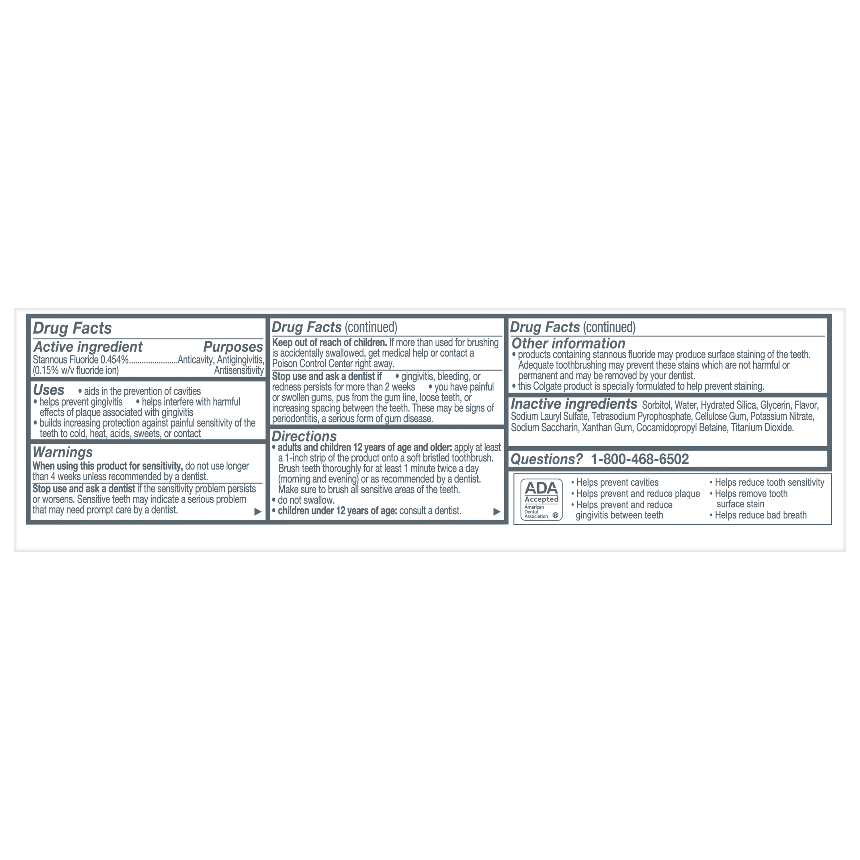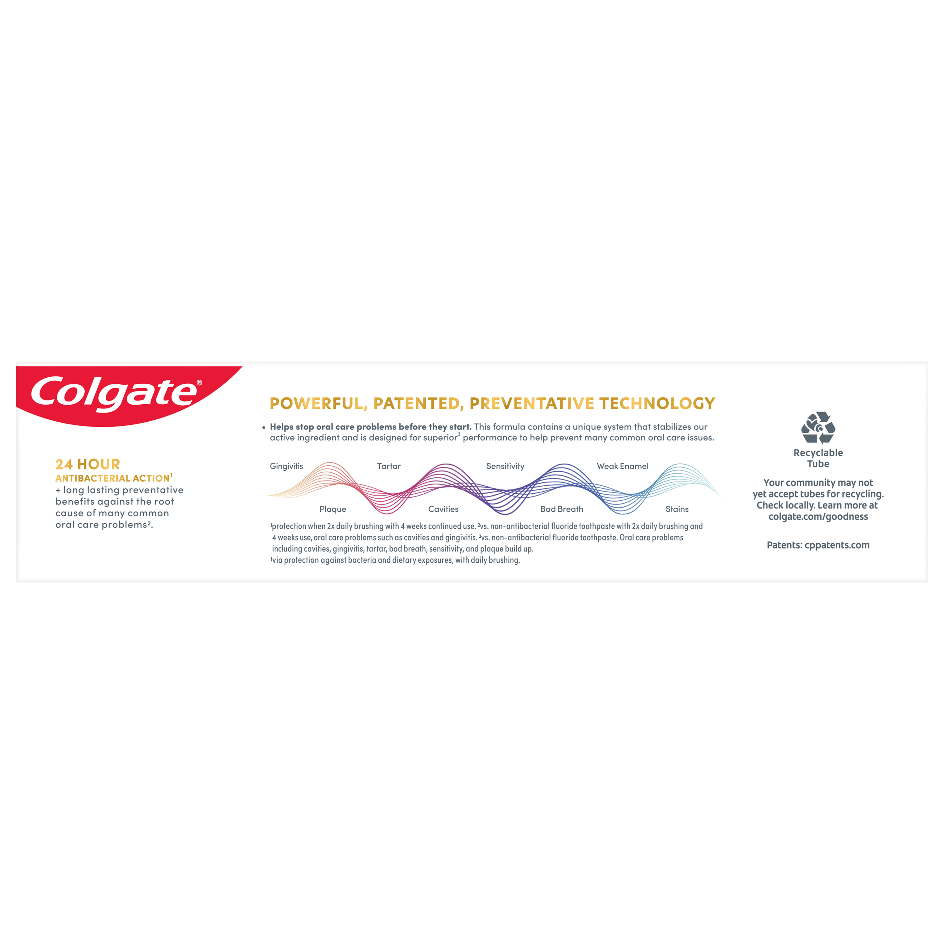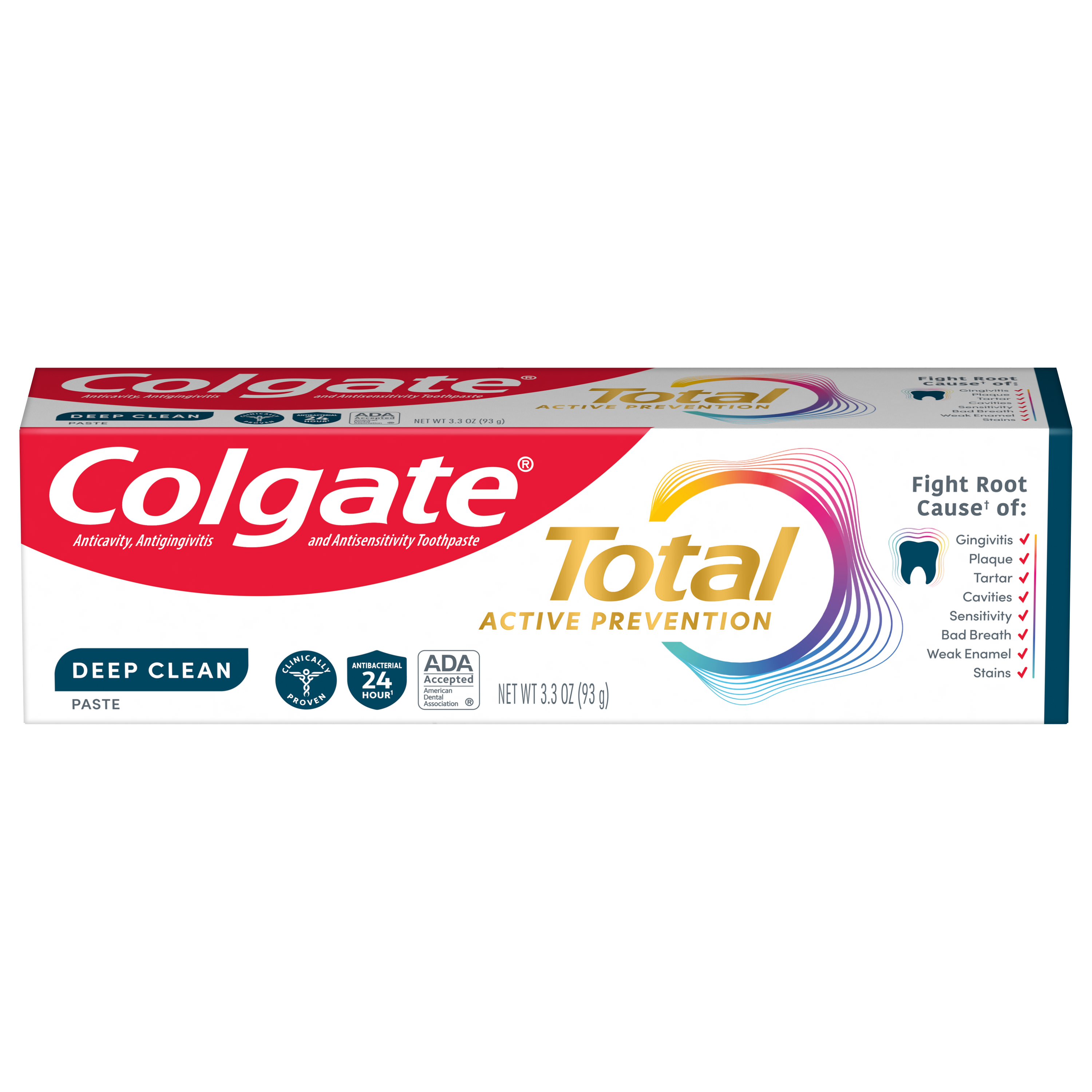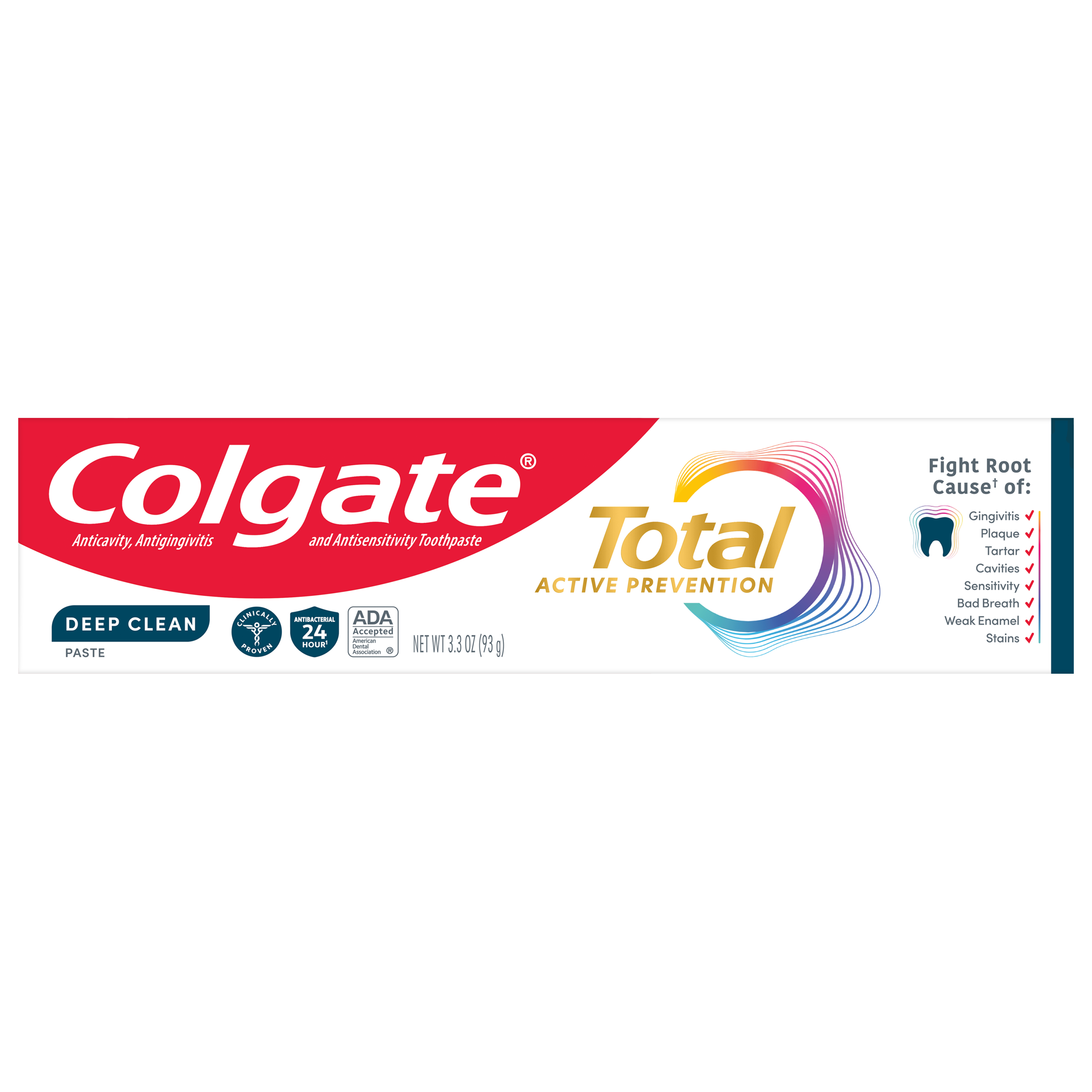 SKU US07301A Consumer Unit - GTIN 00035000985088 Case - GTIN 10035000985085 Product Category Oral Care Product Sub Category Toothpaste Product Equity (Brand) Colgate Product Sub Brand Colgate Total TP Product Title Colgate Total Deep Clean Toothpaste, Mint Toothpaste, 3.3 oz Tube Product Description Colgate Total Deep Clean Toothpaste, 3.3 Oz Tube Get 10 benefits and no trade-offs with Colgate Total Teeth Whitening Toothpaste. This multi-benefit toothpaste provides 42%* more sensitivity relief than a regular fluoride toothpaste while removing and preventing surface stains. Colgate Total Deep Clean Toothpaste is a mint toothpaste that leaves your mouth feeling fresh after every brush. Remove surface stains by brushing twice daily with this tooth whitening toothpaste. Plus, this sugar-free and gluten-free whitening toothpaste not only helps remove stains for whiter teeth, but also keeps your whole mouth healthy by fighting bacteria on teeth, tongue, cheeks, and gums for 12 hours.** 10 Benefits, No Trade-Offs Colgate Total toothpaste is a whitening toothpaste that provides 42%* more sensitivity relief and so much more. Want a healthier smile? Colgate Total not only whitens teeth but keeps breath fresh, provides sensitivity relief with continued use, and has clinically proven antibacterial protection for a healthier mouth.*** Protect 100% of the mouth's surfaces — teeth, tongue, cheeks and gums — with Colgate Total toothpaste. This teeth whitening toothpaste is also specially formulated with stannous fluoride and fights bacteria, helps prevent cavities and gingivitis, provides tartar control with regular brushing and strengthens enamel. A confident and attractive smile comes with bright white teeth and the health of your mouth. You can smile confidently when you use Colgate Total toothpaste. Smile With Confidence For good oral hygiene, brush your teeth twice a day for two minutes. You can smile confidently when you use Colgate Total tooth whitening toothpaste. Leave your mouth feeling clean and fresh and remove surface stains with Colgate Total Deep Clean Toothpaste. *versus a regular fluoride toothpaste after 8 weeks of use **with 4 weeks of continuous use eCommerce Copy- Long Description Colgate Total Deep Clean Toothpaste, 3.3 Oz Tube Get 10 benefits and no trade-offs with Colgate Total Teeth Whitening Toothpaste. This multi-benefit toothpaste provides 42%* more sensitivity relief than a regular fluoride toothpaste while removing and preventing surface stains. Colgate Total Deep Clean Toothpaste is a mint toothpaste that leaves your mouth feeling fresh after every brush. Remove surface stains by brushing twice daily with this tooth whitening toothpaste.Plus, this sugar-free and gluten-free whitening toothpaste not only helps remove stains for whiter teeth, but also keeps your whole mouth healthy by fighting bacteria on teeth, tongue, cheeks, and gums for 12 hours.** 10 Benefits, No Trade-Offs Colgate Total toothpaste is a whitening toothpaste that provides 42%* more sensitivity relief and so much more. Want a healthier smile? Colgate Total not only whitens teeth but keeps breath fresh, provides sensitivity relief with continued use, and has clinically proven antibacterial protection for a healthier mouth.*** Protect 100% of the mouth's surfaces — teeth, tongue, cheeks and gums — with Colgate Total toothpaste. This teeth whitening toothpaste is also specially formulated with stannous fluoride and fights bacteria, helps prevent cavities and gingivitis, provides tartar control with regular brushing and strengthens enamel. A confident and attractive smile comes with bright white teeth and the health of your mouth. You can smile confidently when you use Colgate Total toothpaste. Smile With Confidence For good oral hygiene, brush your teeth twice a day for two minutes. You can smile confidently when you use Colgate Total tooth whitening toothpaste. Leave your mouth feeling clean and fresh and remove surface stains with Colgate Total Deep Clean Toothpaste. *versus a regular fluoride toothpaste after 8 weeks of use **with 4 weeks of continuous use Bullet 1 One 3.3 oz tube of Colgate Total Deep Clean Toothpaste Bullet 2 Fight Bacteria for 12 full hours* *vs non antibacterial fluoride toothpaste with twice a day brushing after 4 weeks Bullet 3 Enhanced Flavor Bullet 4 Toothpaste with Hydrated Silica for an Excellent Clean Bullet 5 Fights Bacteria on Teeth, Tongue, Cheeks and Gums for Whole Mouth Health Bullet 6 Helps Prevent Plaque, Tartar, Cavities & Gingivitis Bullet 7 Now with Relief for Sensitive Teeth Active Ingredients Stannous Fluoride 0.454% (0.15% w/v fluoride ion) CVS RPC 396475
