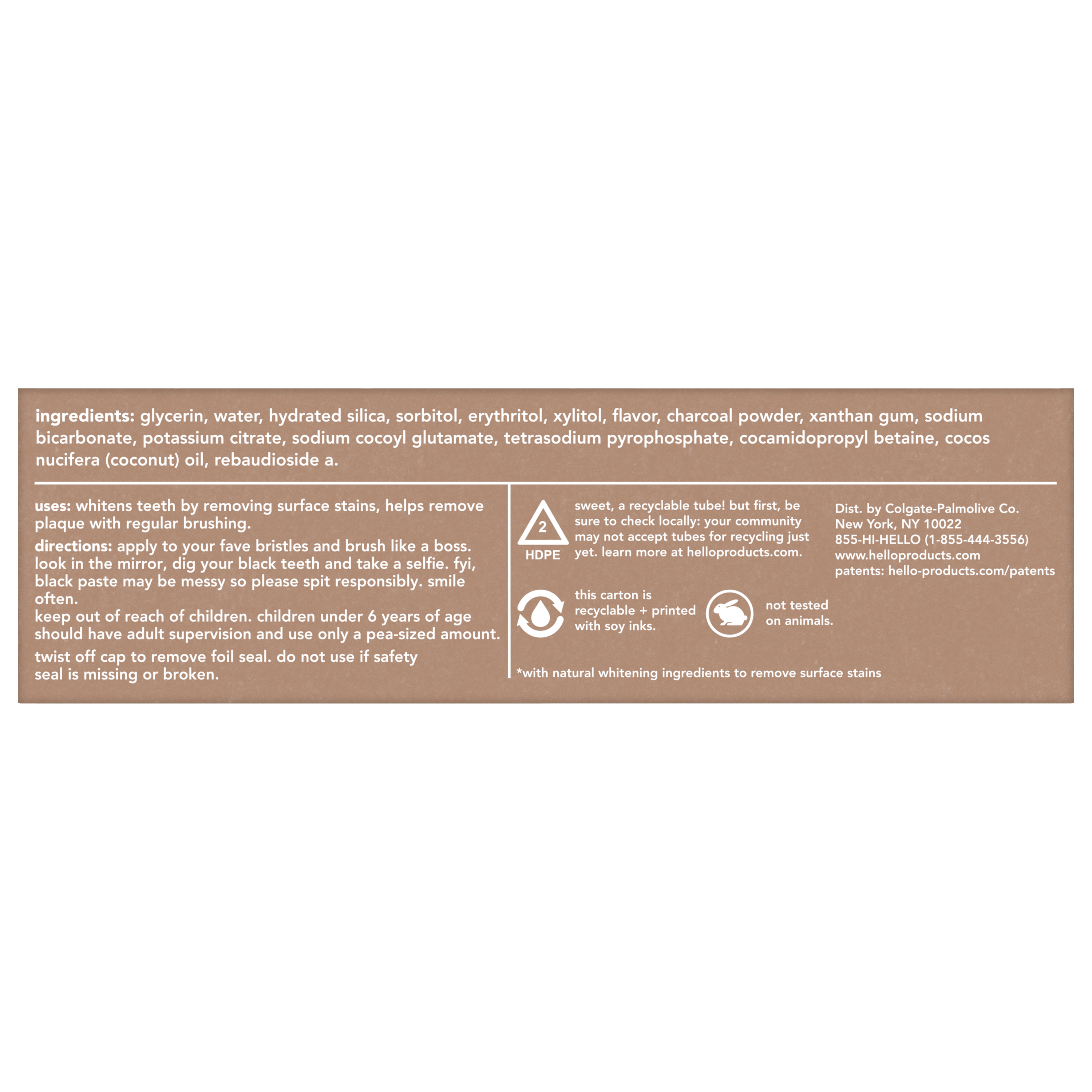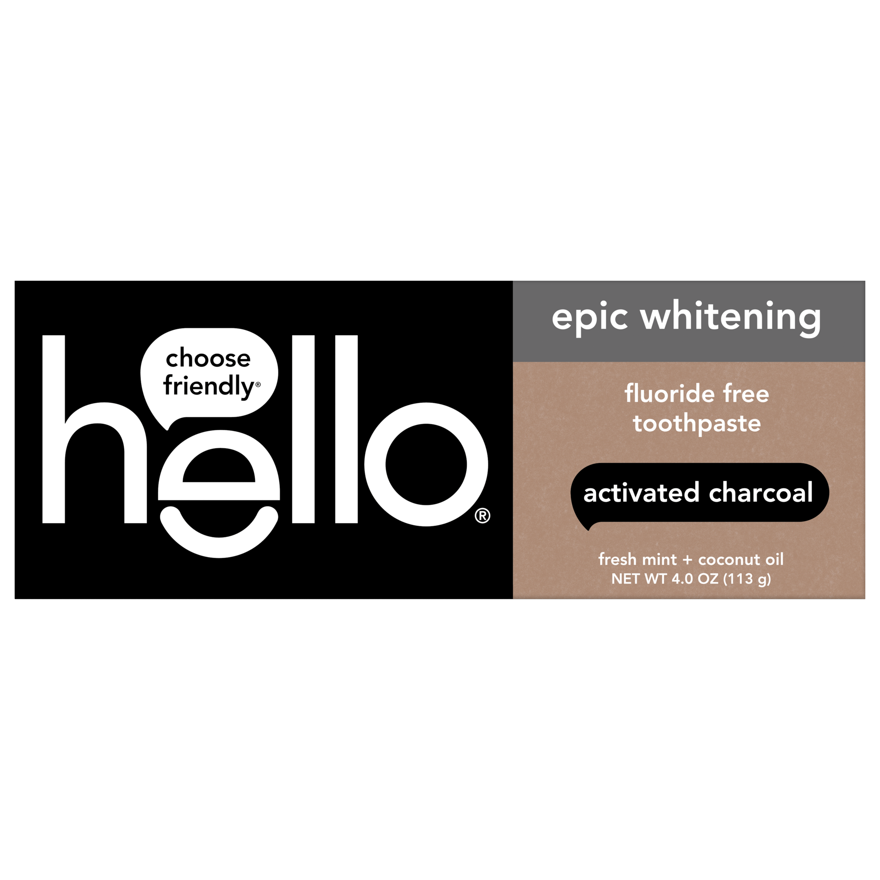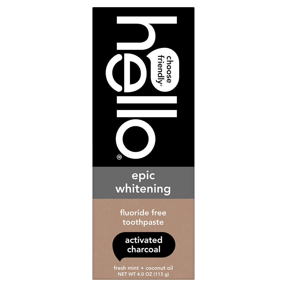 SKU US07308A Consumer Unit - GTIN 00819156020035 Case - GTIN 20819156020039 Product Category Oral Care Product Sub Category Toothpaste Product Equity (Brand) Hello Product Sub Brand Hello Adult TP Product Title hello Epic Whitening Charcoal Fluoride Free Toothpaste, Fresh Mint, 4.0 Oz Tube Product Description Say hello to friendly teeth whitening toothpaste with hello Epic Whitening Activated Charcoal Toothpaste. This fluoride free toothpaste is thoughtfully formulated with high quality ingredients like fresh mint, coconut oil, and activated charcoal. It is safe for enamel and freshens your breath like nobody’s business. Made with activated charcoal from bamboo, this black toothpaste might look weird but it works brilliantly and tastes awesome. This minty charcoal whitening toothpaste whitens naturally by polishing and cleaning surface stains on your teeth to help with a whiter smile. But buckle-up, there's more goodness to this epic charcoal toothpaste. hello Epic Whitening Charcoal Toothpaste contains no peroxide, no artificial sweeteners, no artificial flavors, no titanium dioxide, no dyes, no SLS, and this fresh mint toothpaste is vegan. As if that weren't enough magic for one tube, hello toothpaste is also not tested on animals. We're serious about being friendly, and about what goes into our toothpaste. eCommerce Copy- Long Description hello Epic Whitening Charcoal Fluoride Free Toothpaste, Fresh Mint, 4.0 Oz Tube Say hello to a friendly teeth whitening toothpaste with hello Epic Whitening Activated Charcoal Toothpaste. This fluoride free toothpaste is thoughtfully formulated with high quality ingredients like fresh mint, coconut oil, and activated charcoal. It is safe for enamel and freshens your breath like nobody’s business. Made with activated charcoal from bamboo, this black toothpaste might look weird but it works brilliantly and tastes awesome. Whitens Naturally This minty charcoal whitening toothpaste whitens naturally by polishing and cleaning surface stains on your teeth to help with a whiter smile. But buckle-up, there's more goodness to this epic charcoal toothpaste. Only The Good Stuff Allowed hello Epic Whitening Charcoal Toothpaste contains no peroxide, no artificial sweeteners, no artificial flavors, no titanium dioxide, no dyes, no SLS, and this fresh mint toothpaste is vegan. As if that weren't enough magic for one tube, hello toothpaste is also not tested on animals. We're serious about being friendly, and about what goes into our toothpaste. Bullet 1 What I'm Getting: Includes one (1) 4.0 oz tube of hello Epic Whitening Activated Charcoal Toothpaste, Fluoride Free Teeth Whitening Toothpaste Bullet 2 Whitens Naturally: This fresh mint toothpaste with activated charcoal tastes awesome and whitens naturally while also helping remove plaque when brushing Bullet 3 Tastes Awesome: The activated charcoal toothpaste is specially formulated with fresh mint, coconut oil, and activated charcoal that is safe on enamel Bullet 4 No-Brainer This hello toothpaste is fluoride free, peroxide free, SLS free and has no artificial sweeteners or flavors, no dyes, no titanium dioxide Bullet 5 Everyday Yay: hello Epic Whitening Activated Charcoal Toothpaste is a vegan toothpaste and is not tested on animals Amazon RPC B076B8PX14 AMZ URL https://www.amazon.com/dp/B076B8PX14 Walmart RPC 529826900 Walmart URL (Computed) https://www.walmart.com/ip/a/529826900 Target RPC 52508705 Target URL https://www.target.com/p/a/-/A-52508705 CVS RPC 635480 Family Dollar RPC 903945