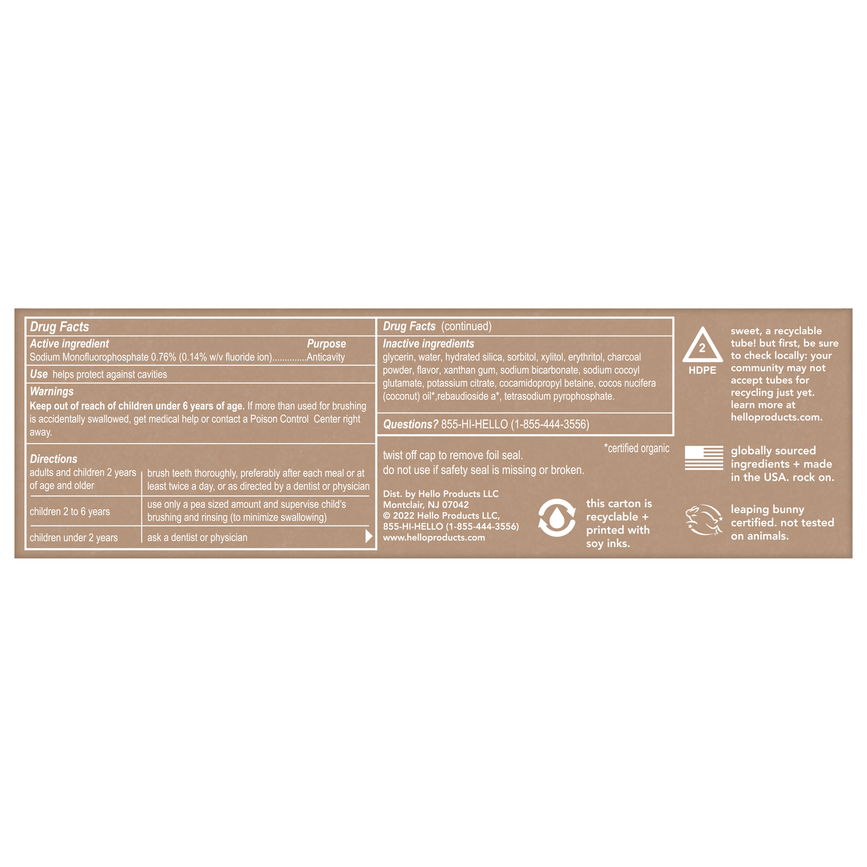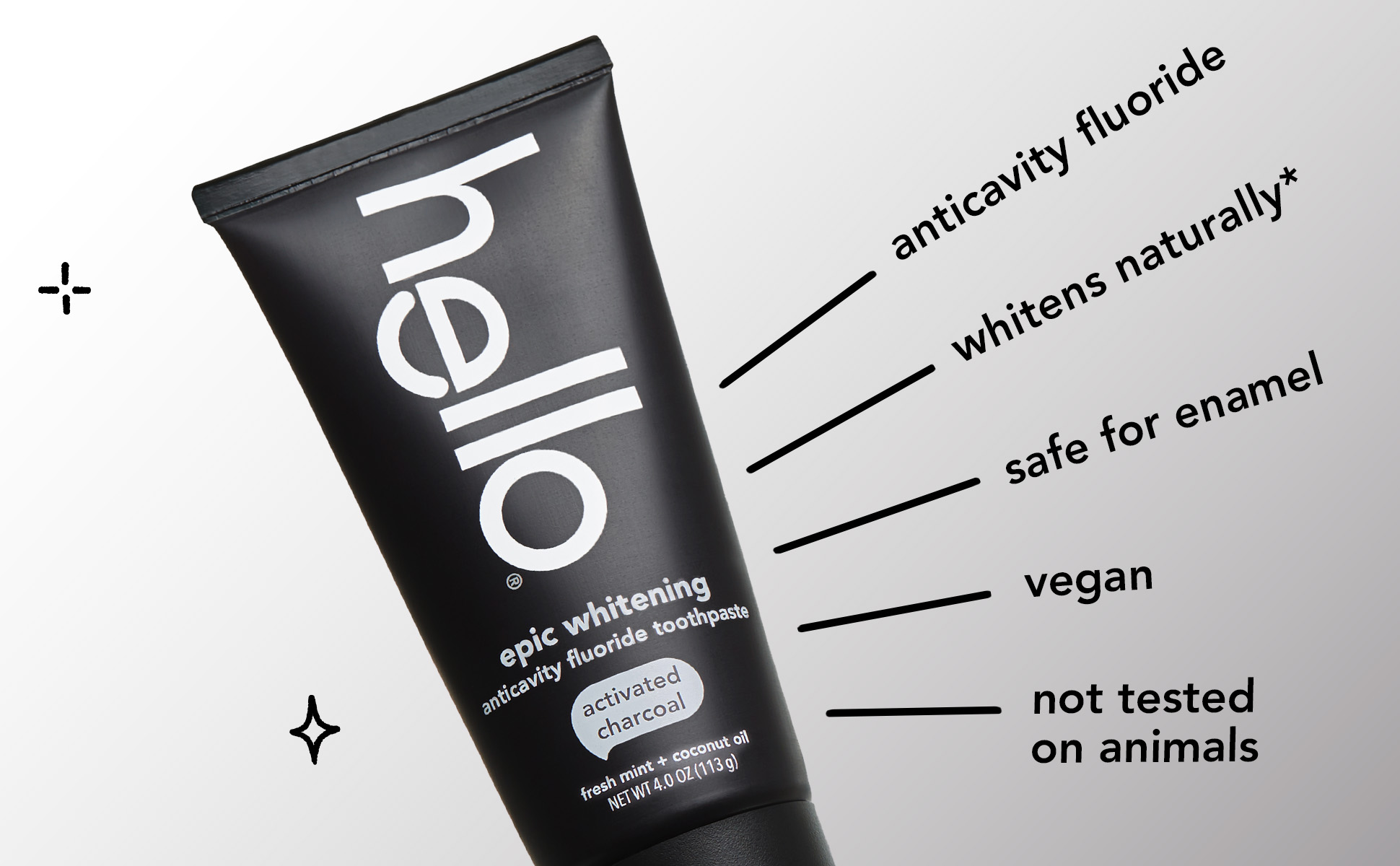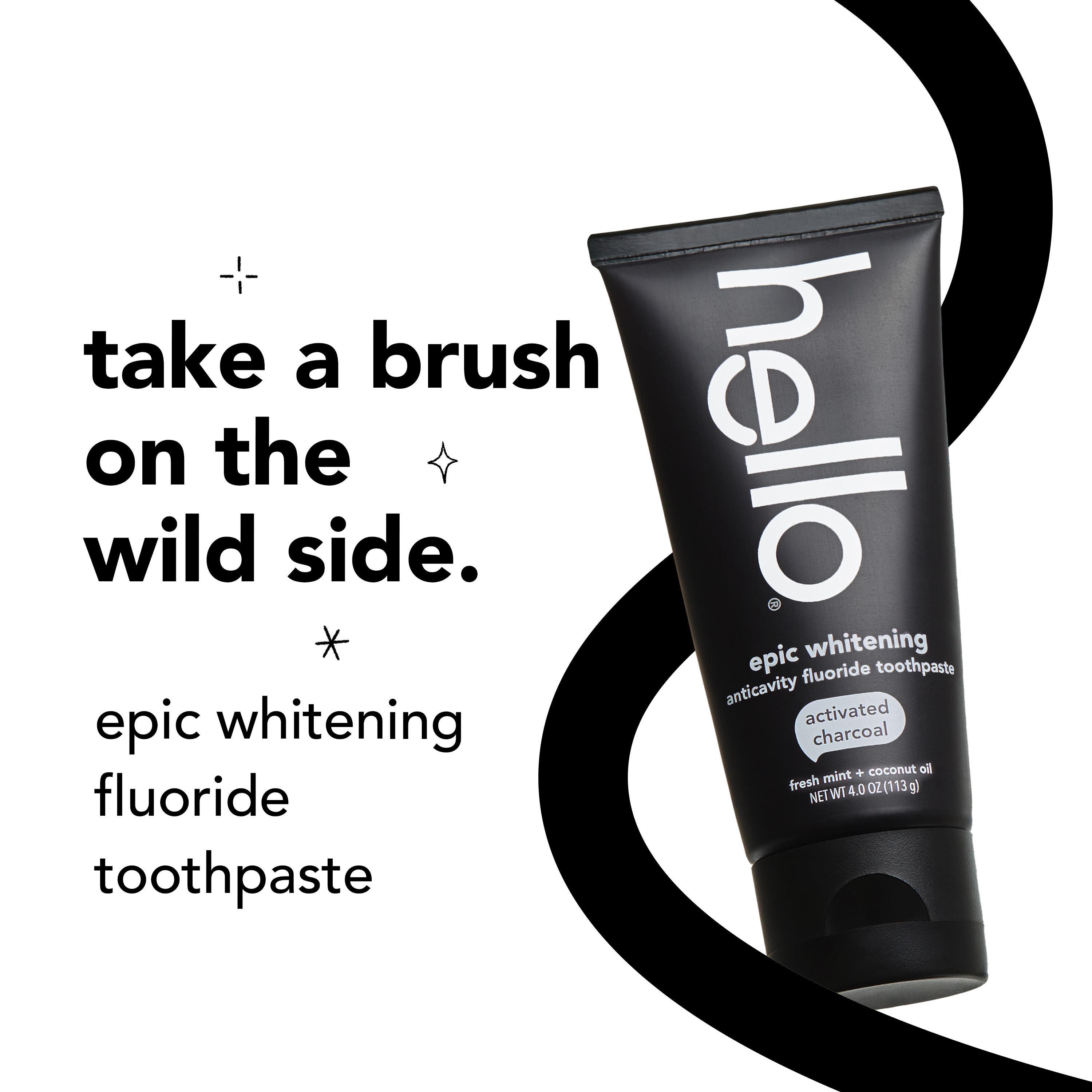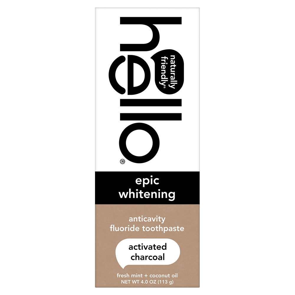 SKU US07309A Consumer Unit - GTIN 00819156020257 Case - GTIN 20819156020251 Product Category Oral Care Product Sub Category Toothpaste Product Equity (Brand) hello Product Sub Brand Hello Adult TP Product Title hello Epic Whitening Charcoal Toothpaste with Fluoride, Fresh Mint, 4.0 Oz Tube Product Description Say hello to your new favorite teeth whitening toothpaste, hello Epic Whitening Activated Charcoal Toothpaste with Fluoride. This teeth whitening charcoal toothpaste is thoughtfully formulated with high-quality ingredients like fresh mint, coconut oil, and activated charcoal. This black toothpaste might look weird but it works brilliantly and tastes totally awesome. This minty charcoal teeth whitening toothpaste whitens naturally by removing surface stains on your teeth to help with a whiter smile and fresher breath. Plus, it’s safe on your enamel and protects your teeth from cavities with its fluoride formula. Say goodbye to pesky plaque when you brush with hello Epic Whitening Activated Charcoal Toothpaste with Fluoride. hello Epic Whitening Activated Charcoal Fluoride Toothpaste contains no artificial sweeteners, no peroxide, no titanium dioxide, no dyes, no SLS, and this fresh mint flavored toothpaste is vegan. As if that weren't enough magic for one tube, hello charcoal toothpaste is not tested on animals. We're serious about being friendly. *with natural whitening ingredients to remove surface stains eCommerce Copy- Long Description what's up with charcoal? black paste might look weird but it works brilliantly. made with activated charcoal from sustainable bamboo, this paste epically whitens teeth by removing surface stains and freshens your breath like nobody's business. for maximum friendliness, use every time you brush. please spit responsibly, and clean the sink after each use. Bullet 1 Includes one (1) 4.0 oz tube of hello hello Epic Whitening Activated Charcoal Toothpaste with Fluoride, Fresh Mint Toothpaste Bullet 2 This minty teeth whitening toothpaste with activated charcoal tastes awesome and whitens naturally* while also helping remove plaque when brushing Bullet 3 This teeth whitening charcoal toothpaste is specially formulated with fresh mint, coconut oil, and activated charcoal that is safe on enamel Bullet 4 hello Epic Whitening Activated Charcoal Toothpaste is a whitening fluoride toothpaste that helps remove plaque with regular brushing Bullet 5 This hello charcoal toothpaste is vegan, peroxide free, SLS free and has no artificial sweeteners, or dyes Active Ingredients Sodium Monofluorophosphate 0.76% (0.14% w/v fluoride ion) Target RPC 75563081 Target URL https://www.target.com/p/a/-/A-75563081 CVS RPC 390254