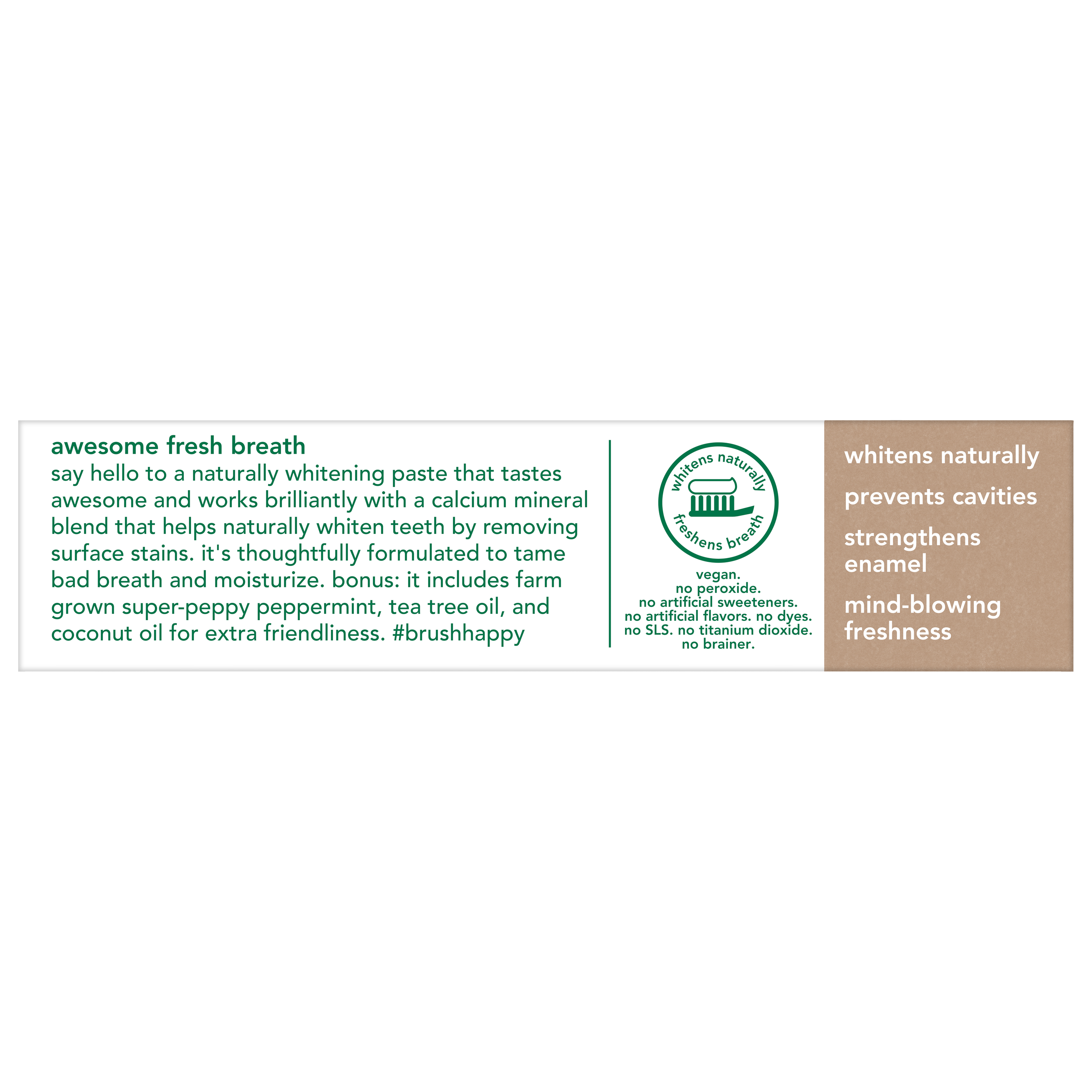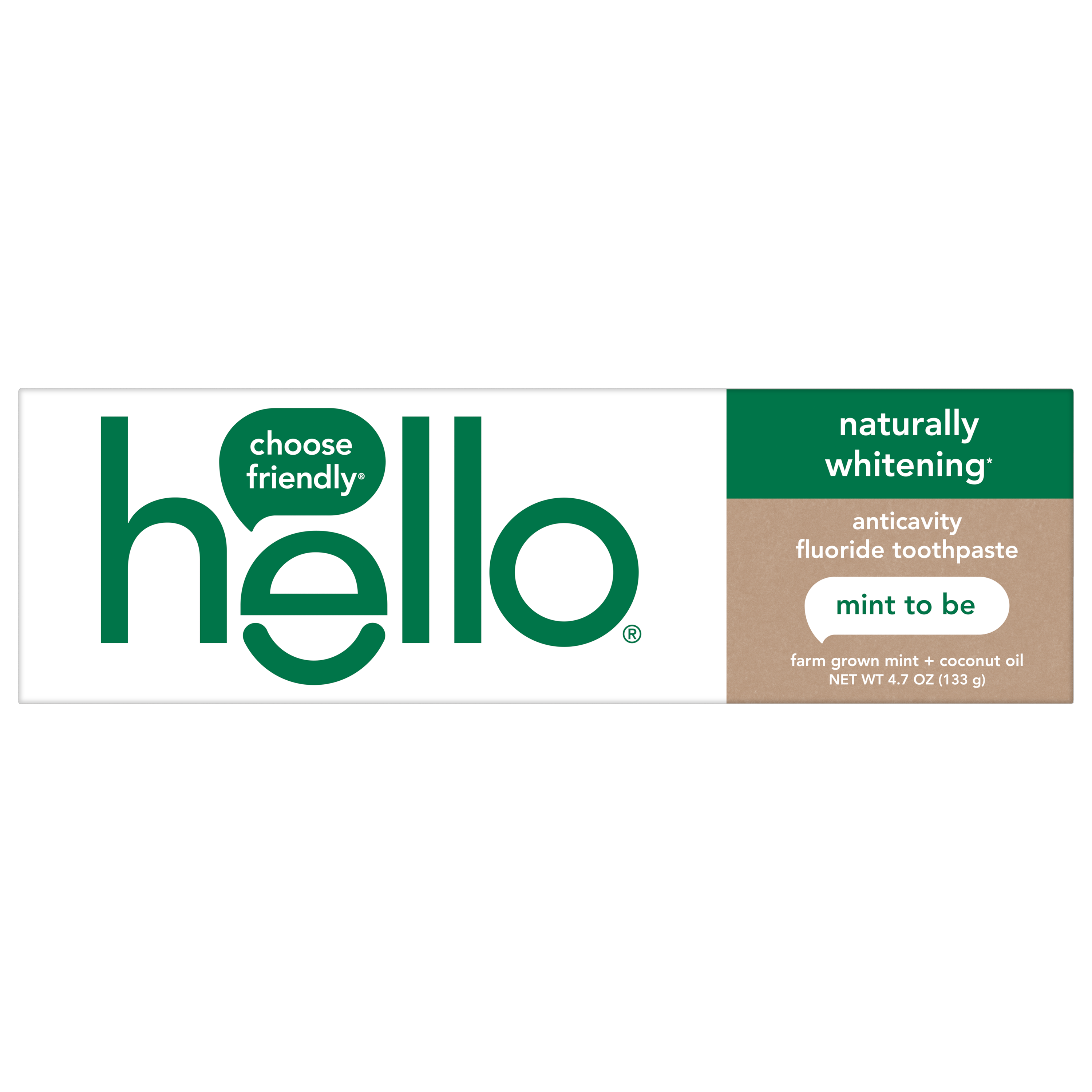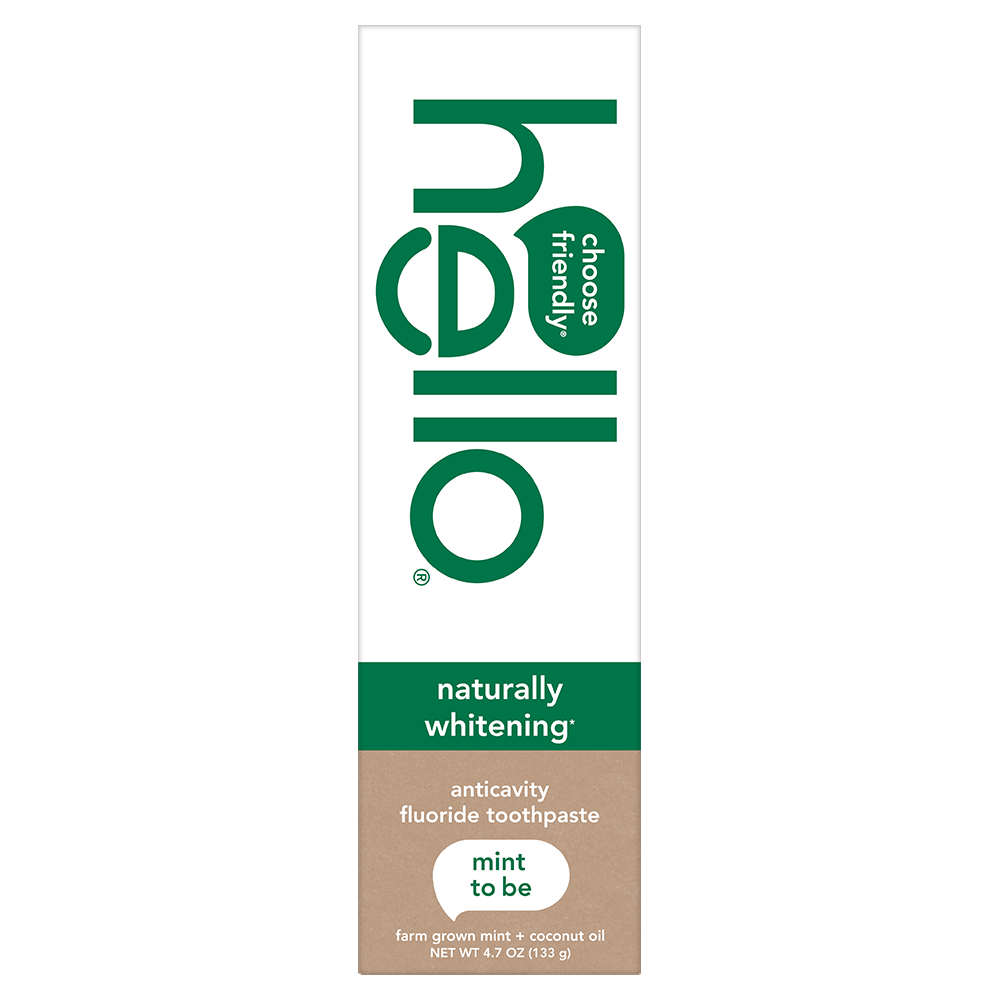 SKU US07311A Consumer Unit - GTIN 00819156020233 Case - GTIN 20819156020237 Product Category Oral Care Product Sub Category Toothpaste Product Equity (Brand) Hello Product Sub Brand Hello Adult TP Product Title hello Naturally Whitening Fluoride Toothpaste, Mint, 4.7 Oz Tube Product Description Say hello to an everyday yay whitening toothpaste with mind-blowing freshness with the hello Naturally Whitening Fluoride Toothpaste. This minty whitening toothpaste tastes awesome and works brilliantly with a calcium mineral blend that helps naturally whiten teeth by removing surface stains. It’s thoughtfully formulated to tame bad breath and moisturize. Made with high quality ingredients like farm grown super-peppy peppermint, tea tree oil, and coconut oil for extra friendliness, this naturally whitening toothpaste gives you awesome fresh breath. And because it’s formulated with fluoride, it also helps prevent pesky cavities and strengthens tooth enamel. hello Naturally Whitening Toothpaste contains no artificial sweeteners, no artificial flavors, no peroxide, no titanium dioxide, no dyes, no SLS, and this mint toothpaste is vegan. As if that weren't enough magic for one tube, hello toothpaste is also not tested on animals. We're serious about being friendly, and about what goes into our toothpaste. eCommerce Copy- Long Description say hello to a naturally whitening paste that tastes awesome and works brilliantly with a calcium mineral blend that helps naturally whiten teeth by removing surface stains. it's thoughtfully formulated to tame bad breath and moisturize. bonus: it includes farm grown super-peppy peppermint, tea tree oil, and coconut oil for extra friendliness. Bullet 1 What I'm Getting: Includes one (1) 4.7 oz tube of hello Naturally Whitening Fluoride Toothpaste, Mint Bullet 2 See Ya Stains: Whitens naturally with natural whitening ingredients to remove surface stains and uses fluoride to help prevent cavities and strengthen teeth enamel Bullet 3 So Fresh: This naturally whitening toothpaste is formulated with super-peppy peppermint so you can experience mind-blowing freshness every time you brush Bullet 4 No-Brainer: This hello whitening toothpaste is peroxide free, SLS free and has no artificial sweeteners or flavors, no dyes, no parabens, and no titanium dioxide Bullet 5 Everyday Yay: hello Naturally Whitening Fluoride Toothpaste is a vegan toothpaste and is not tested on animals Active Ingredients Sodium Monofluorophosphate 0.76% (0.14% w/v fluoride ion) Target RPC 75563128 Target URL https://www.target.com/p/a/-/A-75563128 Family Dollar RPC 997101