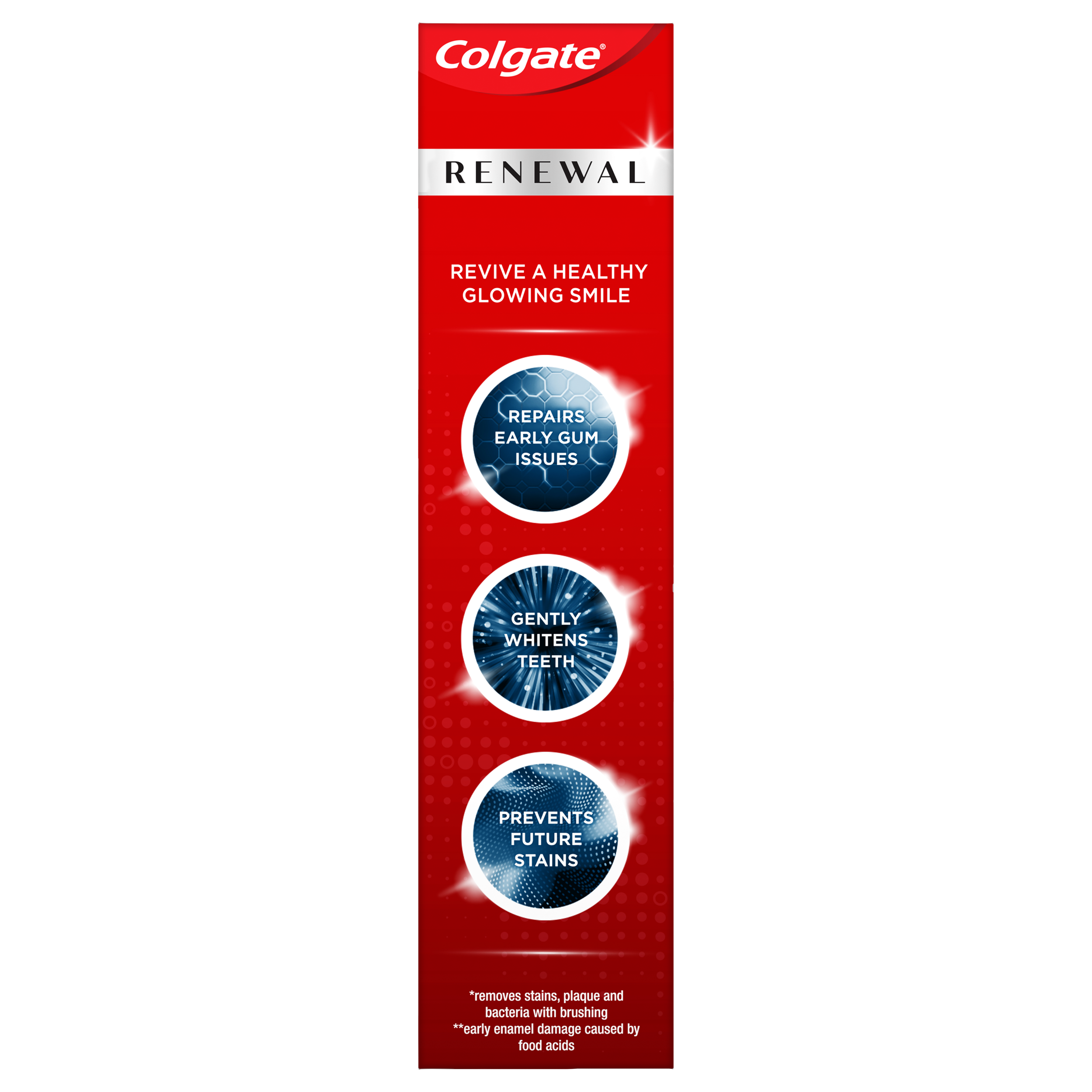 SKU US07320A Consumer Unit - GTIN 00035000985316 Case - GTIN 10035000985313 Product Category Oral Care Product Sub Category Toothpaste Product Equity (Brand) Colgate Product Sub Brand Colgate Renewal TP Product Title Colgate Gum Renewal Gum Protection Toothpaste Gel Whitening Restoration, Mint Gel Toothpaste for Gingivitis, 3 Oz, 2 Pack Product Description Colgate Gum Renewal, Whitening Restoration, 3 Oz Tube, 2 Pack Colgate Gum Renewal Whitening Restoration revitalizes gums while reversing early damage and whitens teeth. This daily teeth whitening toothpaste gently whitens teeth to remove surface stains, so your smile is renewed and glowing again. Whitening Restoration gel toothpaste with 3X cleansing action removes stains, plaque and bacteria while brushing. Plus, Colgate Gum Renewal whitening toothpaste helps prevent future stains and is enamel-safe for daily use. Revitalize Gums By Reversing Early Damage Colgate Gum Renewal is a gum toothpaste that revitalizes gums by reversing early damage. That means less gum inflammation so your gums are healthy and revitalized. Target and repair early gum issues that could lead to early gum damage or gingivitis with this gum toothpaste. Try all of the different types of Colgate Gum Renewal gum toothpaste: Whitening Restoration gel and Whitening Restoration paste for teeth whitening; Sensitivity Repair gel and Sensitivity Repair paste for teeth sensitivity; and Deep Clean to strengthen weakened enamel. Gum Protection Toothpaste That’s Enamel-Safe Colgate Gum Renewal Whitening Restoration is a gel toothpaste with a minty flavor that leaves breath fresh and the mouth clean. Plus, this gum toothpaste is vegan, sugar-free, gluten-free, and enamel safe for daily use. Revive a healthy, glowing smile with Colgate Renewal Reverse. Repair. Renew.* Colgate Renewal has solutions for both gum health and enamel health. Try Colgate Gum Renewal to revitalize gums and reverse early damage and Colgate Enamel Renewal to repair enamel by reversing micro-damage.** *Gum Renewal helps reverse early gum disease, repair sensitive areas of the tooth and renew your smile by removing surface stains. Enamel Renewal helps reverse sensitivity, repair enamel through remineralization and renew your smile by removing surface stains. **early enamel damage caused by food acids Bullet 1 Two 3 oz tubes of Colgate Gum Renewal Gum Protection Toothpaste Gel Whitening Restoration Bullet 2 Colgate Gum Renewal revitalizes gums by reversing early damage Bullet 3 Target and repair early gum issues and help reverse early gum damage or gingivitis with this gum toothpaste Bullet 4 Whitening Restoration is a teeth whitening toothpaste that gently whitens teeth Bullet 5 3X cleansing action removes stains, plaque and bacteria with brushing Bullet 6 Helps repair sensitive areas of the tooth, and renews your smile by removing surface stains Bullet 7 Whitening toothpaste is enamel-safe for daily use and prevents future stains Bullet 8 Mint toothpaste gel freshens breath and leaves your mouth feeling clean Bullet 9 Sugar free, gluten free and vegan toothpaste Active Ingredients Active ingredient: Stannous Fluoride (0.454% (0.15% w/v fluoride ion)). Purpose: Anticavity, Antigingivitis, Antisensitivity. Amazon RPC B08L8RRQ9X AMZ URL https://www.amazon.com/dp/B08L8RRQ9X Walmart RPC 863885986 Walmart URL (Computed) https://www.walmart.com/ip/a/863885986