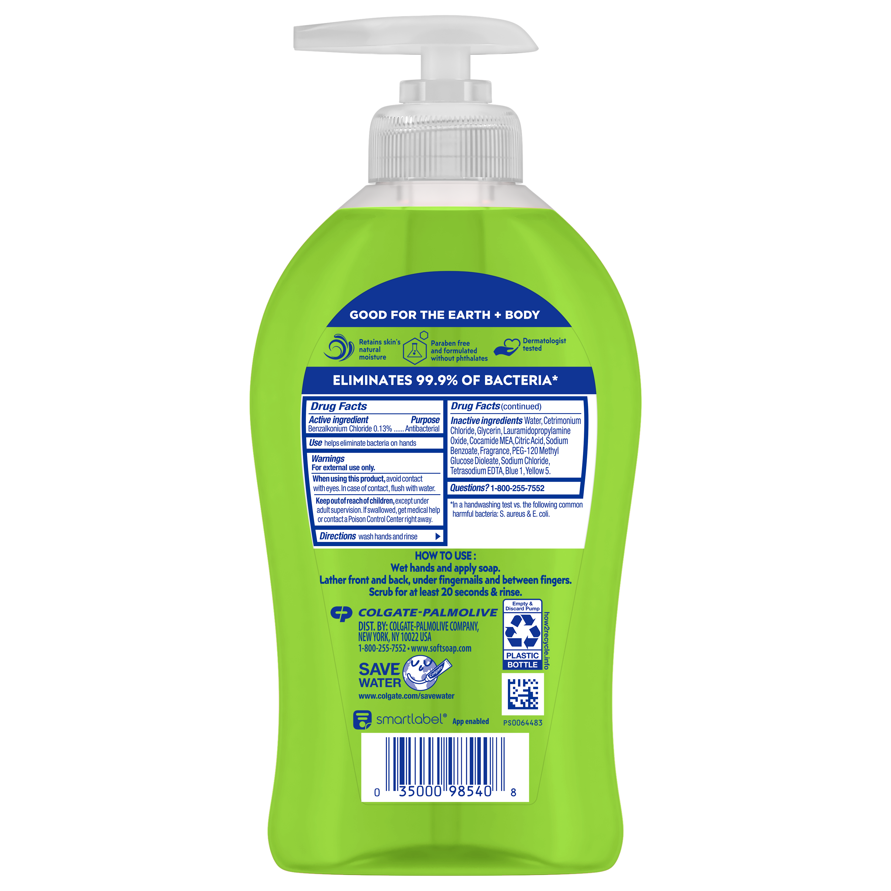 SKU US07326A Consumer Unit - GTIN 00035000985408 Case - GTIN 10035000985405 Product Category Personal Care Product Sub Category Liquid Hand Wash Product Equity (Brand) Softsoap Product Sub Brand Softsoap Antibacterial LHW Product Title Softsoap Antibacterial Liquid Hand Soap, Sparkling Pear Scent Hand Soap, 11.25 oz Bottle Product Description From the #1 liquid hand soap brand (1), comes Softsoap Antibacterial Sparkling Pear Liquid Hand Soap which eliminates 99.9% of bacteria (2). With a sparkling pear scent, this antibacterial hand soap effectively cleans hands while infusing small moments with joy. Our liquid hand soap is enriched with moisturizers and helps protect skin’s natural barrier by retaining skin’s natural moisture. This special formula leaves skin feeling soft. This fresh kitchen hand soap is paraben free, formulated without phthalates, and dermatologist tested. Feel the joy of clean with Softsoap hand soap! (1) Based in part on data reported by Nielsen through its Market Track Service for the Liquid Hand Soap Category for the 52 week period ending 1/1/22, for the All Outlet market. Copyright © 2022 Nielsen. (2) in a handwashing test vs. the following common harmful bacteria: S. aureus & E. coli. eCommerce Copy- Long Description From the #1 liquid hand soap brand†, comes Softsoap Antibacterial Gentle Clean Liquid Hand Soap which eliminates 99.9% of bacteria*. With a sparkling pear scent, this antibacterial hand soap effectively cleans hands while infusing small moments with joy. Softsoap Gentle Clean Antibacterial liquid hand soap is enriched with moisturizers and helps protect skin’s natural barrier by retaining skin’s natural moisture. This unique formula leaves skin feeling soft. This liquid hand soap is paraben free, formulated without phthalates, and dermatologist tested. Feel the joy of clean with Softsoap hand soap! †Based in part on data reported by Nielsen through its Market Track Service for the Liquid Hand Soap Category for the 52 week period ending 1/1/22, for the All Outlet market. Copyright © 2022 Nielsen. *in a handwashing test vs. the following common harmful bacteria: S. aureus & E. coli Great Clean. For Everyone Confidently wash your hands with Softsoap while enjoying fragrant scents and fun labels that will bring you joy. For everyone, every mood, and every sink, Softsoap hand soap is designed to make you feel joyfully clean. Use Gentle Clean Antibacterial liquid hand soap in the bathroom or the kitchen to uplift every small moment while keeping your hands clean. Feel Good About Washing Your Hands This liquid hand soap washes away bacteria and is an effective way to keep hands clean. Plus, this liquid soap is dermatologist tested, paraben free and formulated without phthalates, and retains skin’s natural moisture, so you can feel good about washing your hands. Feel the Joy of Clean We believe that the little moments throughout your day should be fun! With delightful bubbles and fragrant scents, every trip to the sink and every shower leaves you feeling uplifted. Enjoy those small moments of joy, get brilliantly clean with our liquid hand soaps and body washes—now, you’re ready to take on the world! Bullet 1 One 11.25 oz Bottle of Softsoap Sparkling Pear Antibacterial Liquid Hand Soap Bullet 2 Our trusted formula is designed to eliminate 99.9% of bacteria (2), ensuring your hands are clean Bullet 3 With a sparkling pear scent, this antibacterial hand soap effectively cleans hands while infusing small moments with joy Bullet 4 Our green hand soap is enriched with moisturizers and helps protect skin’s natural barrier by retaining skin’s natural moisture Bullet 5 This bathroom hand soap is paraben free, formulated without phthalates, and dermatologist tested Active Ingredients Benzalkonium Chloride 0.13% Amazon RPC B08KJQH3RF AMZ URL https://www.amazon.com/dp/B08KJQH3RF Walmart RPC 931322864 Walmart URL (Computed) https://www.walmart.com/ip/a/931322864 Albertsons RPC 970066542 Albertsons URL https://www.albertsons.com/shop/product-details.970066542.html CVS RPC 660359