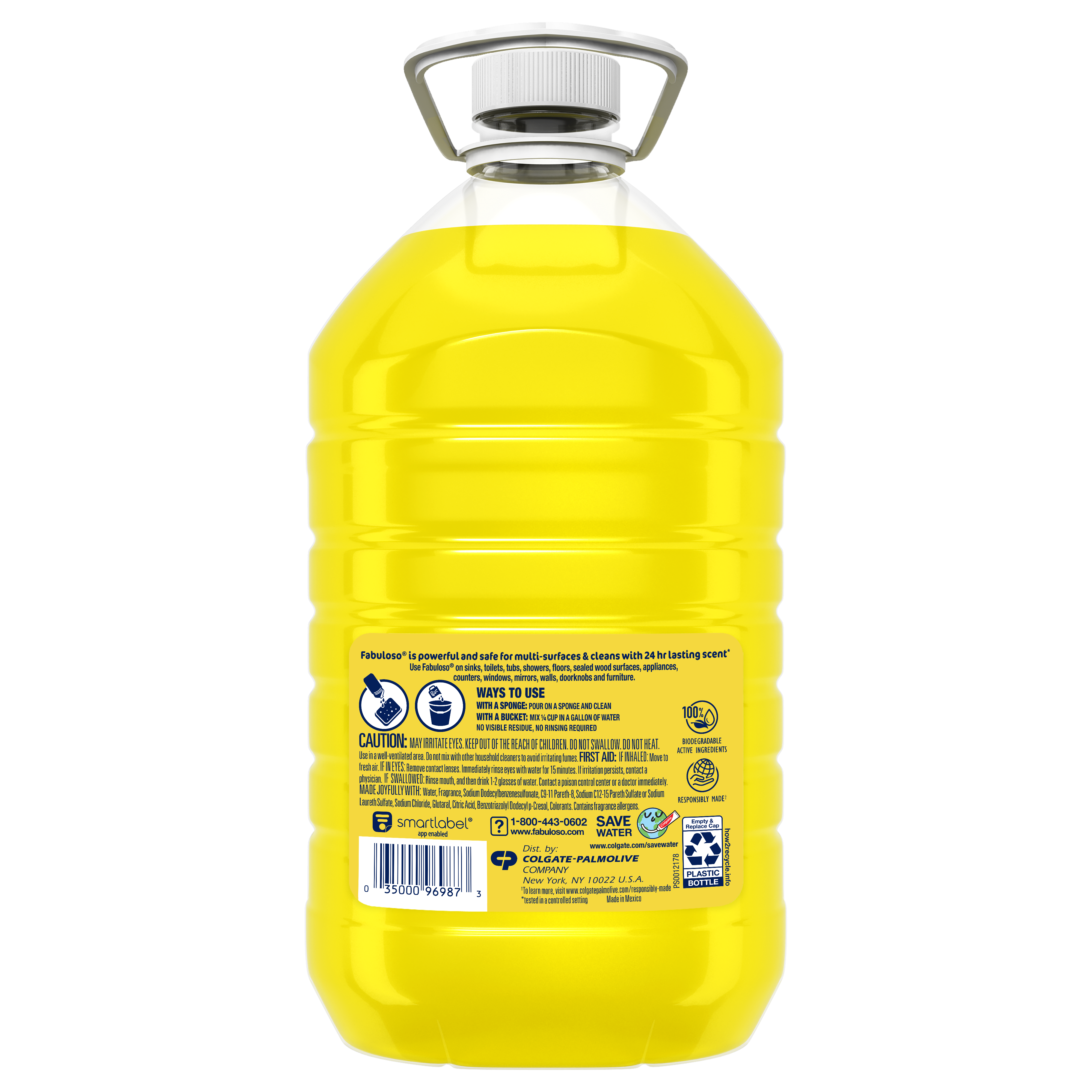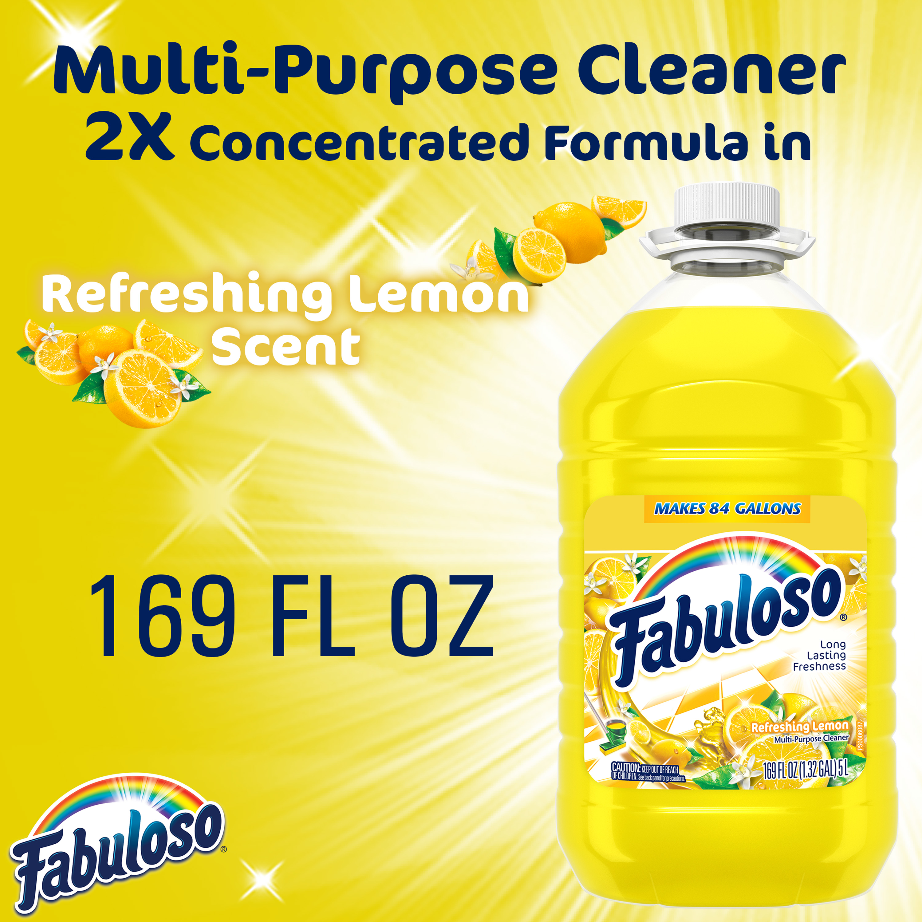 SKU US07357A Consumer Unit - GTIN 00035000999993 Product Category Home Care Product Sub Category Cleaners Liquid / Gel Product Equity (Brand) Fabuloso Product Sub Brand Fabuloso Liq Cln Product Title Fabuloso All Purpose Cleaner, Lemon - 169 fluid ounce Product Description Fabuloso Multi-Purpose Cleaner leaves a fresh scent that lasts. The Lemon fragrance leaves an irresistible scent your family and guests will notice. It comes in a convenient, easy-pour bottle. This Fabuloso cleaner is easy to use, so there is no need to rinse, and it leaves no visible residue. Discover the long-lasting freshness of Fabuloso Multi-Purpose Cleaner that leaves your home shiny, clean, fresh, and fragrant. eCommerce Copy- Long Description Fabuloso® Multi-Purpose Cleaner, 2X Concentrated Formula, Refresing Lemon Scent Fabuloso® Multi-Purpose Cleaner, 2X Concentrated Formula in Refreshing Lemon Scent transforms your home with a fresh scent that lasts. Bring the fragrance of lemon indoors, and experience a warm, joyful feeling your friends and family will love. Fabuloso®’s 2X Concentrated Formula now provides 2X more active ingredients compared to non-concentrated Fabuloso Original, giving you 2X the dosage in the same bottle. Every colorful pour from the easy-pour bottle delivers a long-lasting, unmistakable freshness and leaves your home bright and clean. Use Fabuloso® Multi-Purpose Cleaner, on sinks, toilets, tubs, showers, kitchen and bathroom floors, sealed wood surfaces, appliances, counters, windows, mirrors, walls, doorknobs and furniture, and fill every room in your home with joy. Uplifting fragrances. Clean surfaces. Irresistible joy. Life isn’t always easy, but cleaning it up sure can be. Fabuloso® combines cleaning power with fresh scents that fill your home with joy, to make it a welcoming place no matter how hard your day. Fabuloso®’s 2X Concentrated Formula provides 2X more uses in the same bottle compared to non-concentrated Fabuloso Original. From the kitchen to the bathroom and beyond, Fabuloso® Multi-Purpose, Cleaner 2X Concentrated has a wide variety of long-lasting fragrances that deliver hope for a better tomorrow. Try all of our uplifting scents: Refreshing Lemon, Passion of Fruits, Citrus & Fruits with Baking Soda, Bleach Alternative† Spring Fresh, Tropical Spring, and Orange Scent with Baking Soda. † Bleach-free option with 20% more active ingredients vs other Fabuloso 2X Concentrated products Shared Moments of Joy All Over the World Our story begins in Venezuela, circa 1980. Cleaning products lacked fragrance and distinction. But families wanted lasting scents that kept their homes fresh and clean for hours. Enter the bold colors and joyful fragrances of Fabuloso® ! 16 years later, families across America also got to experience the joy: we became a household staple thanks to our rainbow of colors and playful, distinctive scents. Today, across the world, we’re more than cleaning products. We’re a catalyst for joy. Bullet 1 Fabuloso is powerful and safe for multi-surfaces Bullet 2 Use Fabuloso® on sinks, toliets, tubs, showers, floors, sealed wood surfaces, appliances, counters, windows, mirrors, walls, doorknobs, and furniture. Bullet 3 No visible residue, No rinsing required Bullet 4 100% Biodegradable Active Ingredients Bullet 5 Responsibly Made** (**to learn more, visit www.colgatepalmolive.com/responsibly-made)