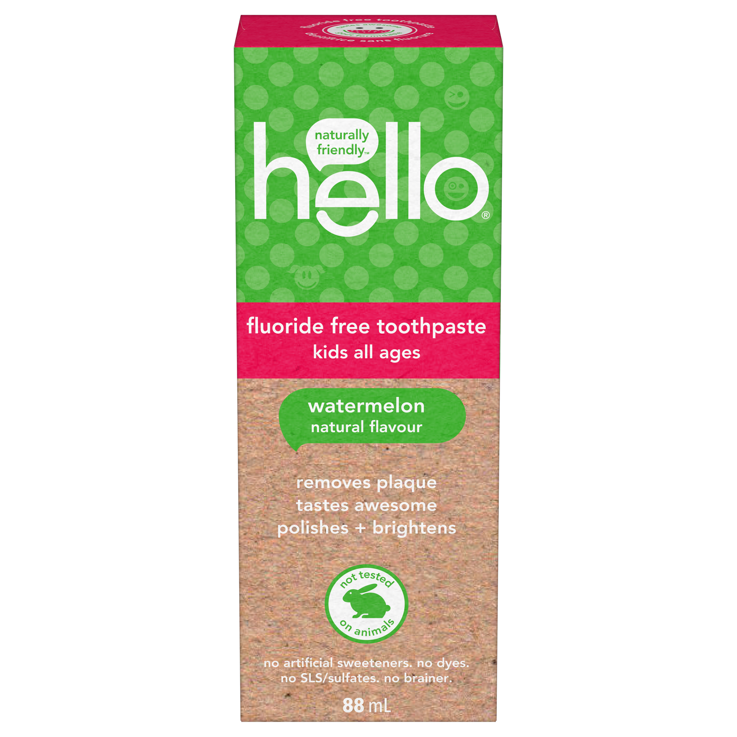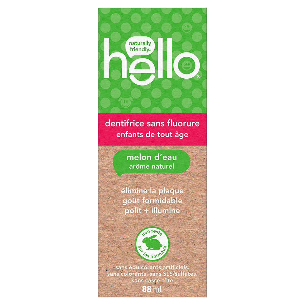 SKU US07406A Consumer Unit - GTIN 00035000987006 Case - GTIN 10035000987003 Product Category Oral Care Product Sub Category Toothpaste Product Equity (Brand) hello Product Sub Brand Hello Kids TP Product Title hello Fresh Watermelon Fluoride Free Kids Toothpaste, 119 g Tube Product Description Say goodbye to brush time fighting and hello to more everyday yay with hello Fresh Watermelon Fluoride Free Kids Toothpaste. This one in a melon kids fluoride free toothpaste helps remove plaque with regular brushing and tastes brilliant with its natural watermelon flavour. Plus, this kids watermelon toothpaste is safe for all ages and the great tasting watermelon flavour is a fun way to encourage regular brushing habits at an early age. They’re Gonna Lose Their Rind hello Fresh Watermelon Kids Fluoride Free Toothpaste helps gently polish and brighten little teeth when kids brush. Our toothpaste is formulated without spicy mint so kids can say goodbye to spicy and hello to a kids toothpaste that’ll make them smile wide. Seriously, your kiddos are gonna love this watermelon toothpaste. K(no)w Your Toothpaste We’re serious about being friendly, and about what goes into little mouths. That means making a kids toothpaste that contains no artificial sweeteners, artificial flavours, SLS, parabens, dyes, spicy mint, and that is gluten free. Plus, this children’s toothpaste is and not tested on animals. Choose friendly and brush happy with hello Fresh Watermelon Fluoride Free Kids Toothpaste. Bullet 1 WHAT I’M GETTING: Includes one (1) 119 g tube of hello Fresh Watermelon Fluoride Free Kids Toothpaste Bullet 2 FLUORIDE FREE: This one in a melon kids fluoride free toothpaste is safe for all ages and helps remove plaque with regular brushing Bullet 3 MAGICALLY BRILLIANT: This watermelon flavoured kids toothpaste tastes awesome and works brilliantly as a training toothpaste to build good brushing habits Bullet 4 FOR YOUR PEARLY WHITES: It can also be used as a toddler toothpaste or a children's toothpaste to polish and brighten your kiddos teeth Bullet 5 NO SLS: This watermelon toothpaste is made with no SLS, parabens, dyes, spicy mint, artificial sweeteners or artificial flavours, and is gluten free