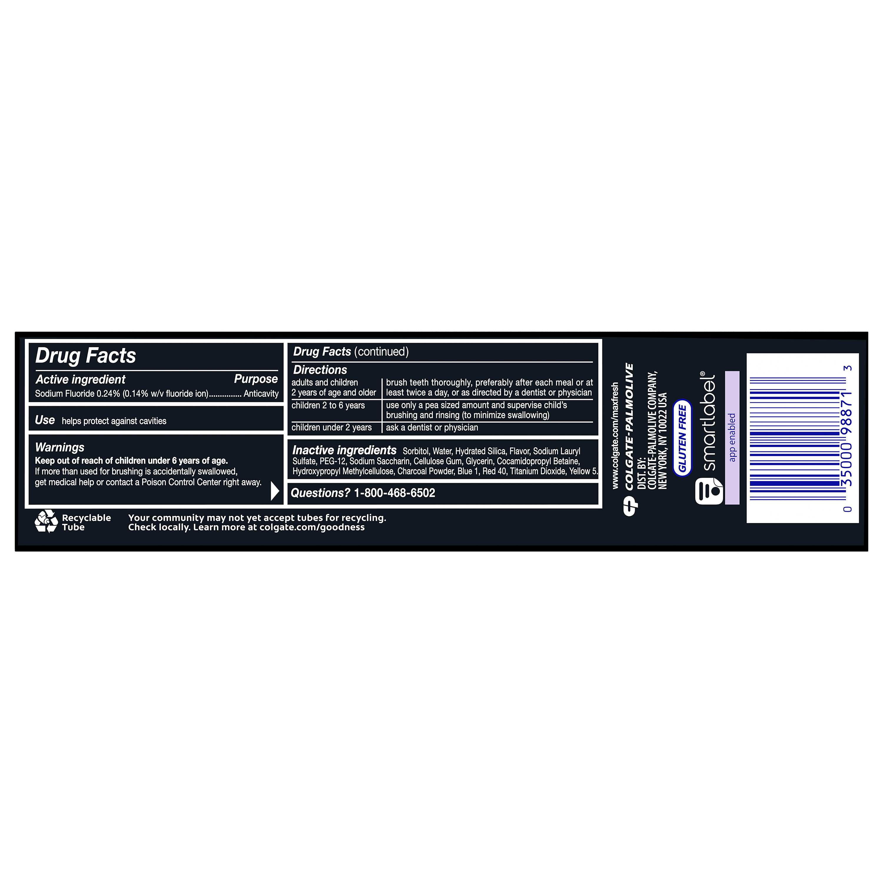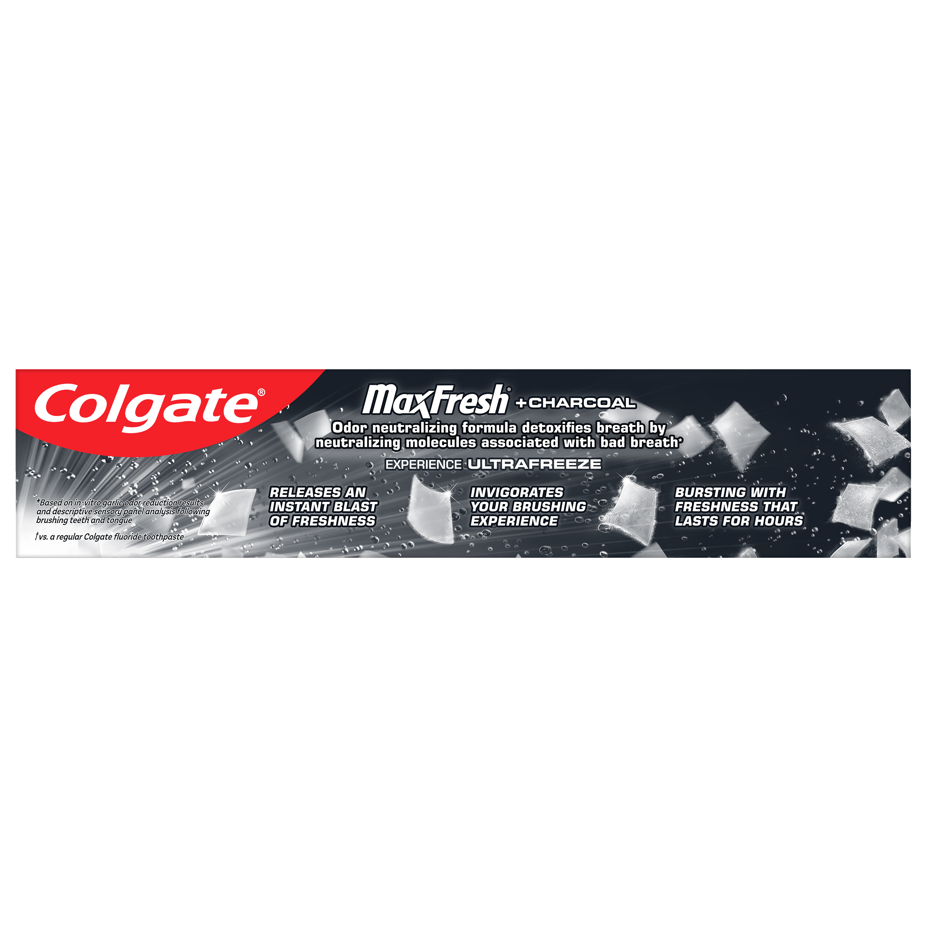 SKU US07502A Consumer Unit - GTIN 00035000988713 Case - GTIN 10035000988710 Product Category Oral Care Product Sub Category Toothpaste Product Equity (Brand) Colgate Product Sub Brand Colgate Max Fresh TP Product Title Colgate MaxFresh Mint Toothpaste with Charcoal, 6.3 oz Product Description Release an instant blast of freshness and help fight bad breath with Colgate MaxFresh Mint Toothpaste with Charcoal. Powered by Ultrafreeze, this invigorating mint toothpaste offers 10X longer-lasting cool for fresh breath*. This mint toothpaste, with the help of Ultrafreeze and hundreds of mini breath strips, is bursting with freshness that lasts for hours. Colgate MaxFresh Toothpaste with Charcoal comes in a powerful minty toothpaste flavor that invigorates the brushing experience. The unique odor neutralizing formula detoxifies breath by neutralizing molecules associated with bad breath.** However, it’s more than just a toothpaste for bad breath, Colgate MaxFresh Toothpaste with Charcoal is also a fluoride toothpaste and fresh breath toothpaste that helps prevent cavities. With its refreshing minty flavor and hundreds of mini breath strips, Colgate MaxFresh Toothpaste leaves your breath feeling fresh for hours. Plus, the fluoride-based formula helps fight cavities. Get long-lasting fresh breath with Colgate MaxFresh Toothpaste. *vs. a regular Colgate fluoride toothpaste **based on in-vitro garlic odor reduction results and descriptive sensory panel analysis following brushing teeth and tongue eCommerce Copy- Long Description Release an instant blast of freshness and help fight bad breath with Colgate® Max Fresh Mint Toothpaste with Charcoal. Powered by Ultrafreeze, this invigorating mint toothpaste offers 10X longer-lasting cool for fresh breath*. This minty toothpaste, with the help of Ultrafreeze and hundreds of breath strips, unleashes a powerful rush of freshness for long-lasting fresh breath. In addition, this Colgate® Max Fresh toothpaste with charcoal comes in a powerful minty toothpaste flavor that invigorates the brushing experience. The unique odor neutralizing formula detoxifies breath by neutralizing molecules associated with bad breath.** However, it’s more than just a toothpaste for bad breath, Colgate® Max Fresh Toothpaste with Charcoal is also a fluoride toothpaste and helps prevent cavities. *vs. a regular Colgate® fluoride toothpaste **based on in-vitro garlic odor reduction results and descriptive sensory panel analysis following brushing teeth and tongue Bullet 1 Includes one (1) 6.3 oz tube of Colgate MaxFresh Mint Toothpaste with Charcoal Bullet 2 Colgate MaxFresh Toothpaste with Charcoal uses Ultrafreeze to provide 10X longer lasting cool for fresh breath* and neutralize bad breath molecules** Bullet 3 Fluoride toothpaste formula helps fight cavities Bullet 4 This toothpaste, with hundreds of mini breath strips, is bursting with freshness that lasts for hours Bullet 5 Release an instant blast of freshness with Colgate MaxFresh Mint Toothpaste with Charcoal Active Ingredients Sodium Fluoride 0.24% (0.14% w/v fluoride ion) Family Dollar RPC 998881