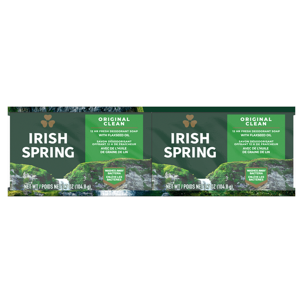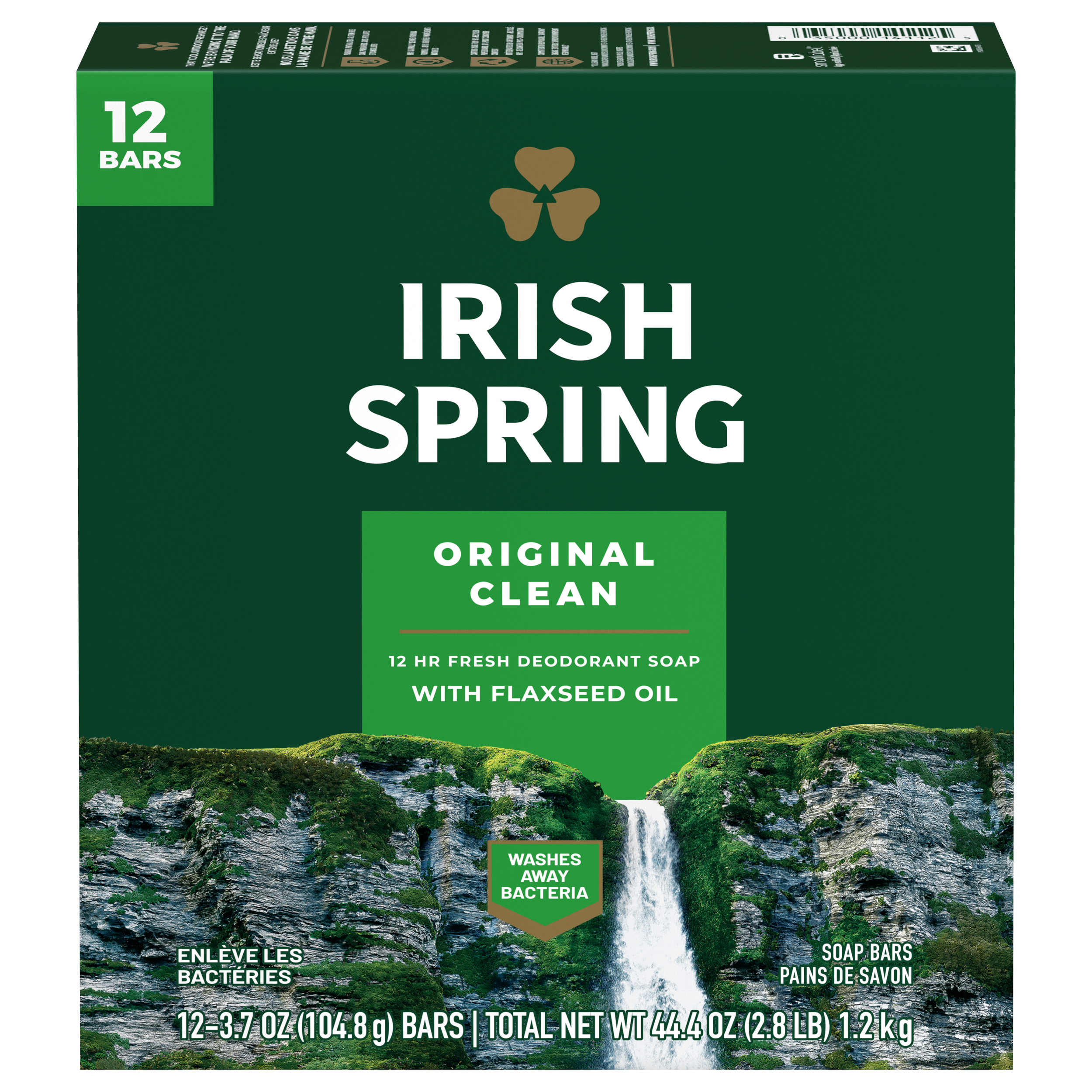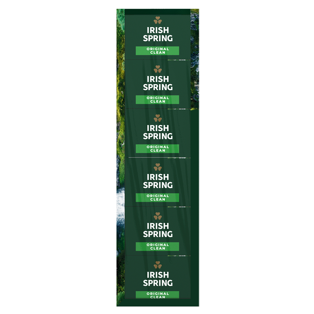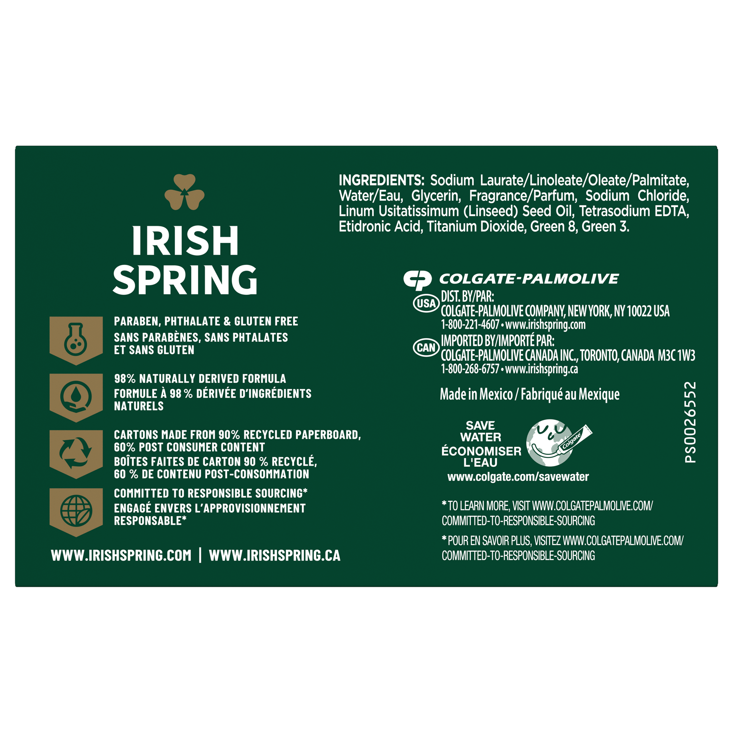 Product Title Irish Spring Original Clean Deodorant Bar Soap for Men, 104.8 g, 12 Pack SKU 114477 SKU eCommerce Name Irish Spring Original Clean Deodorant Bar Soap for Men, 104.8 g, 12 Pack Consumer Unit - GTIN 00035000141125 Case - GTIN 00035000144775 Product Category Personal Care Product Sub Category Bar Soap Brand Irish Spring Product Sub Brand Irish Spring BS Consumer Unit Gross Weight 1.390 KG / 3.065 LB Consumer Unit Net Weight 1.258 KG / 2.774 LB Consumer Unit Length 63.000 MM / 2.480 IN Consumer Unit Width 230.000 MM / 9.055 IN Consumer Unit Height 202.000 MM / 7.953 IN Consumer Unit Volume 2.927 C8 / 0.103 CF Product Title Irish Spring Original Clean Deodorant Bar Soap for Men, 104.8 g, 12 Pack eCommerce Copy The Irish Spring bar soap carton might have a new design, but it’s still the same great bar soap you love to smell. Feel clean, smell serene with Irish Spring Original Clean Bar Soap, formerly our Original bar soap, which is made with a 98% naturally derived formula and has flaxseed oil. This bar soap for men is mild for skin, paraben, phthalate and gluten free. Irish Spring original bar soap keeps you fresh for 12 hours and can be used as hand soap, too. Smell like you came from a nice-smelling place with Irish Spring bar soap packs. eCommerce Copy- Long Description Smell like you came from a nice-smelling place with Irish Spring Bar Soap. The Irish Spring bar soap carton might have a new design, but it’s still the same great bar soap you love to smell. Count on Irish Spring Original Clean Deodorant Bar Soap to leave your skin feeling clean — our Original bar soap for men is made with a 98% naturally derived formula that keeps you fresh for 12 hours. Plus, this men’s bar soap is mild for skin and paraben, phthalate and gluten free. This bar soap also has flaxseed oil. Feel good while washing your body with Irish Spring and use Irish Spring Original Clean Bar Soap as a hand soap, too — this bar soap has a sudsy lather that washes away bacteria. Get as fresh as the great outdoors and add some adventure to your everyday with Irish Spring’s whole line of body washes and bar soaps for men. Our packaging refresh is all part of our master plan to bring the amazing places you love to smell straight to your bathroom. Never go without smelling your best. Keep some in your bathroom, in the pantry, give some to your friends and keep the good smells going. Feel clean, smell serene with the new Irish Spring. Keywords (eCommerce) aloe body wash, aloe vera body wash, mint body wash, hydrating body wash, moisturizing body wash, soothing body wash, sensitive body wash, body wash for sensitive skin, gender neutral body wash, organic body wash, men's shower gel, women's shower gel, coconut body wash, scented body wash, citrus body wash, antiperspirant body wash, antibacterial body wash, body wash for dry skin, natural body wash, fly insect repellent, backyard pest repeller, bug repellent, citronella, mosquito repellent, insect repellent, insect repellant OS Amazon On Page Keywords hand soap, body wash, deodorant, bar soap, flaxseed oil, mens bar soap, deodorant soap, bar soaps, body washes, deodorant bar, deodorant bar soap OS Walmart On Page Keywords hand soap, body wash, deodorant, bar soap, flaxseed oil, mens bar soap, deodorant soap, bar soaps, body washes, deodorant bar, deodorant bar soap Walmart Bullet 1 Contains twelve (12) 3.7 oz soap bars of Irish Spring Bar Soap for Men, Original Clean Mens Bar Soap Walmart Bullet 2 Original Clean scent Irish Spring soap pack has a fresh look and great smell, so you can smell like you came from a nice-smelling place Walmart Bullet 3 Irish Spring soap bars are paraben and phthalate free and are made with a 98% naturally derived formula that keeps you fresh for 12 hours Walmart Bullet 4 This mens bar soap is mild for skin so you can feel as great as you smell Walmart Bullet 5 Irish Spring Original bar soap with flaxseed oil has a sudsy lather that washes away bacteria Walmart Bullet 6 Use Irish Spring Original Bar Soap as a hand soap bar or a bath soap bar Walmart Bullet 7 Irish Spring mens bar soap comes in a recyclable carton Walmart Bullet 8 Feel good while washing your hands and body with Irish Spring bar soap