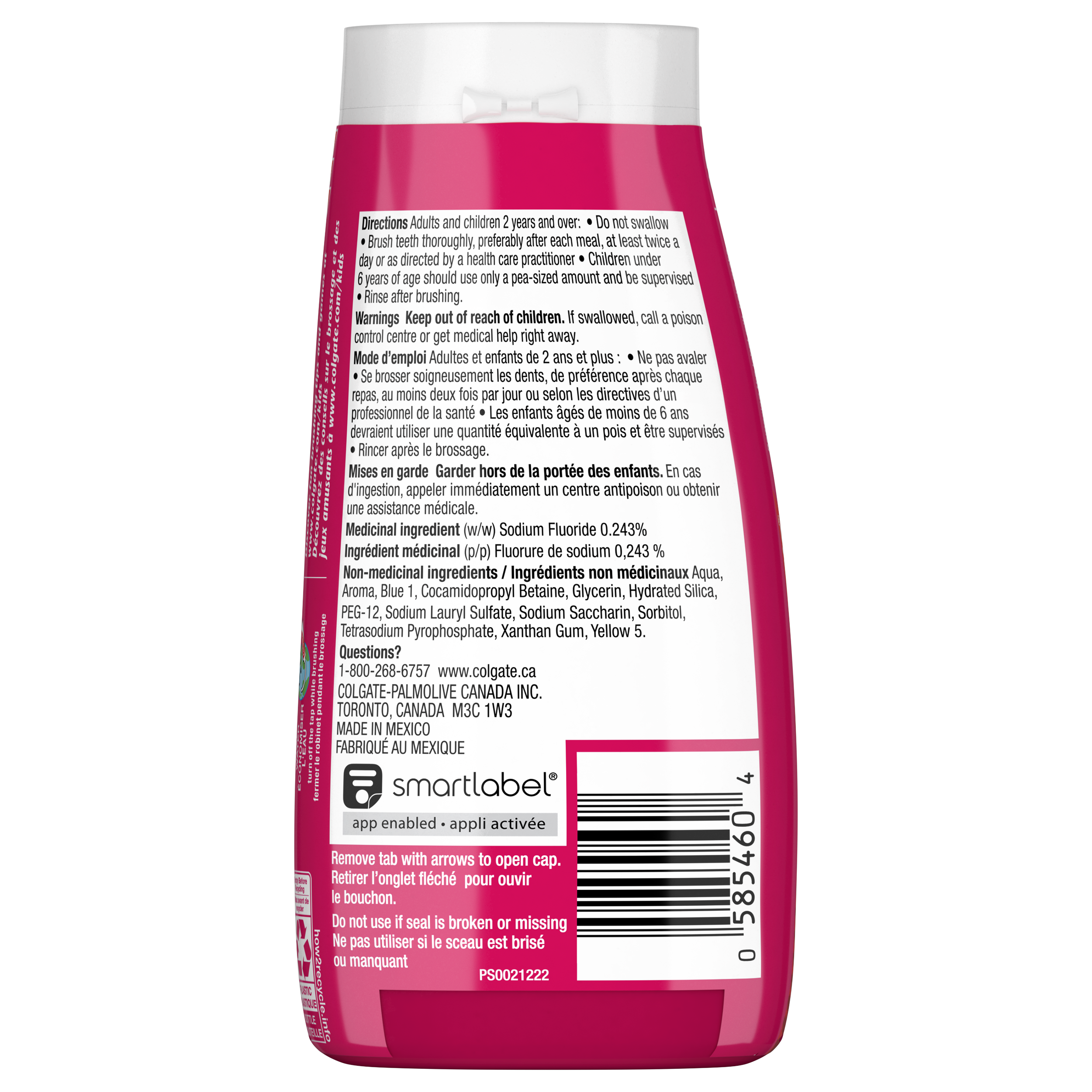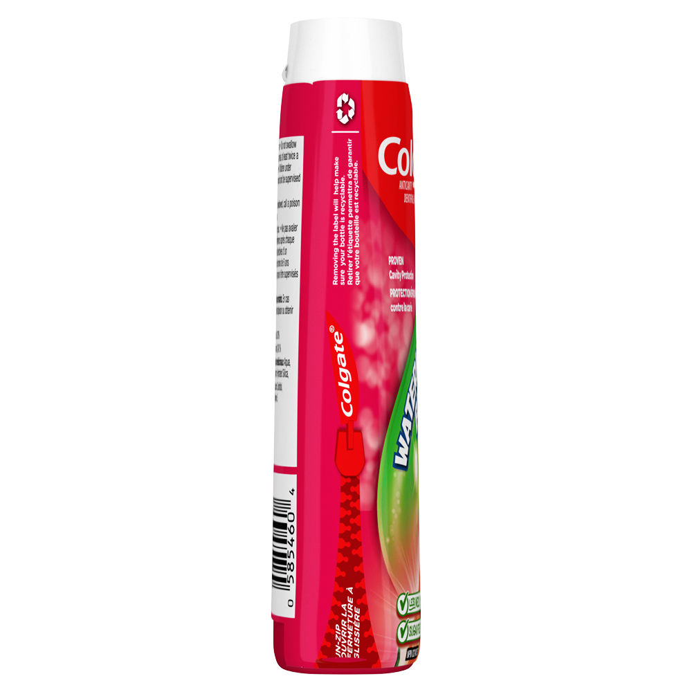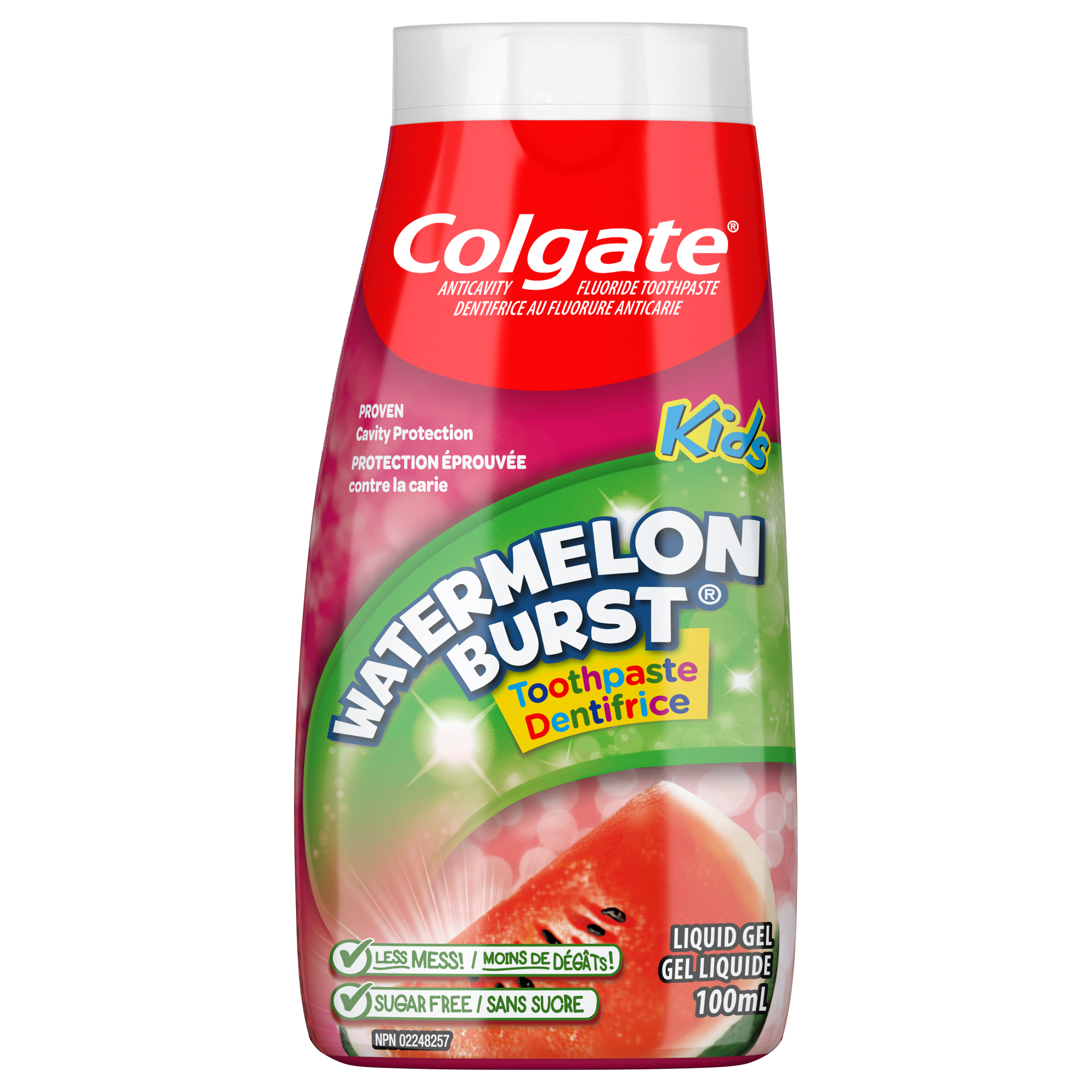 Product Title Colgate Liquid Gel 2-in-1 Kids Watermelon Burst Toothpaste and Mouthwash, 100 mL, 12 Pack SKU 311753 SKU eCommerce Name Colgate Liquid Gel 2-in-1 Kids Watermelon Burst Toothpaste and Mouthwash, 100 mL, 12 Pack Consumer Unit - GTIN 00058000005464 Case - GTIN 10058000005461 Product Category Oral Care Product Sub Category Toothpaste Brand Colgate Product Sub Brand Colgate 2 in 1 TP Consumer Unit Gross Weight 0.153 KG / 0.337 LB Consumer Unit Net Weight 0.132 KG / 0.291 LB Consumer Unit Length 60.000 MM / 2.362 IN Consumer Unit Width 27.000 MM / 1.063 IN Consumer Unit Height 120.000 MM / 4.724 IN Consumer Unit Volume 0.194 C8 / 0.007 CF Product Title Colgate Liquid Gel 2-in-1 Kids Watermelon Burst Toothpaste and Mouthwash, 100 mL, 12 Pack eCommerce Copy Colgate Kids 2-in-1 liquid gel toothpaste, with a great Watermelon Burst flavor, provides proven cavity and enamel protection and comes in an easy to dispense gel formula with less mess dispensing. eCommerce Copy- Long Description Colgate Kids Watermelon Burst combines toothpaste and mouthwash into one gel in an easy to dispense formula for less mess and more fun! It provides proven cavity and enamel protection like a toothpaste while freshening breath with Watermelon Burst like a mouthwash. This bright and colorful package combined with a fun watermelon flavor will encourage your kids to brush for a lifetime of bright smiles. Keywords (eCommerce) cavity protection, toothpaste, tooth paste, child, kid's, children, boys, girls, taste, best, fluoride, safe, flavored, anticavity, kid's, tartar control, not spicy, gentle, sensitive, neat squeeze, liquid toothpaste, watermelon, berry, fruit, fruty