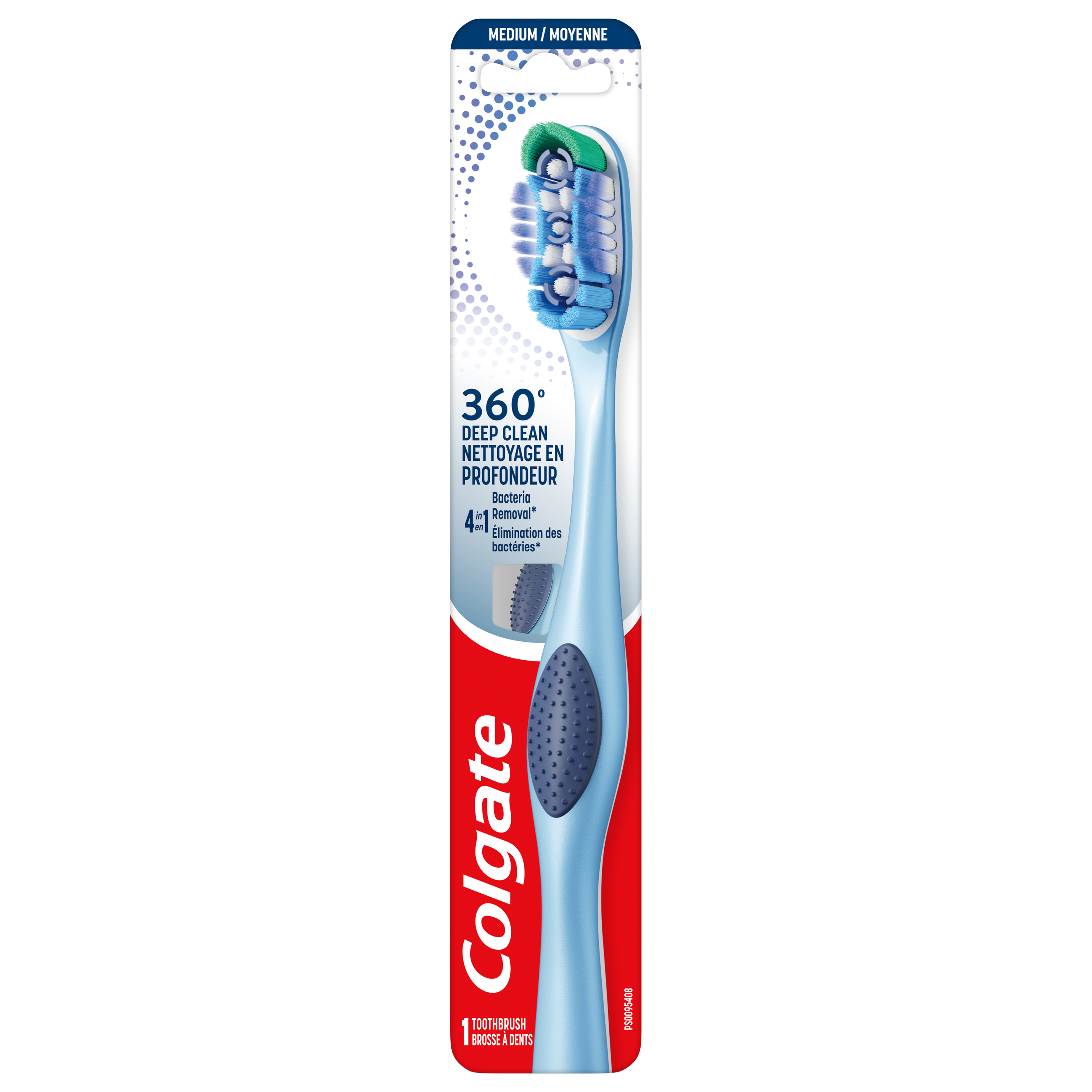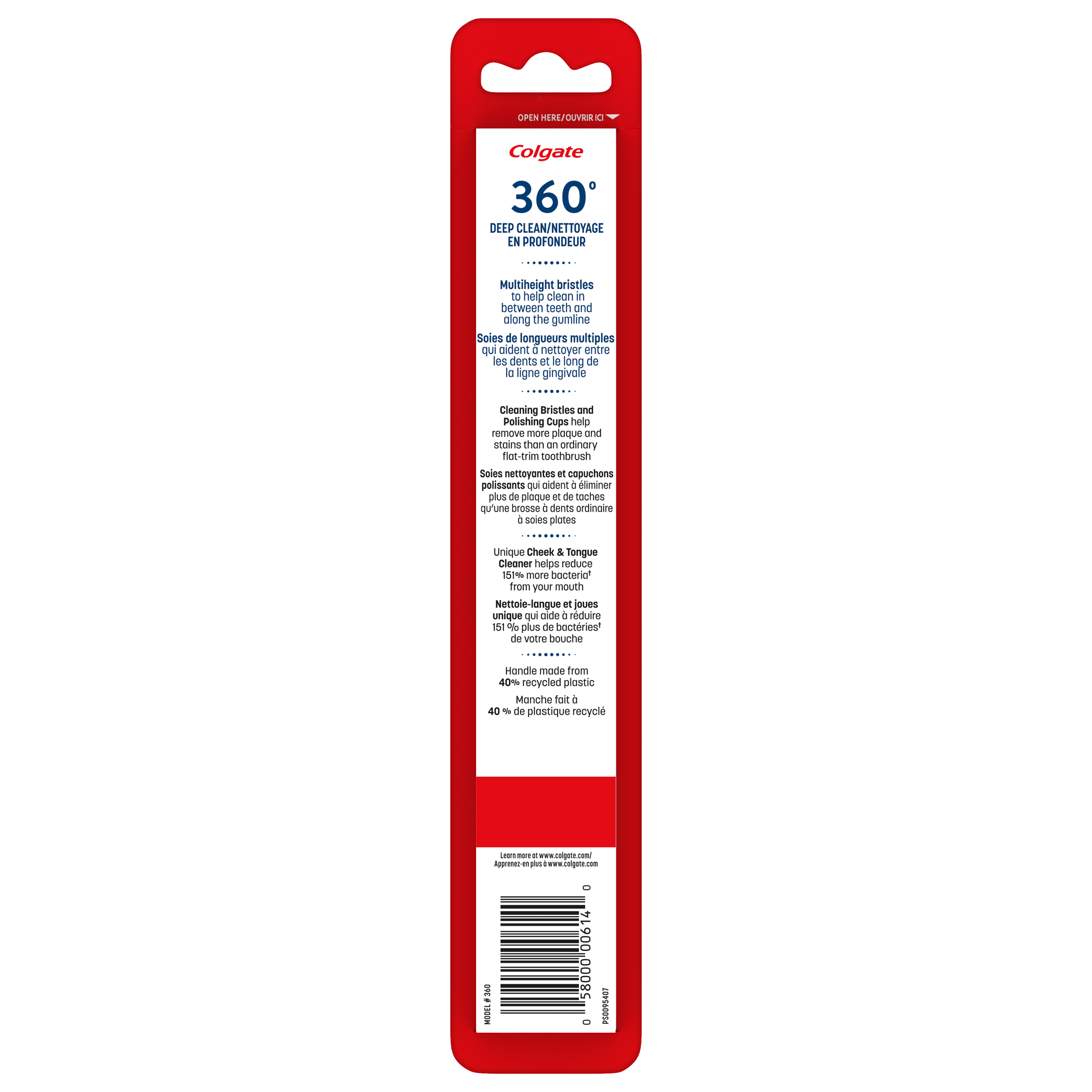 Product Title Colgate 360° Toothbrush with Tongue and Cheek Cleaner, Medium SKU 311935 SKU eCommerce Name Colgate 360° Toothbrush with Tongue and Cheek Cleaner, Medium Consumer Unit - GTIN 00058000006140 Case - GTIN 10058000006147 Product Category Oral Care Product Sub Category Manual TB Brand Colgate Product Sub Brand Colgate 360 Man TB Consumer Unit Gross Weight 0.035 KG / 0.077 LB Consumer Unit Net Weight 0.035 KG / 0.077 LB Consumer Unit Length 2.230 MM / 0.088 IN Consumer Unit Width 4.200 MM / 0.165 IN Consumer Unit Height 227.000 MM / 8.937 IN Consumer Unit Volume 0.213 C8 / 0.008 CF Product Title Colgate 360° Toothbrush with Tongue and Cheek Cleaner, Medium eCommerce Copy The Colgate 360⁰ adult toothbrush reduces 151% more bacteria that cause bad breath vs. brushing teeth alone with an ordinary flat-trim toothbrush. This toothbrush features medium cleaning bristles and polishing cups that help remove more plaque and stains and a unique cheek & tongue cleaner. eCommerce Copy- Long Description The Colgate 360⁰ adult full head toothbrush is designed with medium cleaning bristles and polishing cups that help remove more plaque and stains than an ordinary flat-trim toothbrush. This manual toothbrush has an ergonomic handle design and a unique cheek & tongue cleaner that helps reduce 151% more bacteria that cause bad breath versus brushing teeth alone with an ordinary flat-trim toothbrush. Keywords (eCommerce) teethbrush, tooth, brush, tooth brush, manual, tongue, cheek, cleaner, scraper, scarper, best, gums, adult, value, dentist recommended, gentle, cleans gently, non-electric, mouth care, good, handle, non irritating